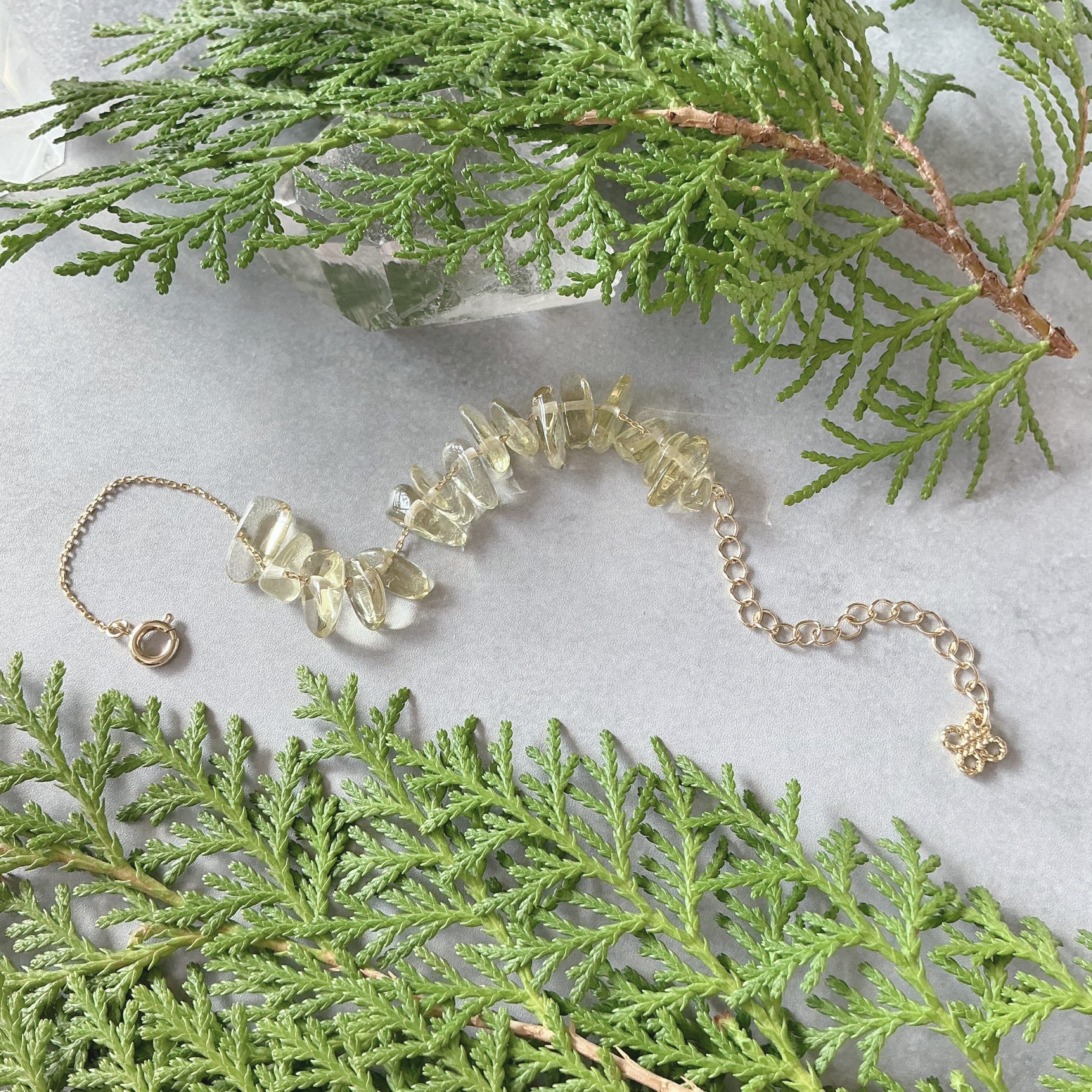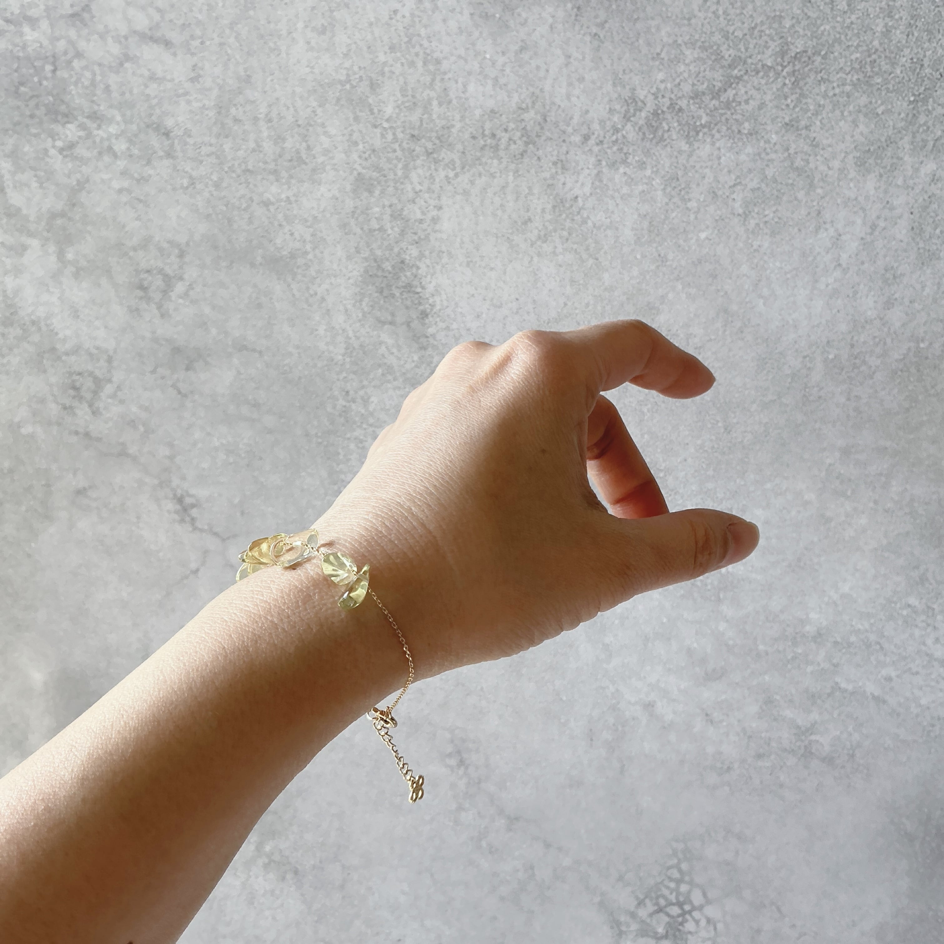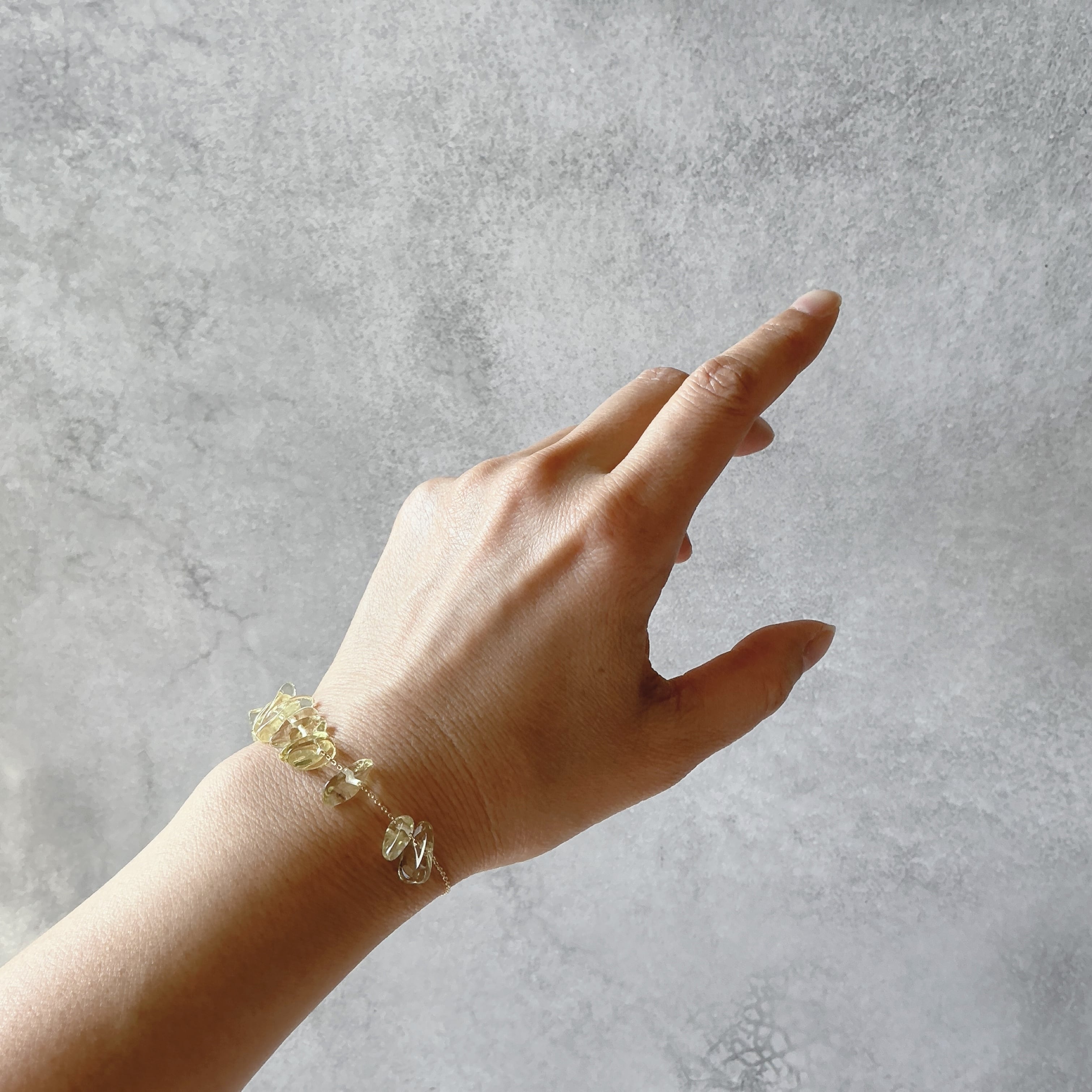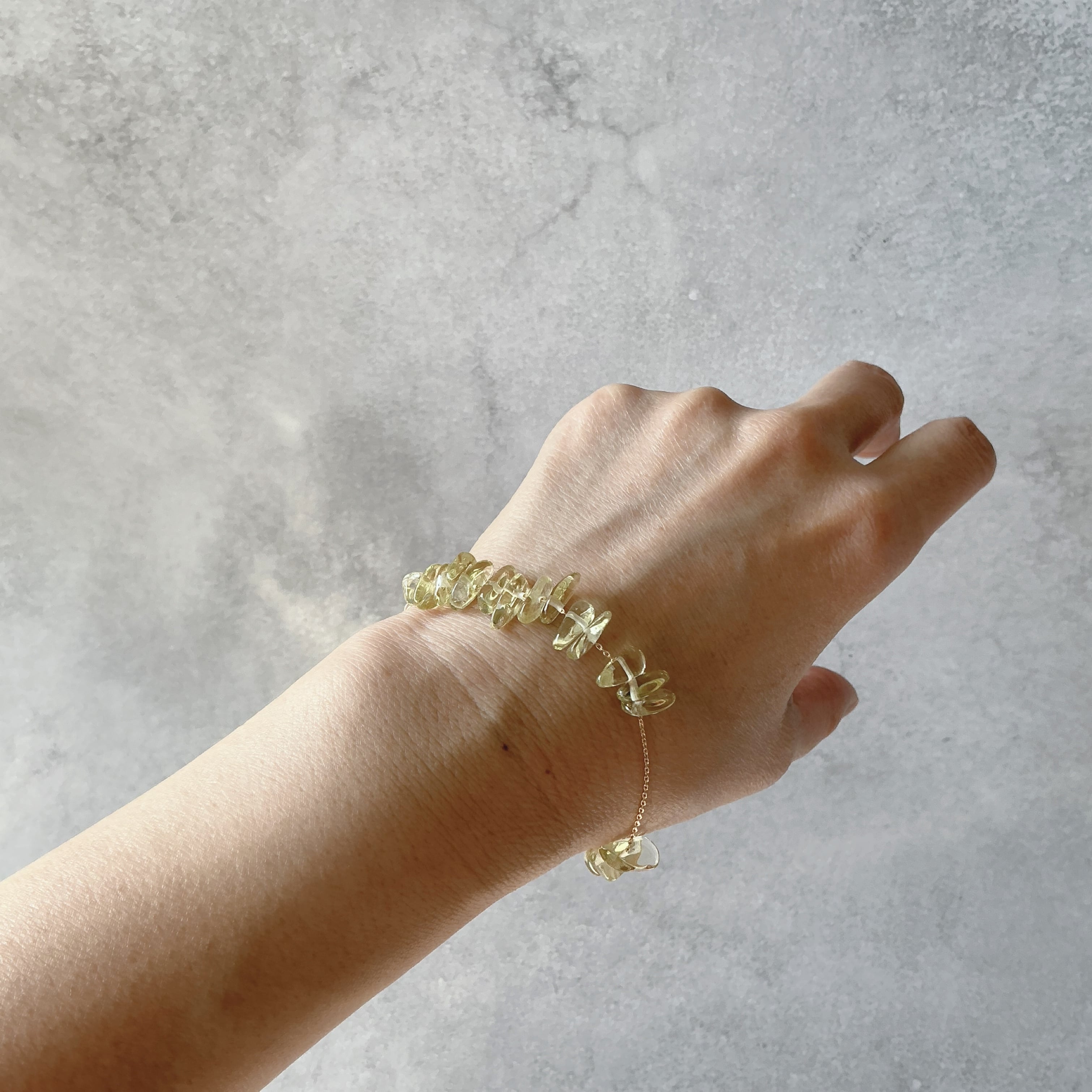 全体的な印象がコロコロと可愛らしくナチュラルな天然石の存在感が素敵なデザインです。淡いイエローが艶々と美しくたっぷりと使用する事でフレッシュな印象の作品となりました。レモンクオーツは固定されておりませんのでブレスレットのチェーンの間をコロコロと動く仕様となっております。そんな作品を通じて天然石との日常を楽しんで頂けたら幸いです。