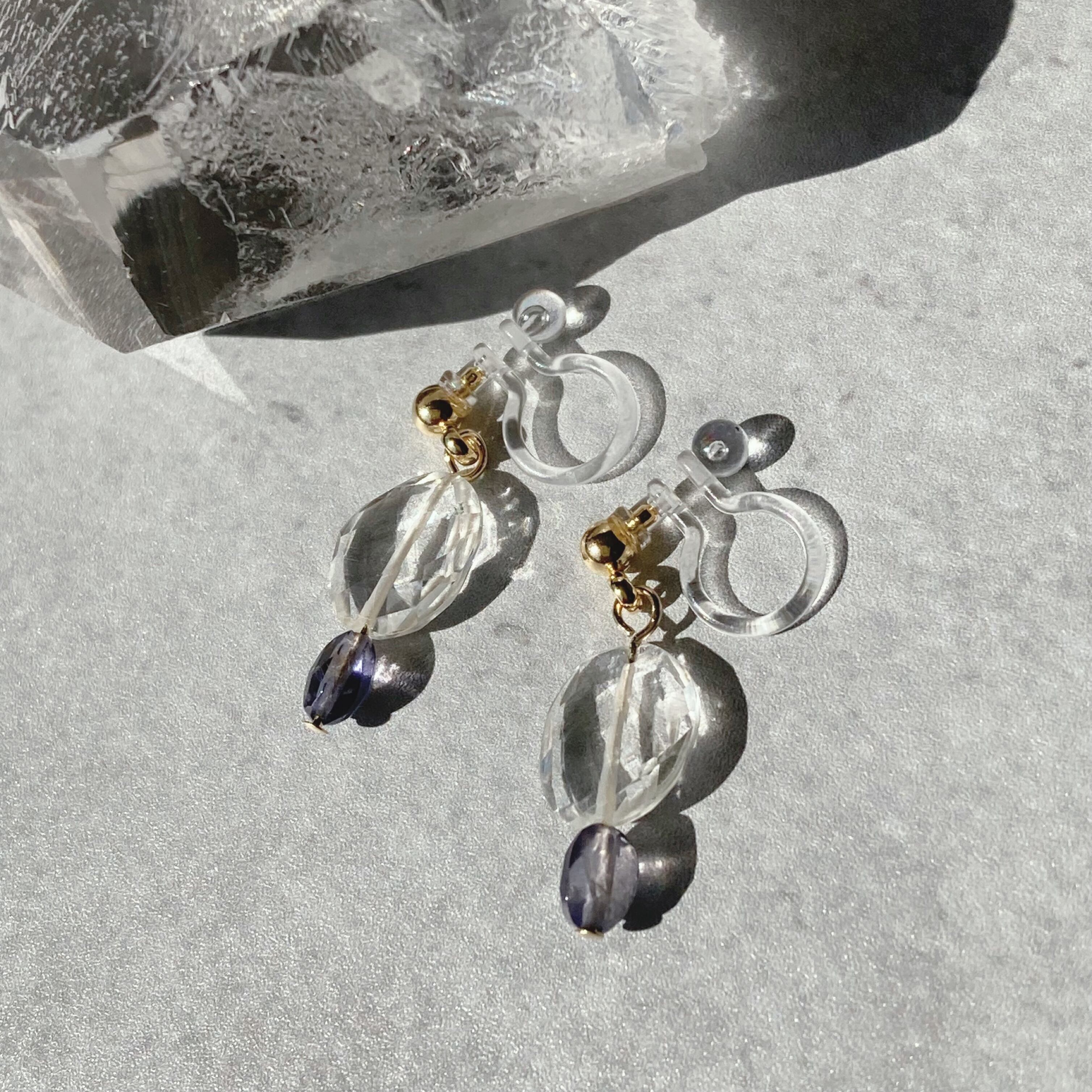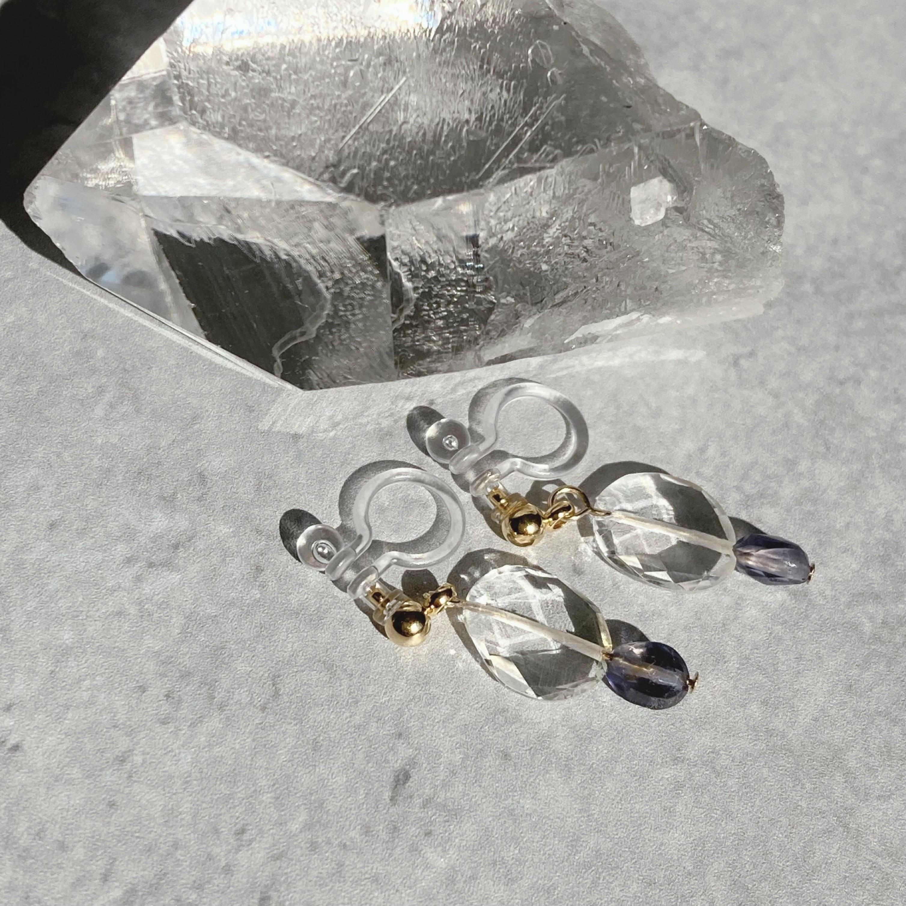 カットの美しい、厚みの少ない珍しい水晶に、大人っぽいすみれ色のアイオライトを組み合わせました。総合的な石言葉は「浄化」「万能」「願望成就」「誠実」「一途」「前進」「ポジティブ」などのパワーワードが並びます。