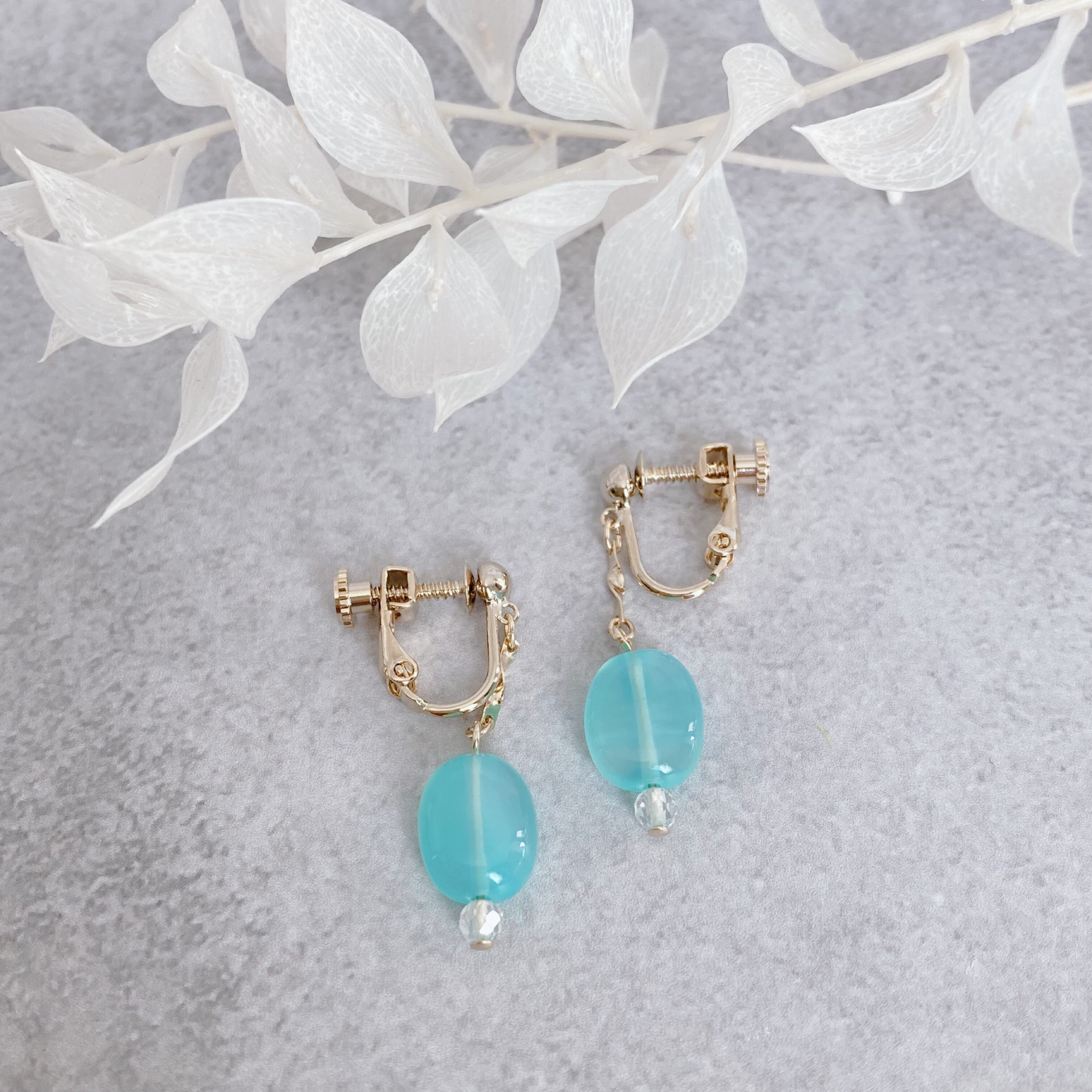使われている天然石は、プルンと表面の滑らかなシーブルーカルセドニーと、小粒ながらもカットの美しいホワイトトパーズです。総合的な石言葉は「癒し」「育み」「コミュニケーション」「平穏」「慈愛」「誠実」「理想の在り方」などの石言葉が並びます。