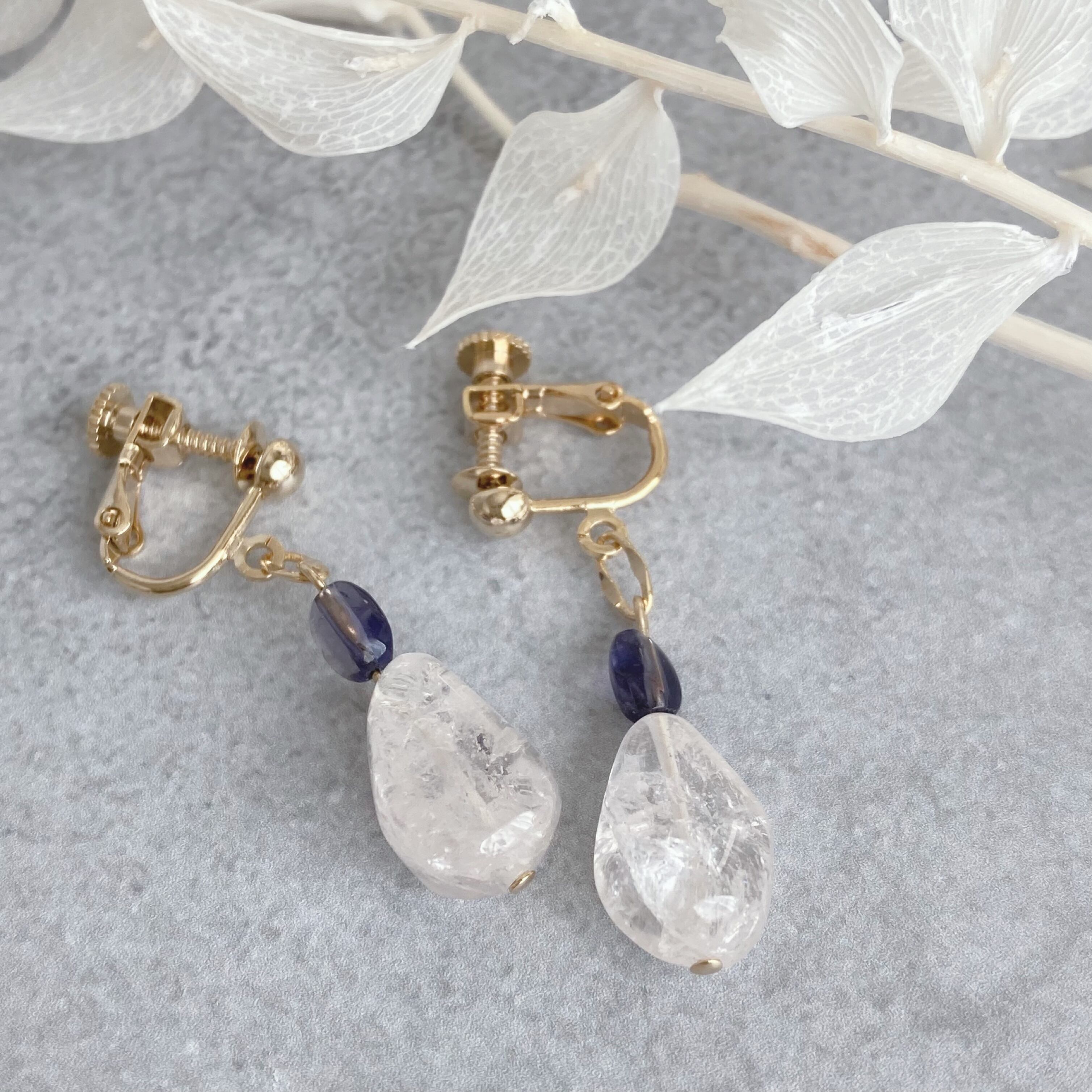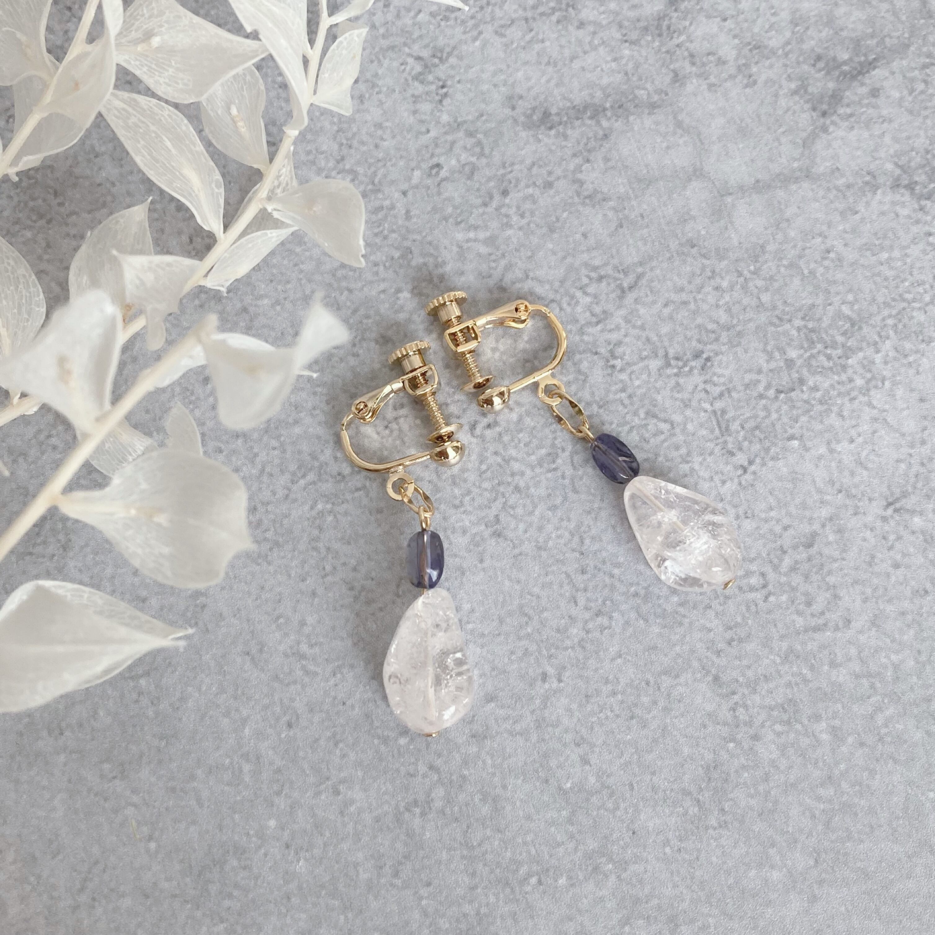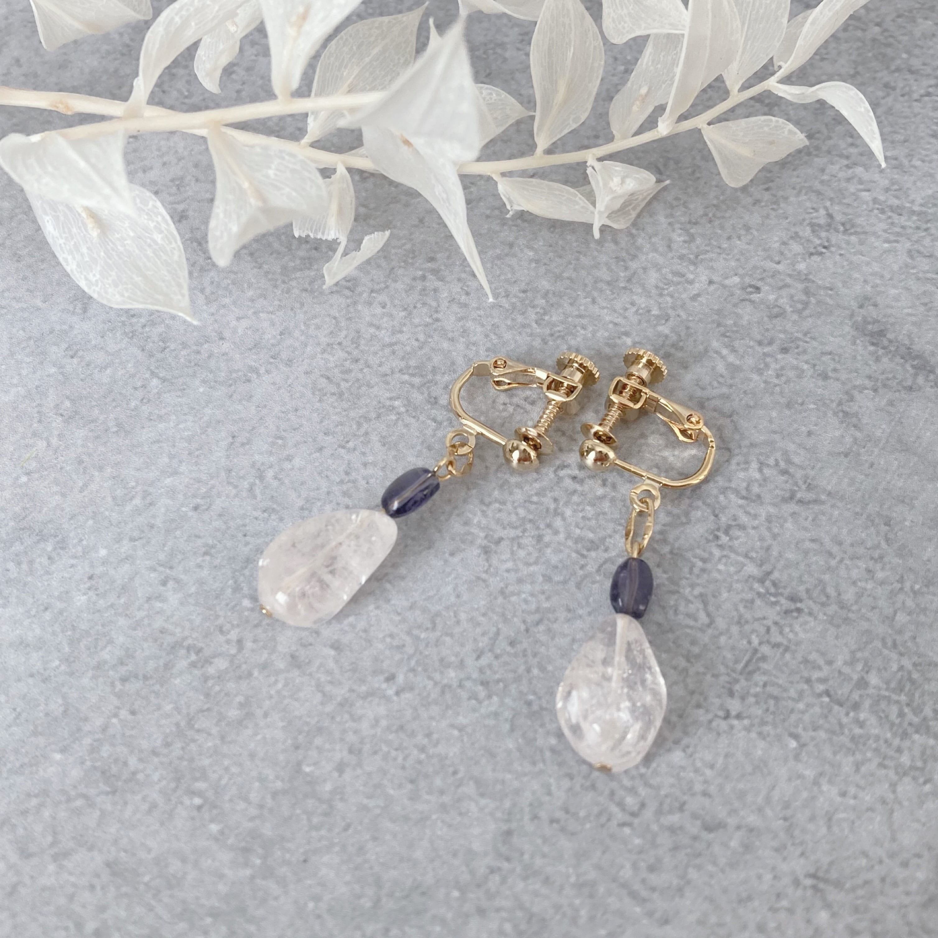 使われている天然石は、ダンビュライトとアイオライトです。総合的な石言葉は「守護」「強い浄化」「高波動」「勝利」「ネガティブな感情の手放し」「誠実」「貫く力」など、パワフルな言葉が並びます。