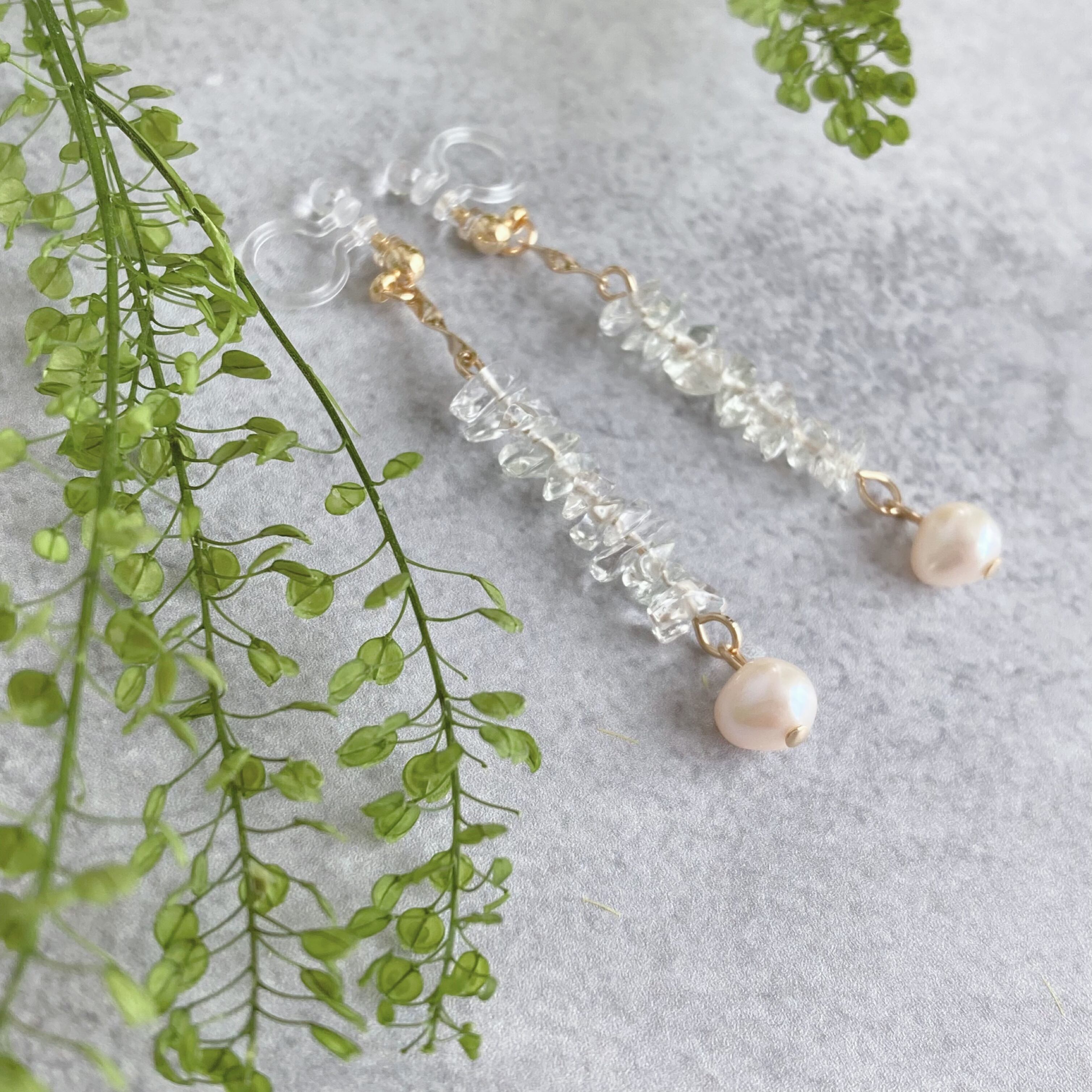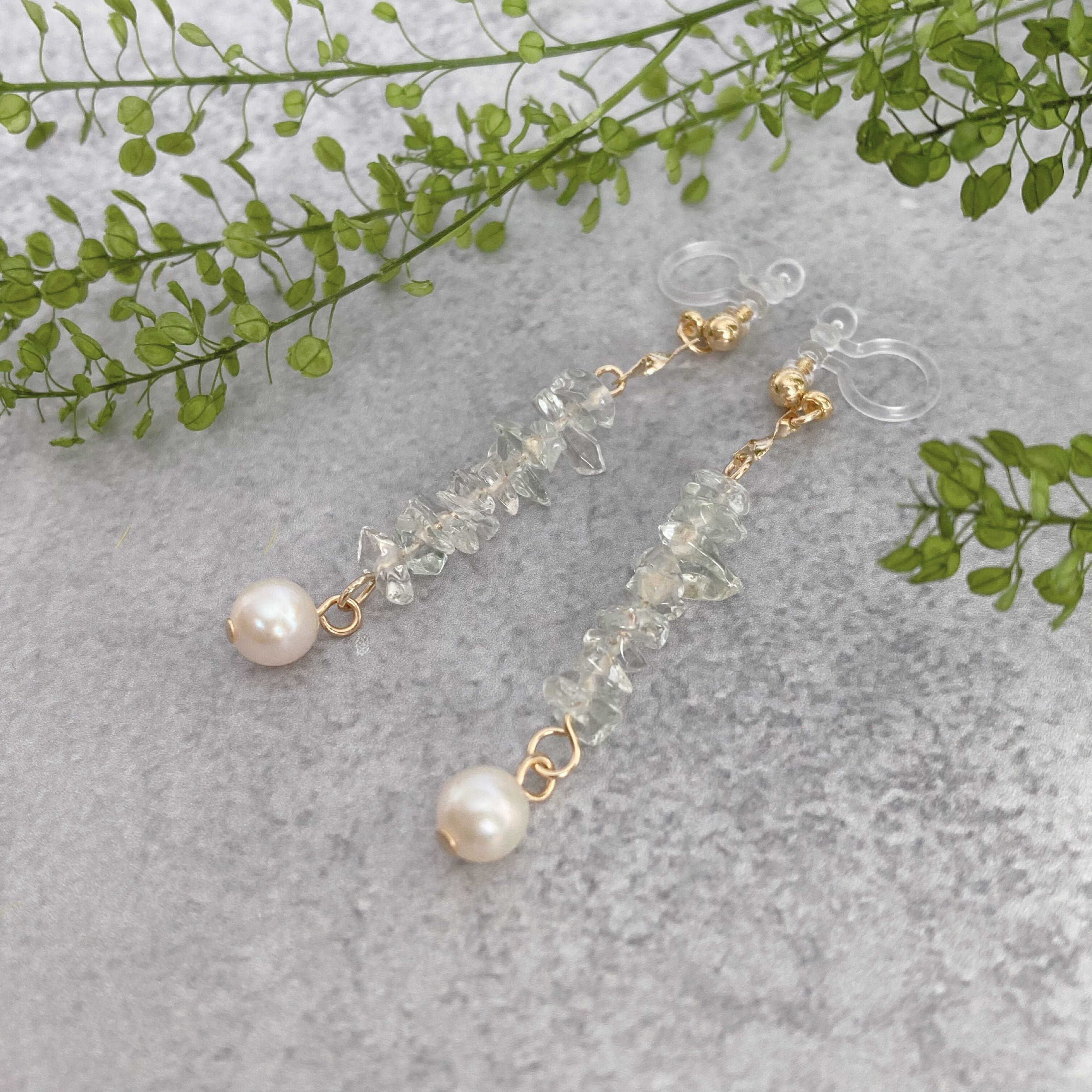 透明感の美しいグリーンアメシストと、ぷにっとした形の淡水パールを組み合わせたノンホールピアス(イヤリング)です。総合的な石言葉は「癒し」「浄化」「心の平和」「育む」「誠実」「リラックス」などのパワーワードが並びます。