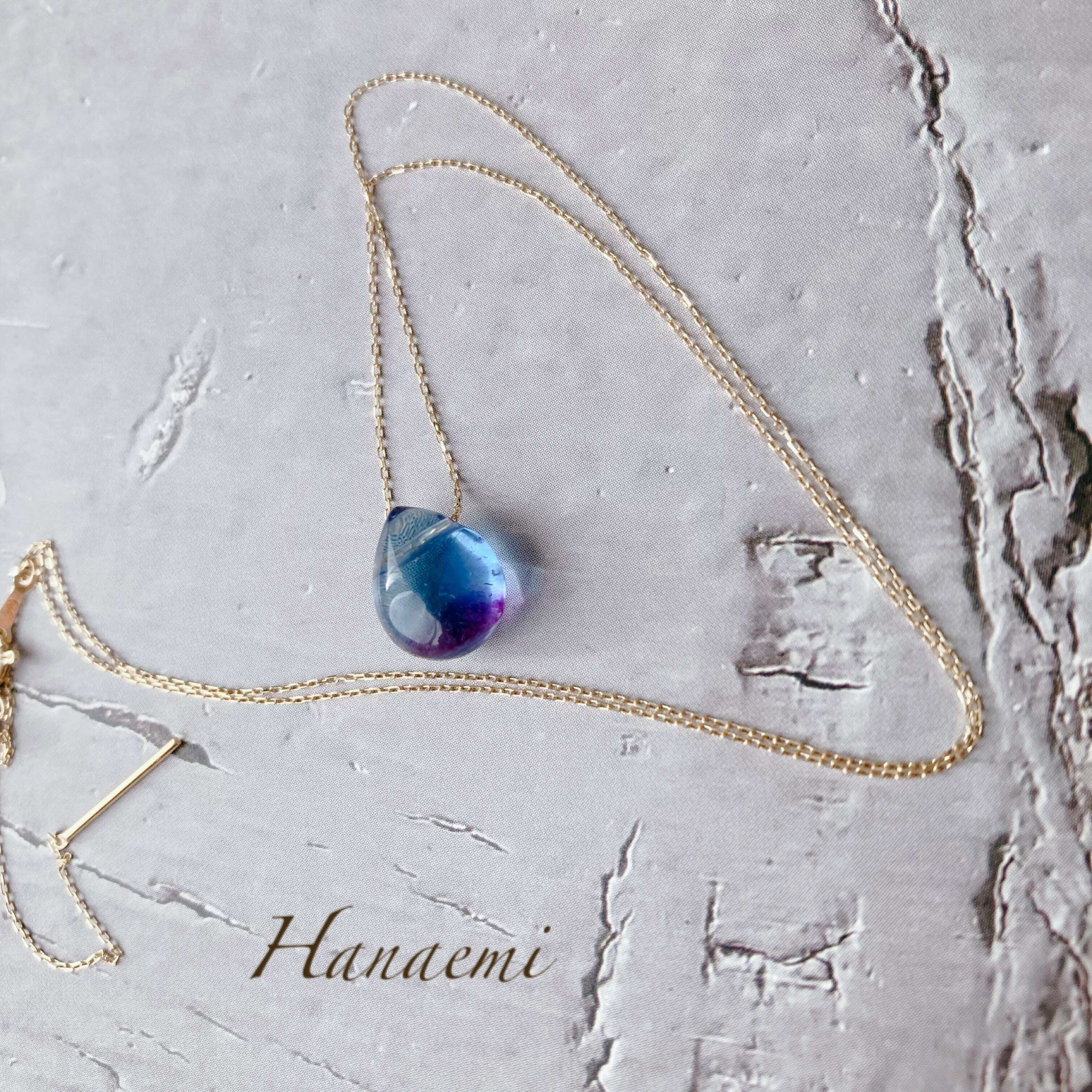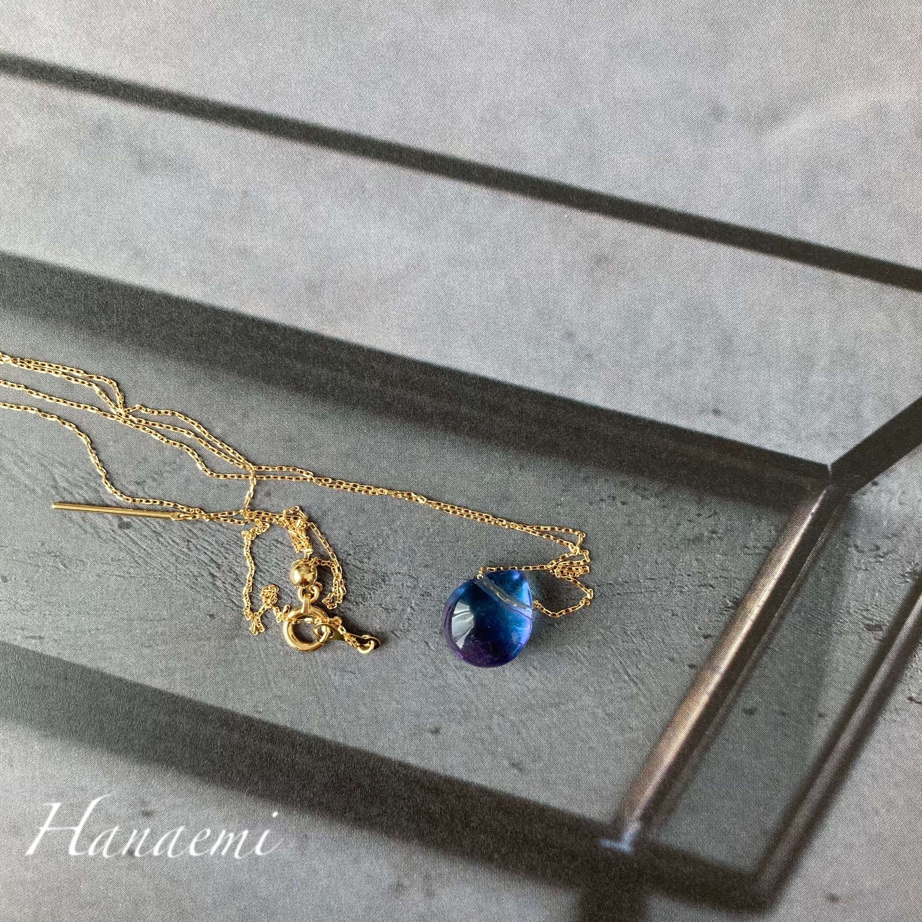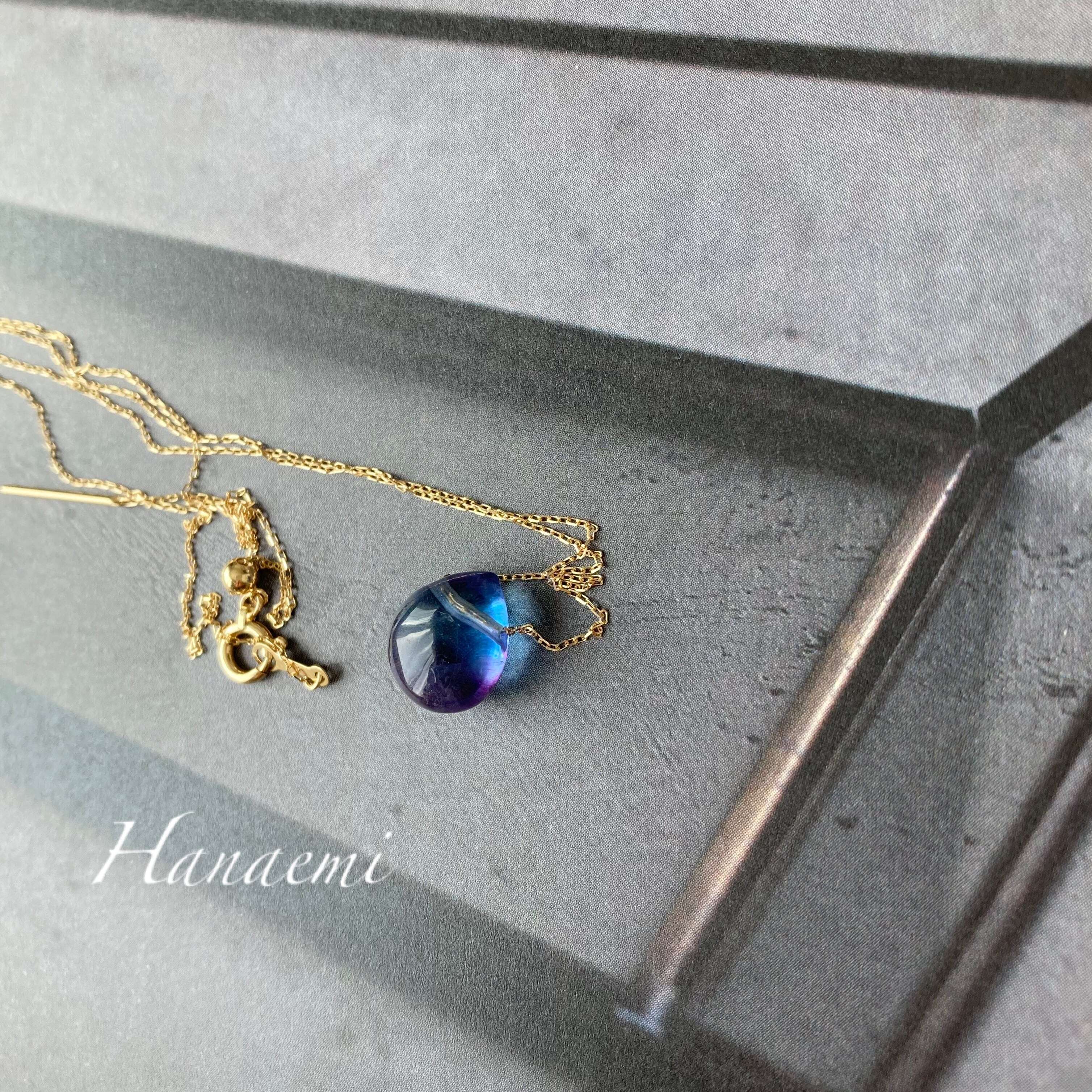 画像では伝わらないのですが、ブルーの底にパープルが入っており、なんともミステリアスな世界が天然石の中にあります。晴天の空からずっと高く上り、宇宙に繋がる間の色のような、本当に美しい一粒です。ぜひ、この石とご縁がある方は、この美しさを堪能して頂きたいと思う一粒です。そんな、美しいフローライト に、Hanaemiらしく、華奢で細いのですが、品良くキラキラ光り輝く18kのチェーンネックレスをシンプルに合わせました。