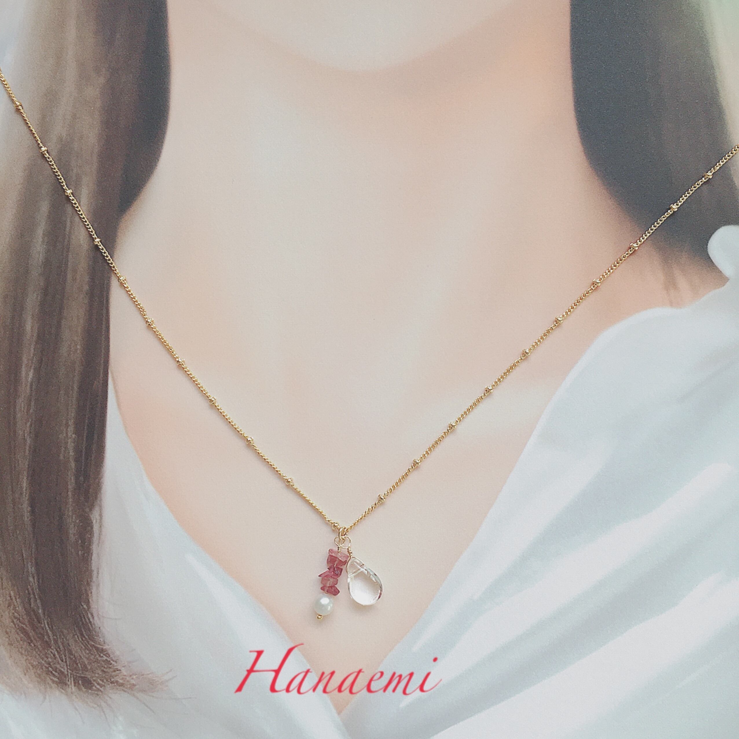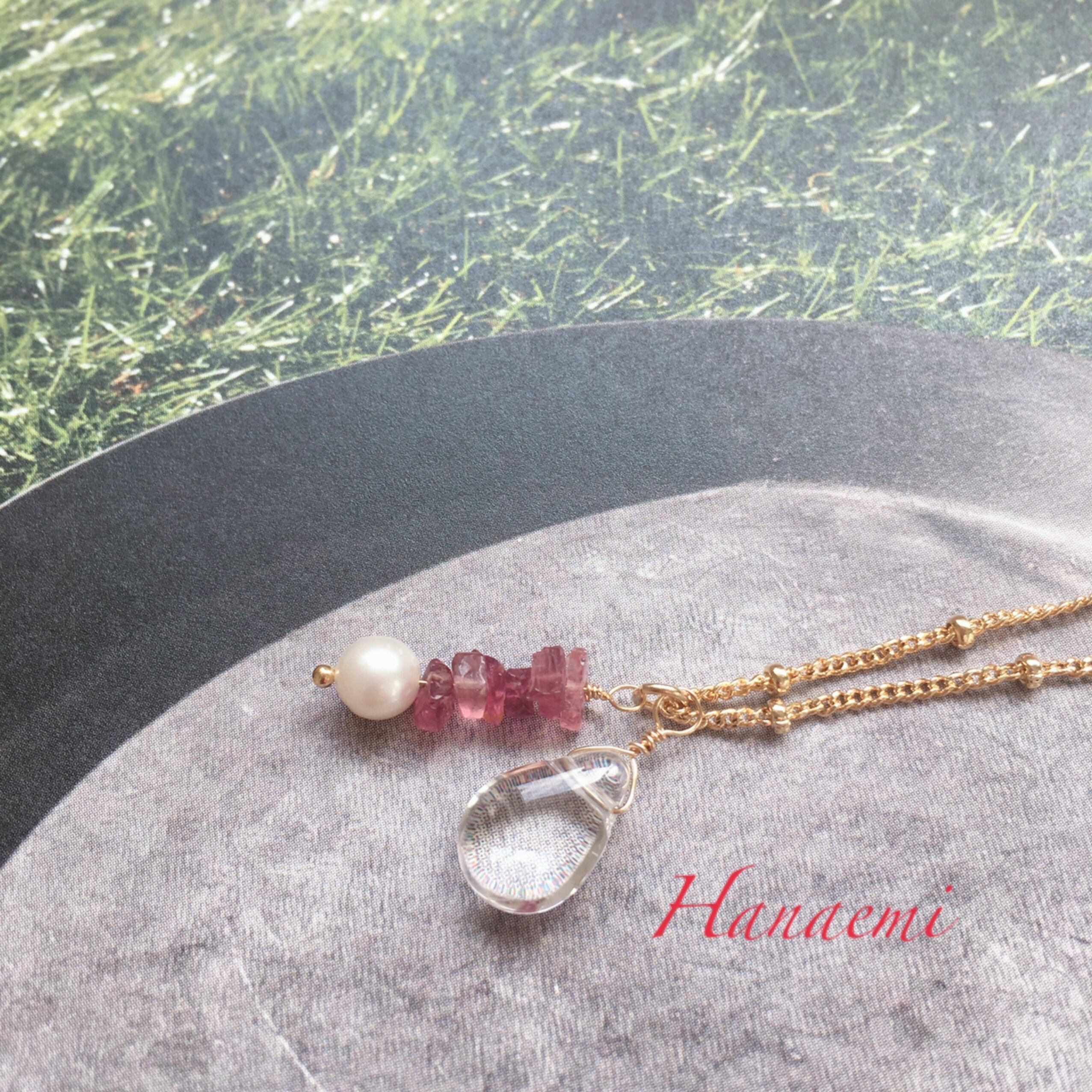 トップサイズ:水晶1粒約1cm1、ピンクトルマリンとパールのチャーム約1.5cm