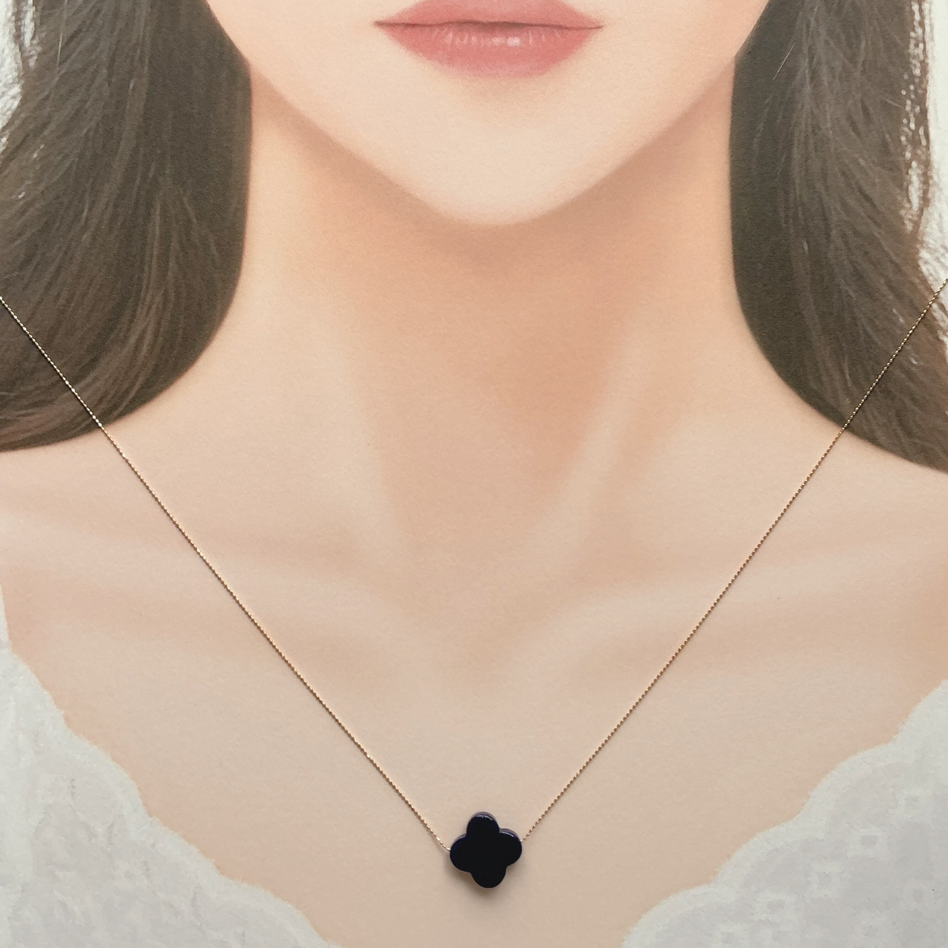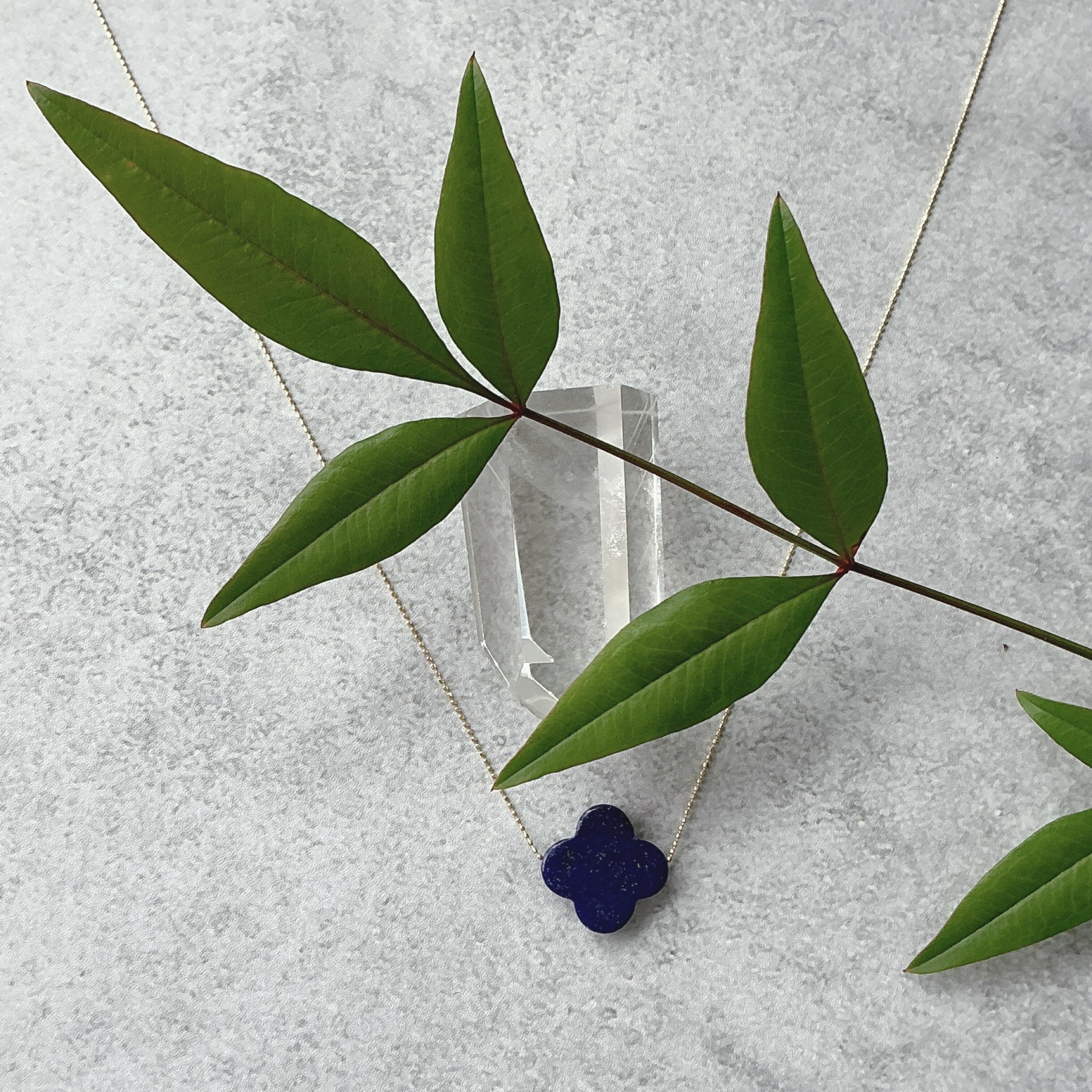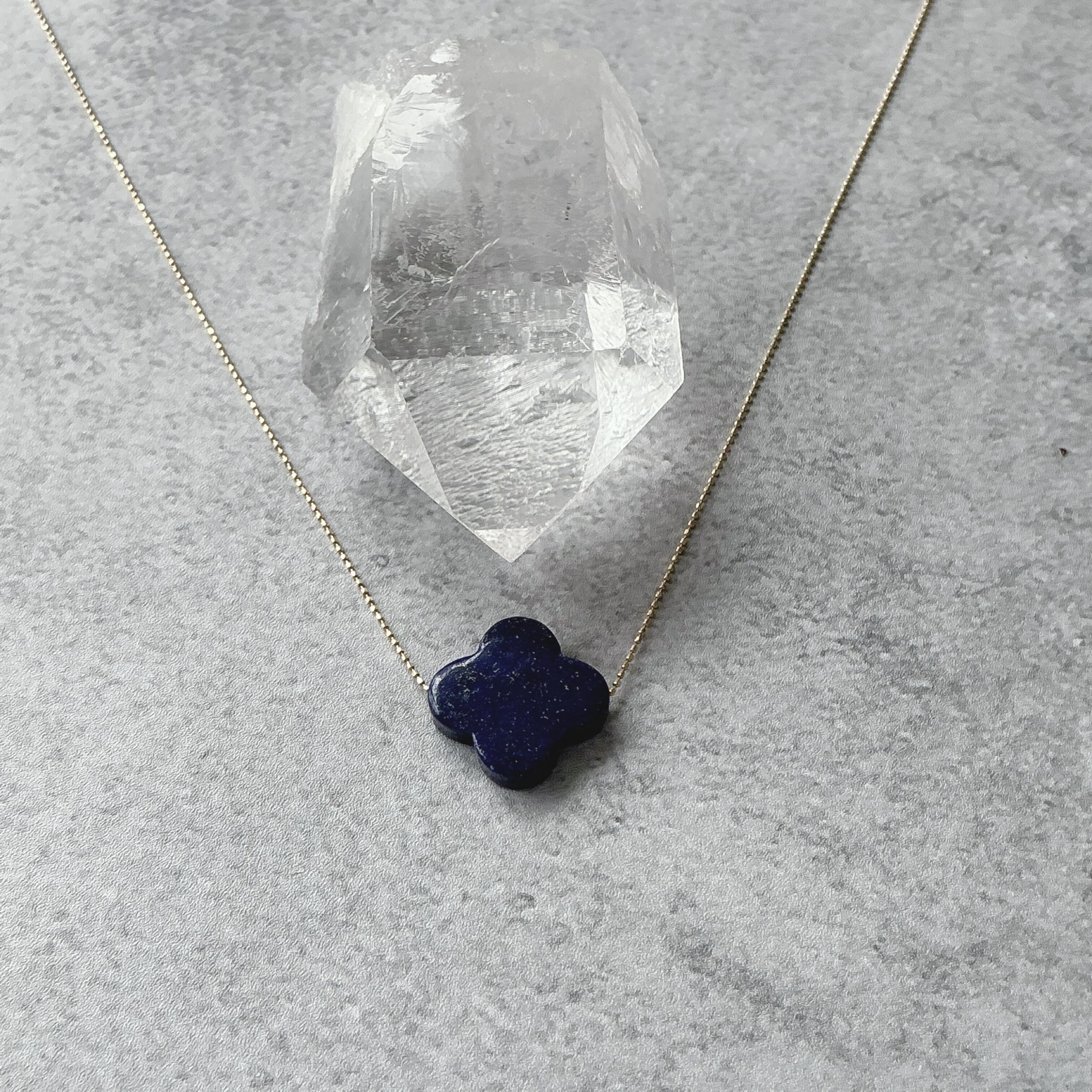 画像では上手く伝わらないのが残念ですが、深いブルーの中に、パイライトの金色の煌めきが非常に美しく、シンプルに四つ葉のクローバーの1粒ネックレスに仕上げました。ぜひ、このラピスラズリの石とご縁がある方は、この美しさを堪能して頂きたいと思う一石です。