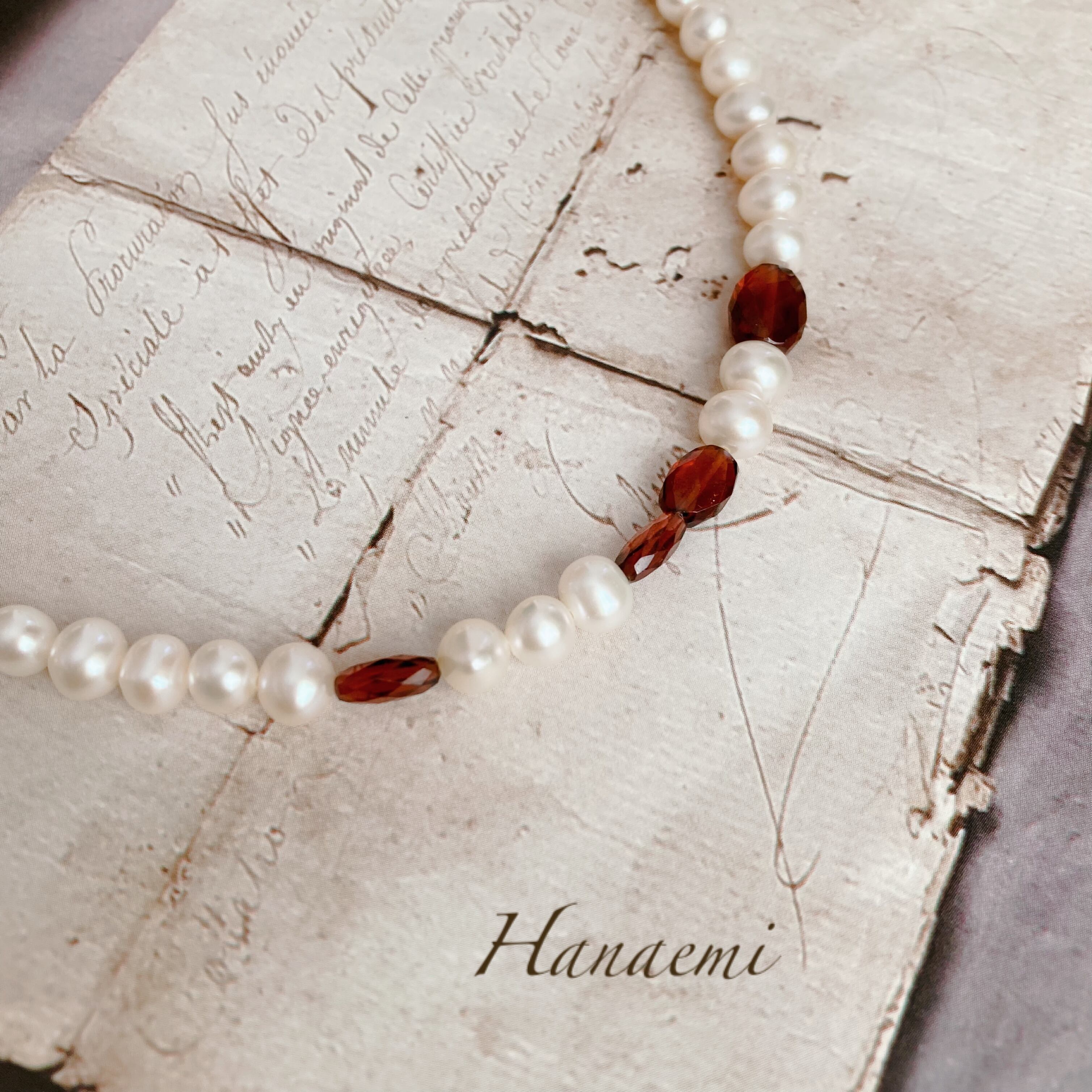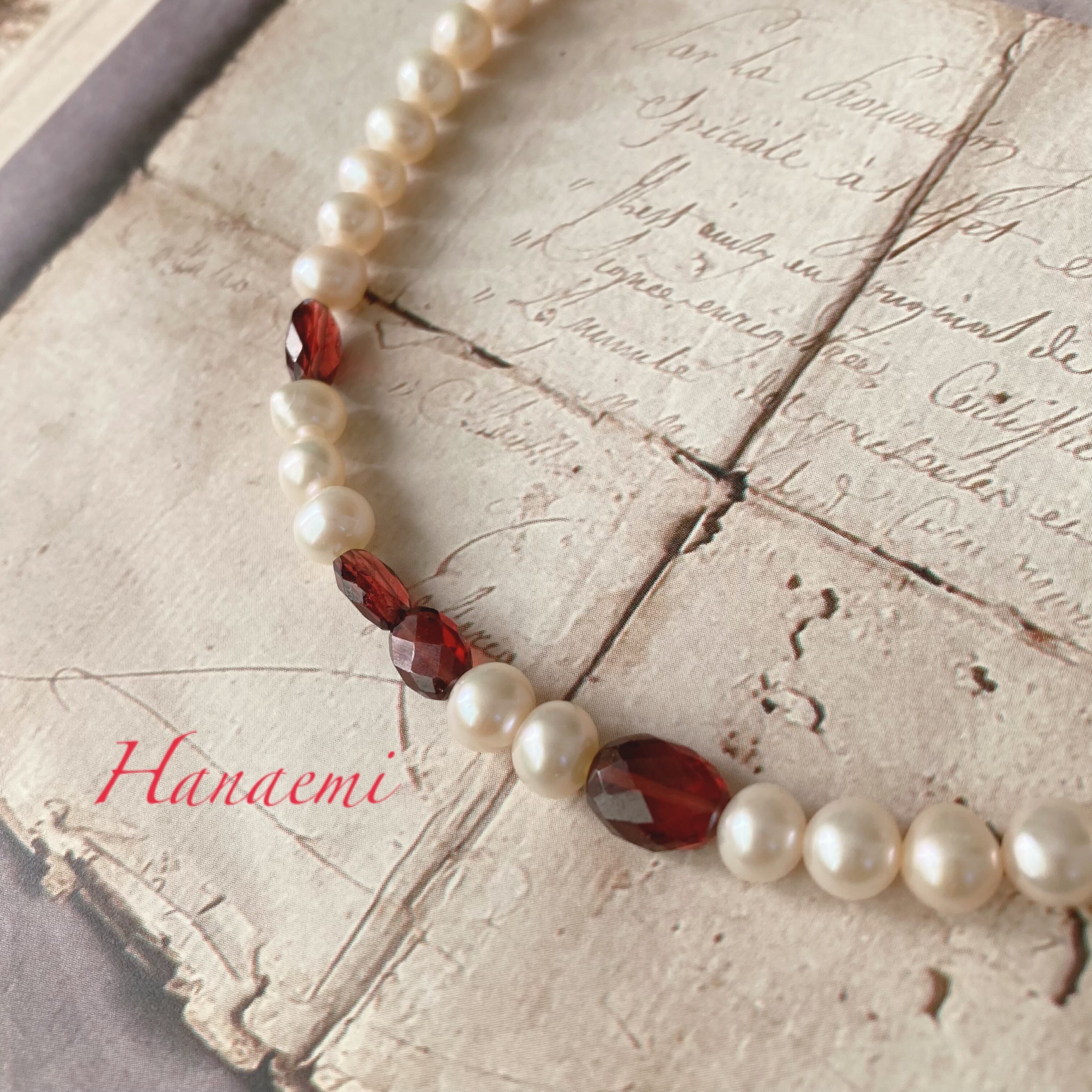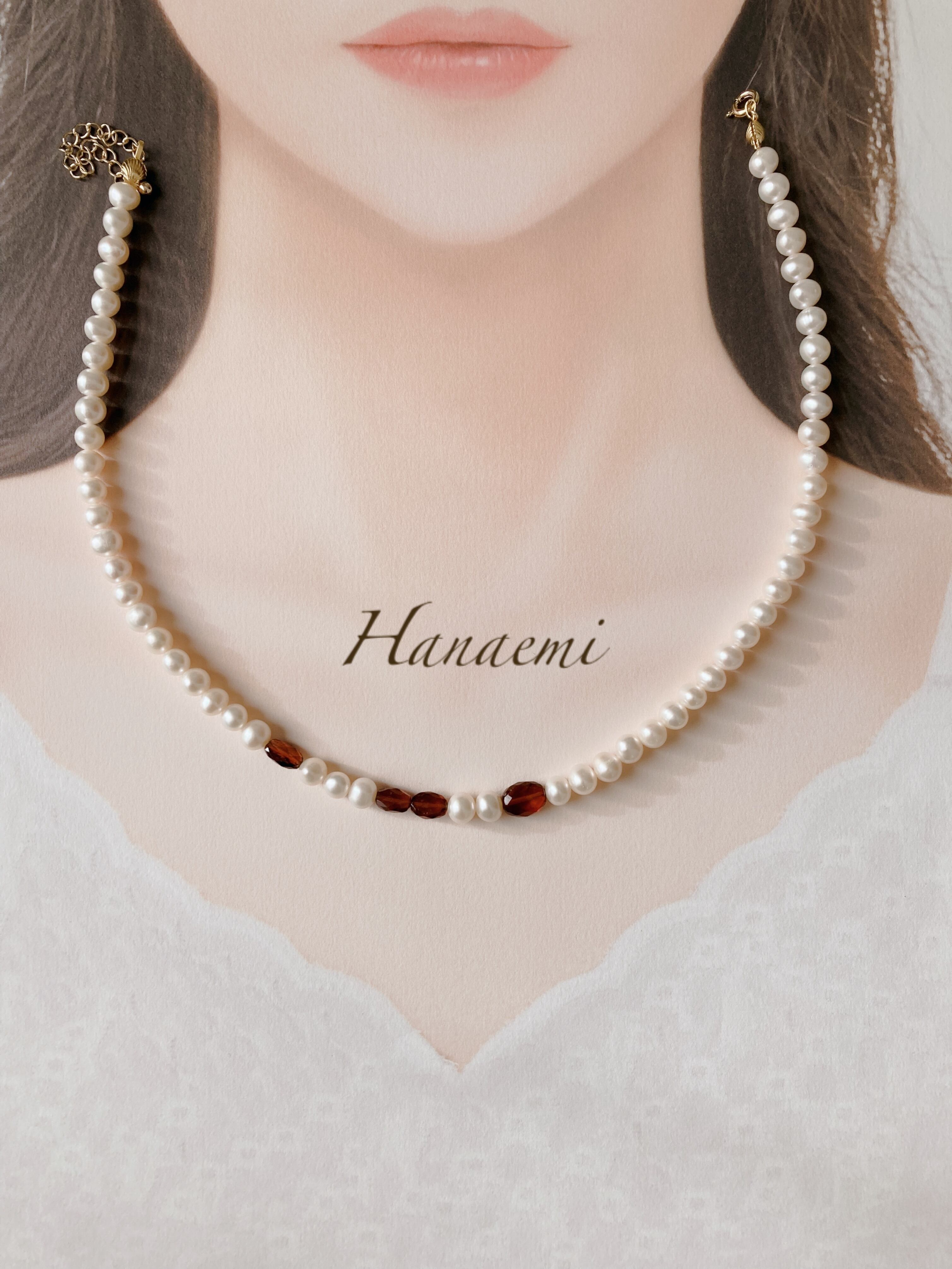 淡水パールは上品な輝き、ガーネットは細かいカットが施され、キラリと美しい物を選びました。一点物になります、ぜひ楽しんで頂けたら嬉しいです。
