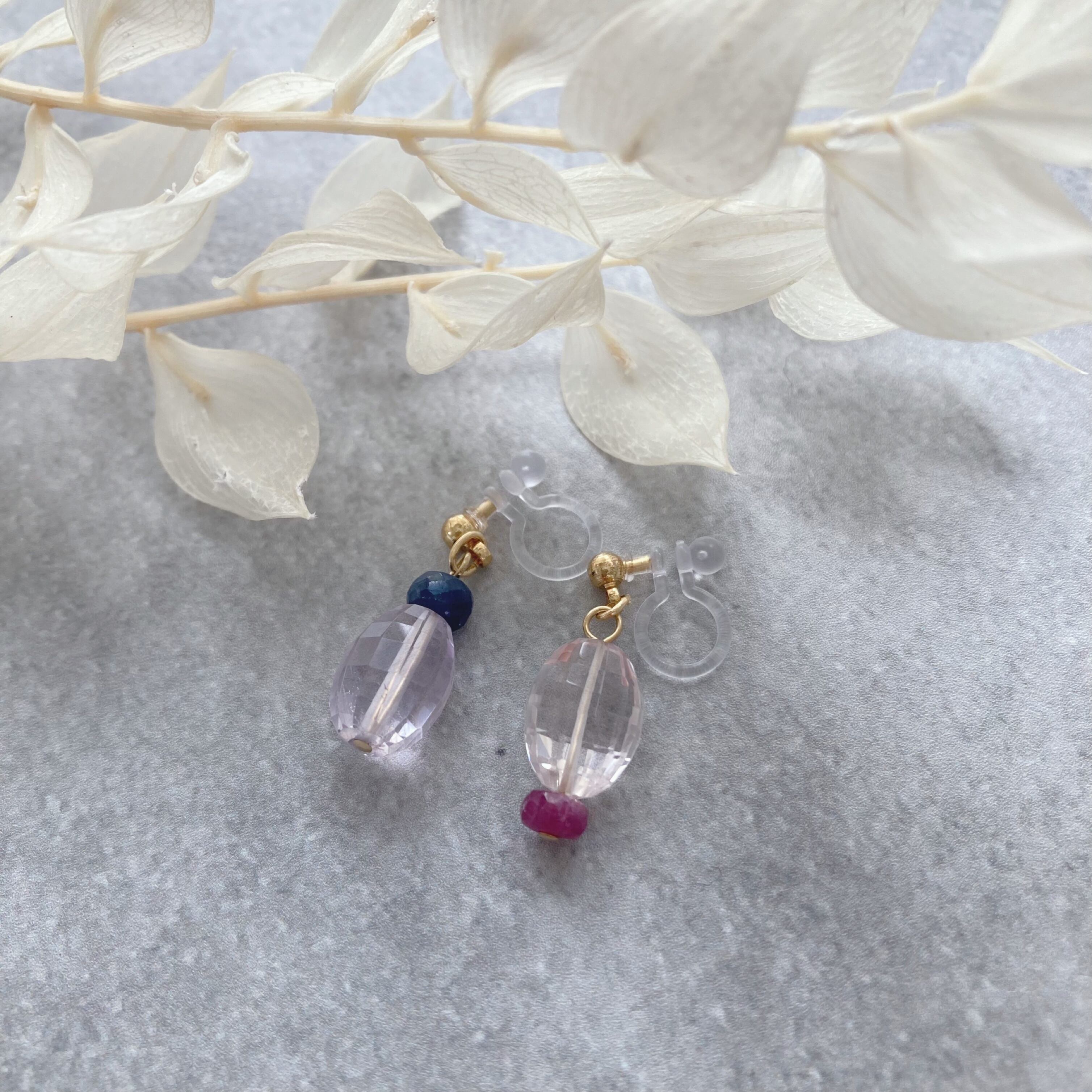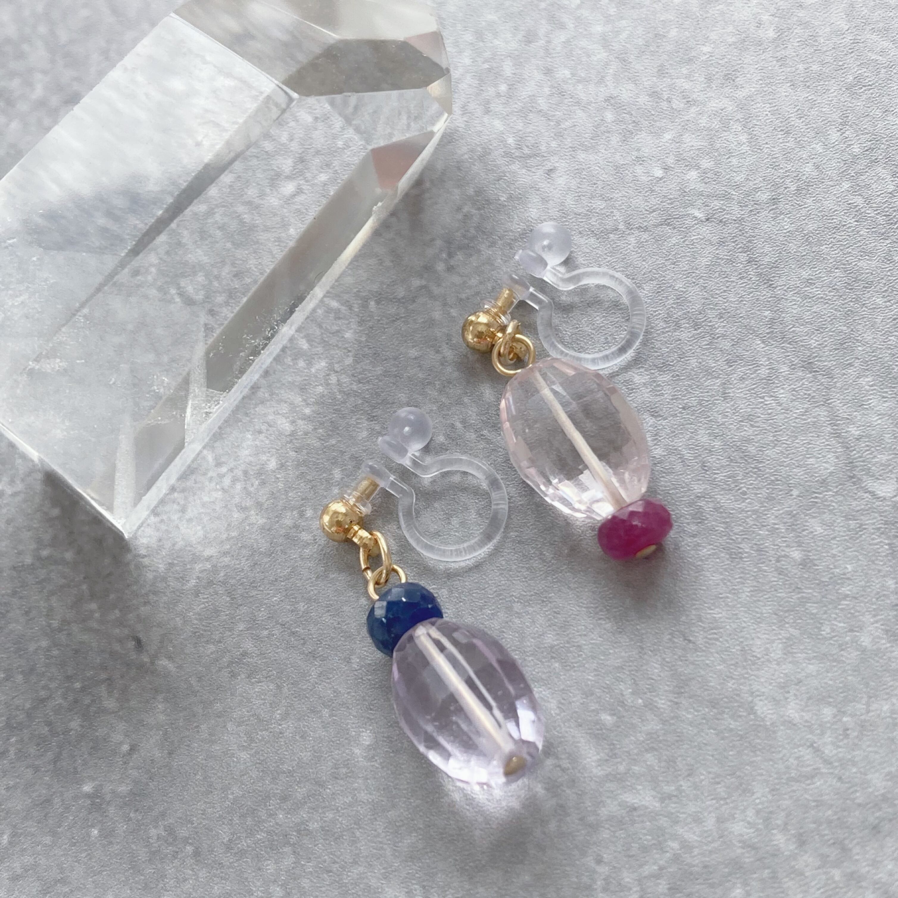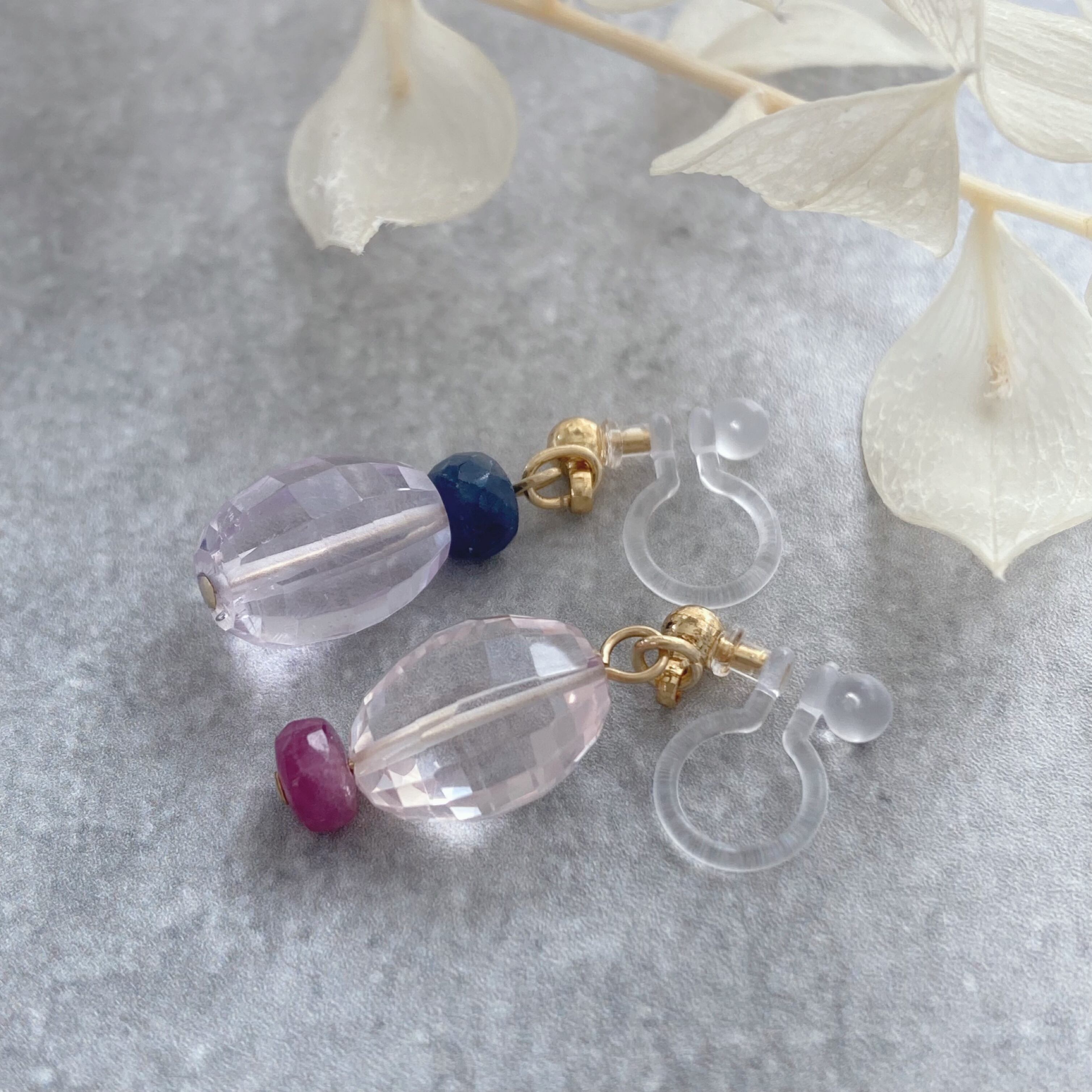 1つは、ローズクオーツにピンクサファイア。もう一つは、アメシストにブルーサファイアを組み合わせたイヤリングになっています。