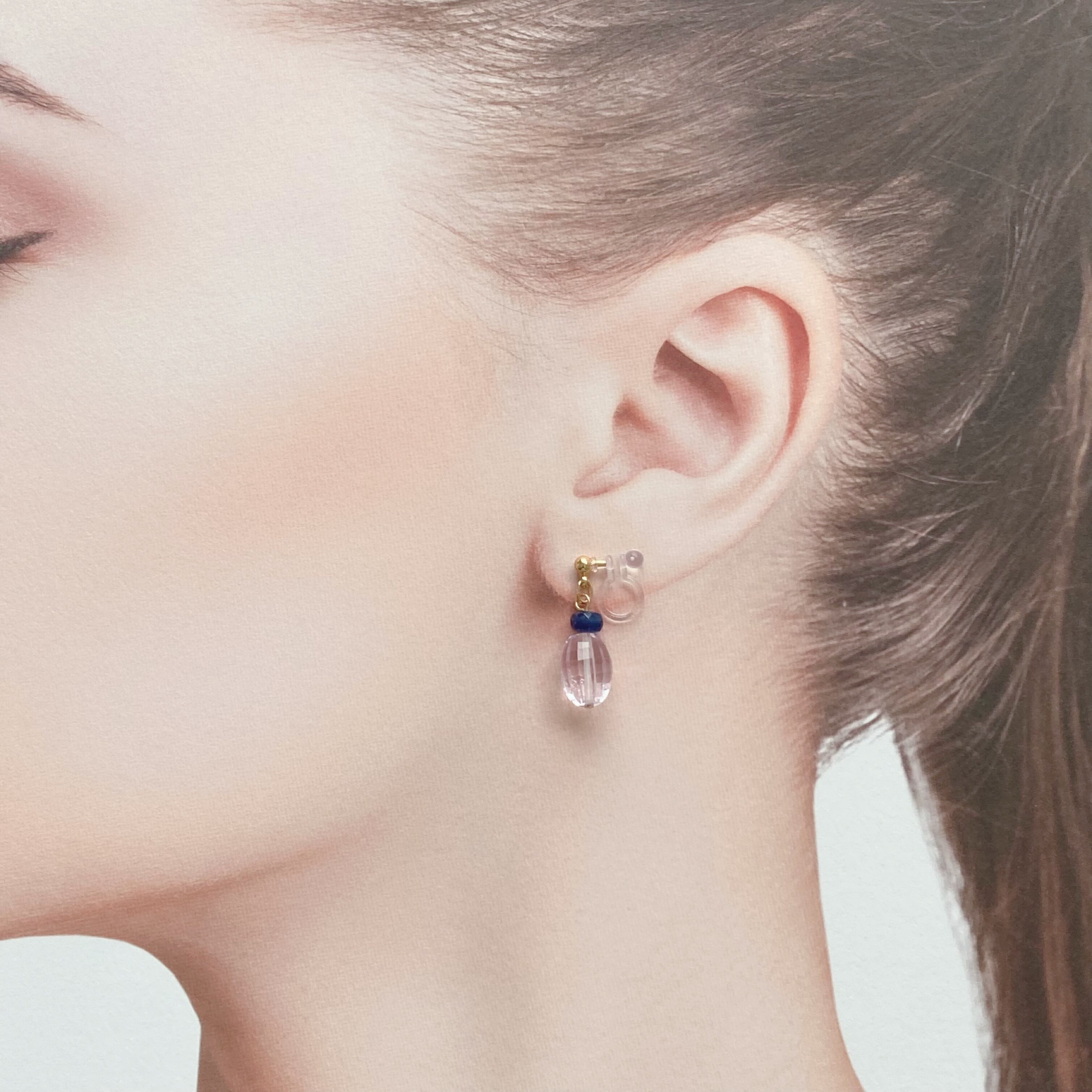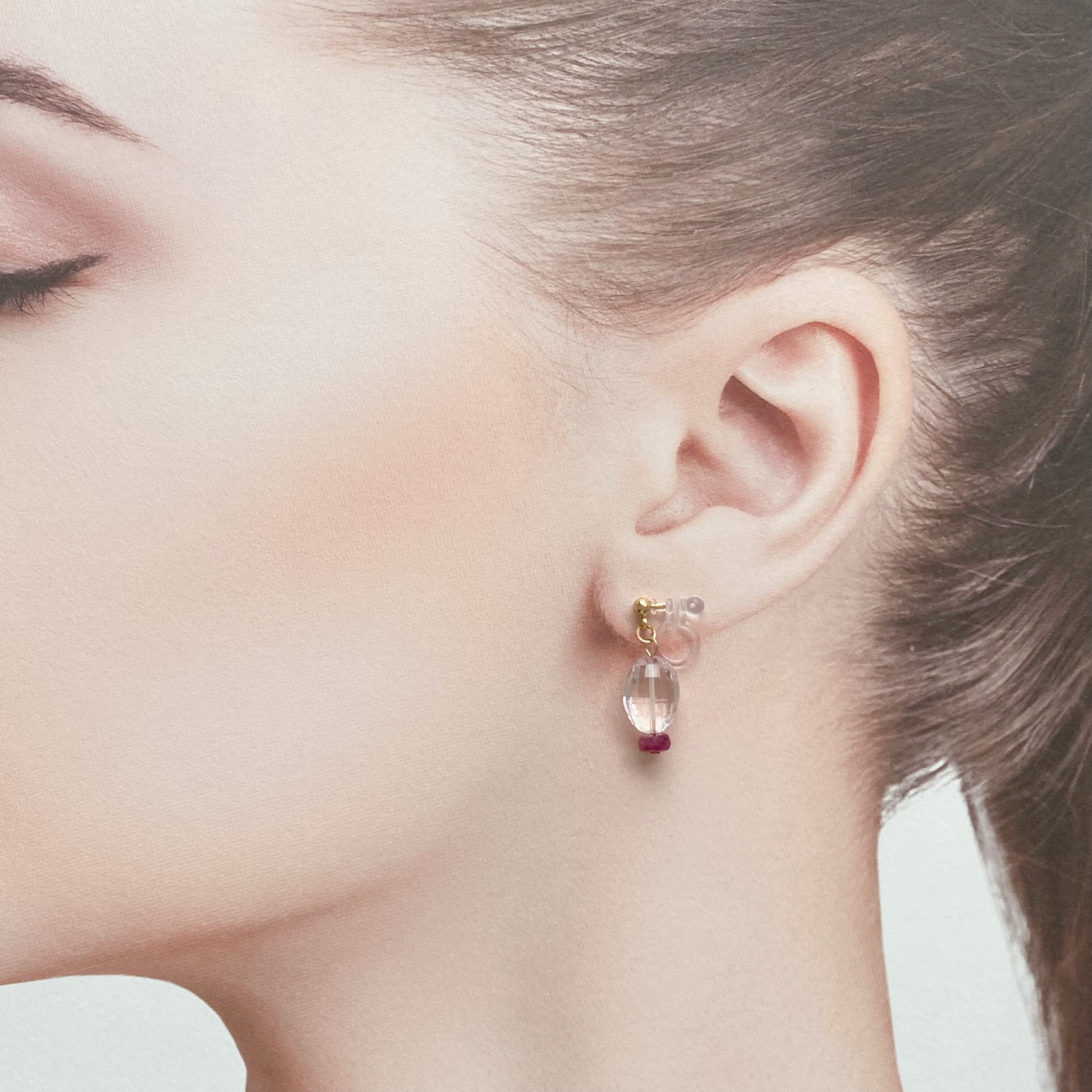 とても透明度の高いローズクオーツや、アメシストなので、より透明感を演出できると考え、イヤリング部分は透明樹脂を採用しました。