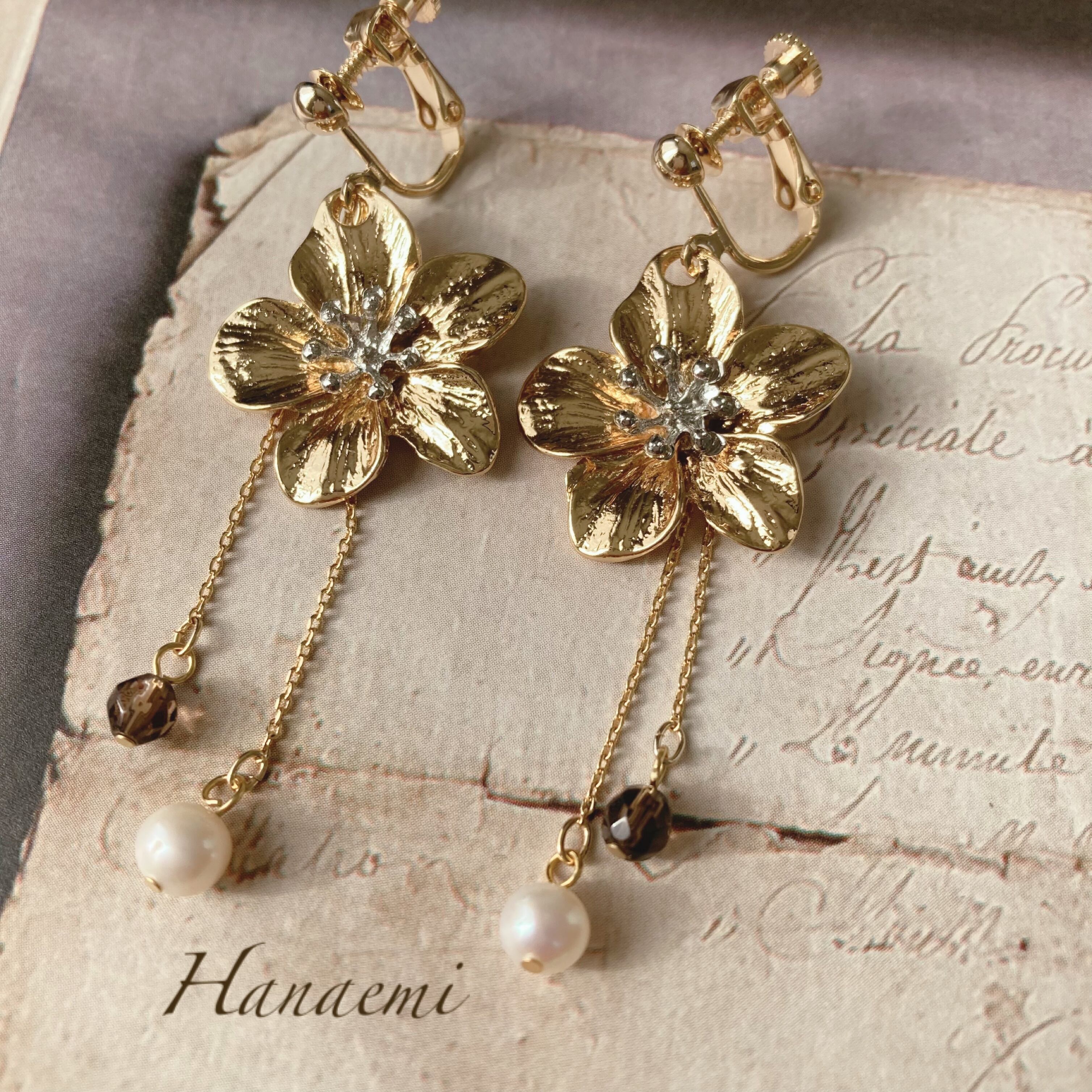 使われている天然石は、スモーキークオーツと淡水パールです。少しアンティークな雰囲気の作品ですが、天然石のスモーキークオーツは石言葉が「グランディング」そう、地に足を着けて目標や夢に向かう石と言われています。そして淡水パールですが、持ち主が毎日を幸せに送る環境をととのえてくれると言われております。