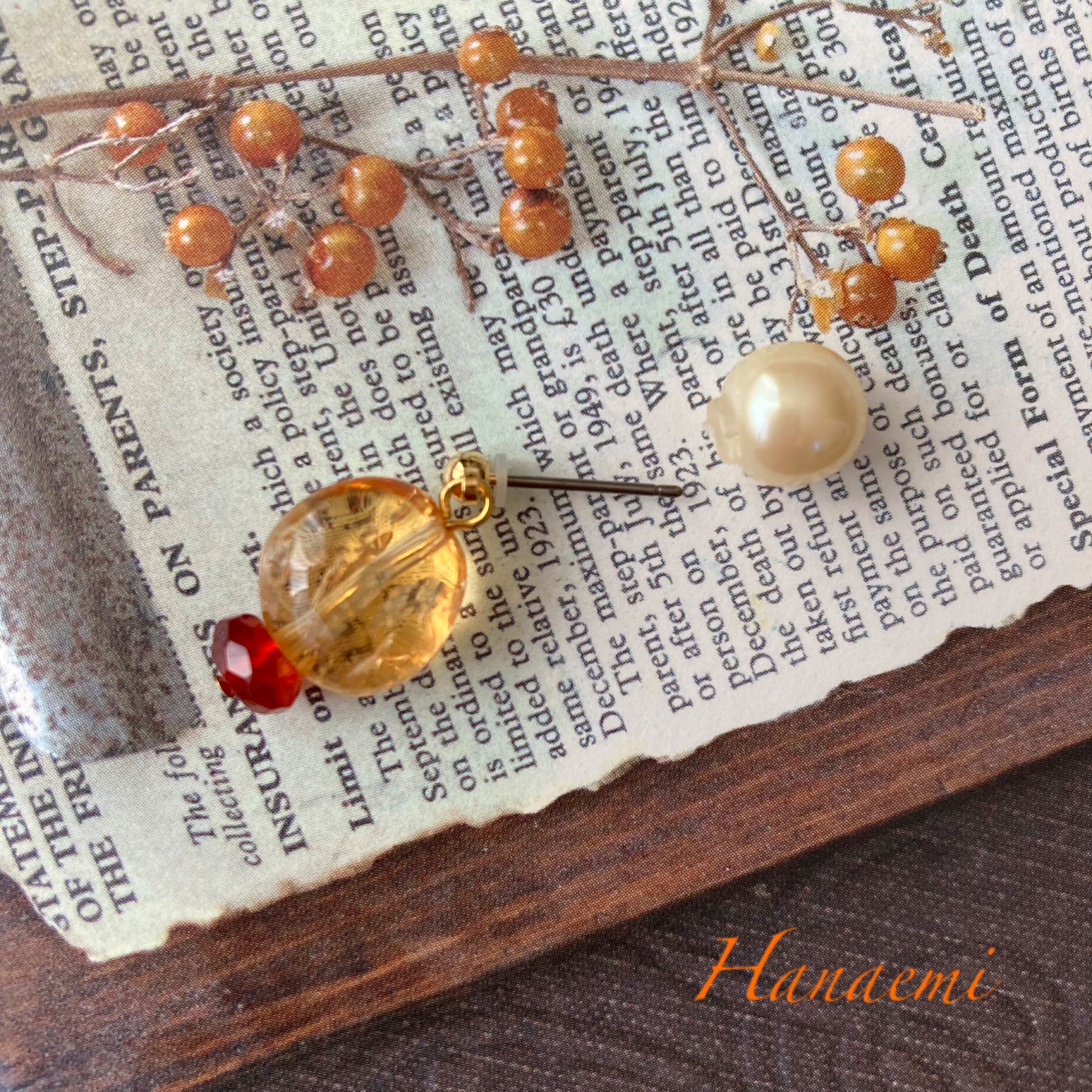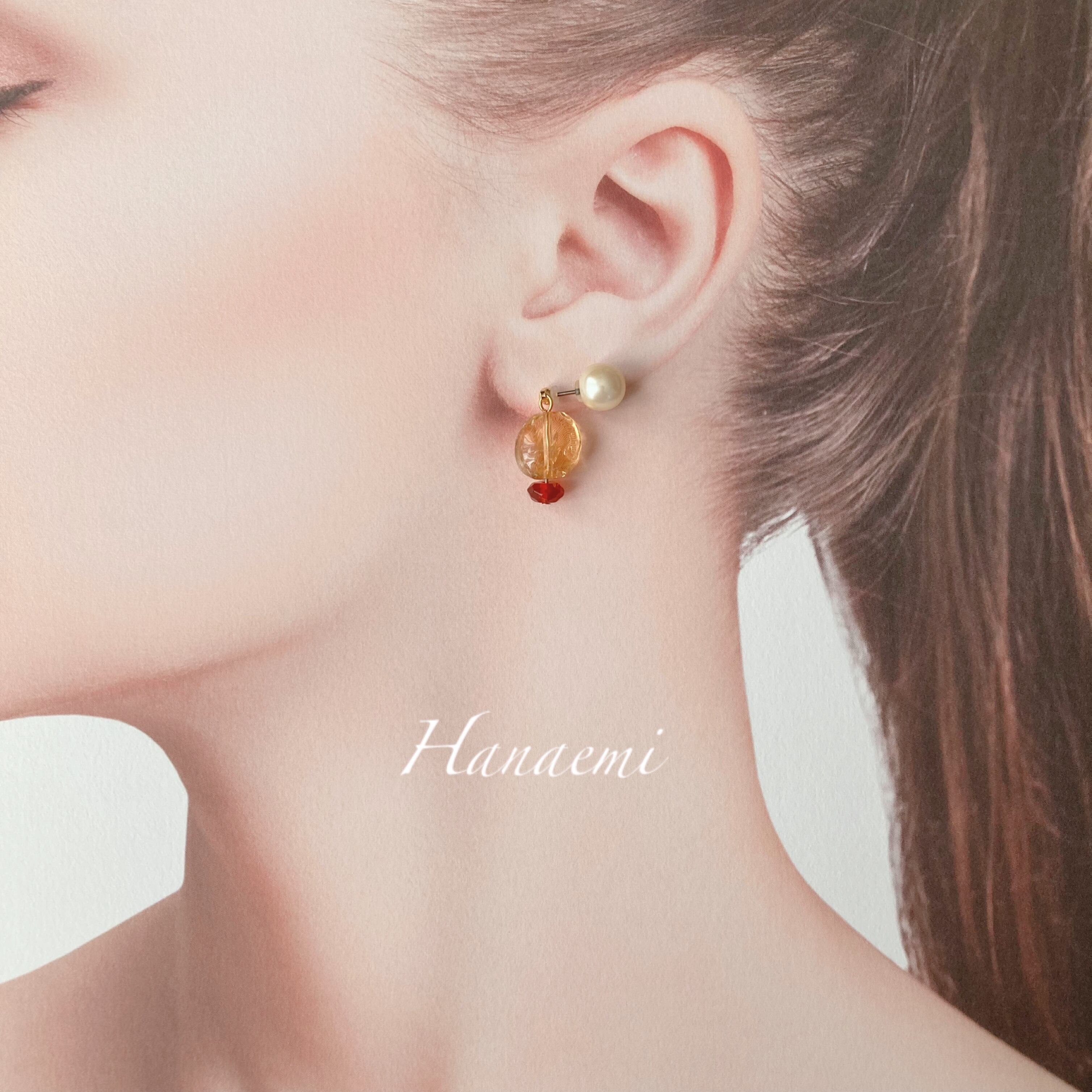 使われている天然石はシトリンですが、しっかりした豊な蜜の様なカラーで、豊さの果実を思わせるような美しさがあります。また、レッドアゲートを組み合わせる事により、グッと大人っぽく色合いが引き締まります。左右で少しだけデザインを変えてありますので、左右の表情の違いを楽しんで頂けたら嬉しいです。