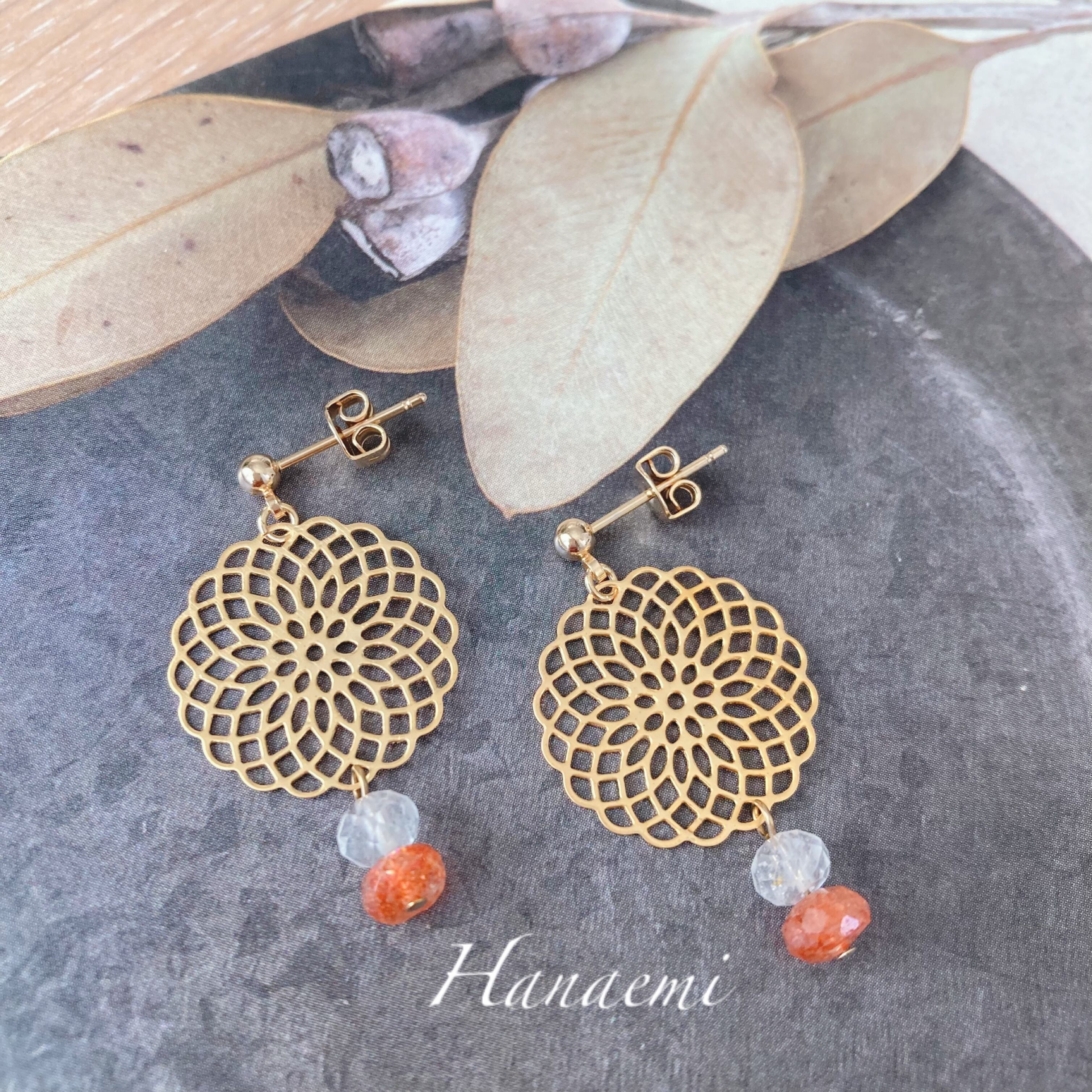 サンストーンの石言葉は、自信と積極性を高め、隠れた才能を開花させ、勝利と成功へと導いてくれると言われています。まさに「開花」!そんな言葉を少しお守りに、このピアスを楽しんで頂けたら嬉しいです。