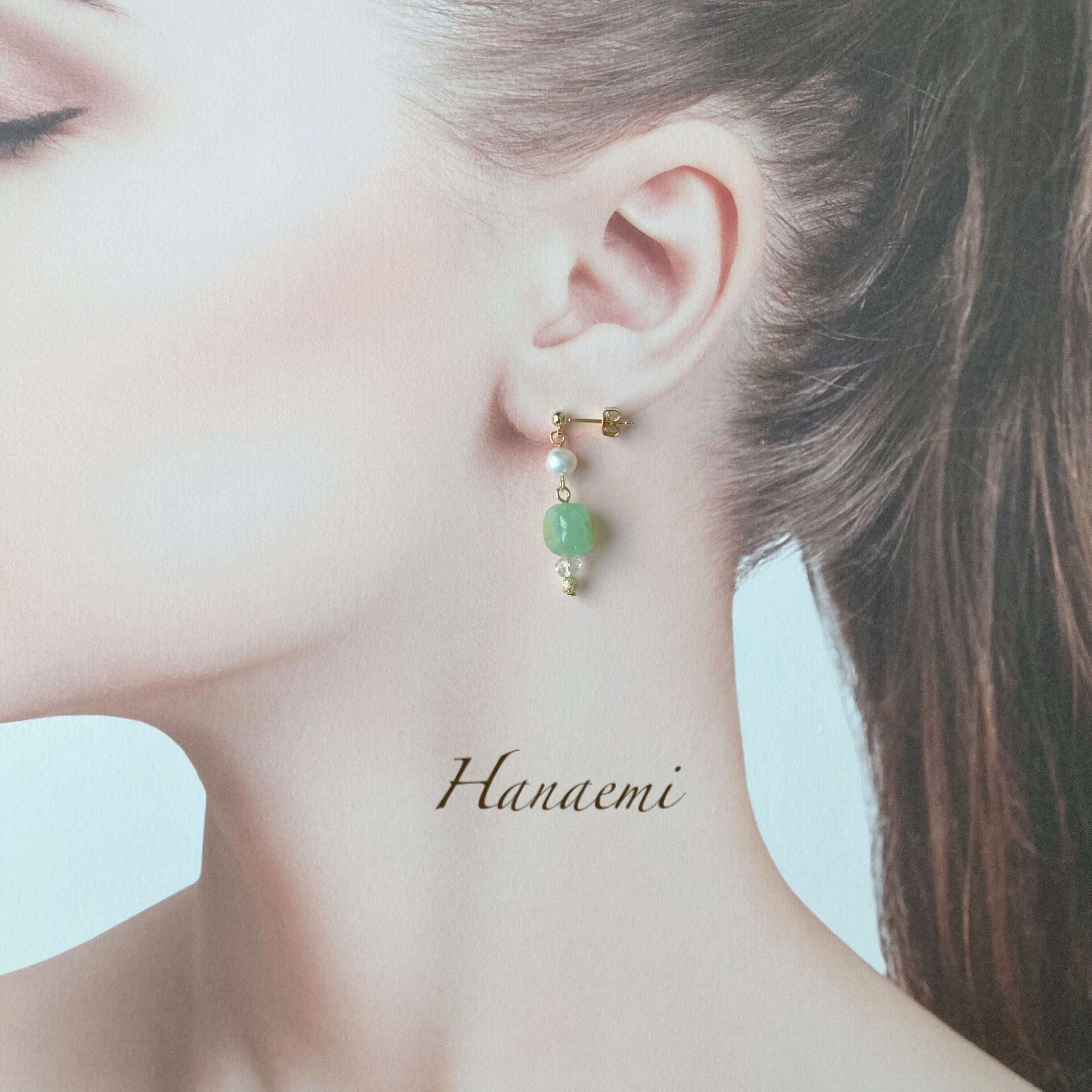 使われている天然石はクリソプレーズです。Hanaemiでクリソプレーズを使用する作品は初出品でございます。優しいパステルグリーンのクリソプレーズ、なんとなく懐かしいような、アンティークな雰囲気が魅力的な石です。この天然石の石言葉は「希望」「豊な実り」「癒し」「前向き」「成功」「自己実現」など、素敵な言葉が並びます。そんな石言葉をちょっとお守りに、天然石のアクセサリーとの日常を楽しんで頂けたら幸いです。