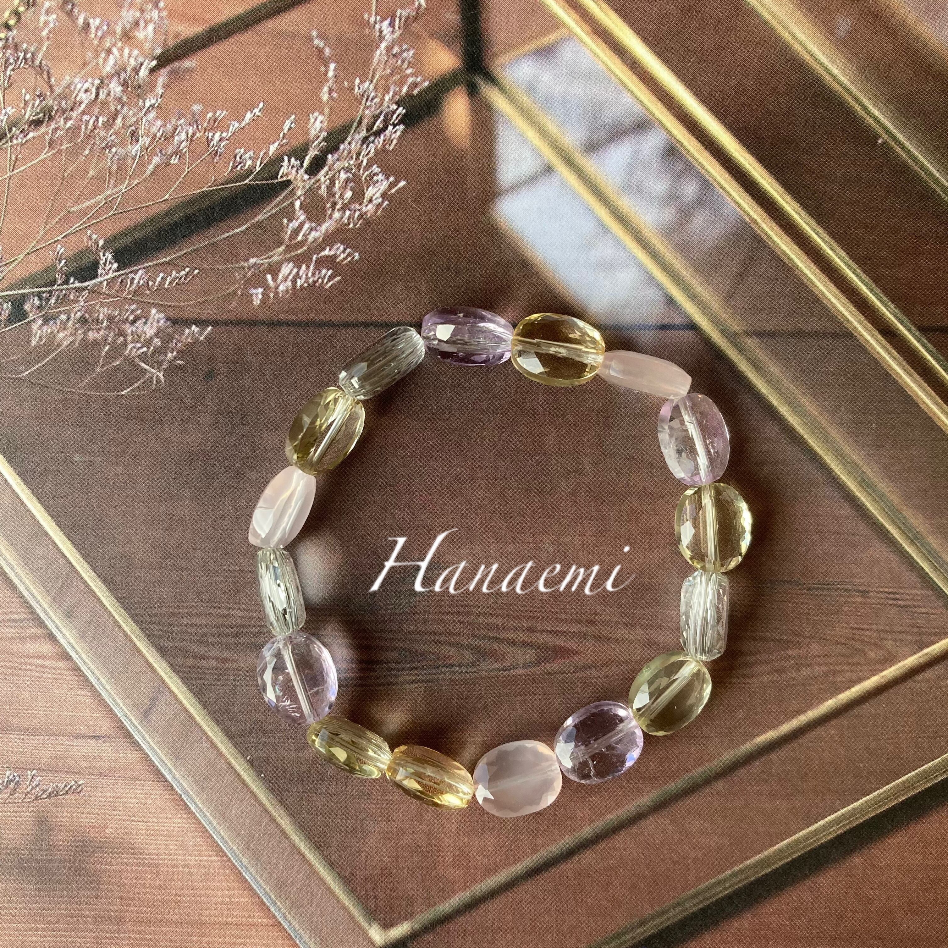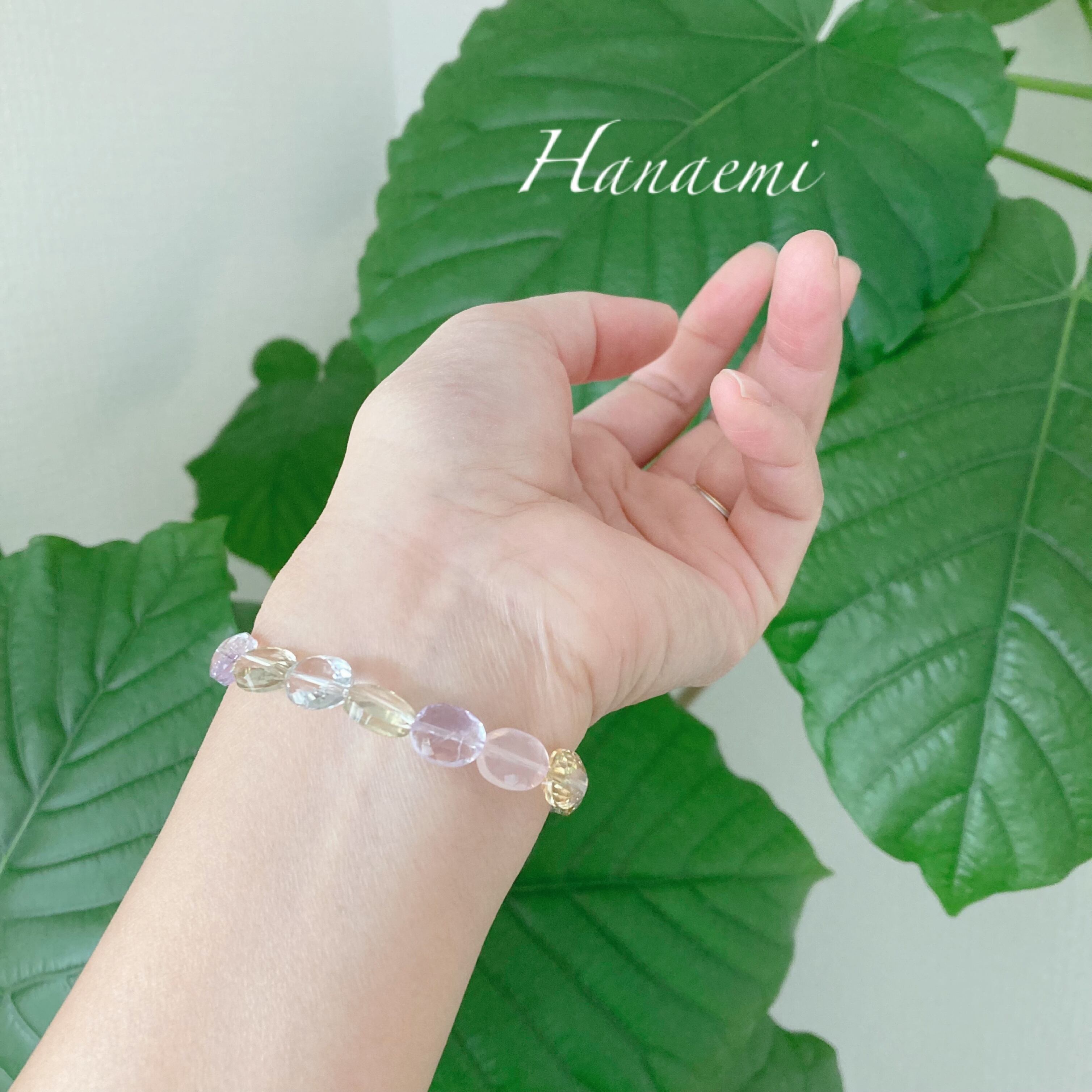 使われている天然石は、ローズクオーツ、シトリン、グリーンアメシスト、アメシストです。優しい彩りの石たちを厳選しました。こちらの天然石は全て宝石のような美しいカットが施され、天然石のブレスレットの枠を超えた美しさに魅了されます。こちらは一点物で、サイズが小さ目ですので、サイズ感が合う方で、こちらのブレスレットとご縁がある方は、ぜひご堪能頂けたら嬉しいです。