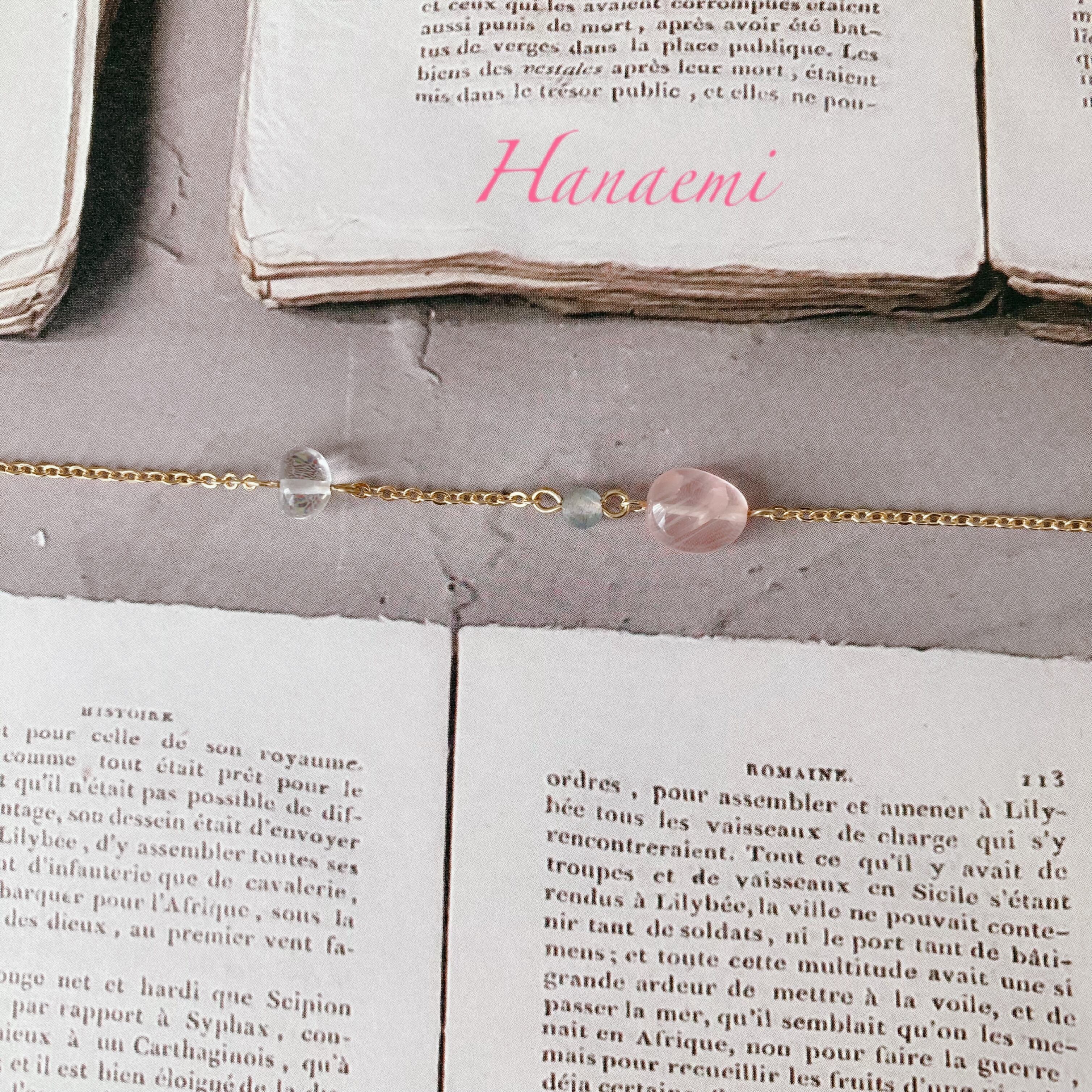 マダガスカル産のディープローズクオーツは小粒ながらにも、しっかりとしたピンクの色が美しくコロンとかわいい存在感がございます。また、ミステリアスなカラーのラブラトライト、そして浄化の王様と言われる水晶の3石を繋ぎ合わせました。