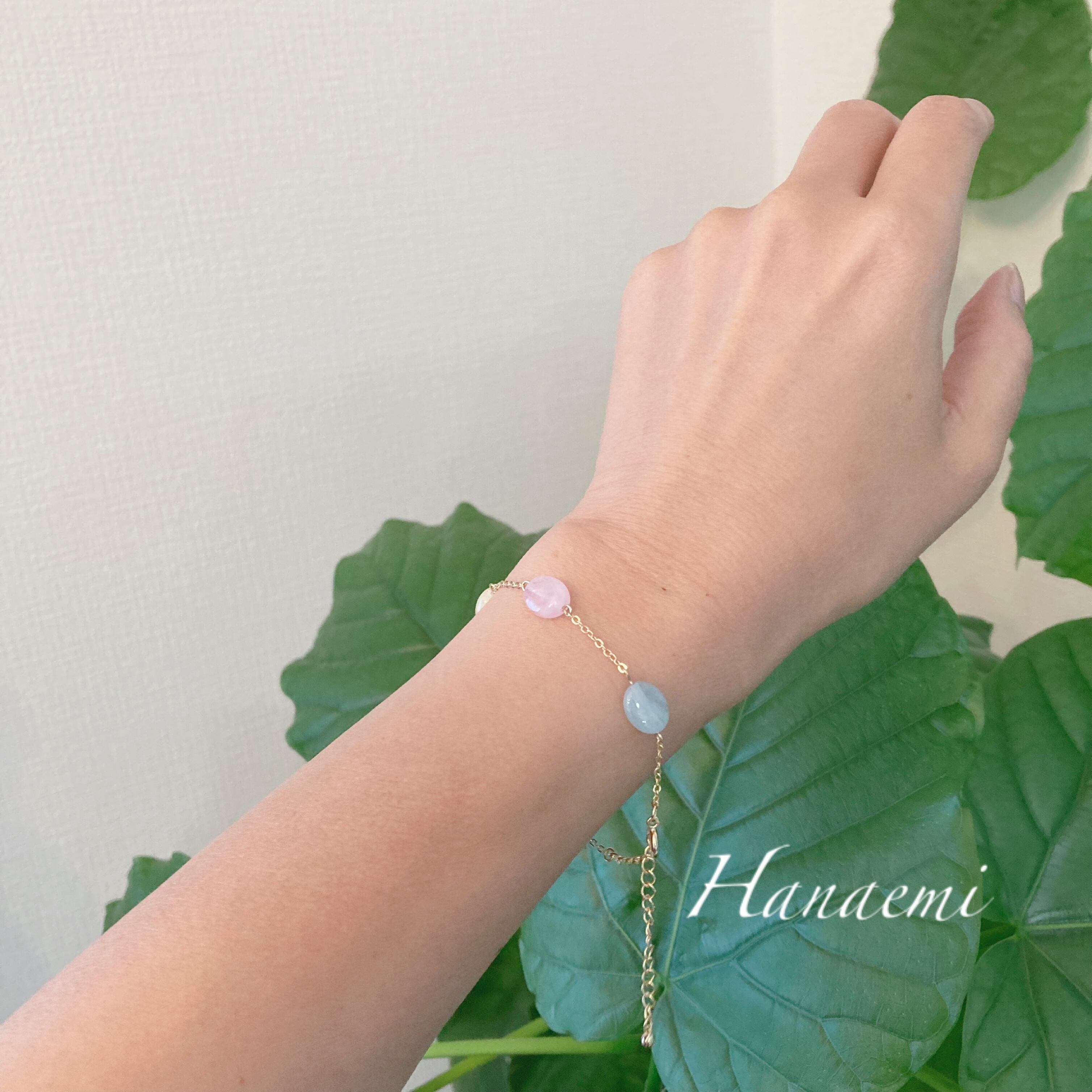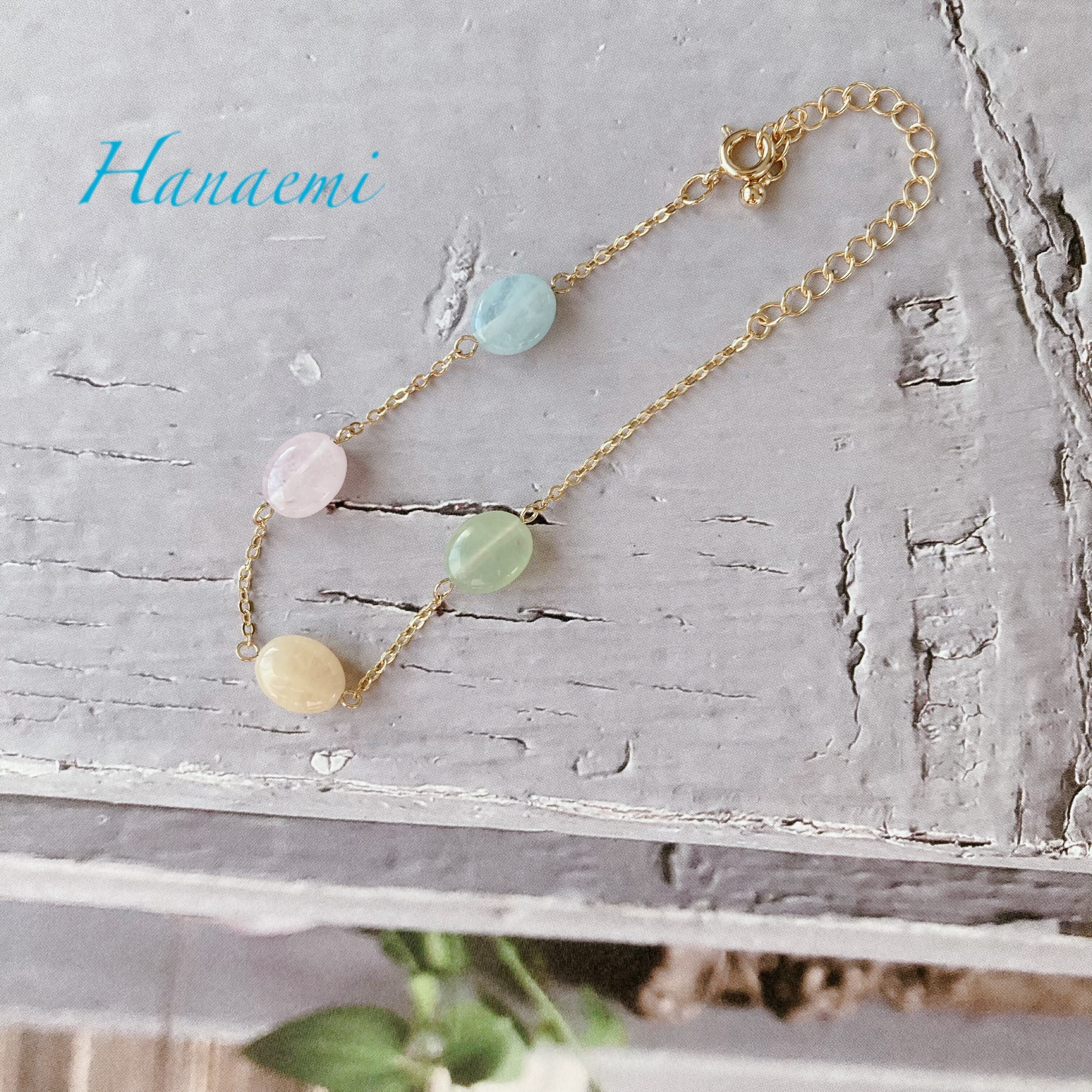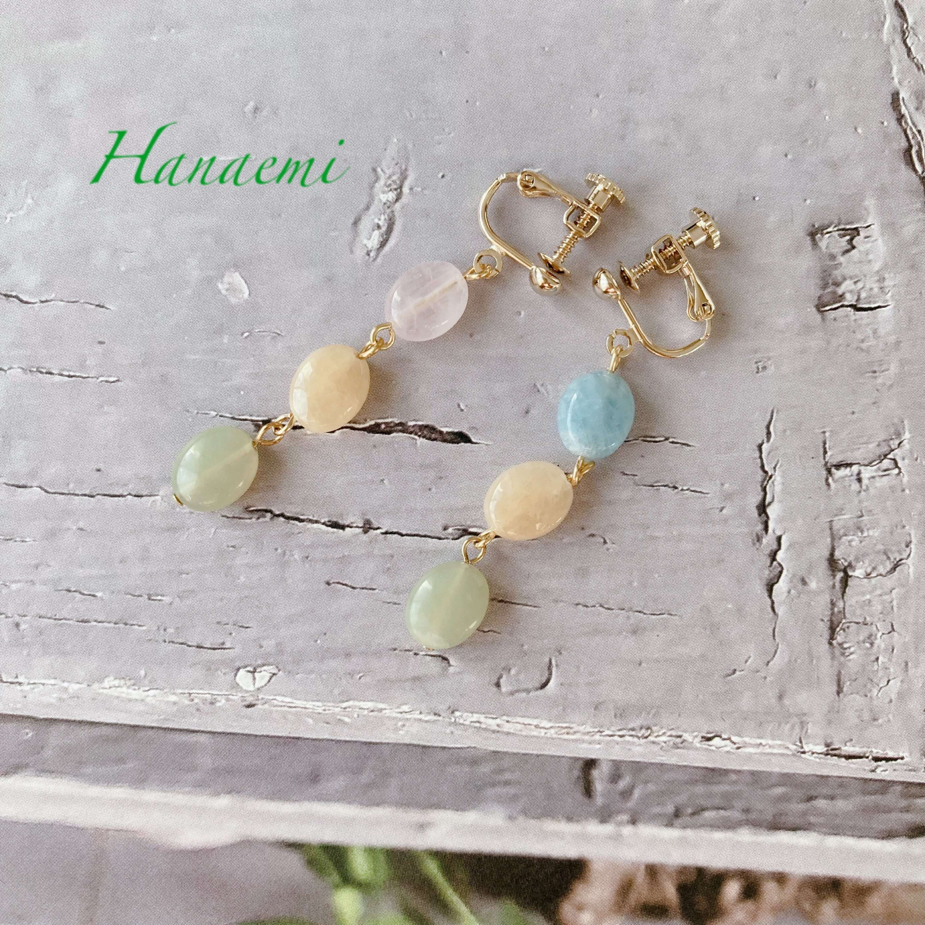天然石は、マルチカラーのベリル、アクアマリン系の石と、ローズクオー津、ジェイド系を使用しております。石言葉では、「ゆとり」「思いやり」「配慮」「ストレス軽減」「富」「ヒーリング」などと、魅力的な言葉が続きますが、そんな石言葉をちょっとお守りに、可愛らしいキャンディーのような天然石を楽しんで頂けたらと思います。
