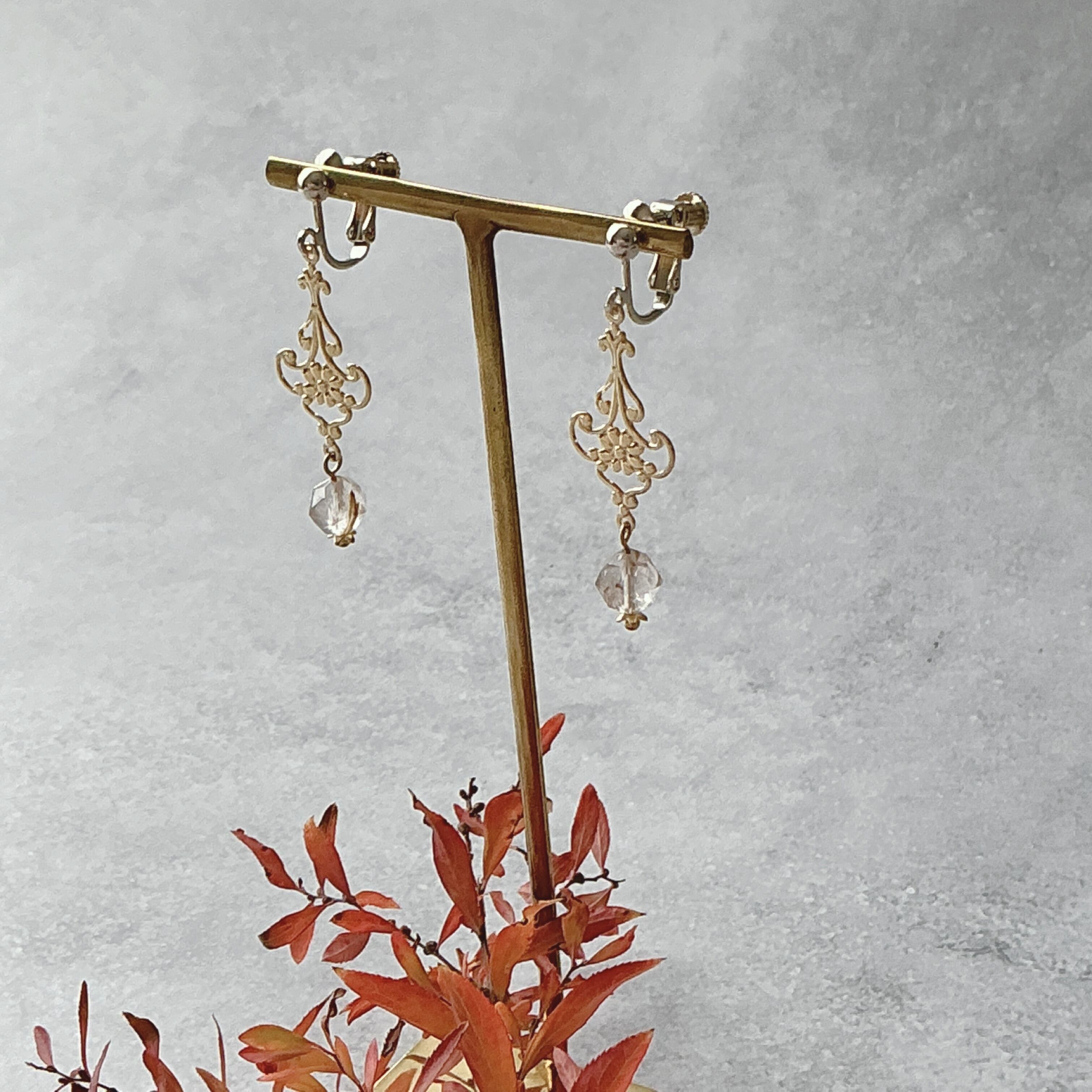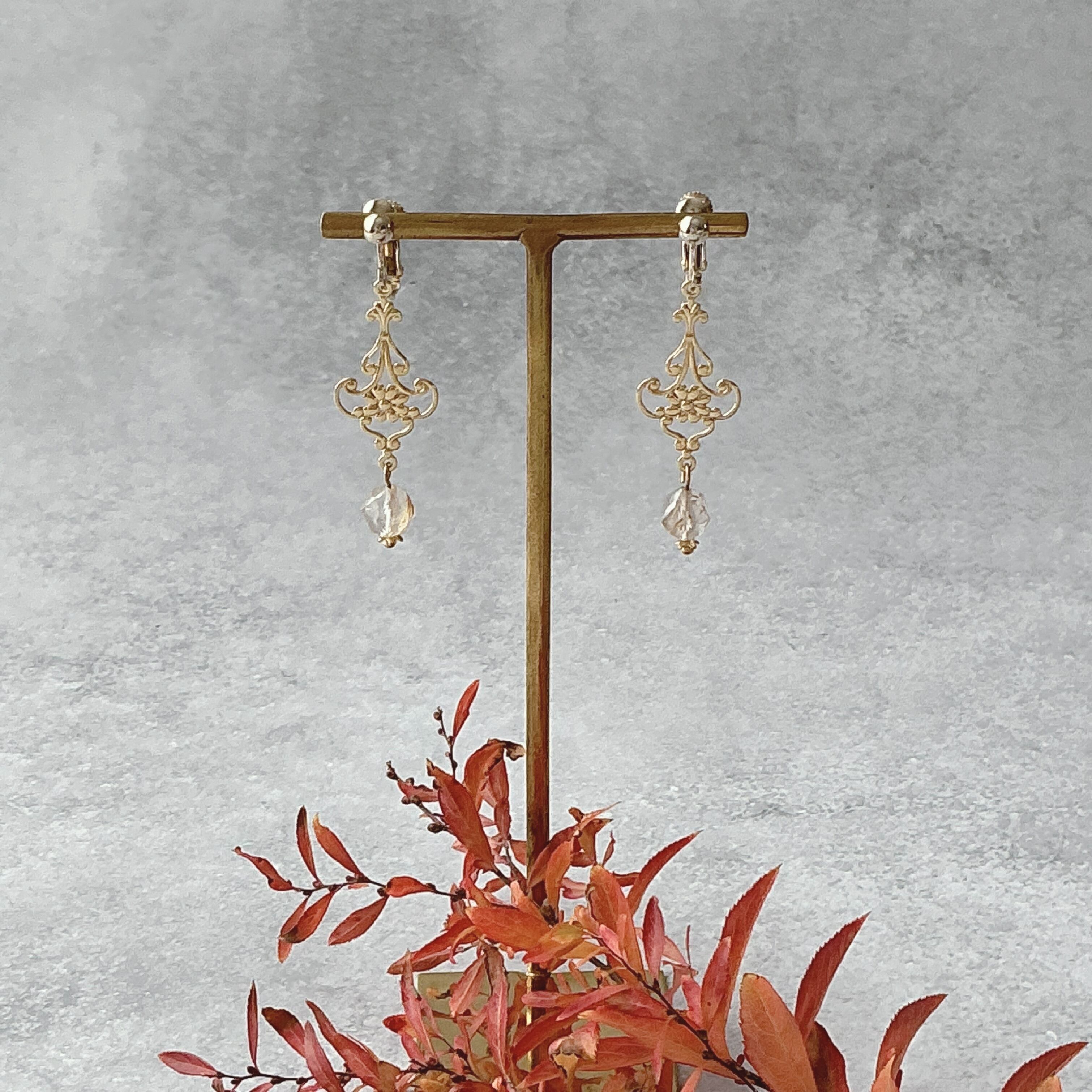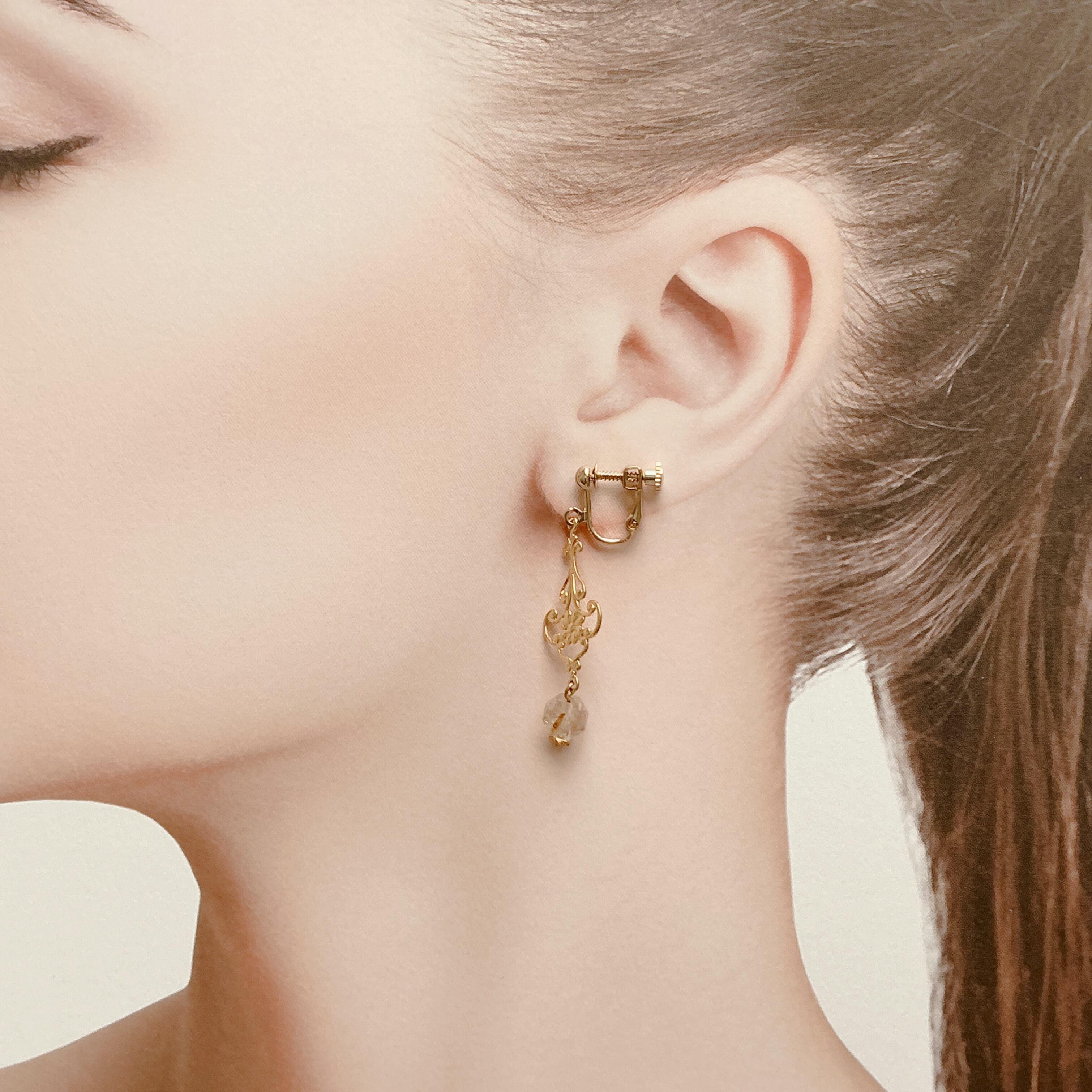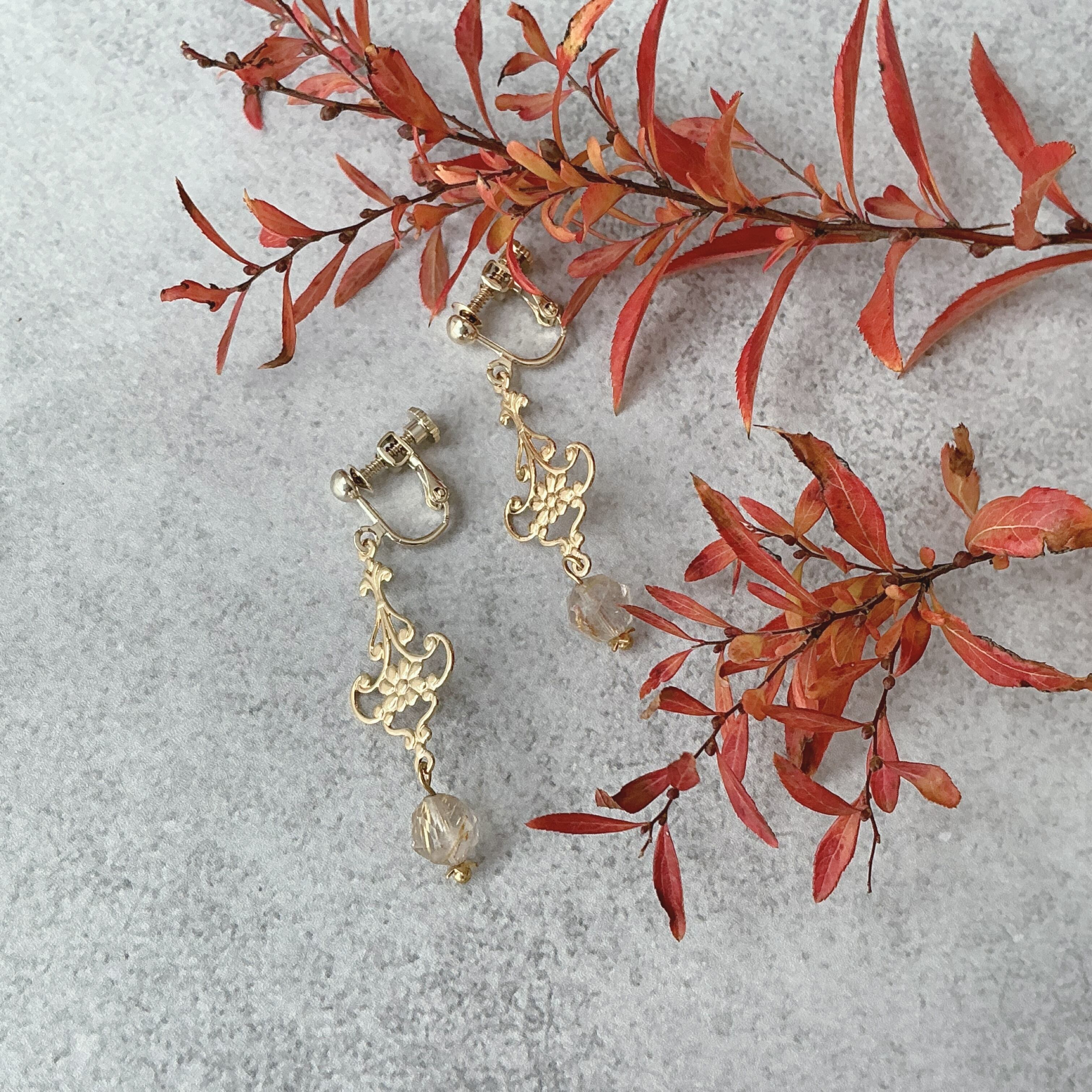 使われている天然石はルチルクオーツです。画像では伝え切れないのが残念ですが、美しいカットのルチルクオーツで、透明な中に金の針が美しく入っています。