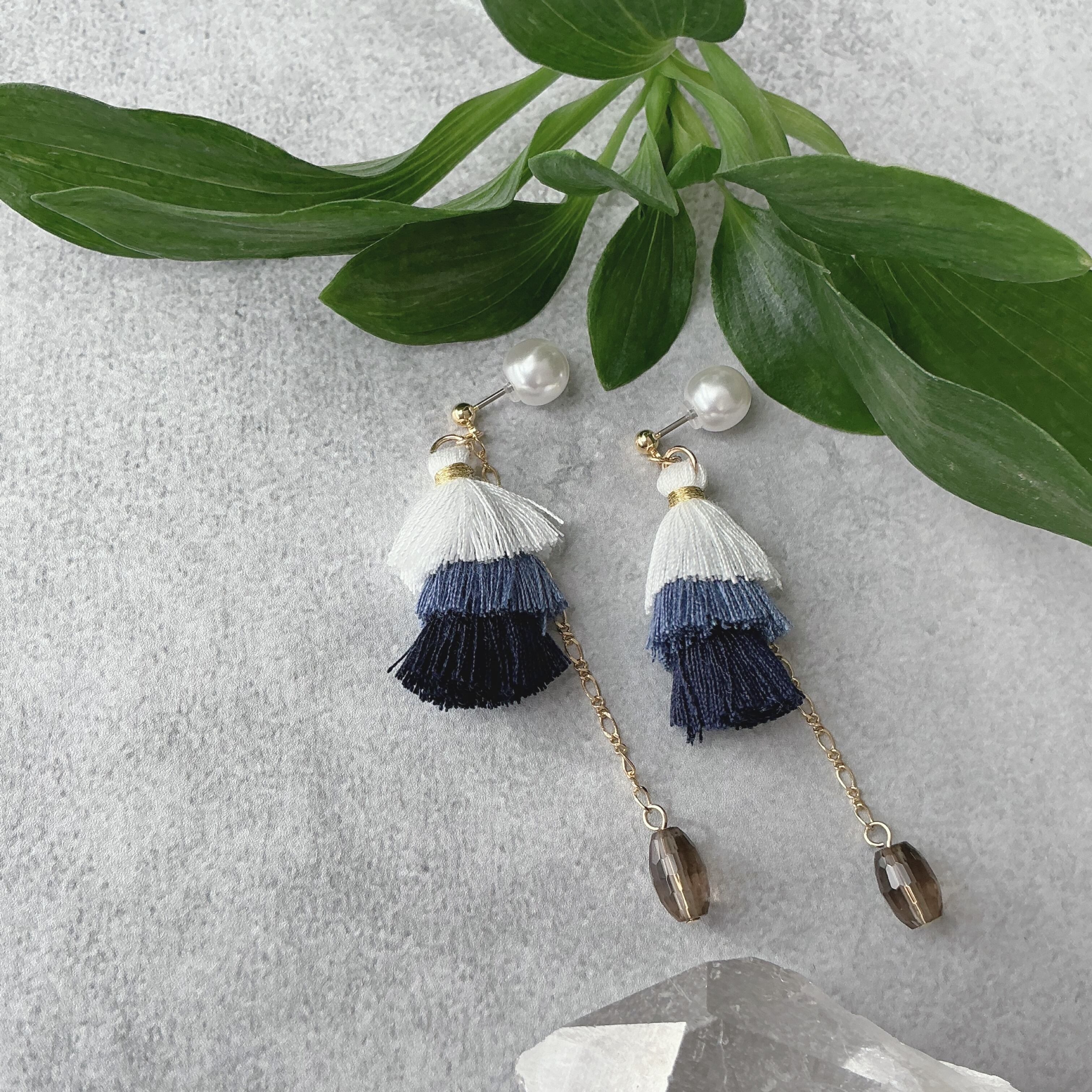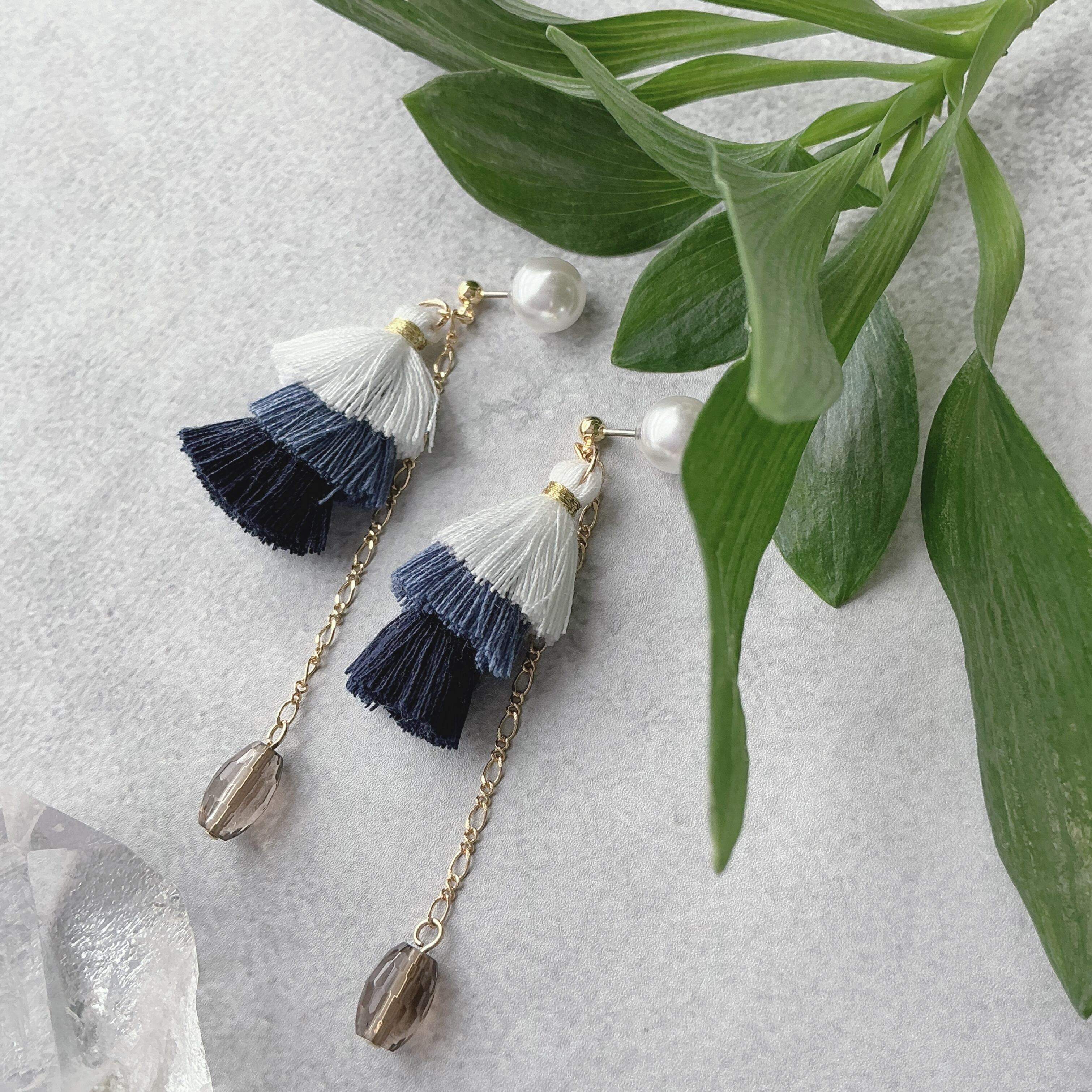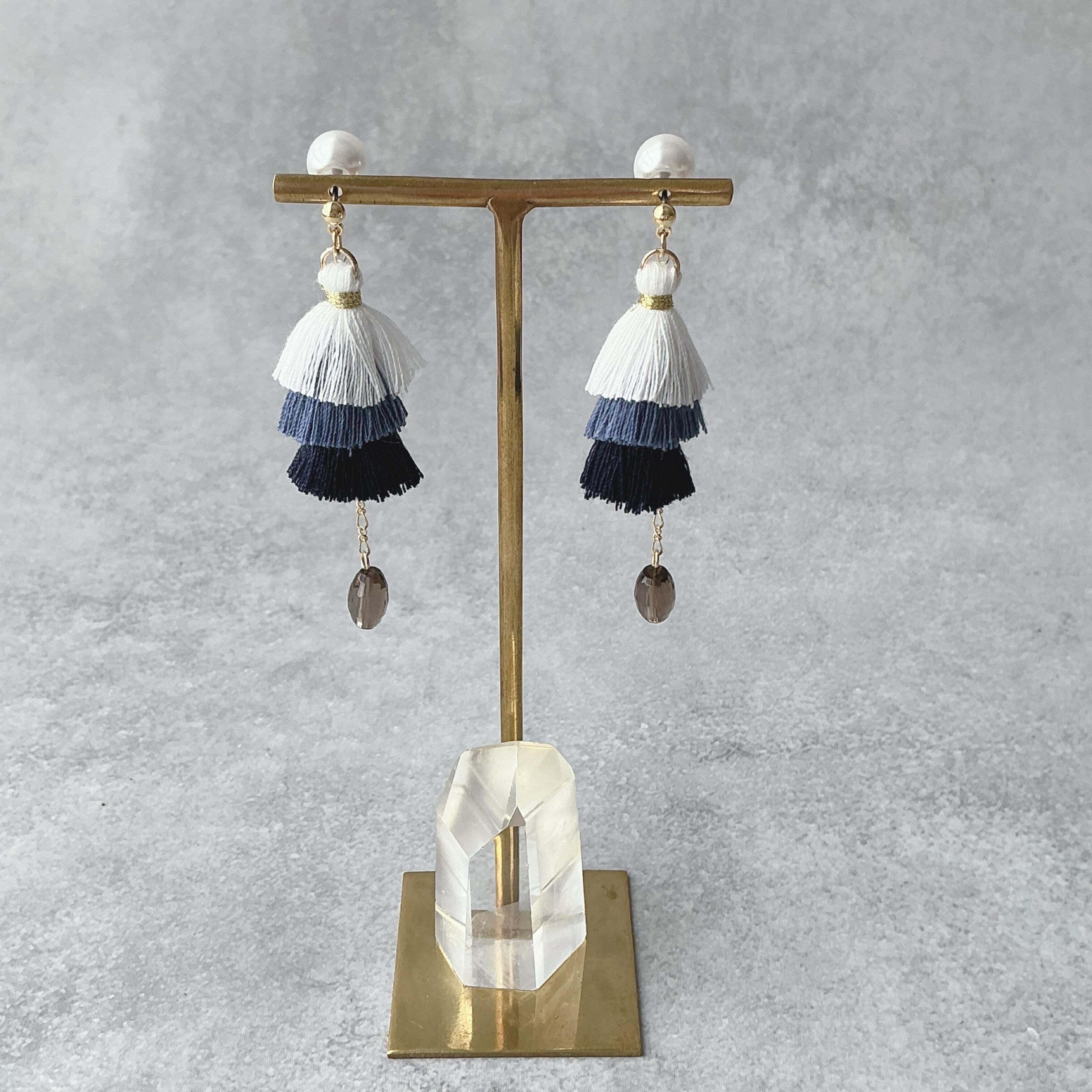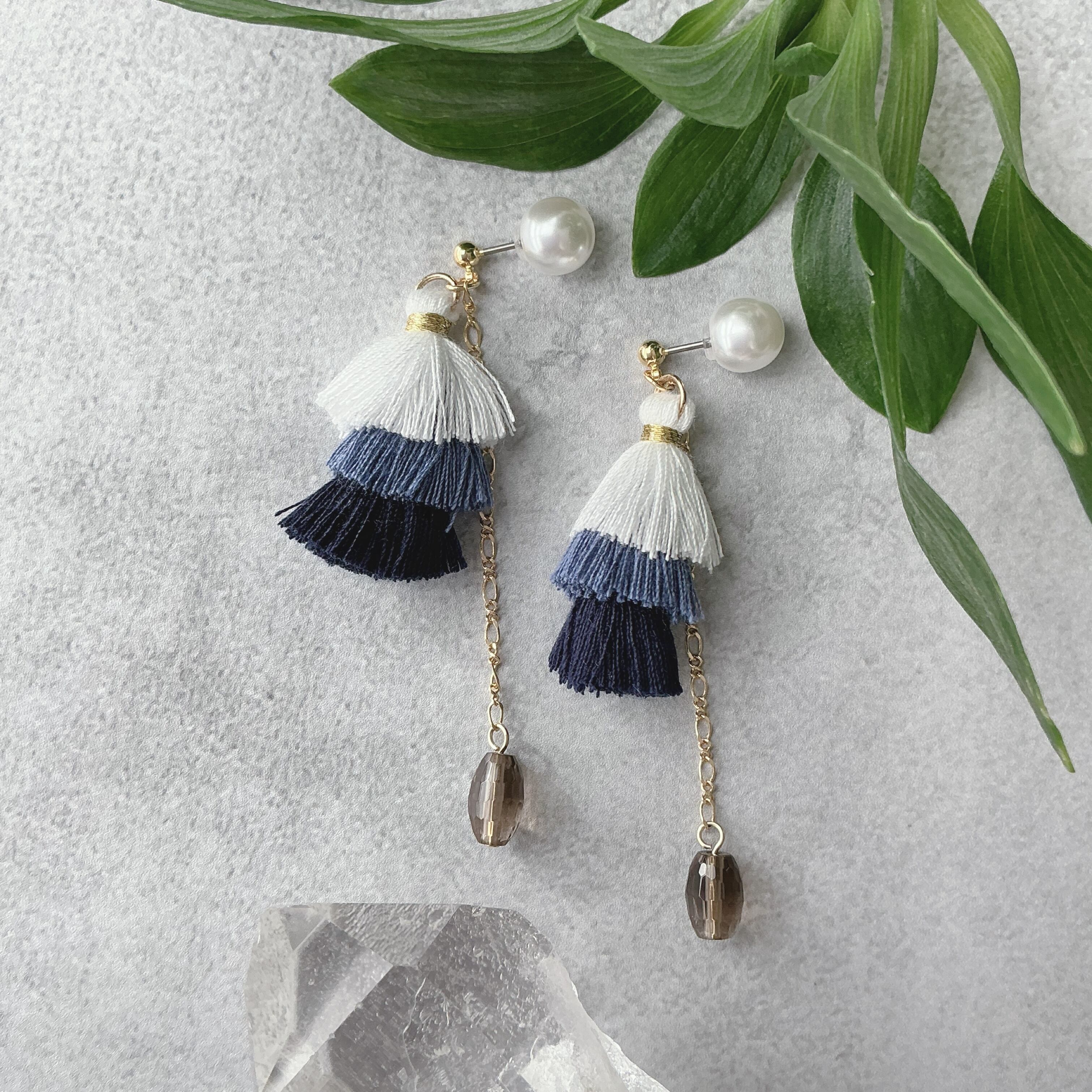 スモーキークオーツの石言葉は「危機回避」「求心」「軸」「現実性」「平常心」「安心感」などの言葉が並びます。そんなスモーキークオーツの真面目な石言葉とフリンジの重なるデザインから、一つ一つ楽しみや頑張りを積み重ねる事により、より良い未来へ向かえるよう「積み重ね」というタイトルにしました。
