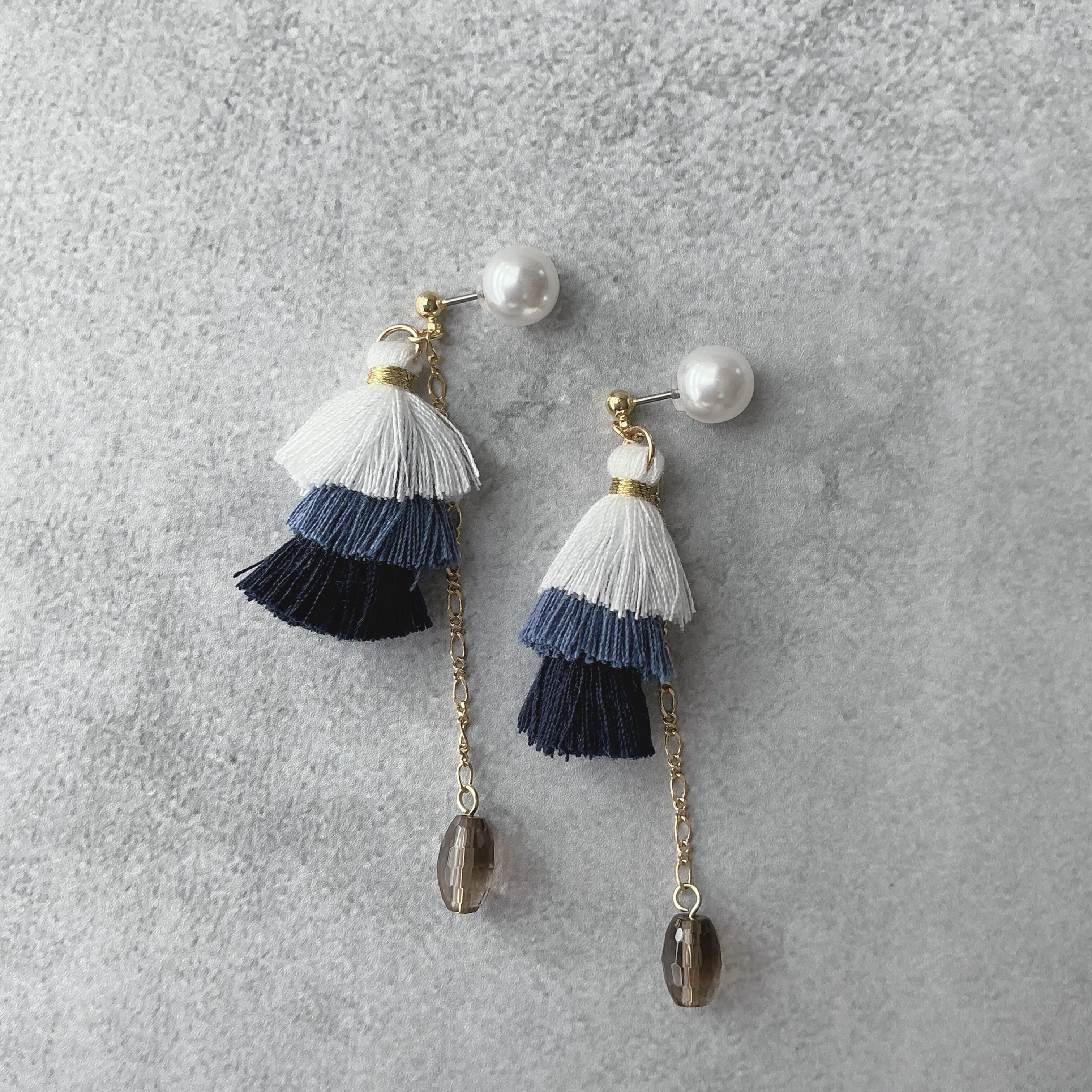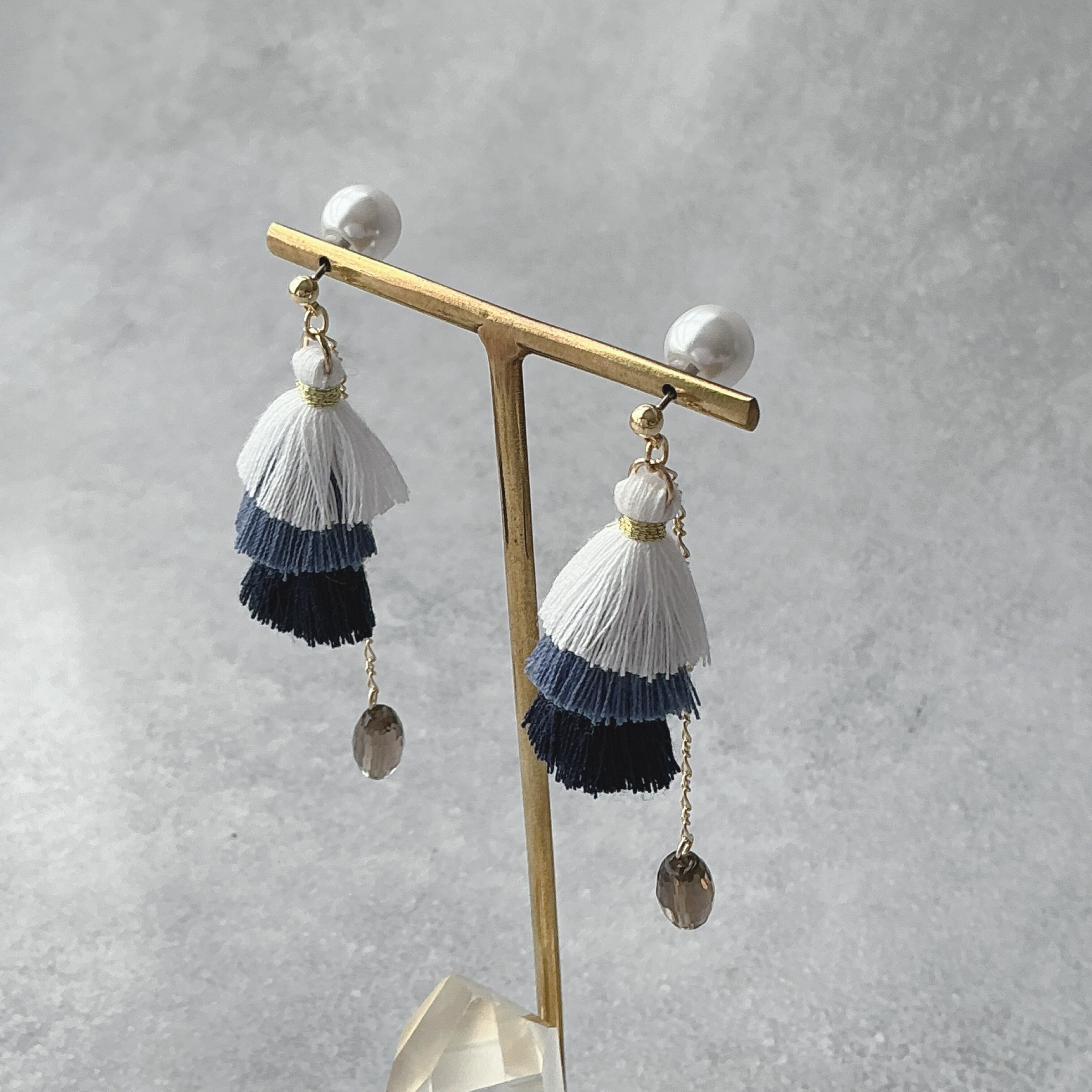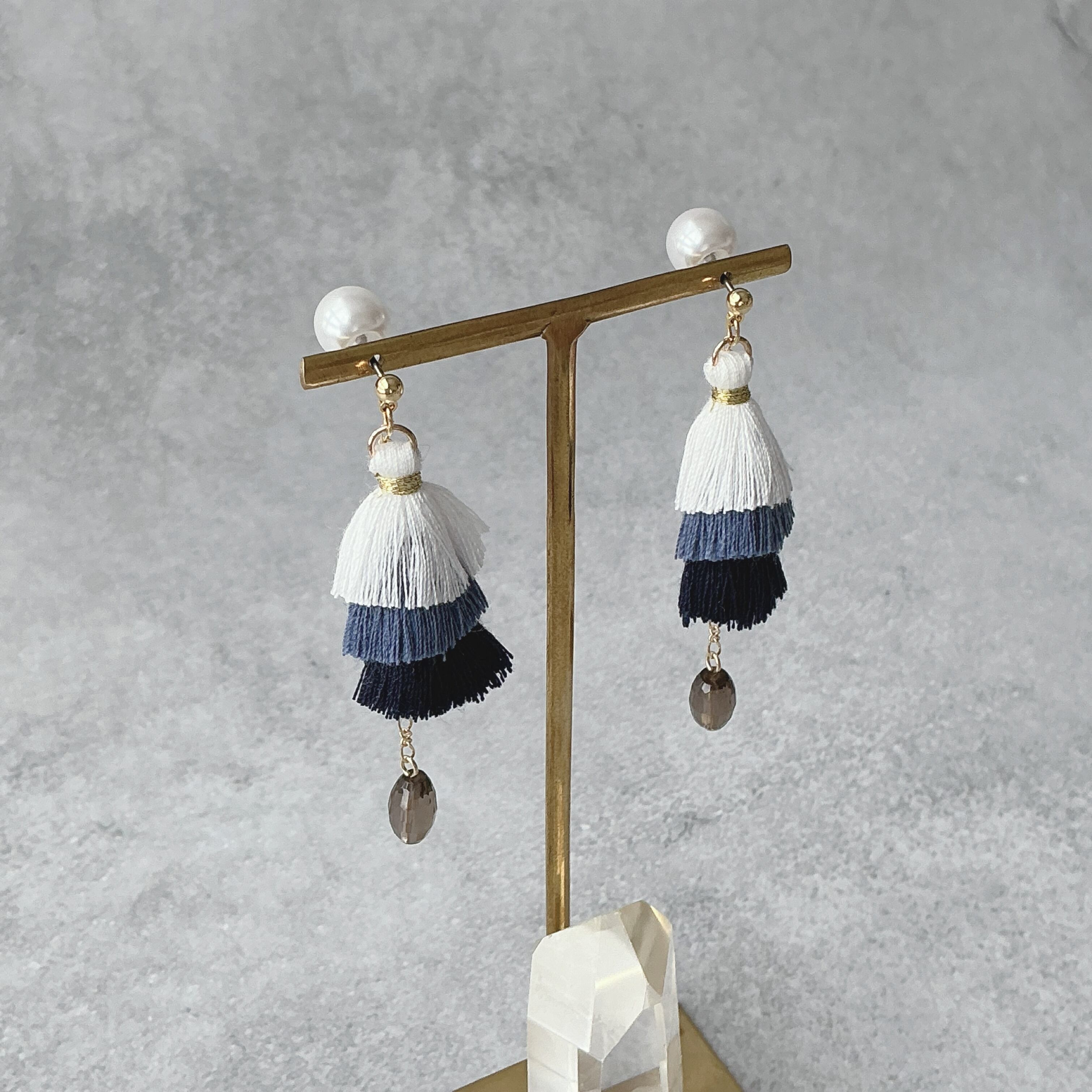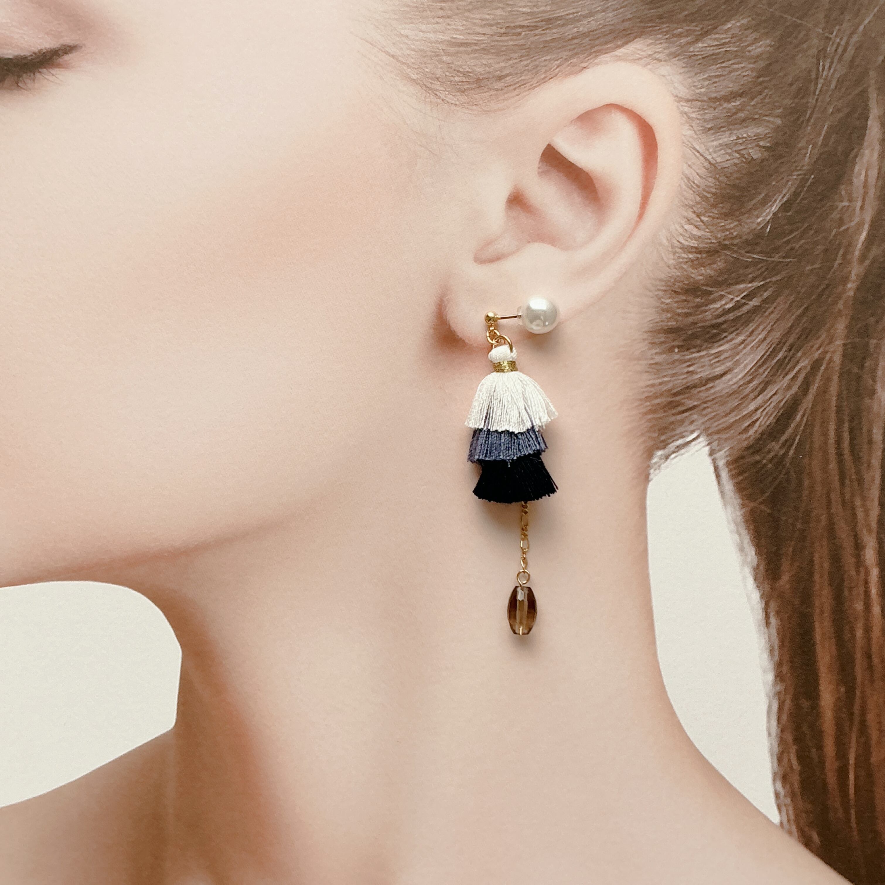 スモーキークオーツの石言葉は「危機回避」「求心」「軸」「現実性」「平常心」「安心感」などの言葉が並びます。そんなスモーキークオーツの真面目な石言葉とフリンジの重なるデザインから、一つ一つ楽しみや頑張りを積み重ねる事により、より良い未来へ向かえるよう「積み重ね」というタイトルにしました。