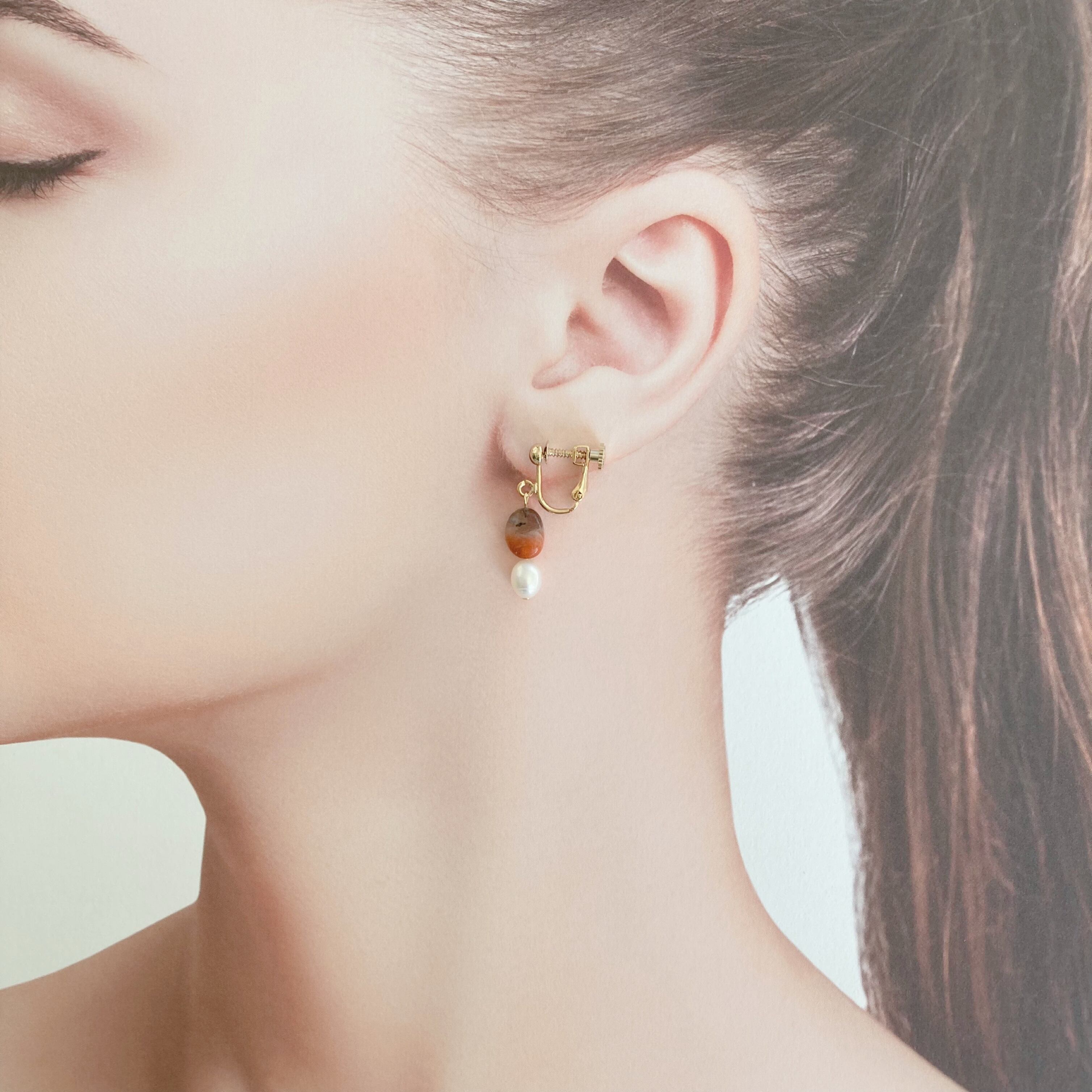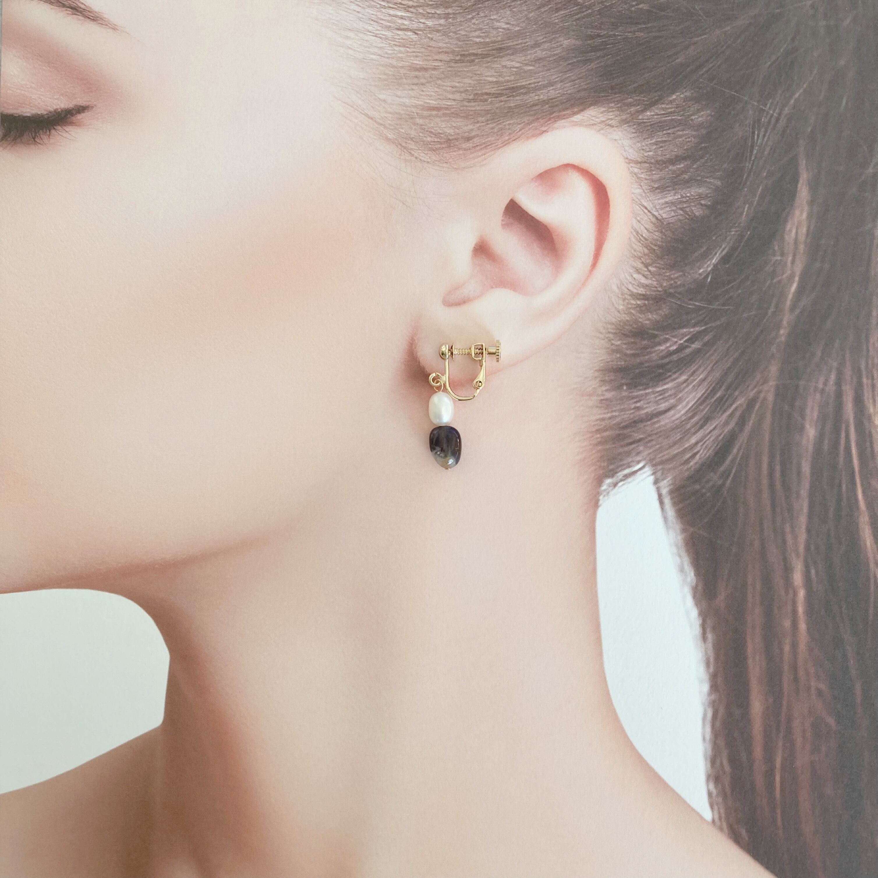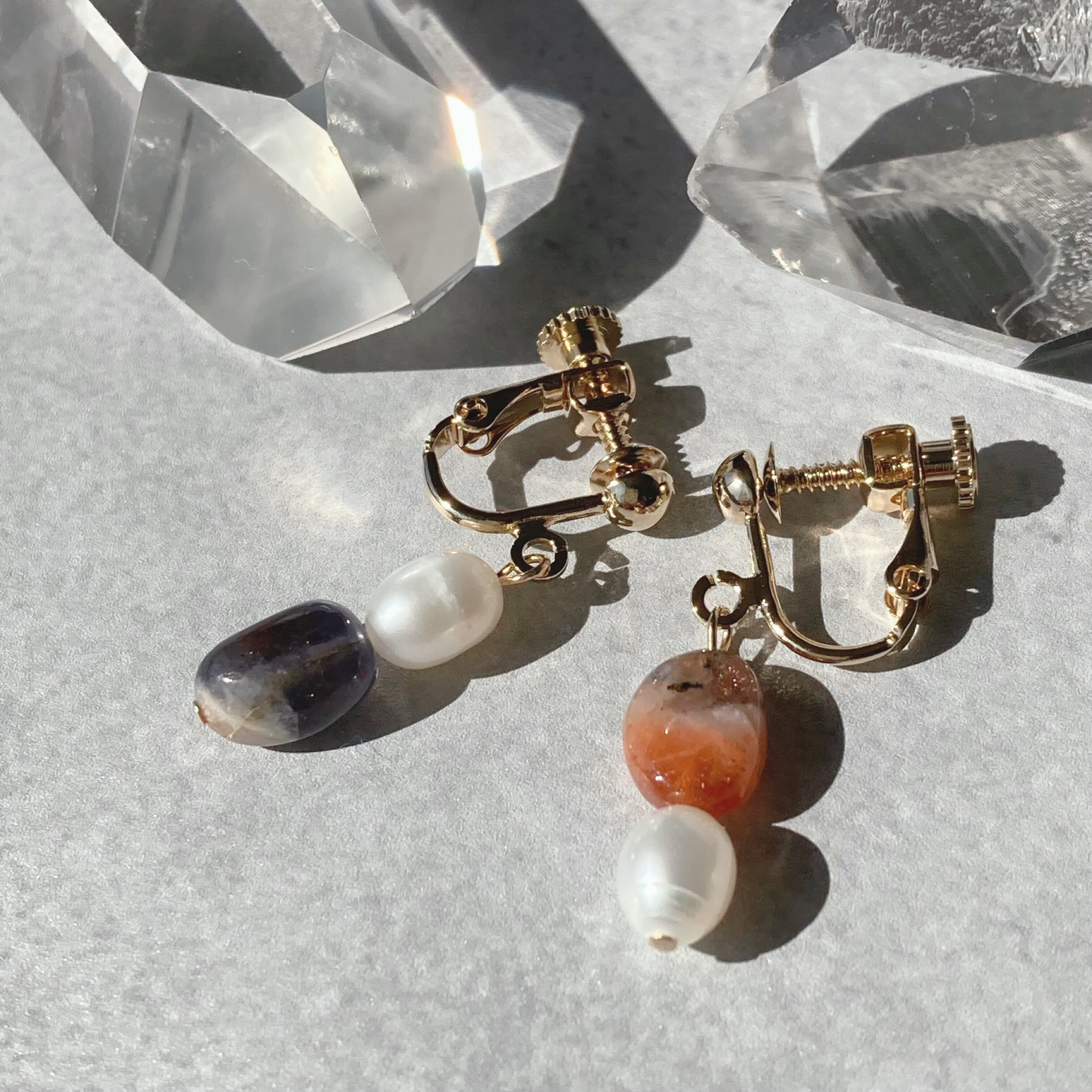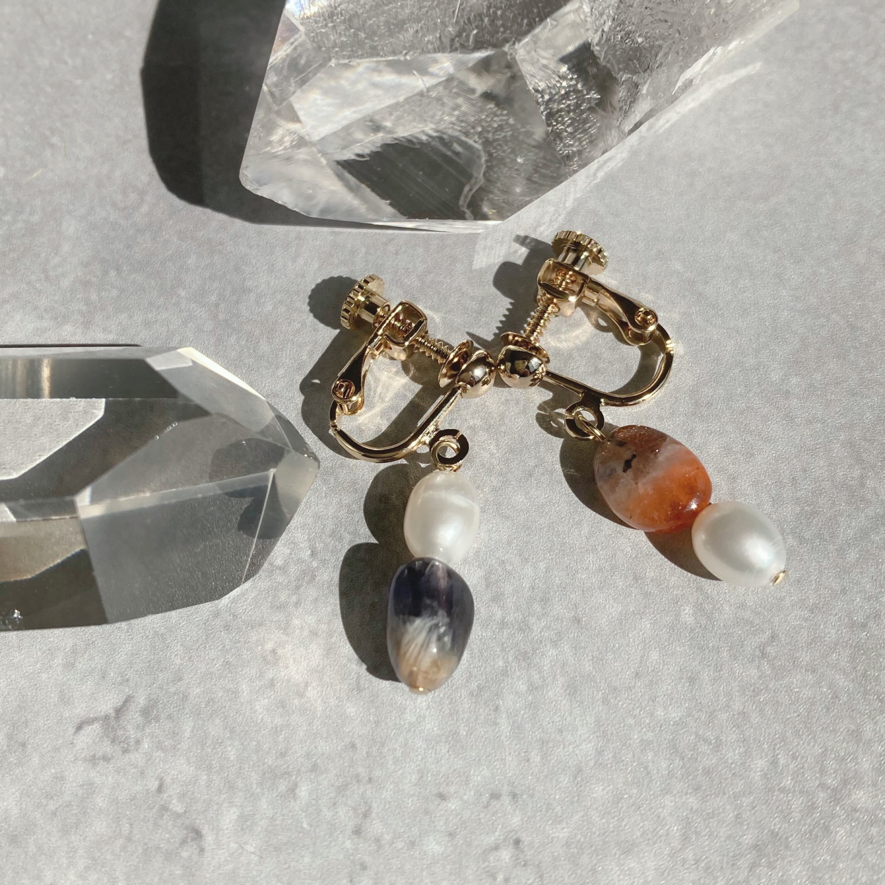 使われている天然石は、アイオライトと淡水パールです。アイオライトはブルーグレーの石のタイプと、サンストーンが混ざっているオレンジのタイプの個性的な石を選び組み合わせました。