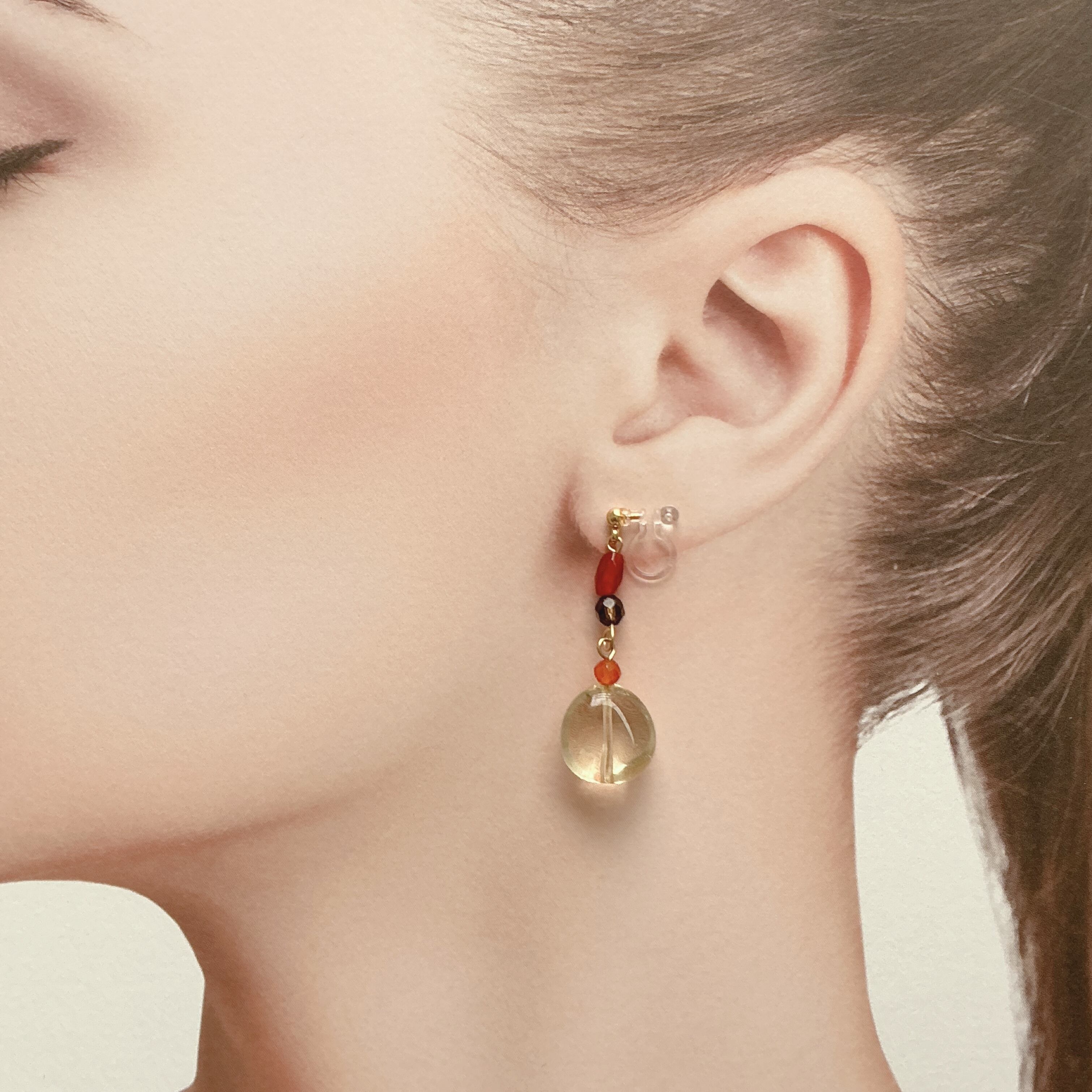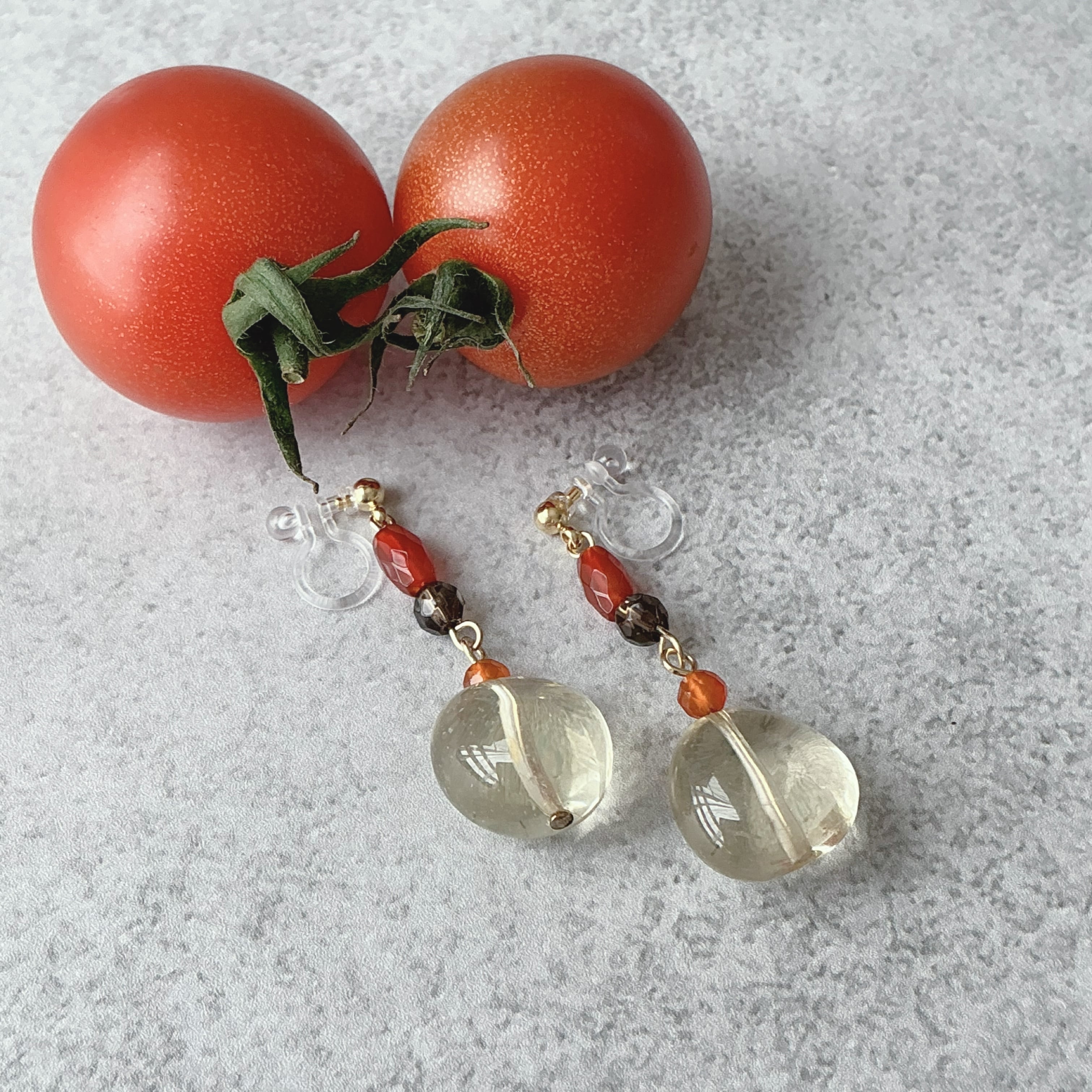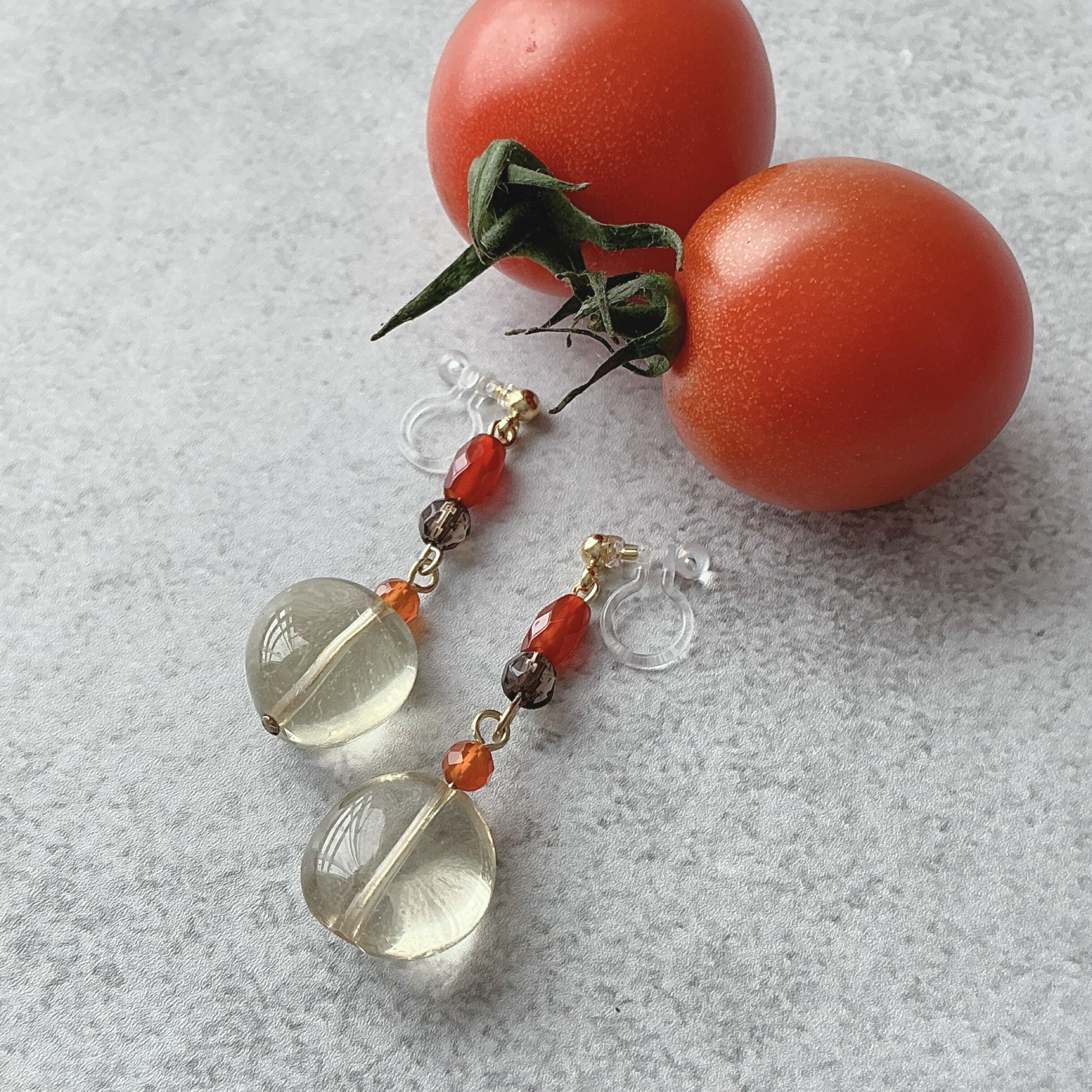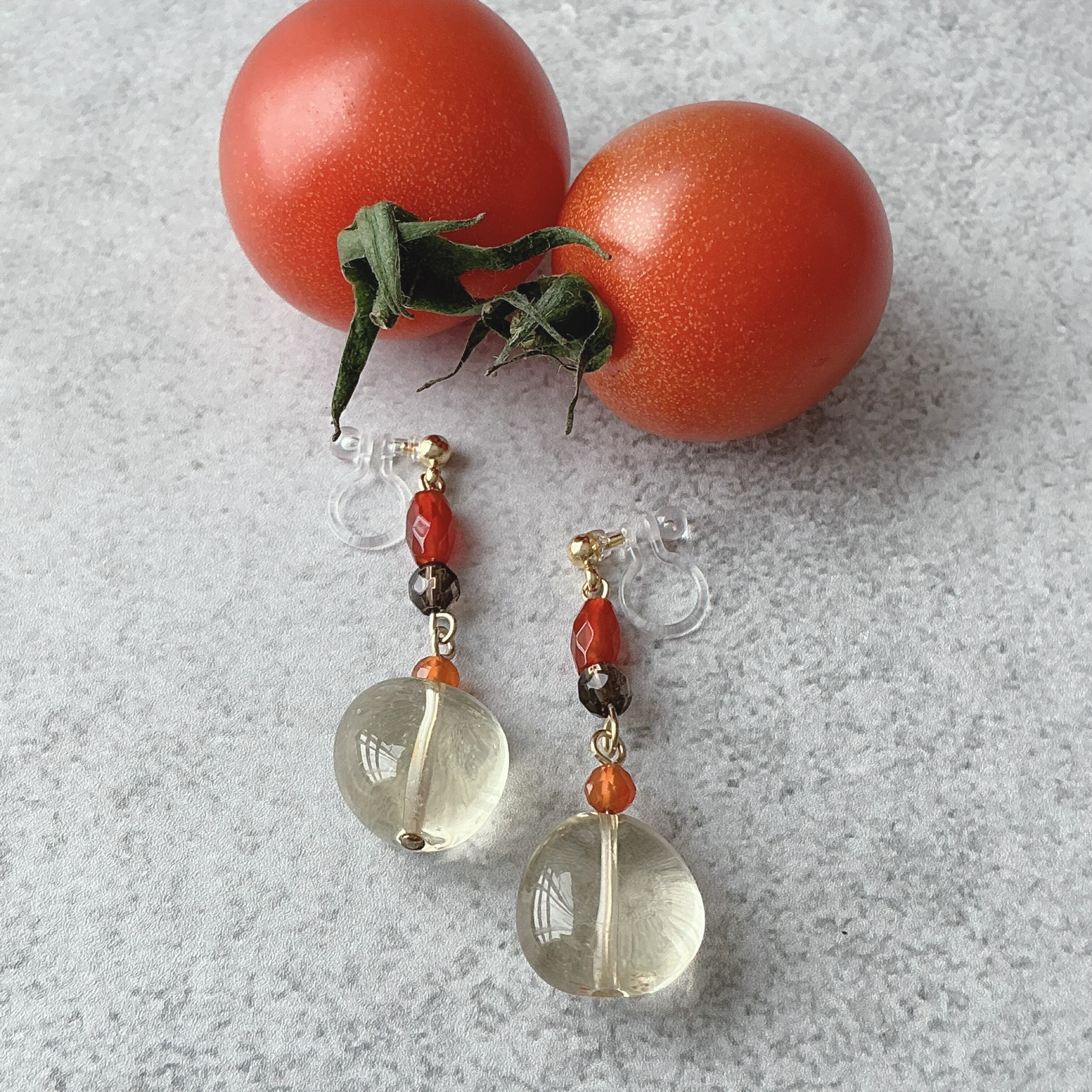 非常に透明度の高いレモンクオーツがメインの艶やかなイヤリングです。レモンクオーツの石言葉は「回復」「浄化」「希望」「明るさ」「復活」などが並びます。また、他の天然石のレッドアゲートやスモーキークオーツ、レッドアゲートの組み合わせから、『心地良い自分に戻る』というテーマが決まりました。