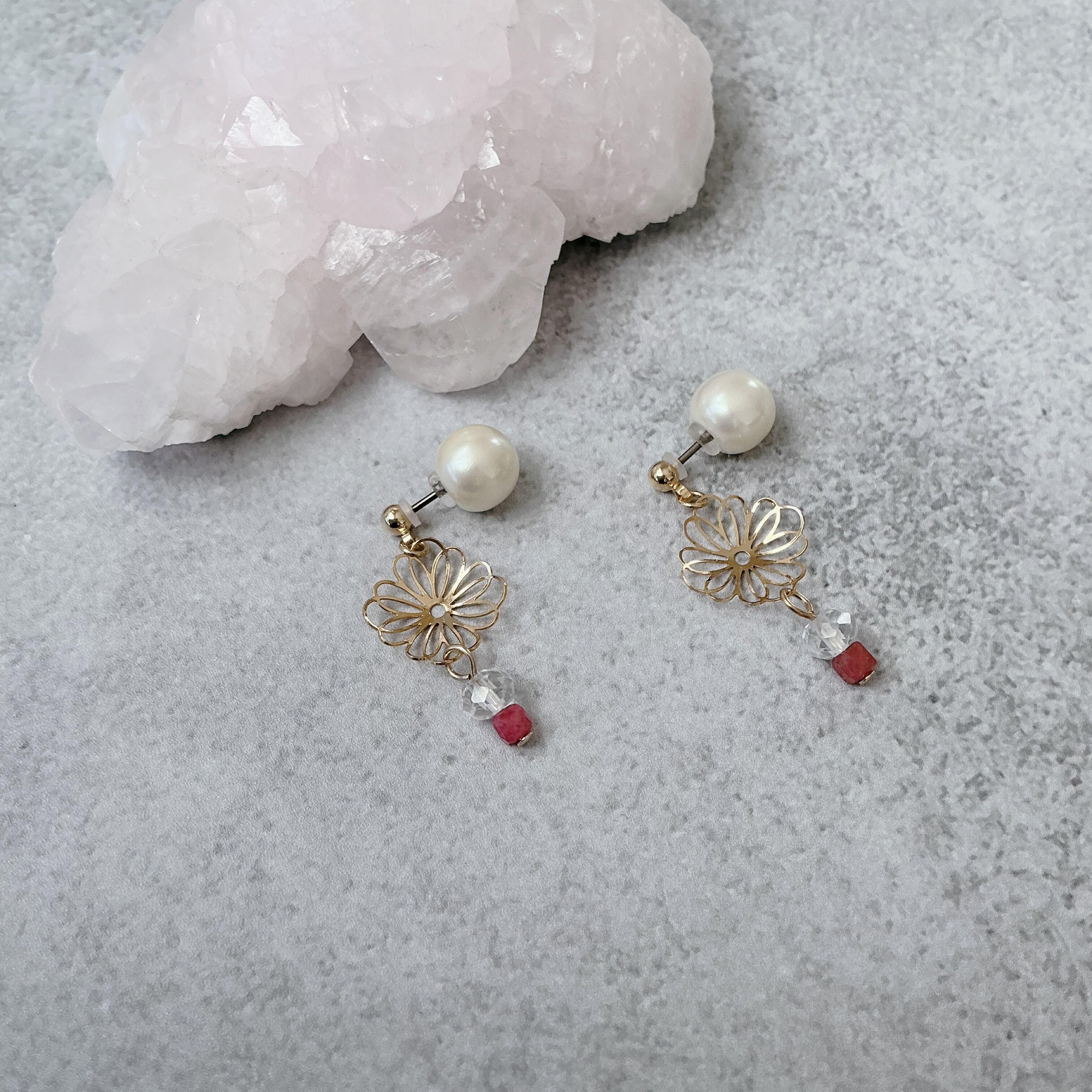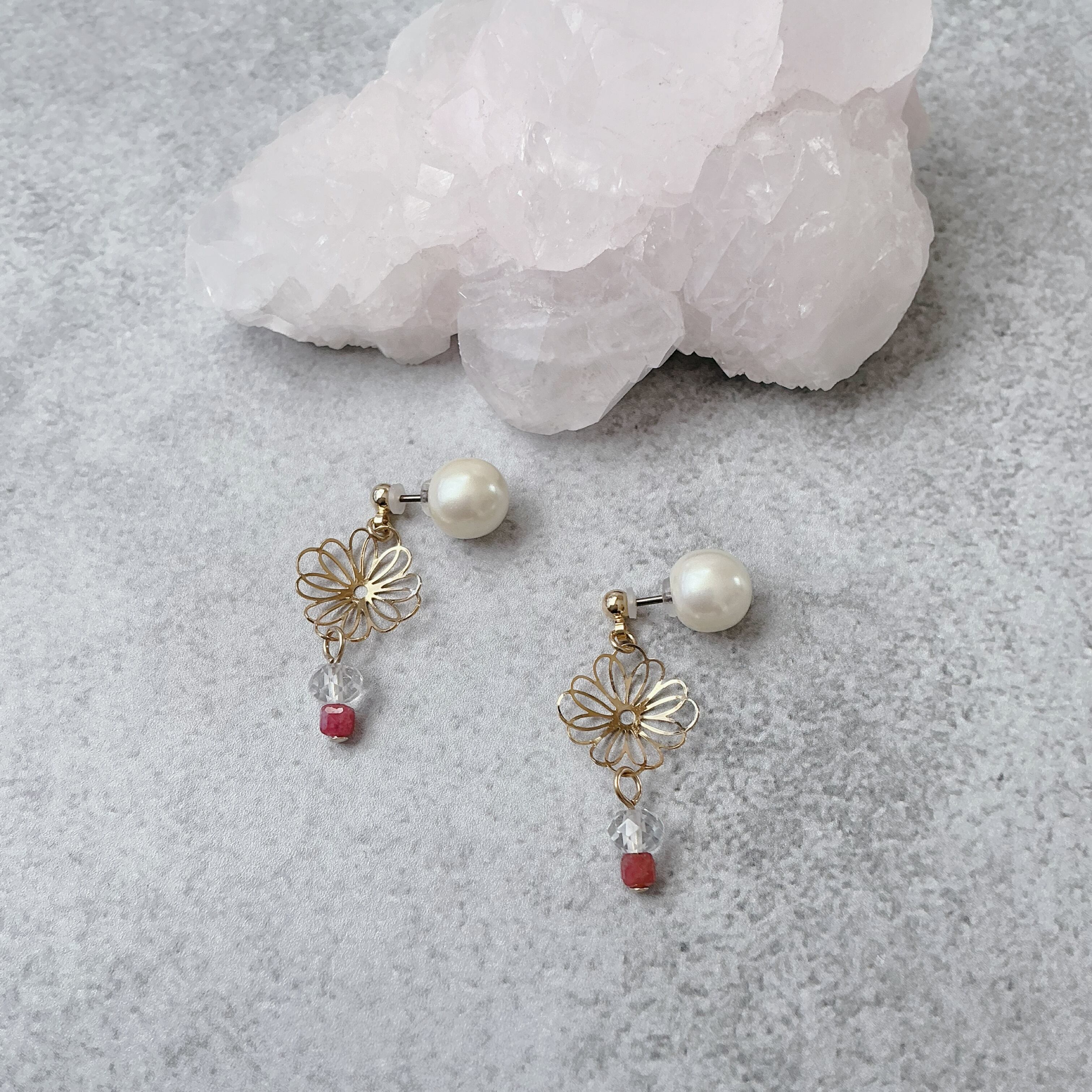 使われている天然石は美しくしっかりと濃いピンク色のインペリアルロードナイト、繊細なカットを施した天然ホワイトトパーズ。その2つの天然石を軽やかな花の透かしモチーフと合わせ絶妙に調和し風に舞う花のタイトルとなりました。