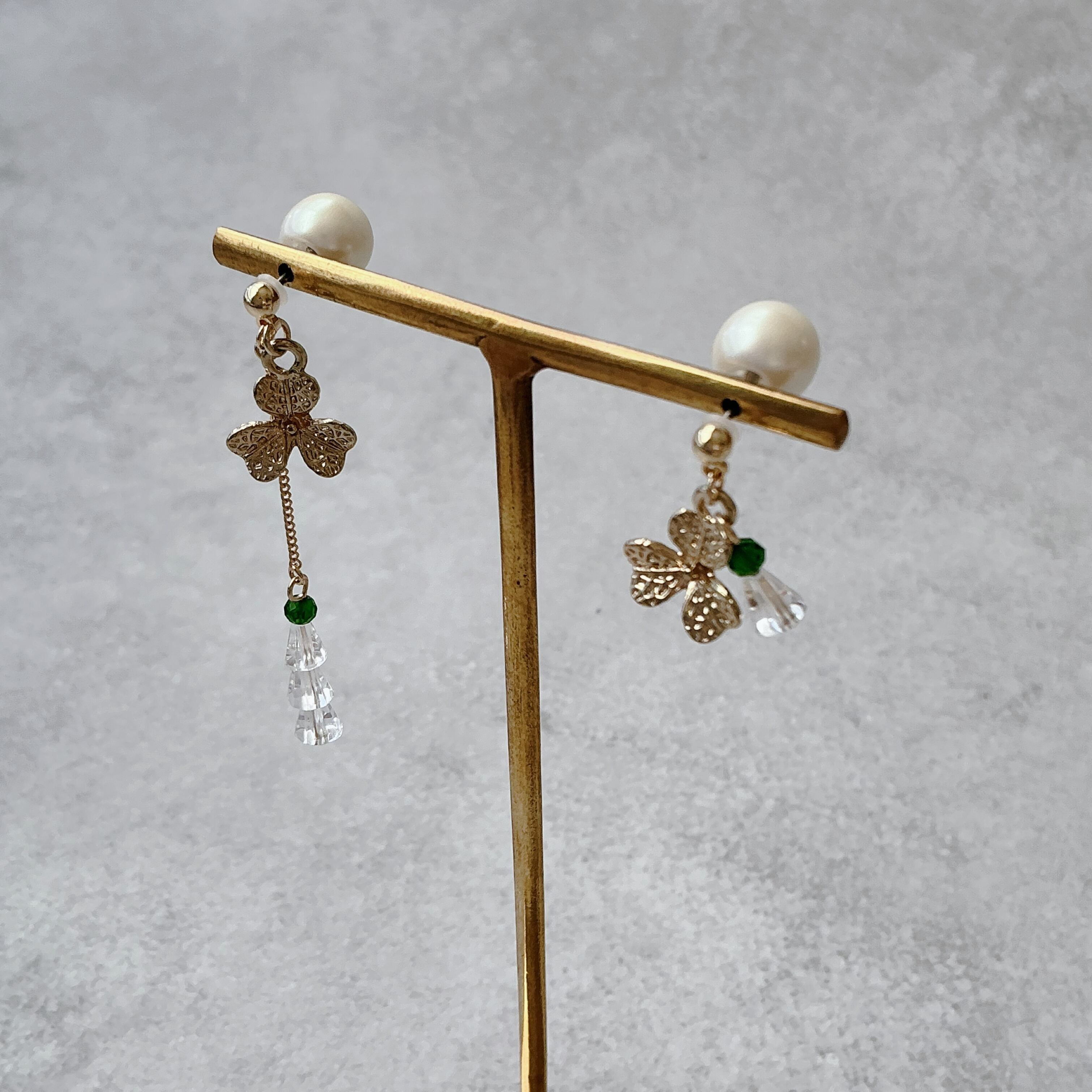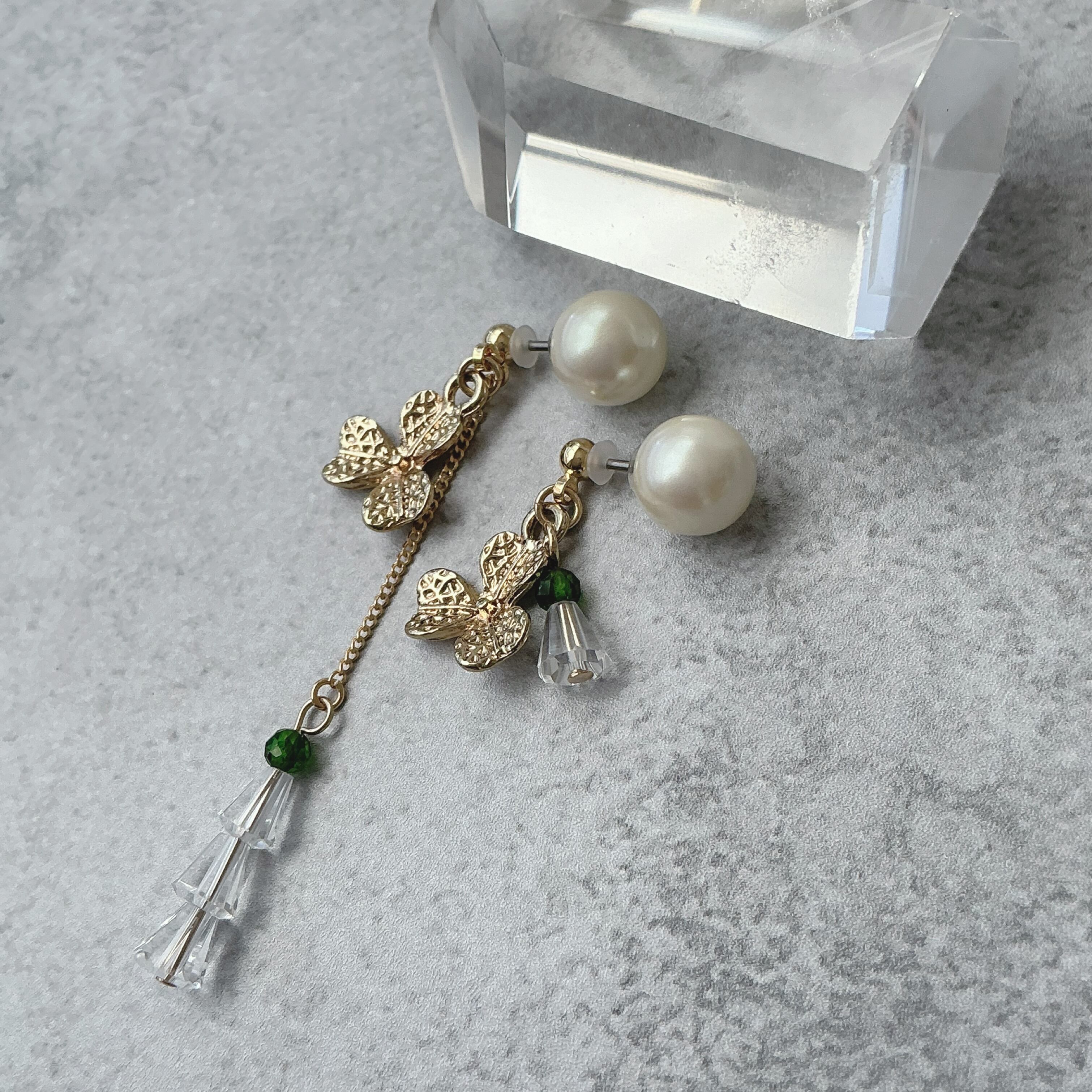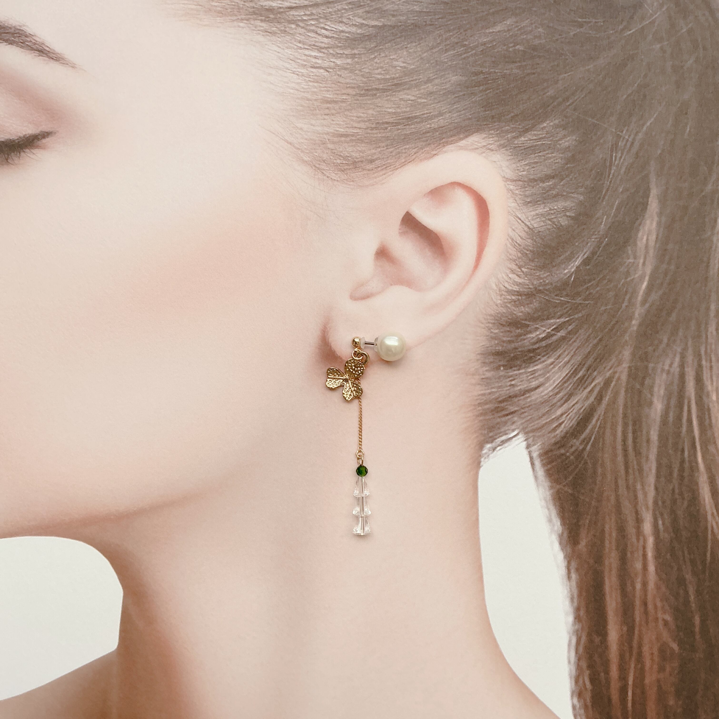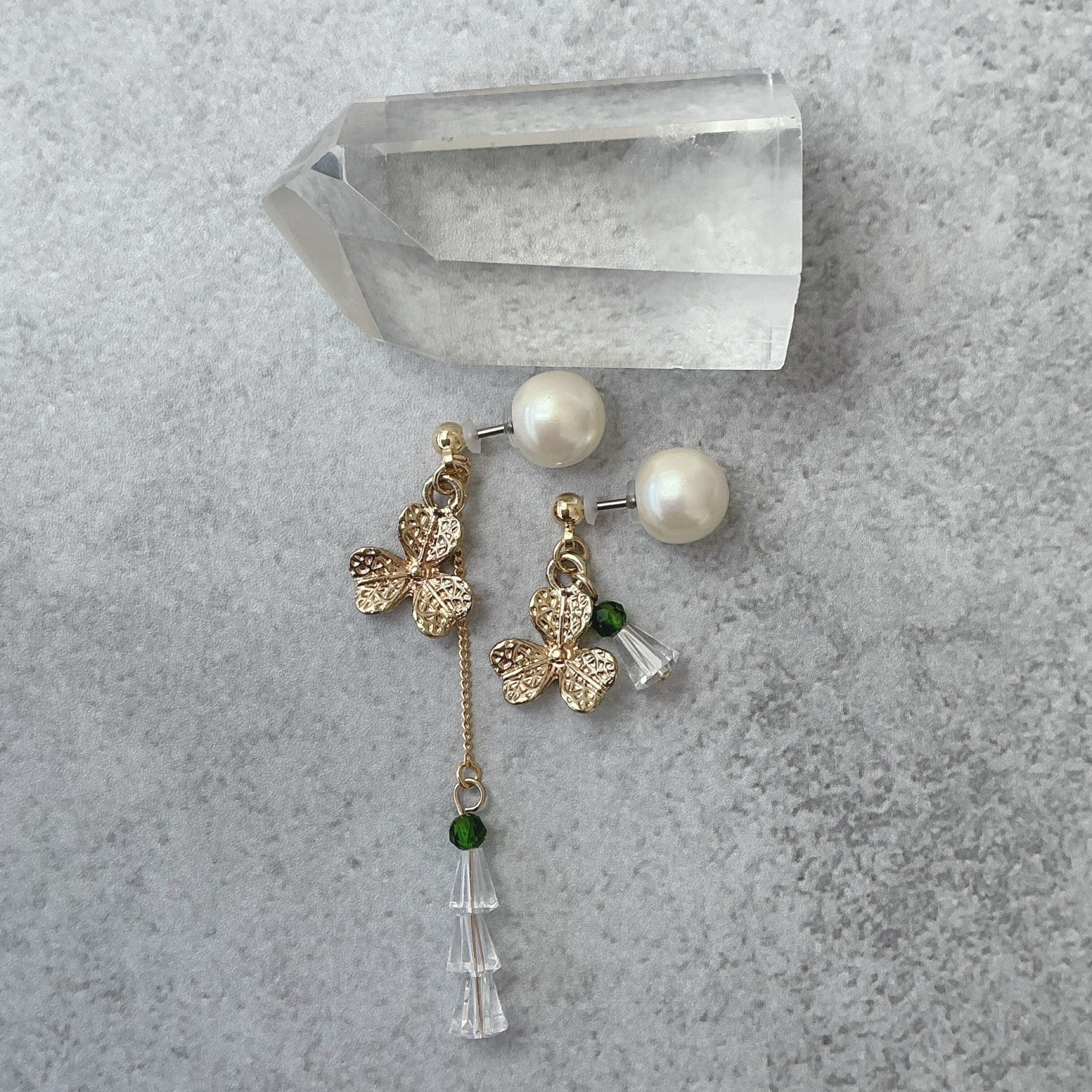 使われている天然石は美しく末広がりにカットされた水晶、そしてロシアのエメラルドとも言われる非常に美しく深い緑色のクロムダイオプサイドを三つ葉と共に組み合わせました。左右でデザインを変えてあり、左右の見え方で表情が変わる作りになっております。