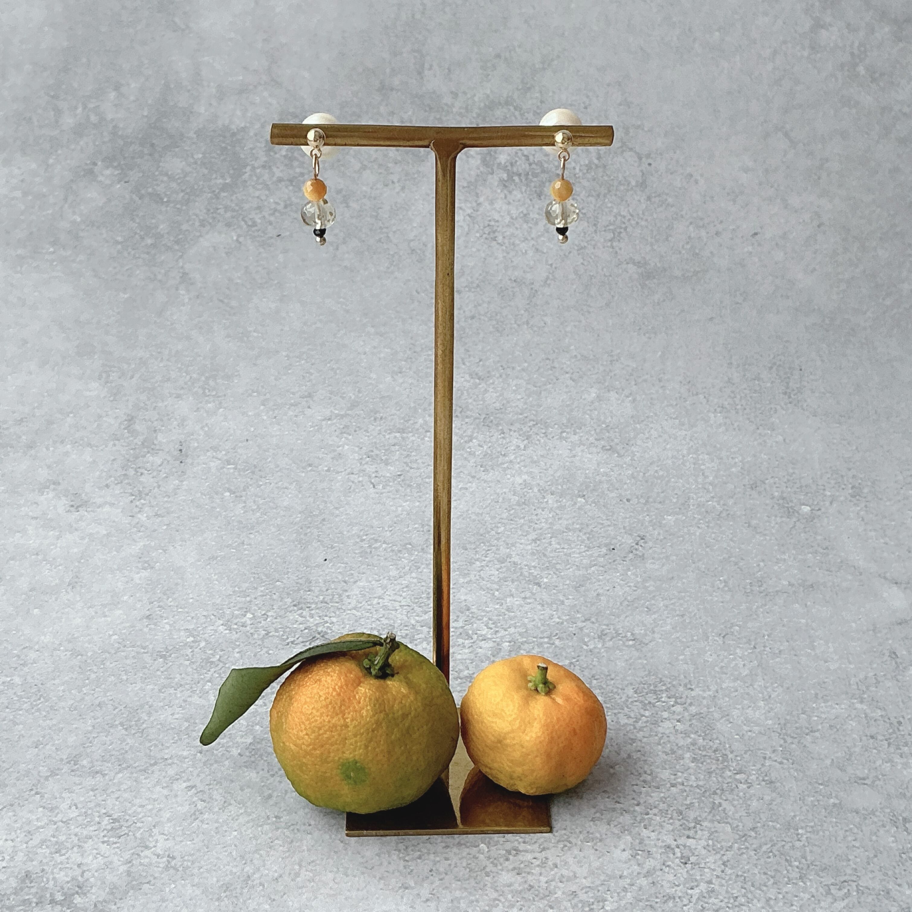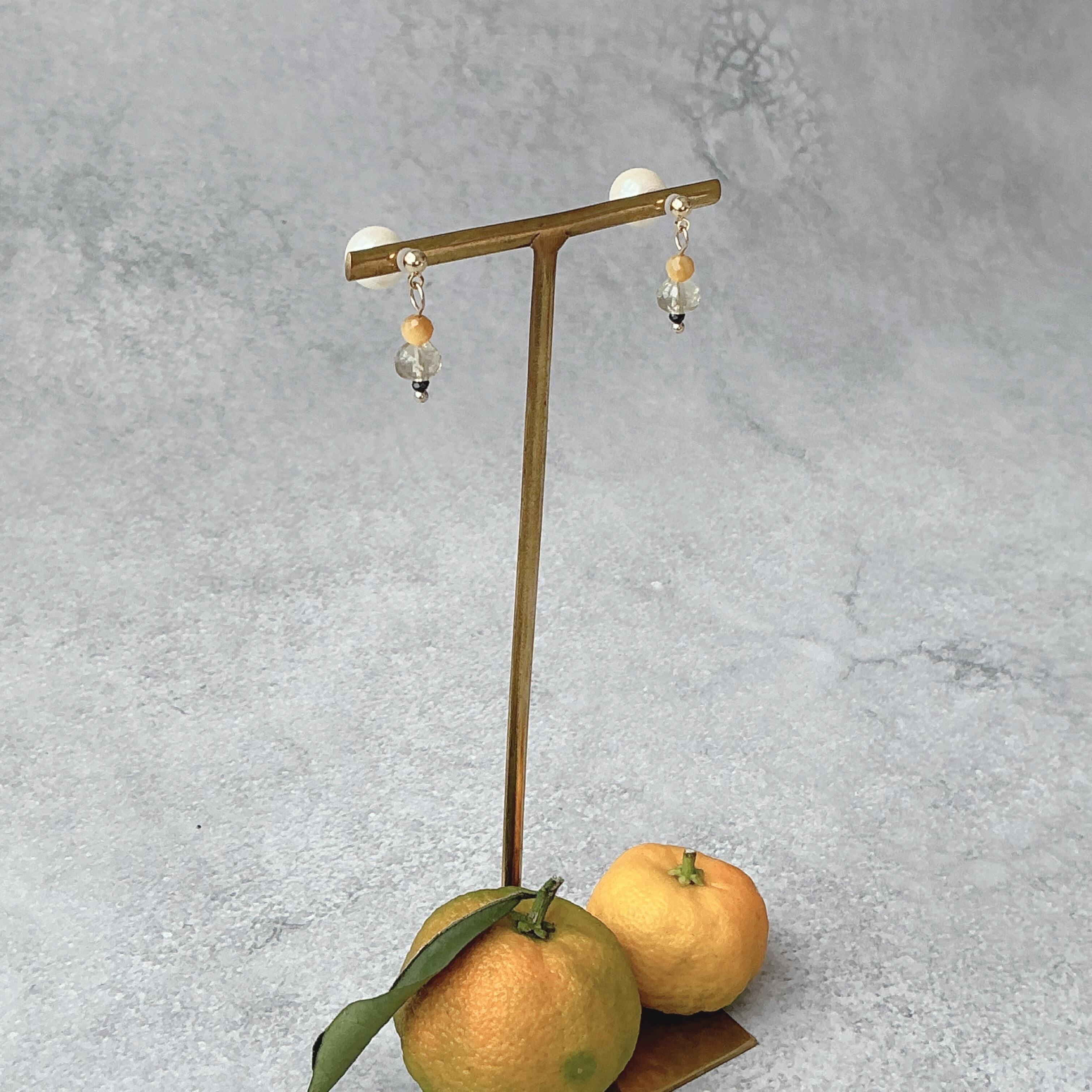 作品名の『YUTORI』は、柑橘系の搾りたてジュースを飲んだ時の爽快感の後に、ふわ〜っと胸に広がる心の深いゆとりをこのレモンクオーツのピアスのデザインに石言葉と共に込め表現してみました。自分自身のためのリラックスした瞬間を準備し、心が軽やかで朗らかな日常をこの天然石たちと楽しんで頂けたら幸いです。