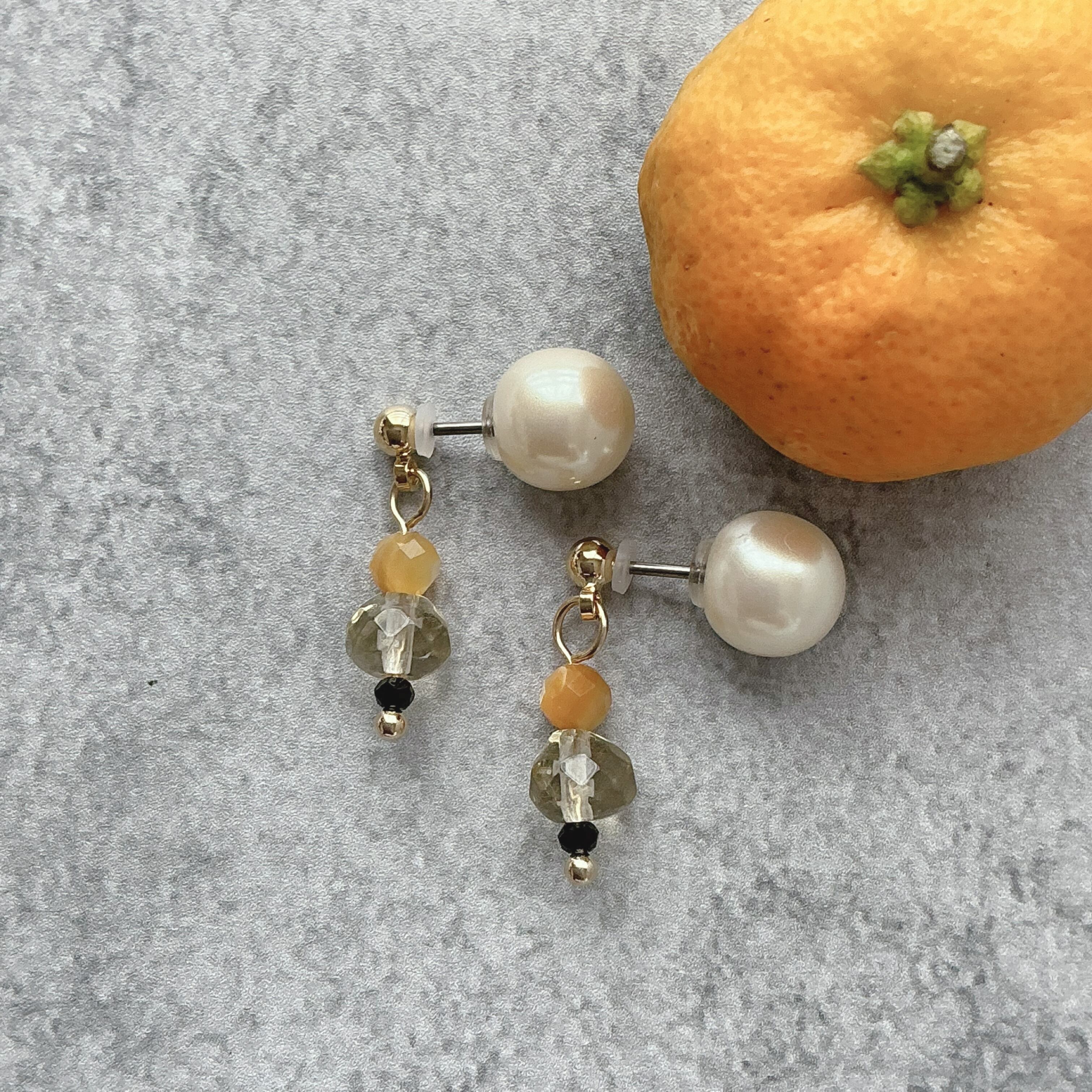 使われている天然石は美しく細やかにカットされたレモンクオーツ、そしてスタイリッシュなブラックスピネル、最後にイエローシェルをアクセントに組み合わせました。イエローシェルは白蝶貝から黄色の部分のみを取り出した貝で黄色い部分と白く照りが入った貝が何とも美しいシェルです。