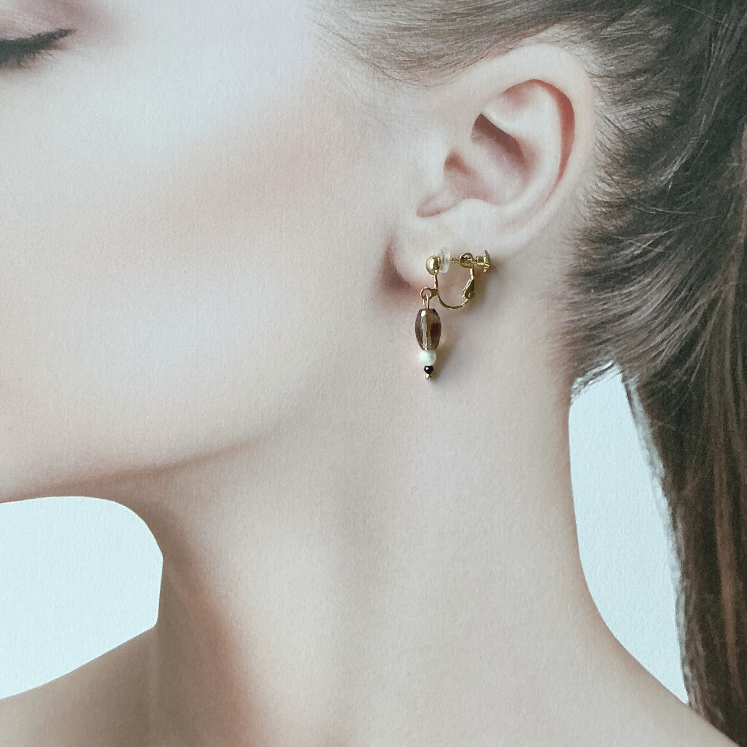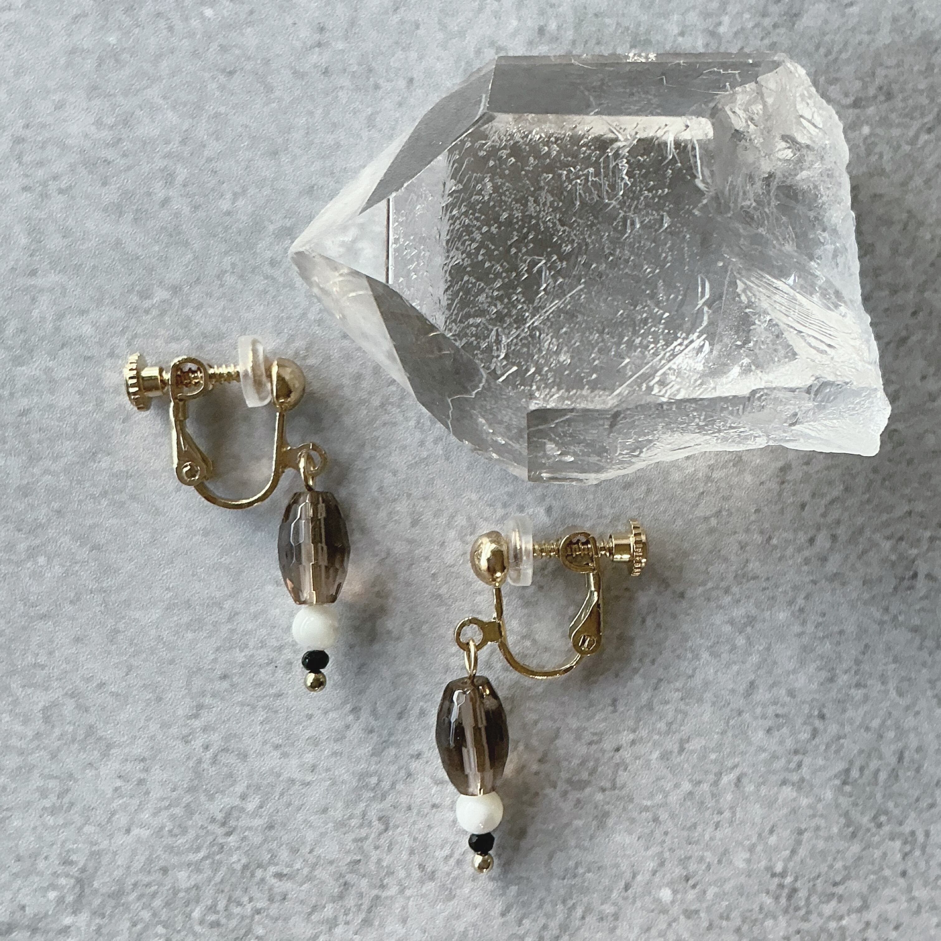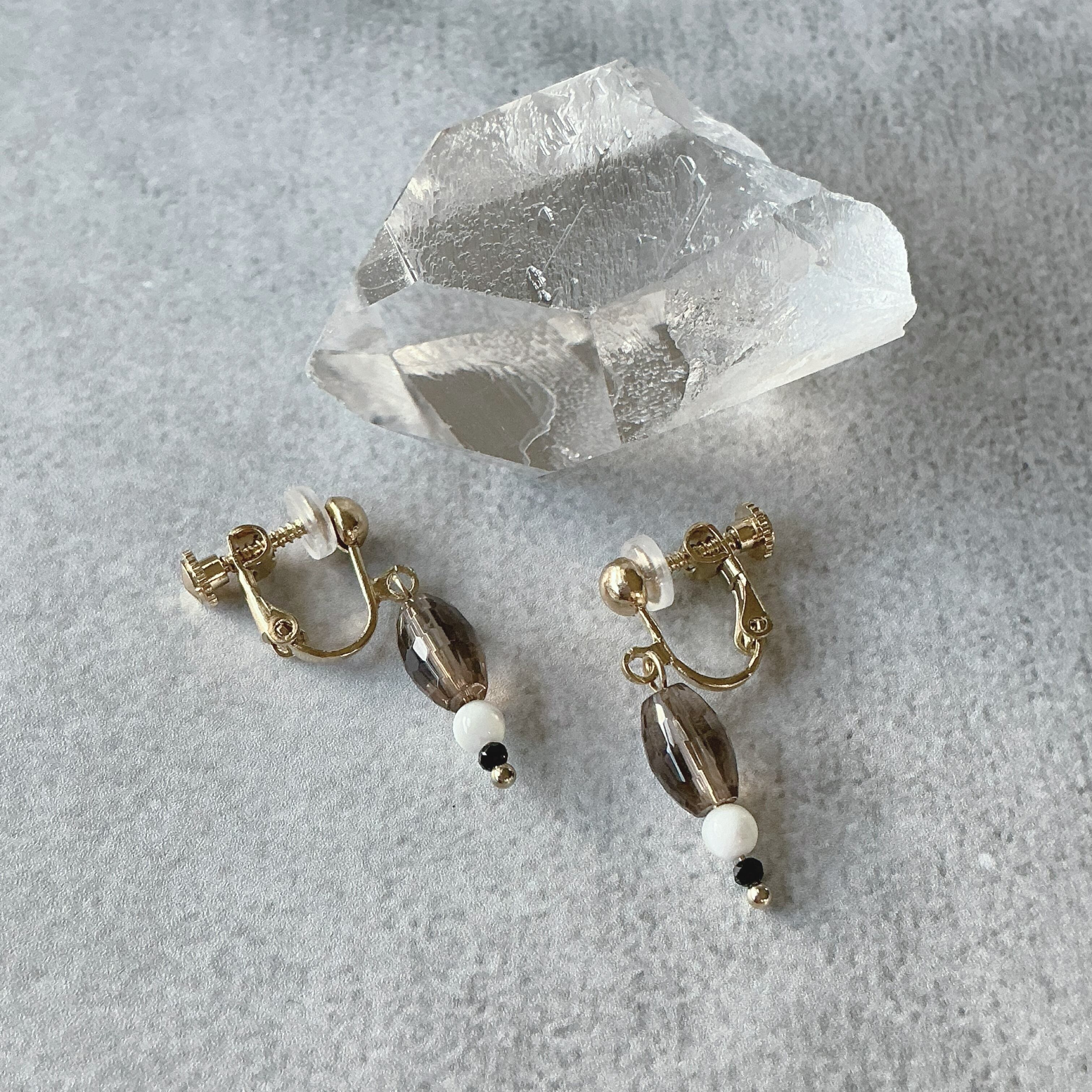 使われている天然石はスモーキークオーツ、マザーオブパール、ブラックスピネルです。大人っぽい印象のスタイリッシュなスモーキークオーツは非常に人気の天然石です。こちらのスモーキークオーツは細やかなカットが施され濃すぎない焦茶カラーに透明感もプラスしなんとも美しい印象で、大ぶり過ぎないので日常でさりげなく使用できるデザインの作品に仕上げました。