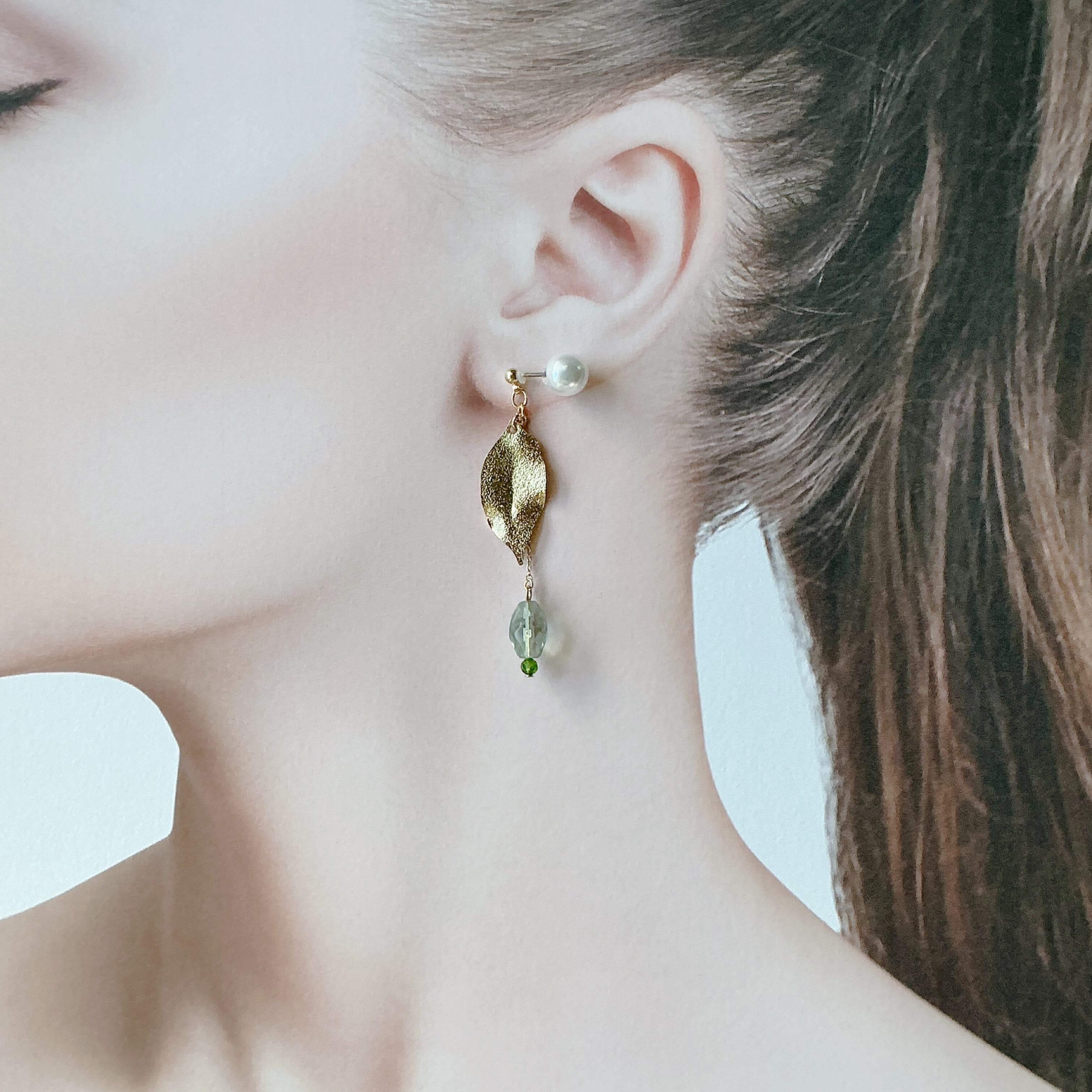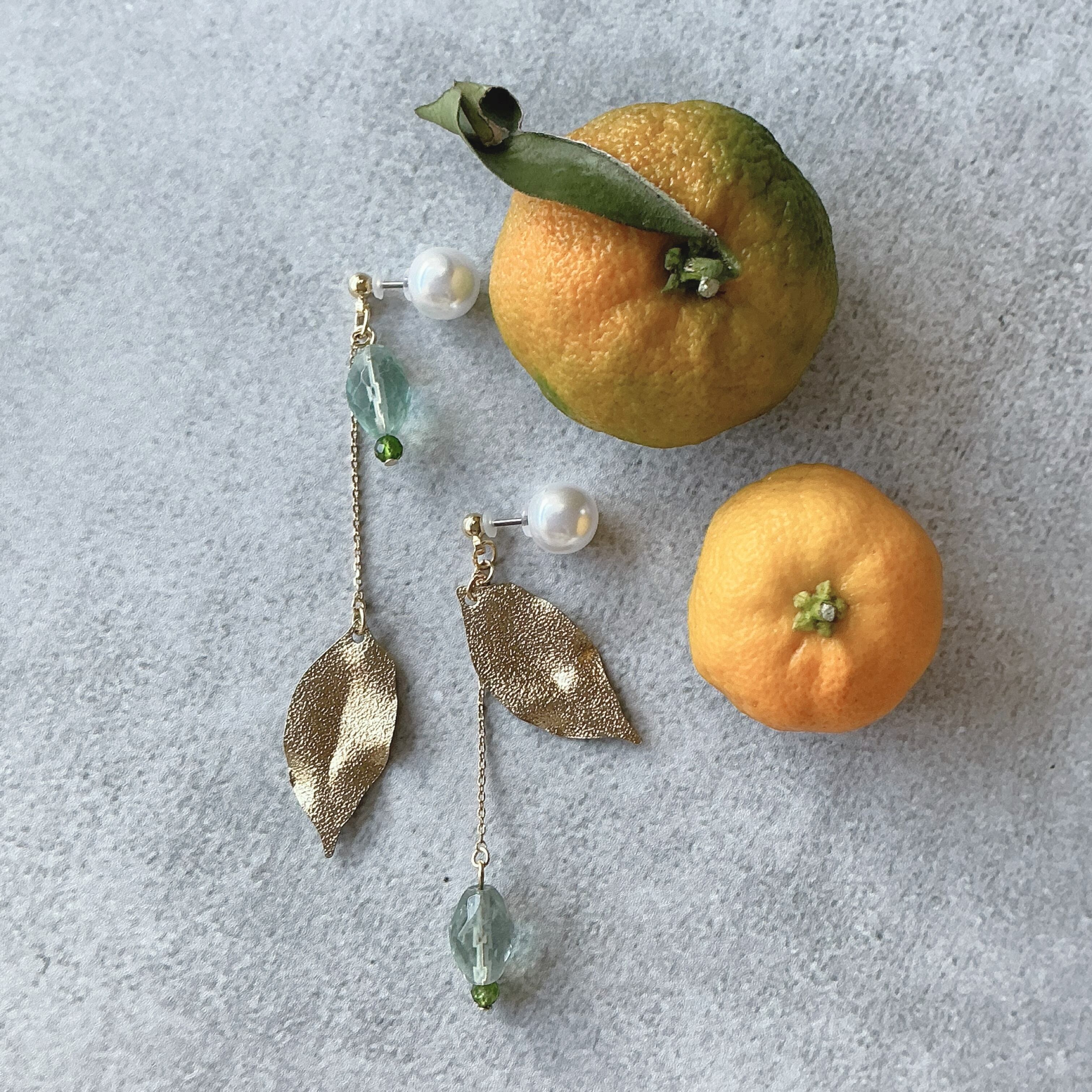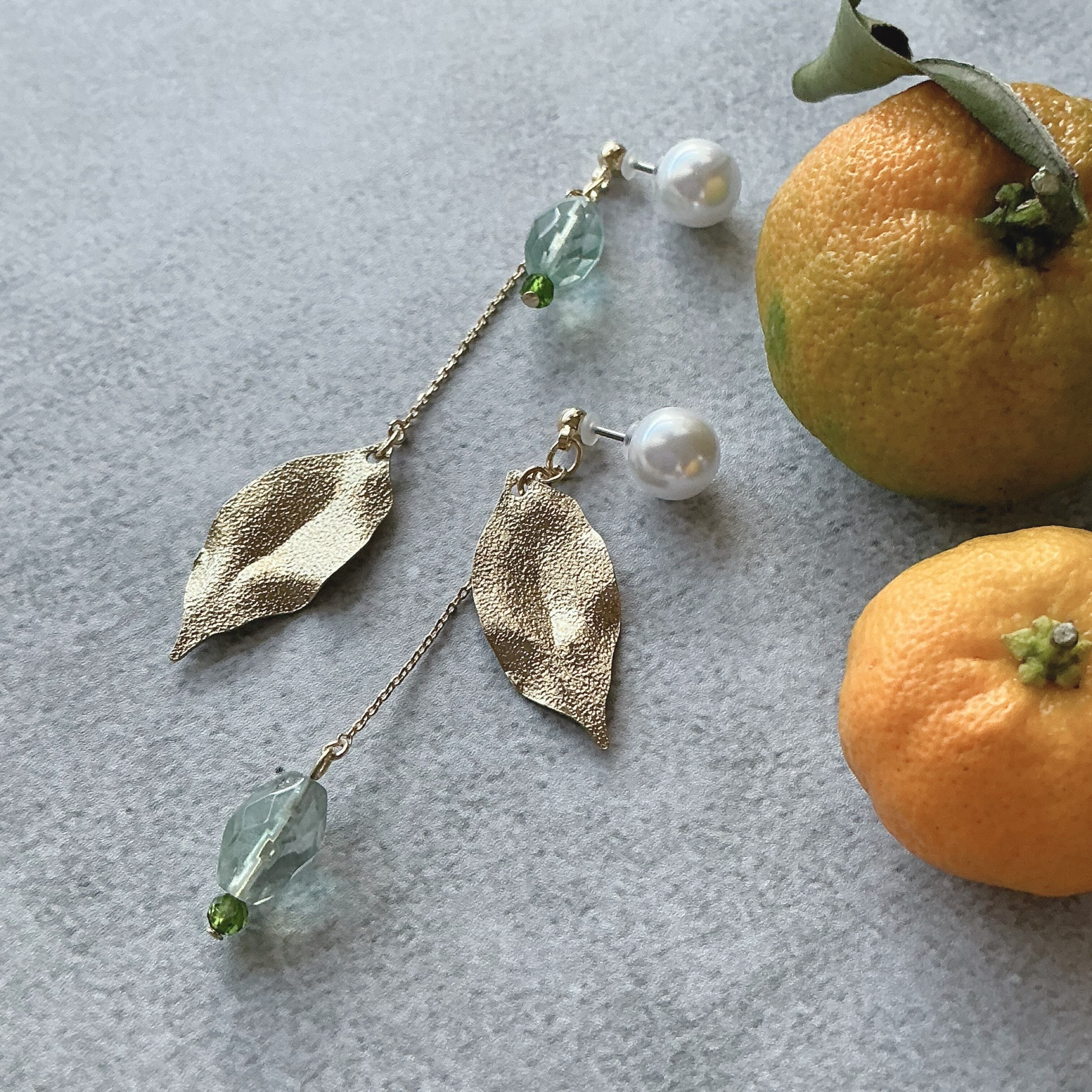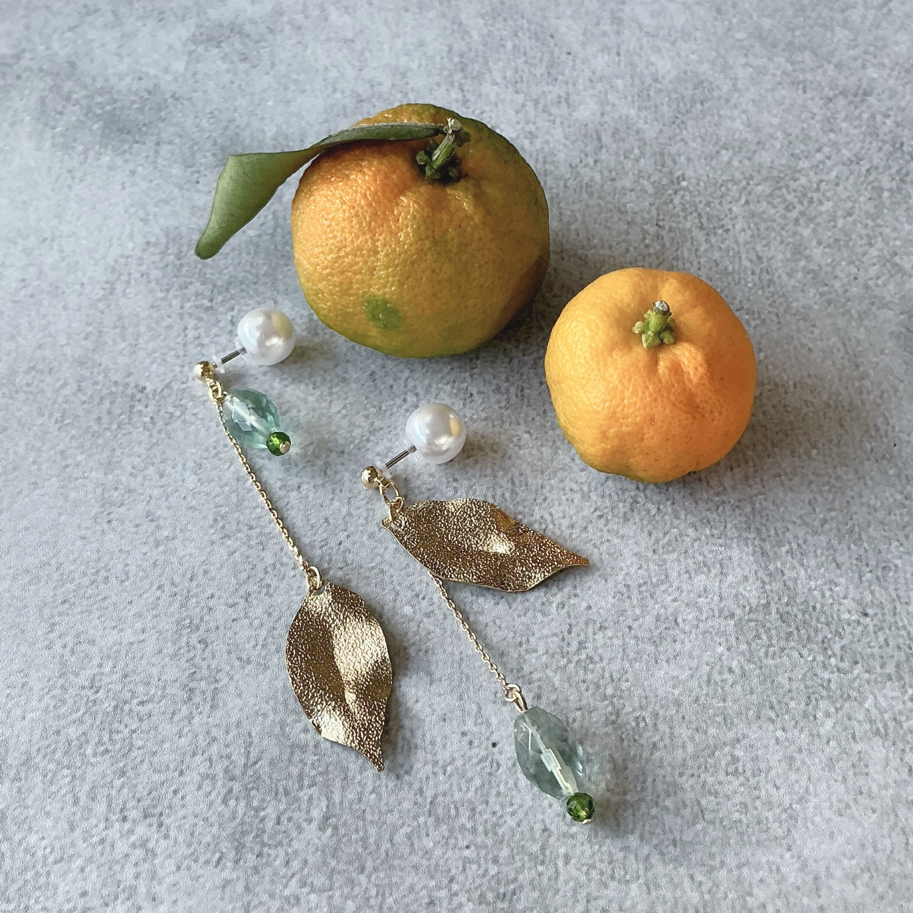 作品名の『蜜柑の葉』ですが、中国では蜜柑は財をなし吉を運ぶ縁起のいい食べ物とされているという素敵なお話を聞き、蜜柑の葉も薬に使われる事もあるなどのお話も耳にしました。そんな、蜜柑の葉に似ているなと思い天然石と合わせ作品に仕上げました。左右で少し違ったデザインに仕上げてありますので、左右のちょっと違った表情も楽しんでいただけたら嬉しいです。