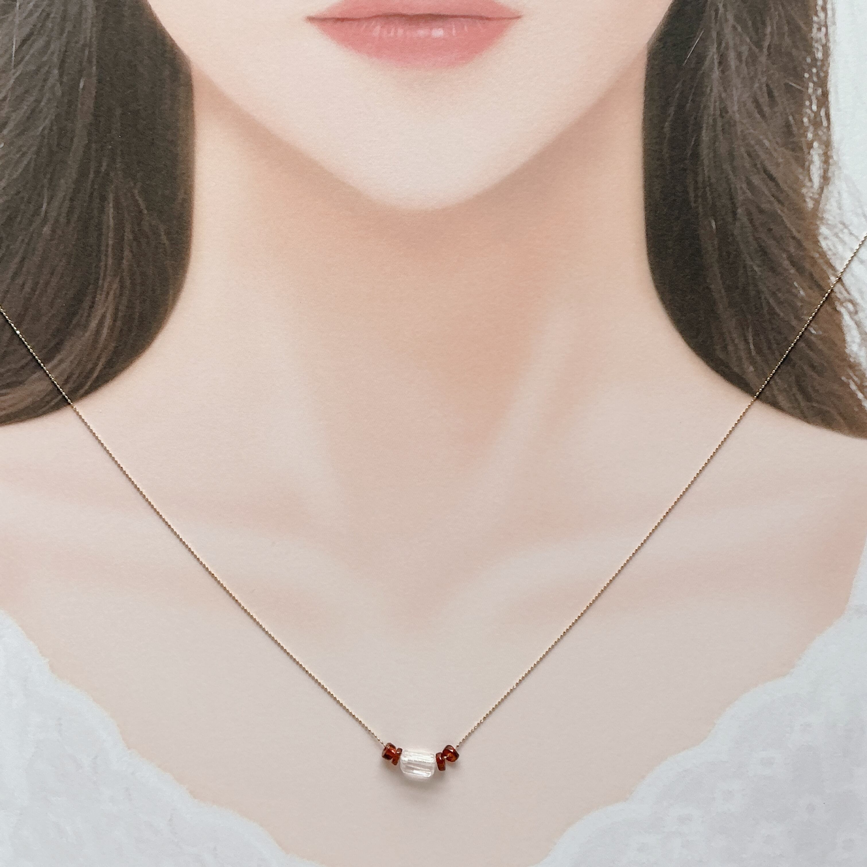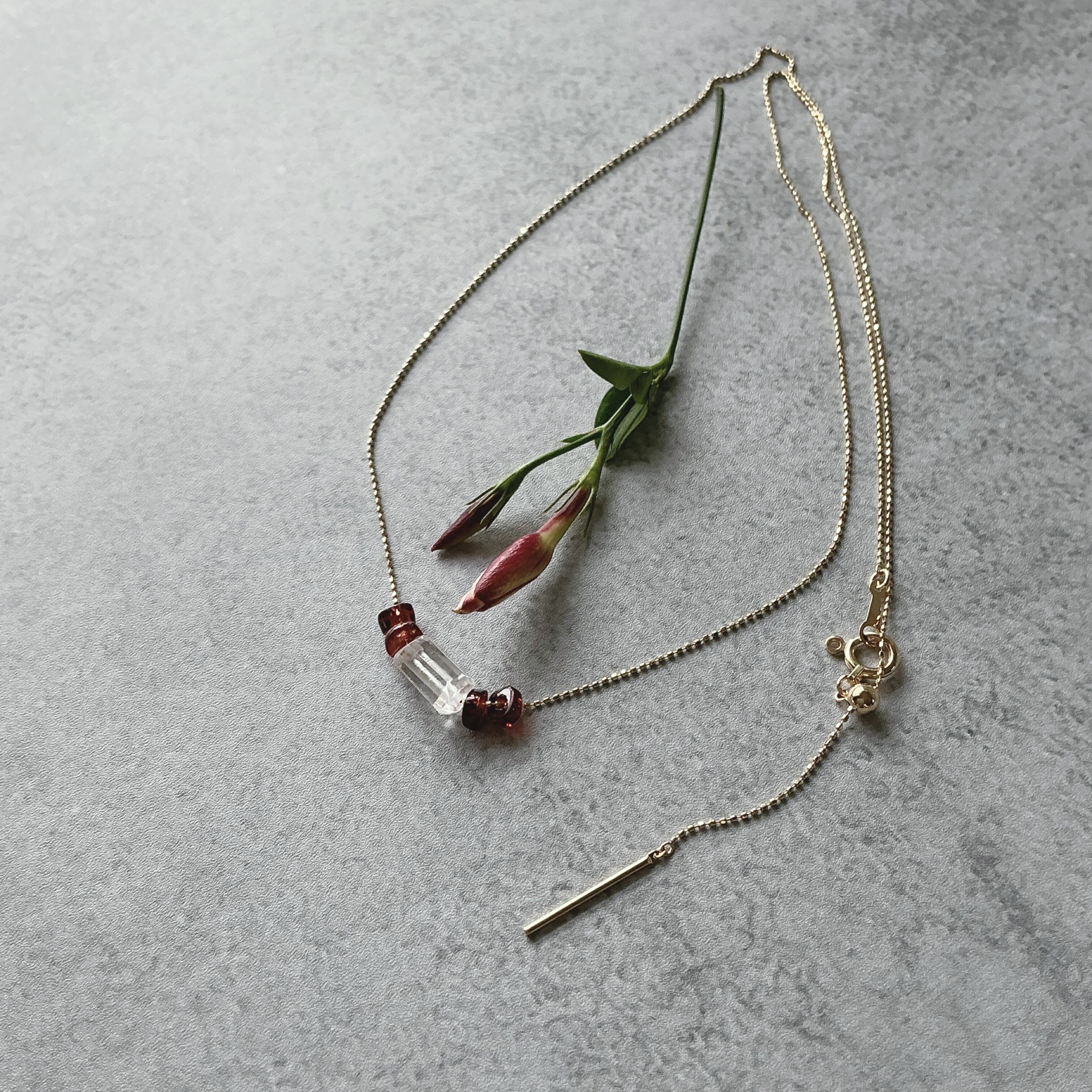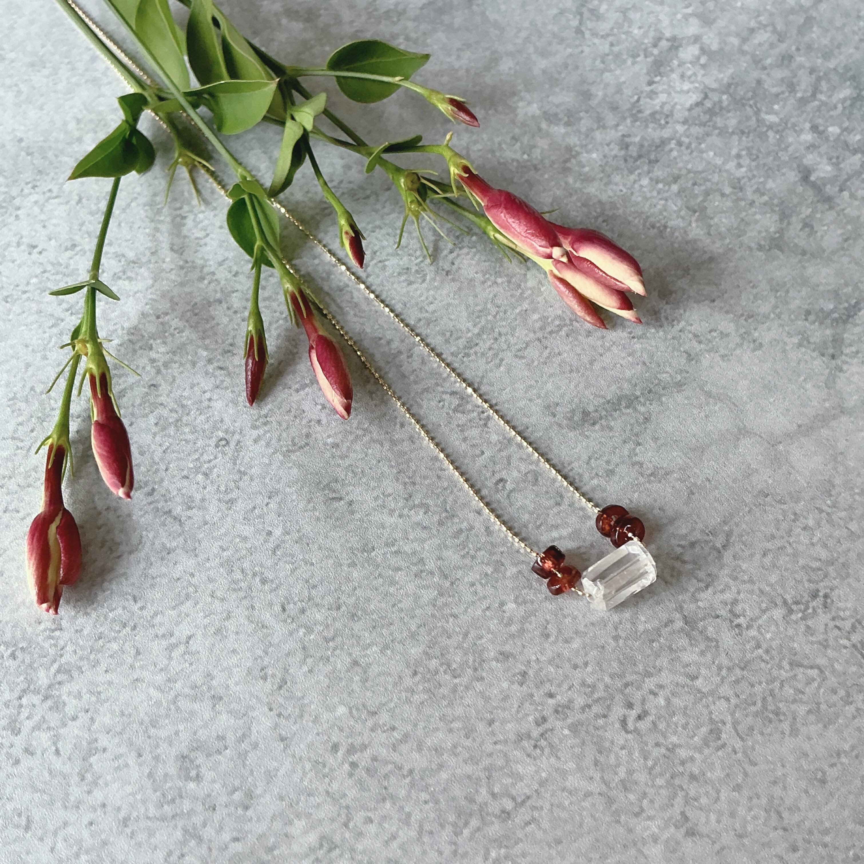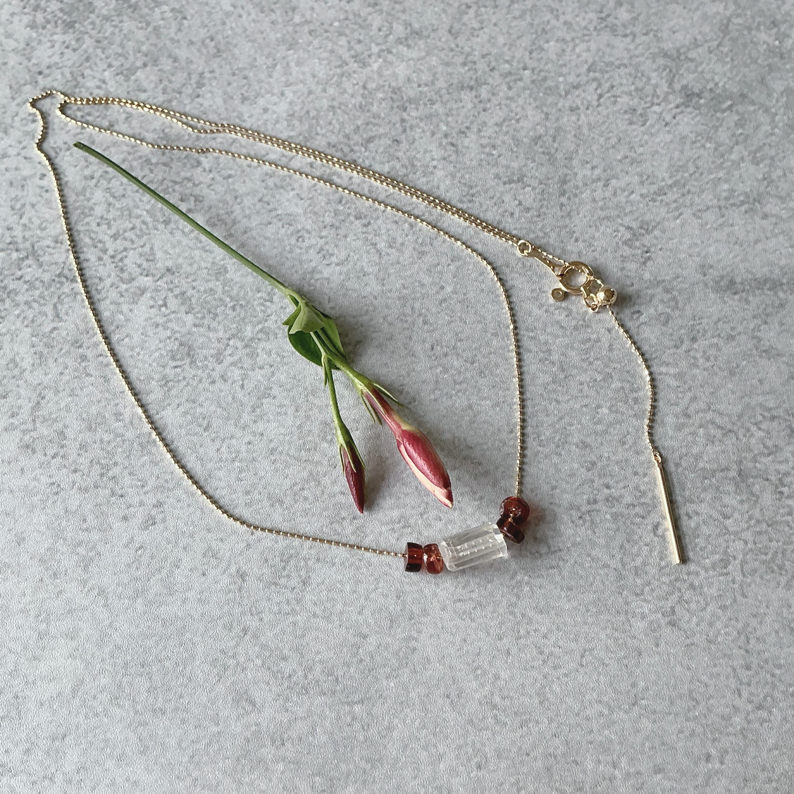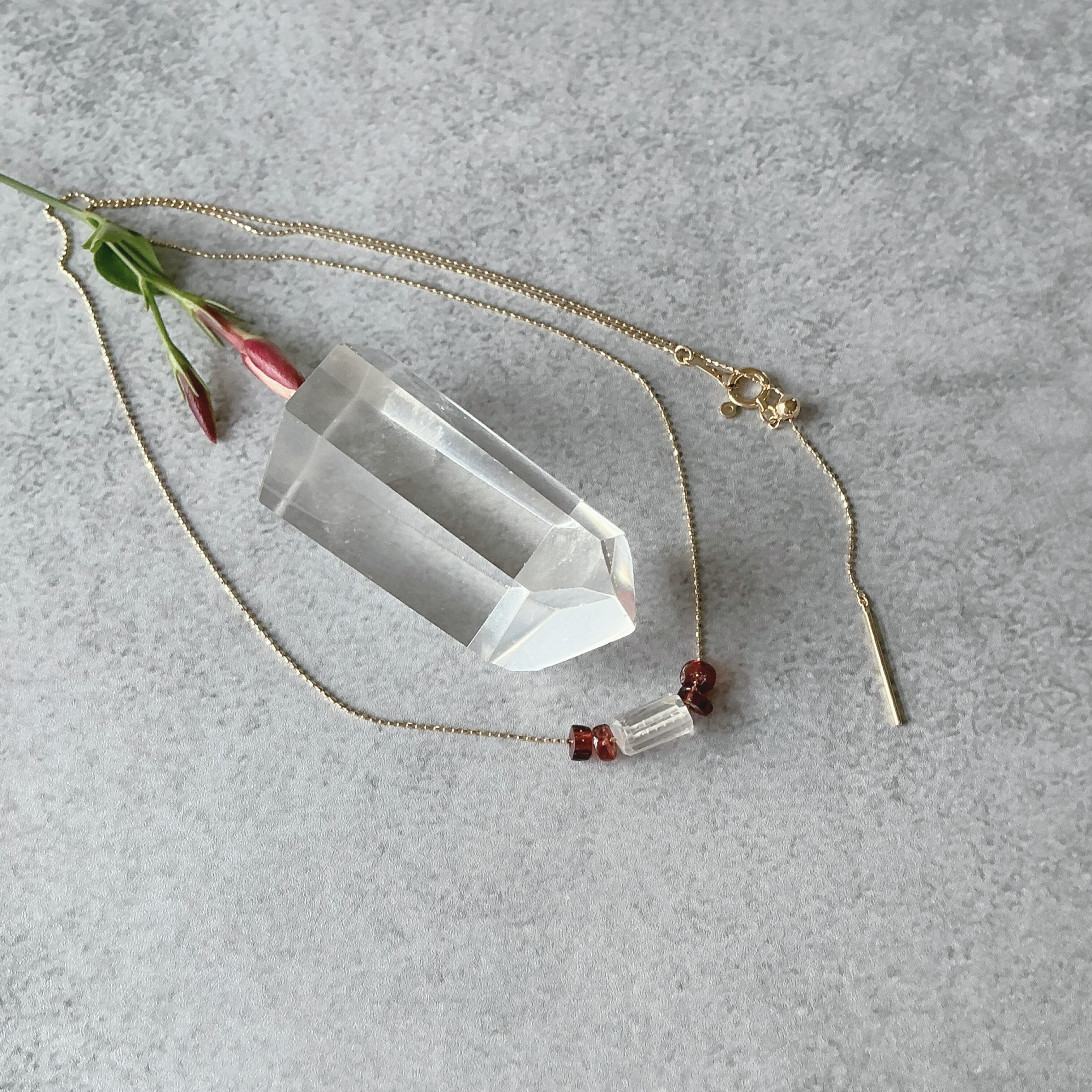 使われている天然石はクンツァイトとガーネット。細く華奢な18Kのネックレスチェーンにクンツァイトの小さな柱状のカケラが儚げな淡いピンク色でナチュラルに輝きます。そんな優しく輝くクンツァイトですが、ヒーラーさんの中では高波動の石と言われ非常に人気の石となります。そんな高波動と言われるクンツァイトと女性の御守りとして大切に扱われてきたガーネットを自分の中心である胸に光輝くようネックレスに仕上げました。
