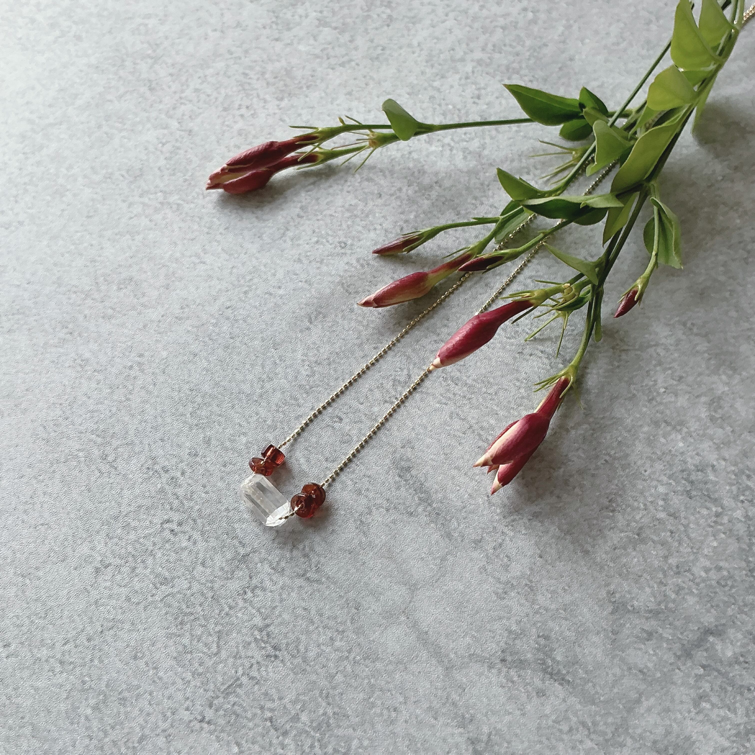 総合的な石言葉ですが、「繁栄」「慈愛」「優しい」「純粋」「愛」「バランス」「実り」など様々な石言葉がならびます。"ゆとり" というワードはなんだか心をホッとさせるような存在。時間のゆとり、経済的なゆとり、心のゆとり、いろいろなゆとりがありますが、どれもこれもなんとも言えない嬉しさや安心感があります。ゆとりがあったら良いな〜そう思う時、比較的、身体や頭の中など力が入ってしまっている状態が続いている事が多いとか。優しくも強いクンツァイトと女性の守り神のガーネットを胸に天然石との日常を楽しむ中で、心や身体を緩め"ゆとり"を意図的に作っていくきっかけにHanaemiのアクセサリーを楽しんでいただけたら幸いです。