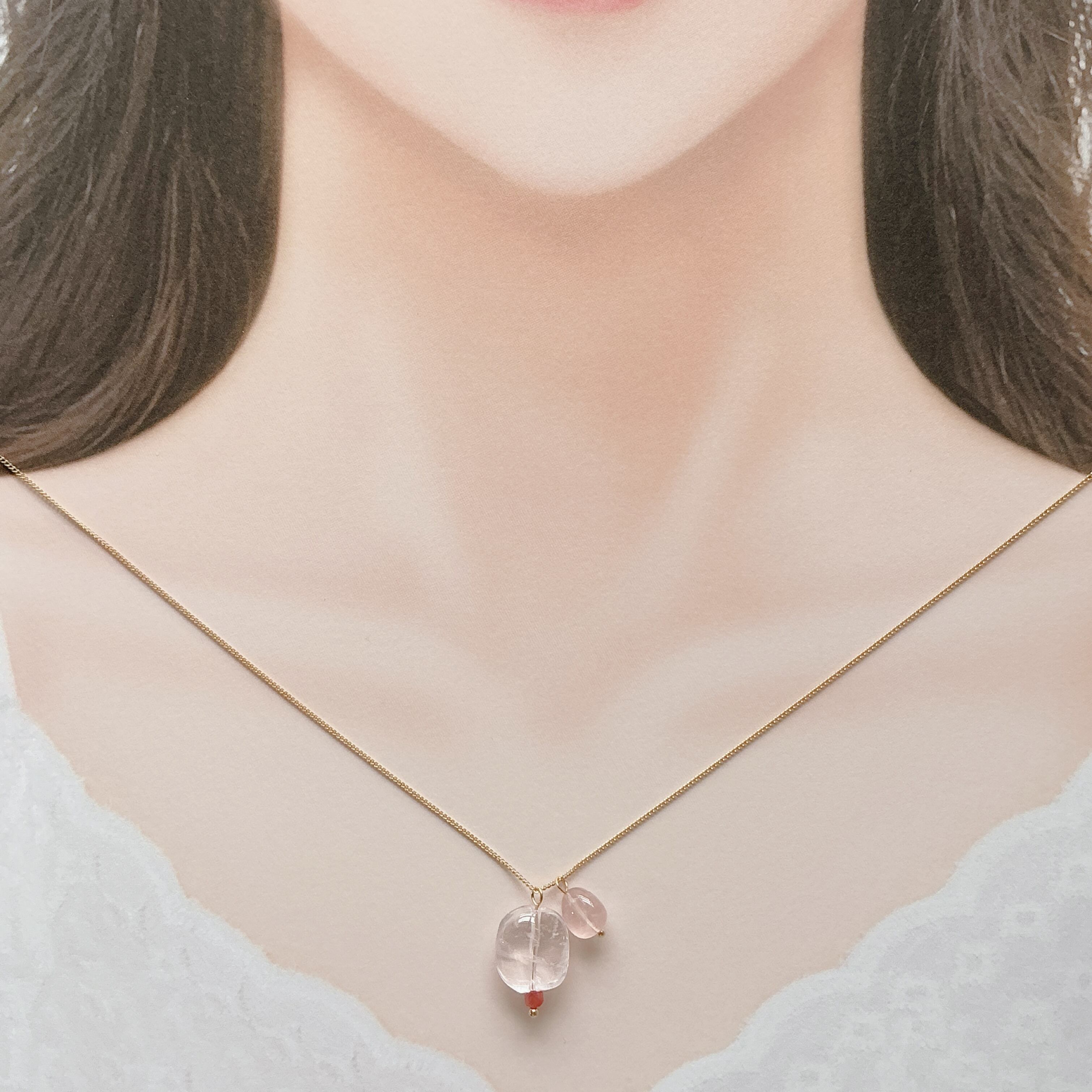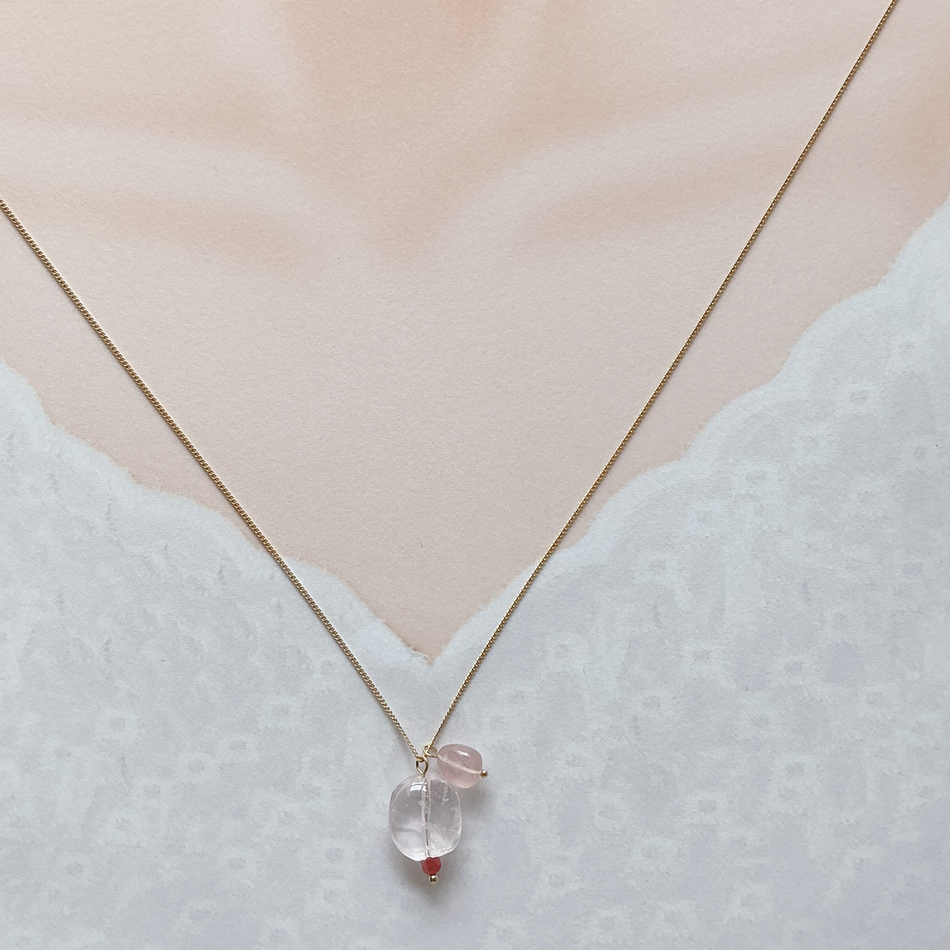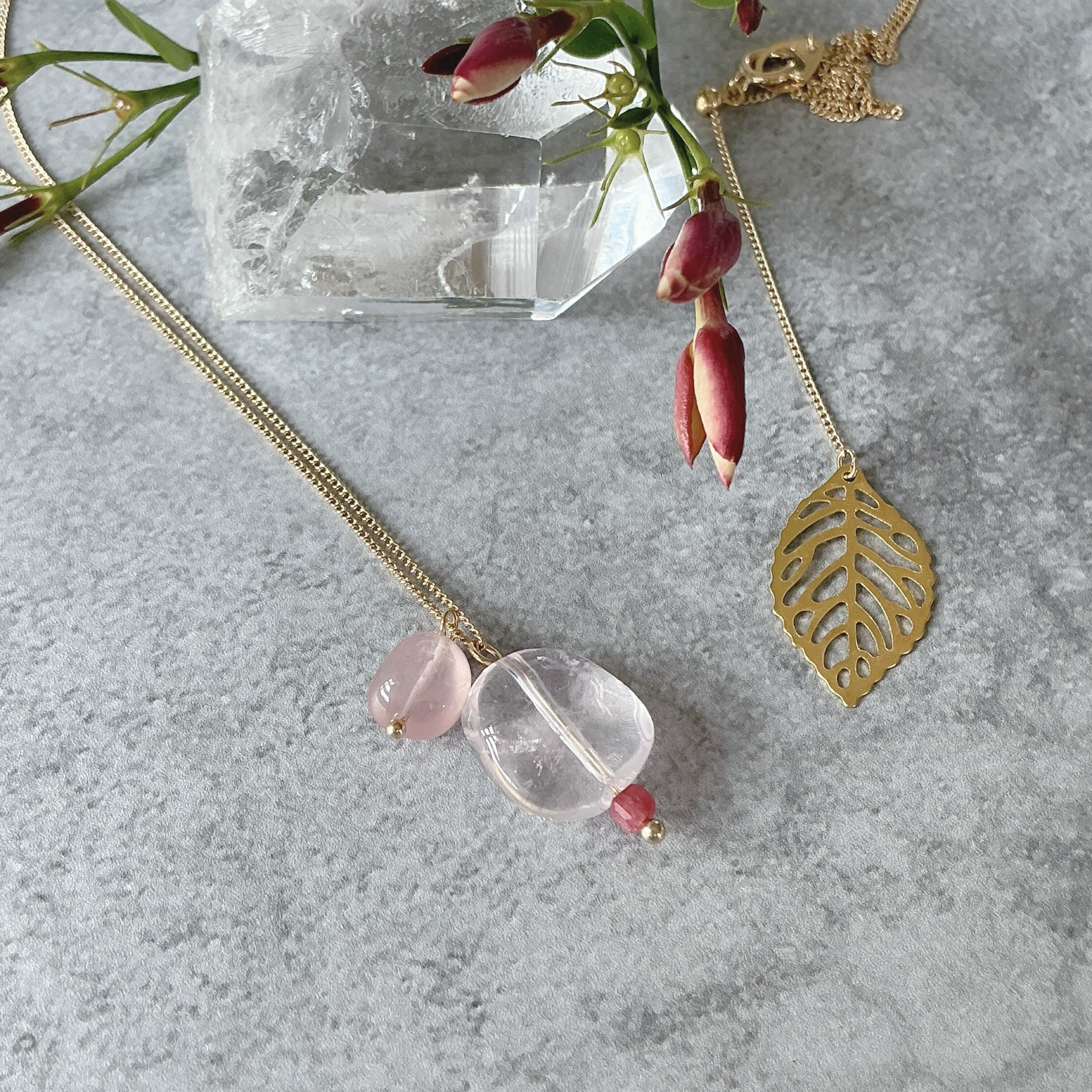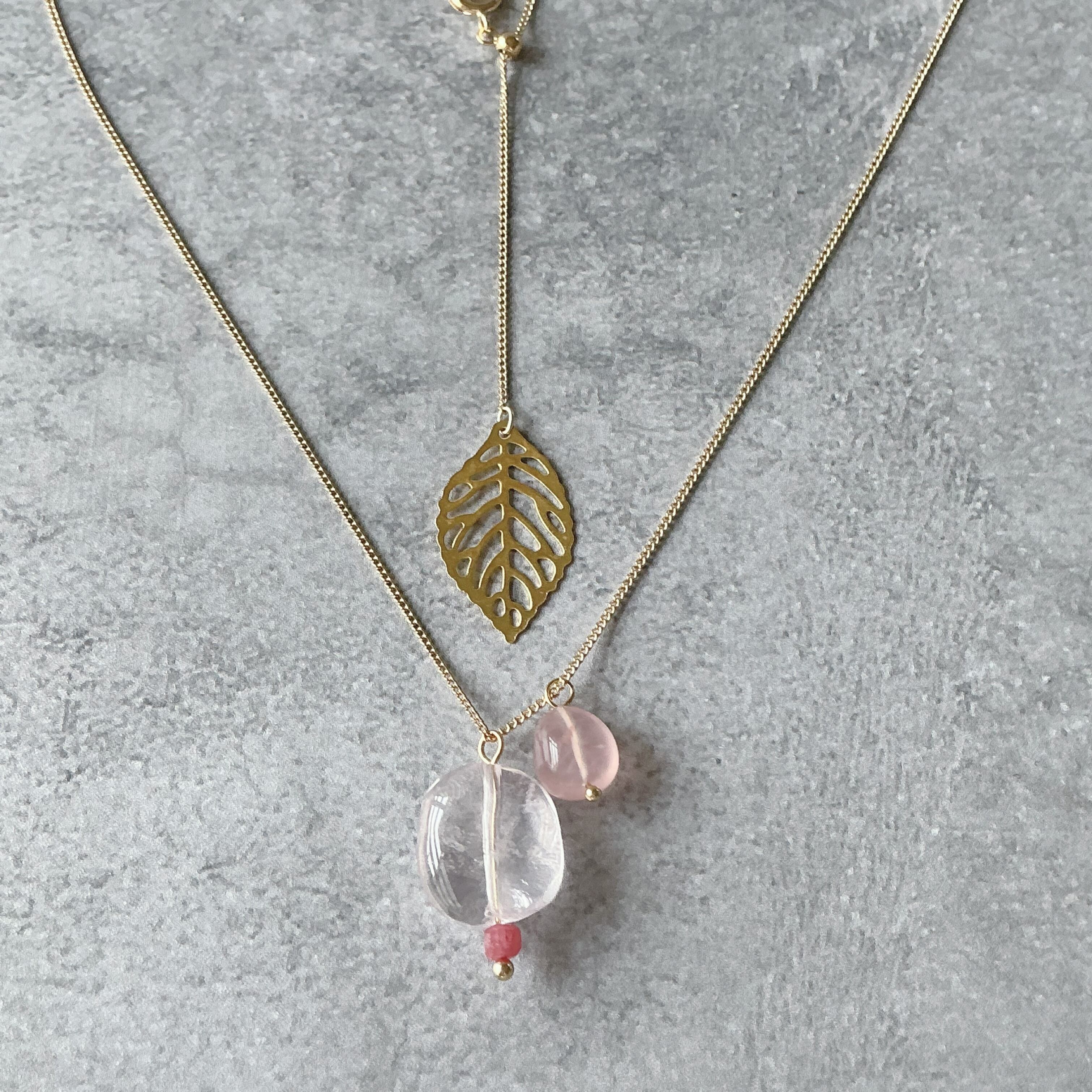 マダガスカル産の大粒のローズクオーツにインペリアルロードナイトと、同じマダガスカル産の濃いピンクのディープローズクオーツを添えてネックレスに仕上げました。