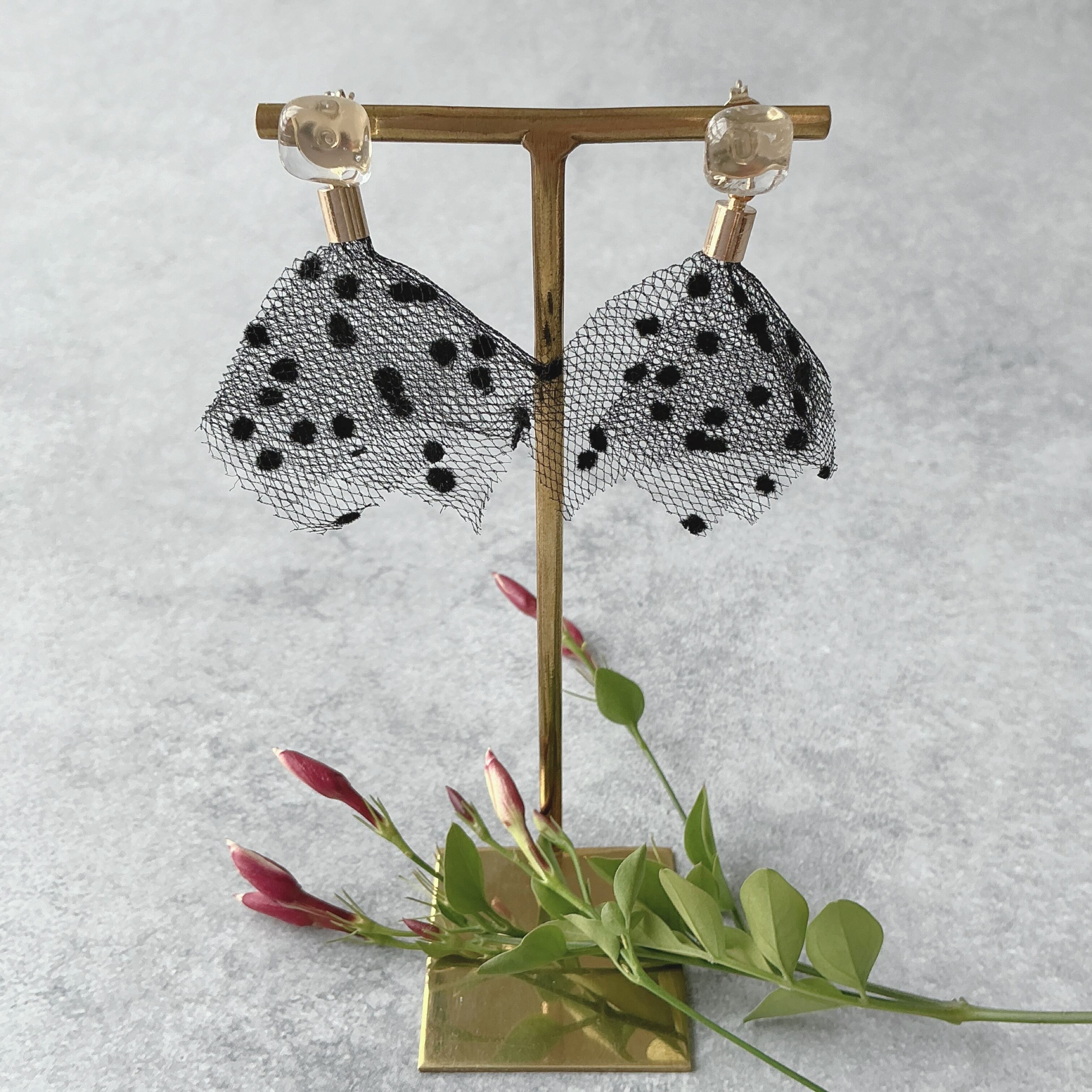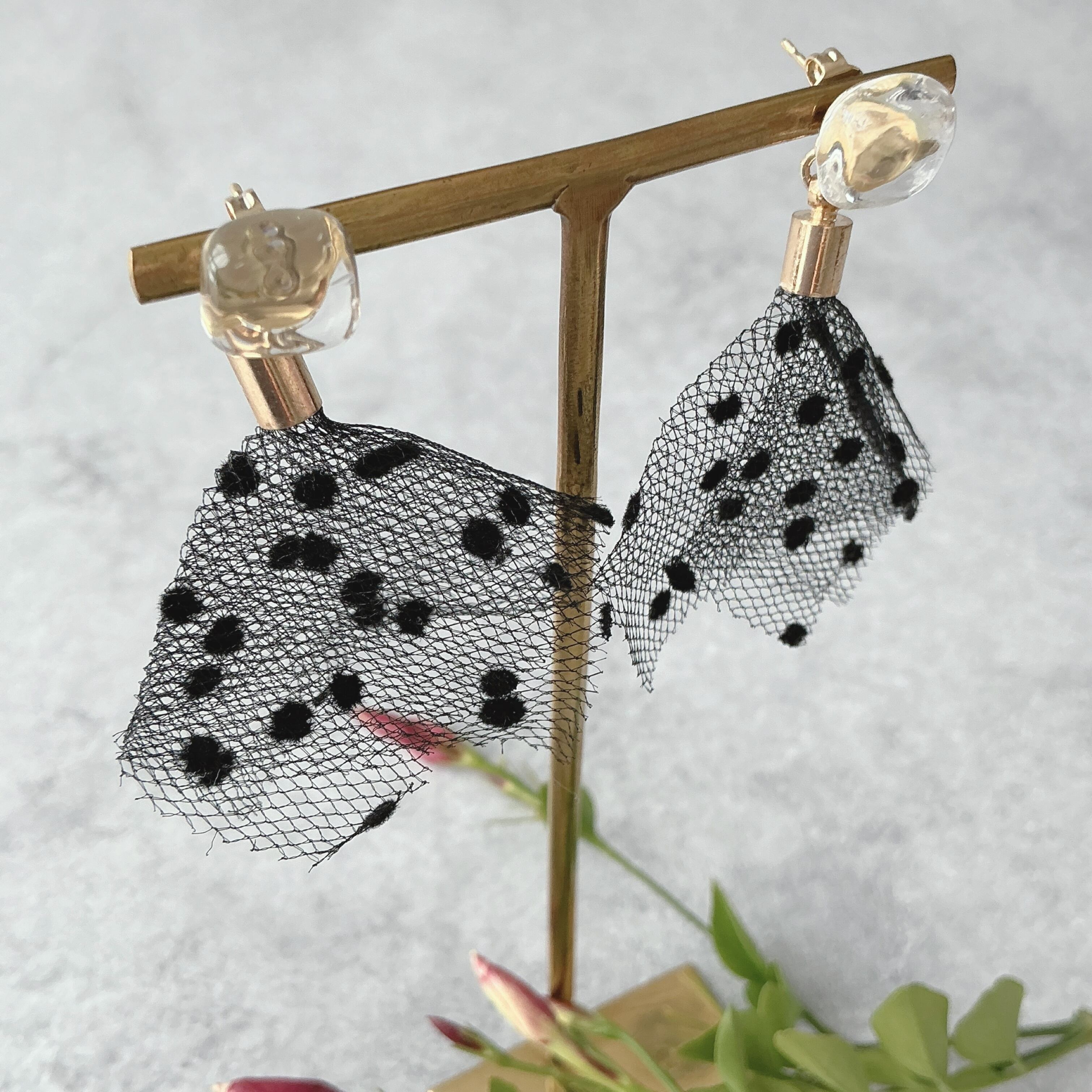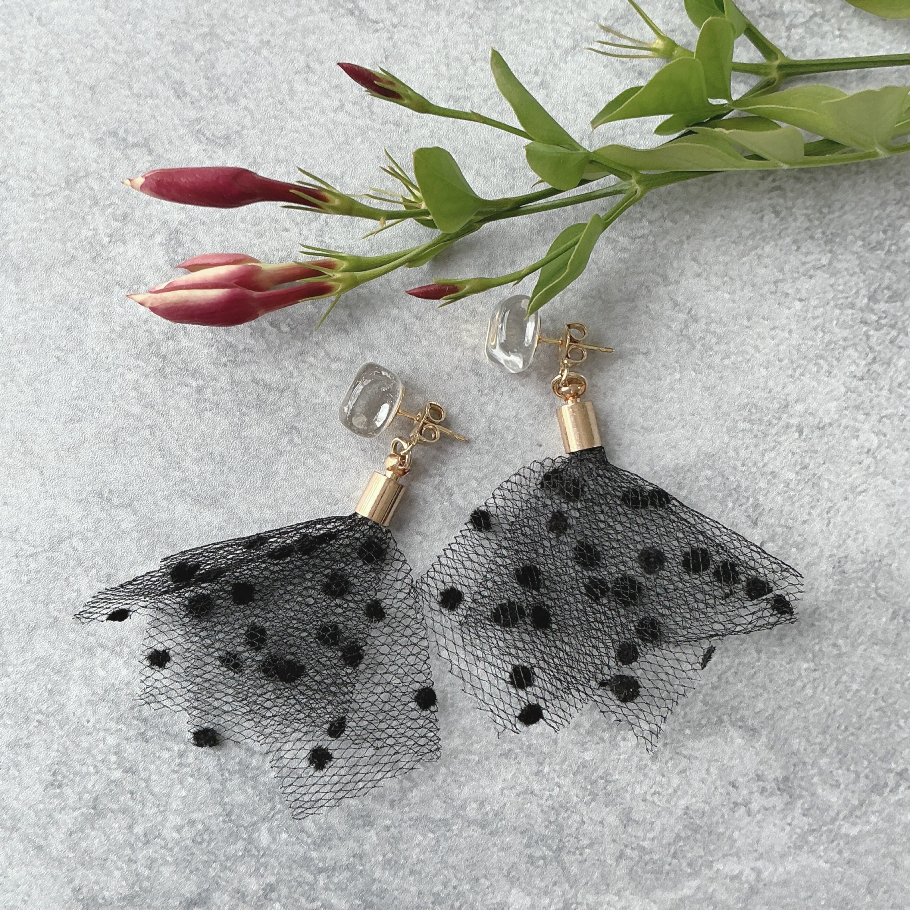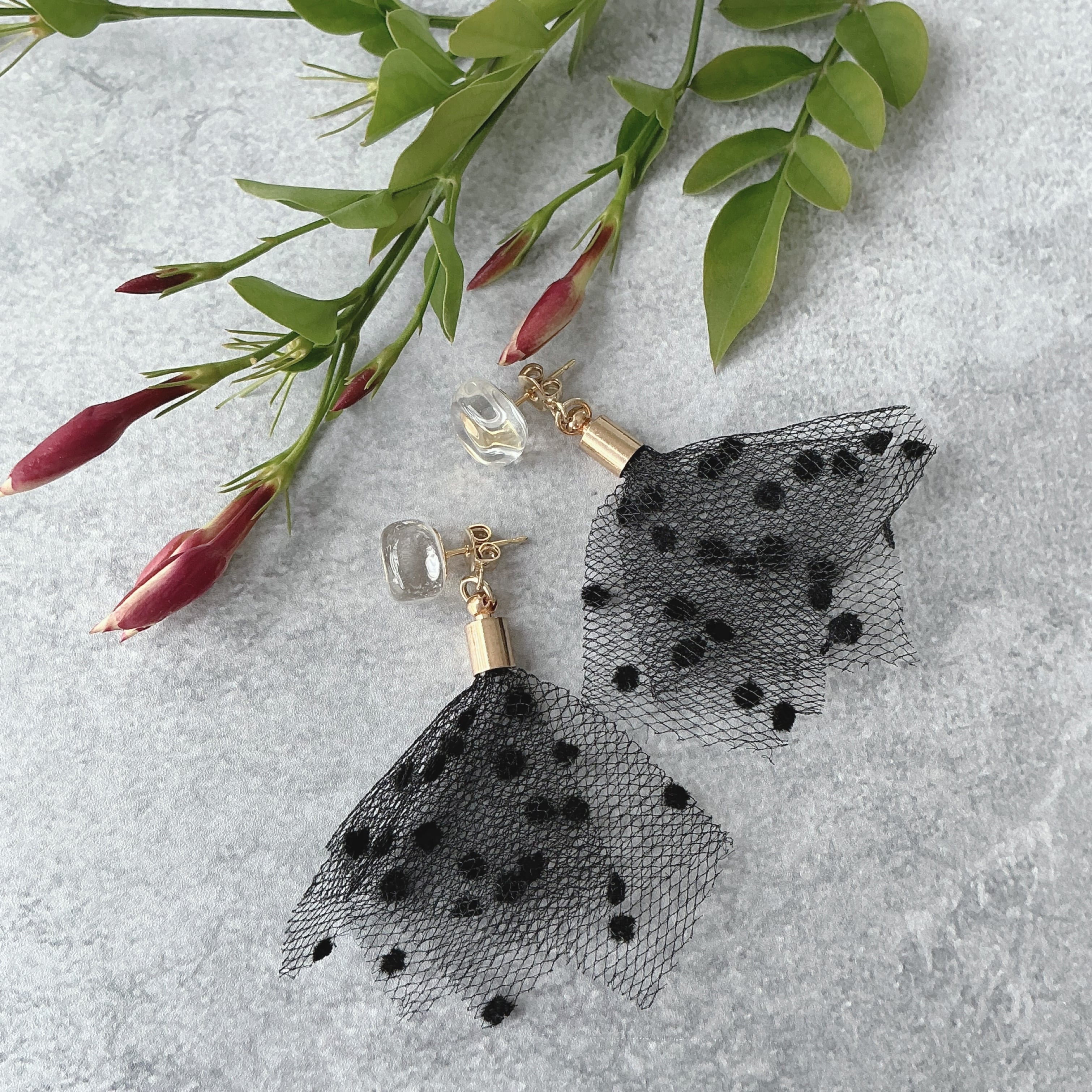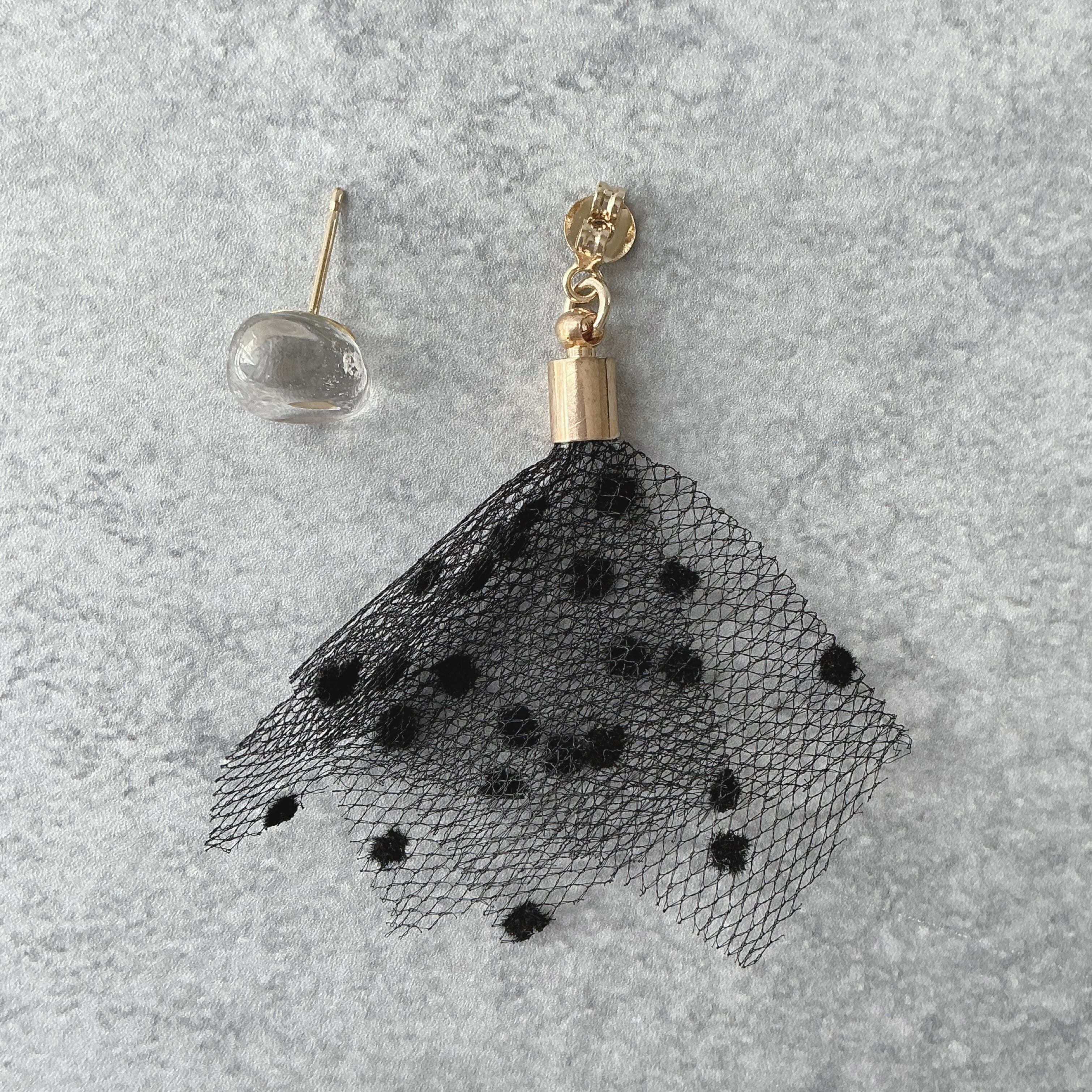 使用している天然石はナチュラルな形の水晶。キャッチ部分にブラックの水玉チュールを合わせました。石言葉は「万能」「願望成就」「浄化」「直感」などの石言葉が並びます。