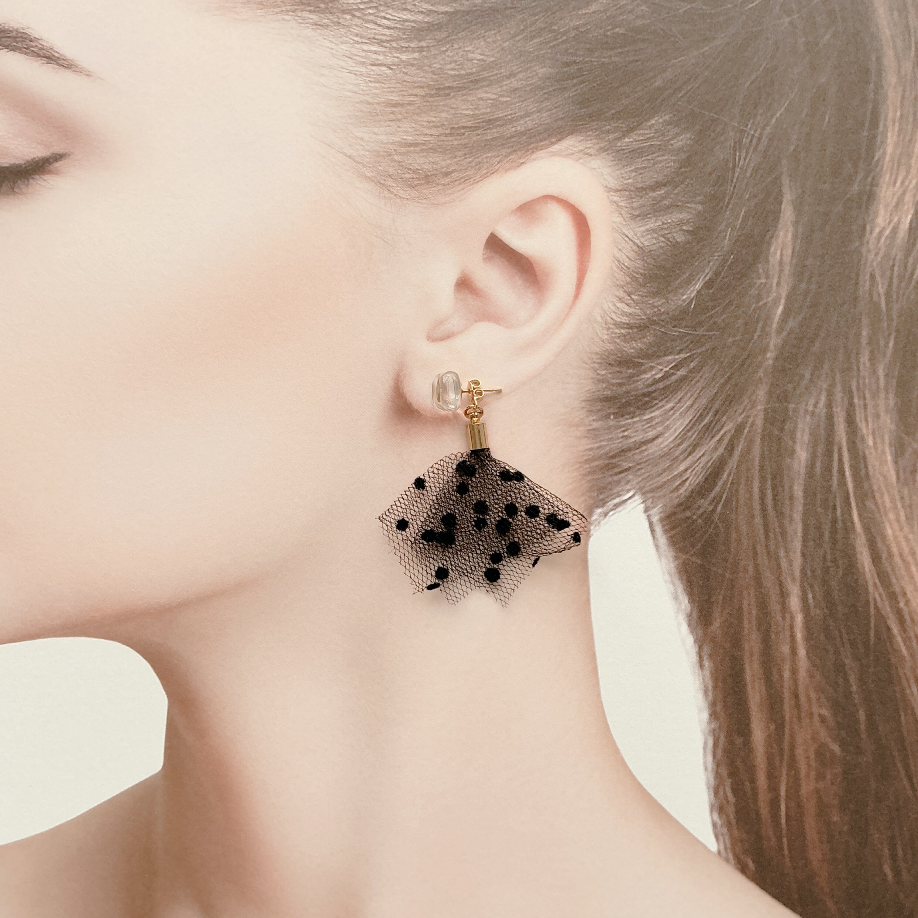 キャッチ部分のチュールが特徴的なデザインの『tulle』は、キャッチをお持ちのピアスに合わせ楽しむ事も可能ですし、お持ちのシンプルなキャッチがございましたら合わせる事で水晶のみのシンプルなデザインを楽しむ事もできます。また、チュール部分はキャッチ側のデザインですので、耳の後ろ側からサポートするデザインですので少し控えめな感じも作者が気に入っているポイントです。