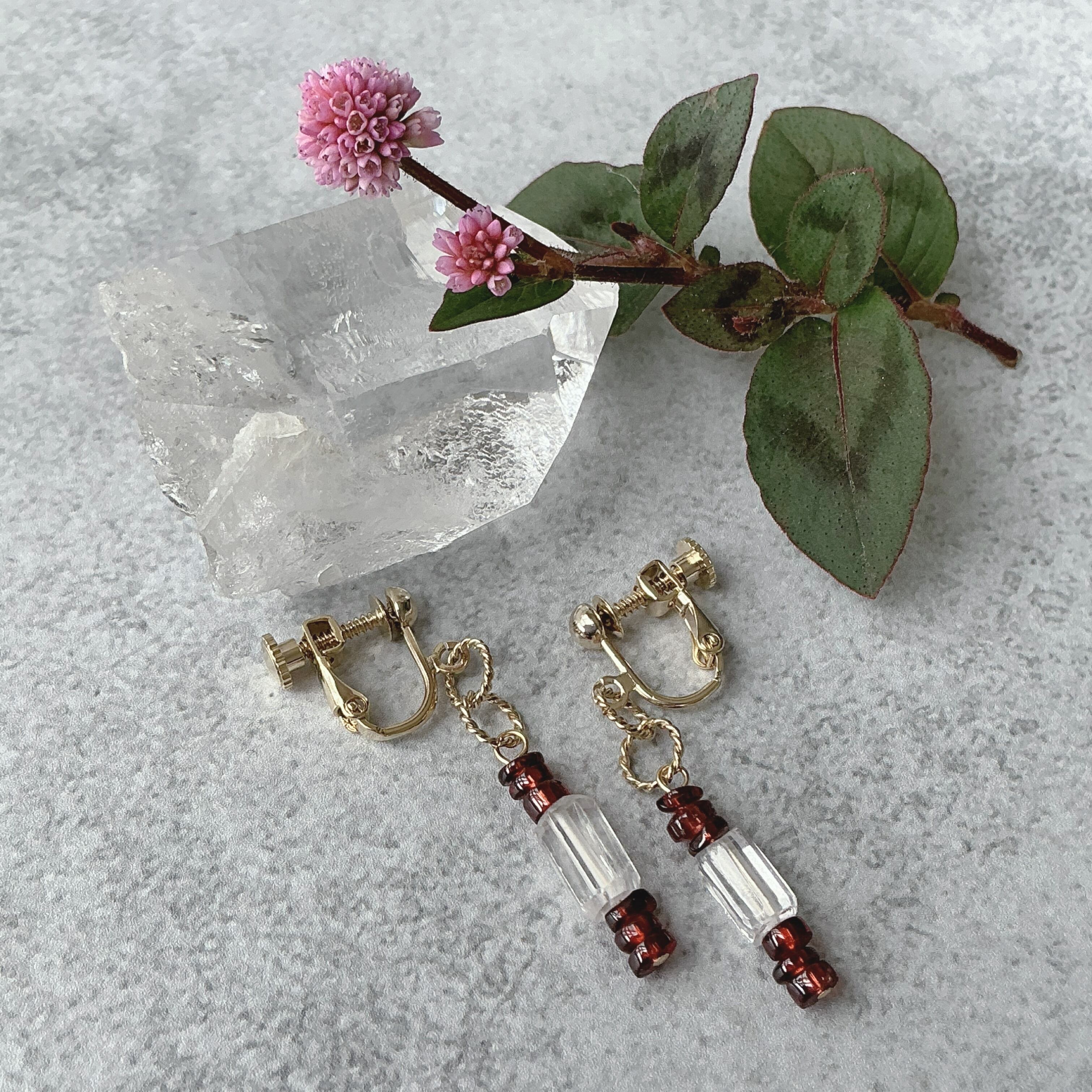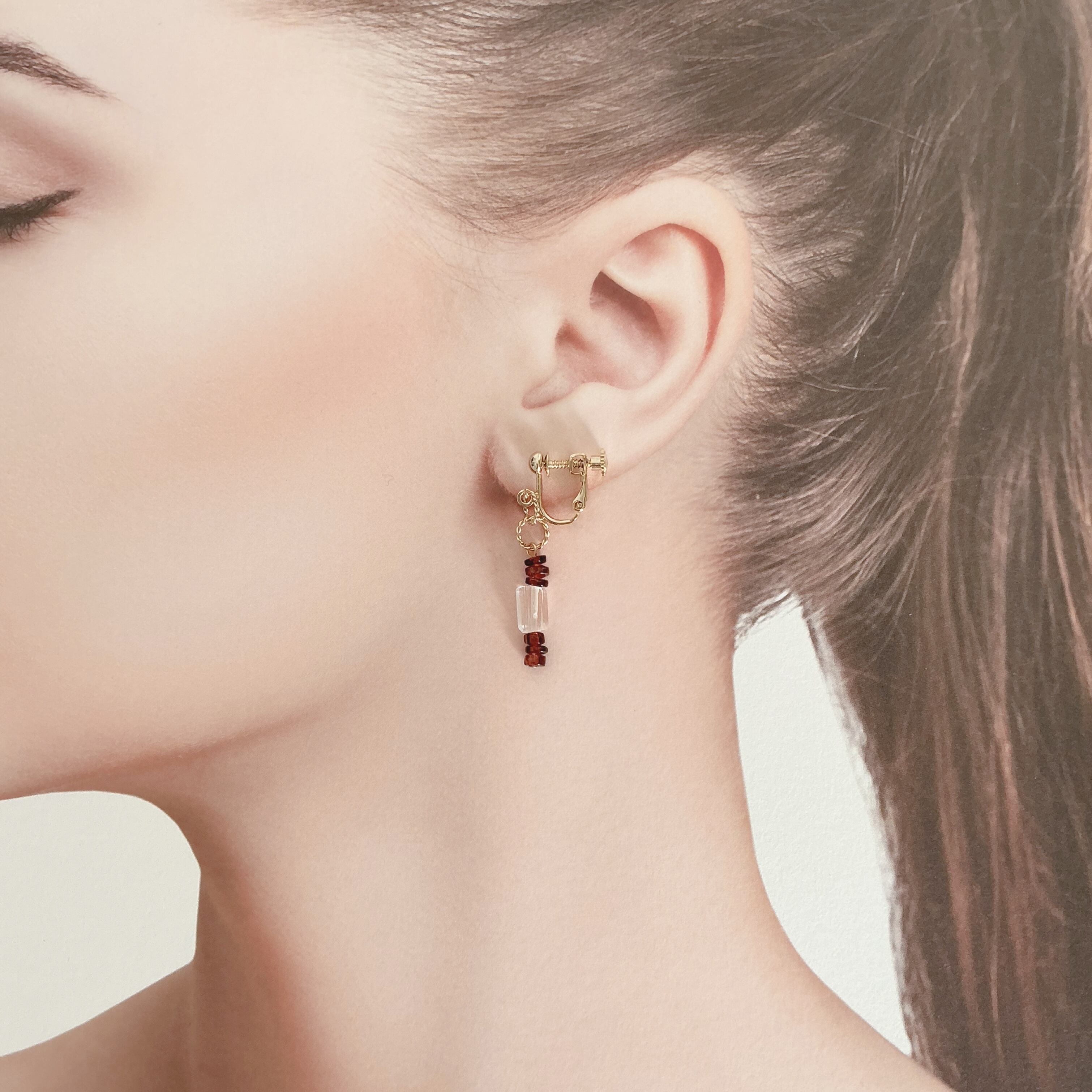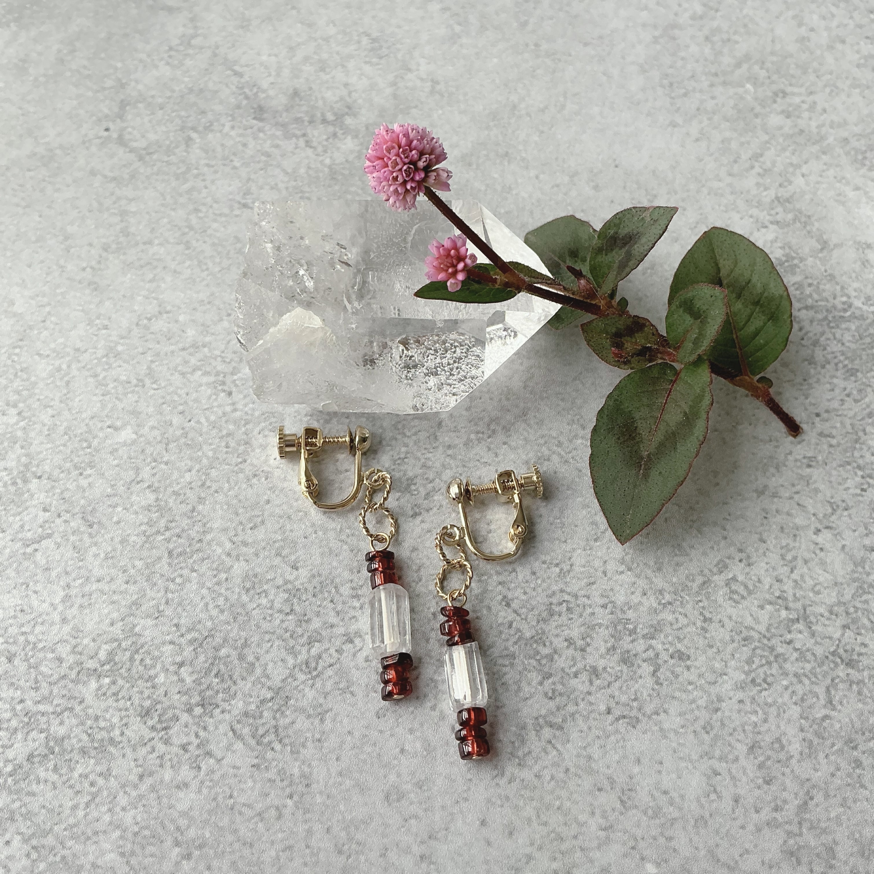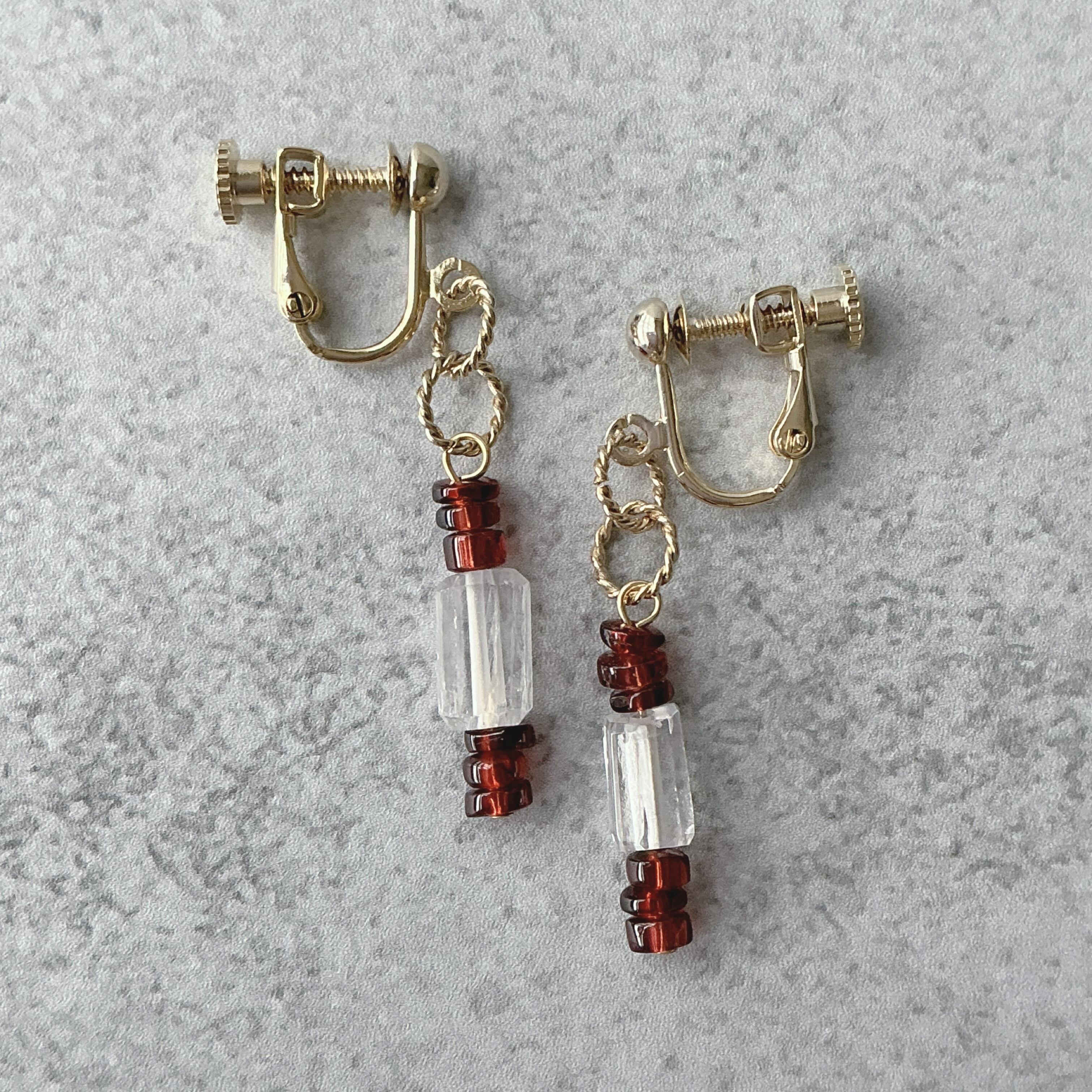 使われている天然石は美しい柱状のクンツァイトと艶やかなガーネットです。