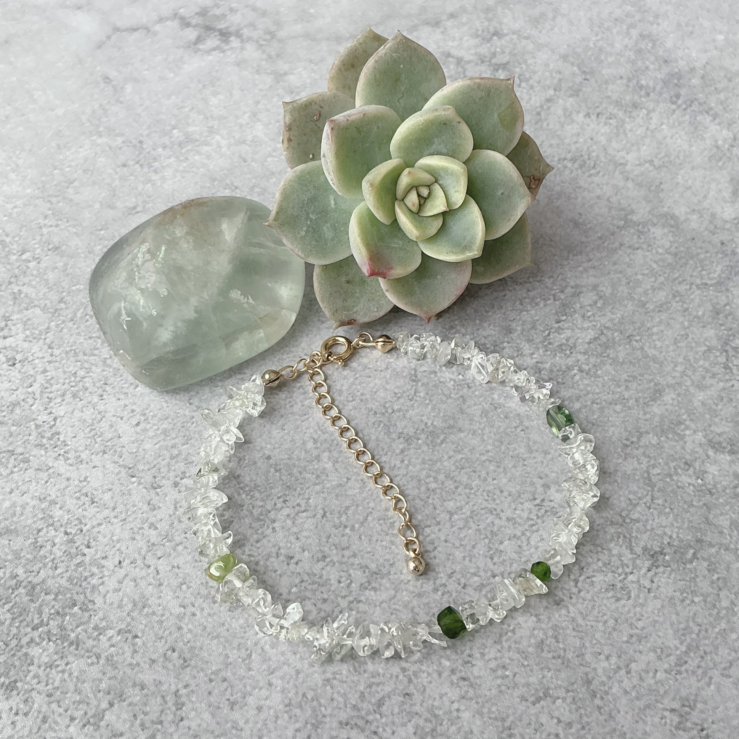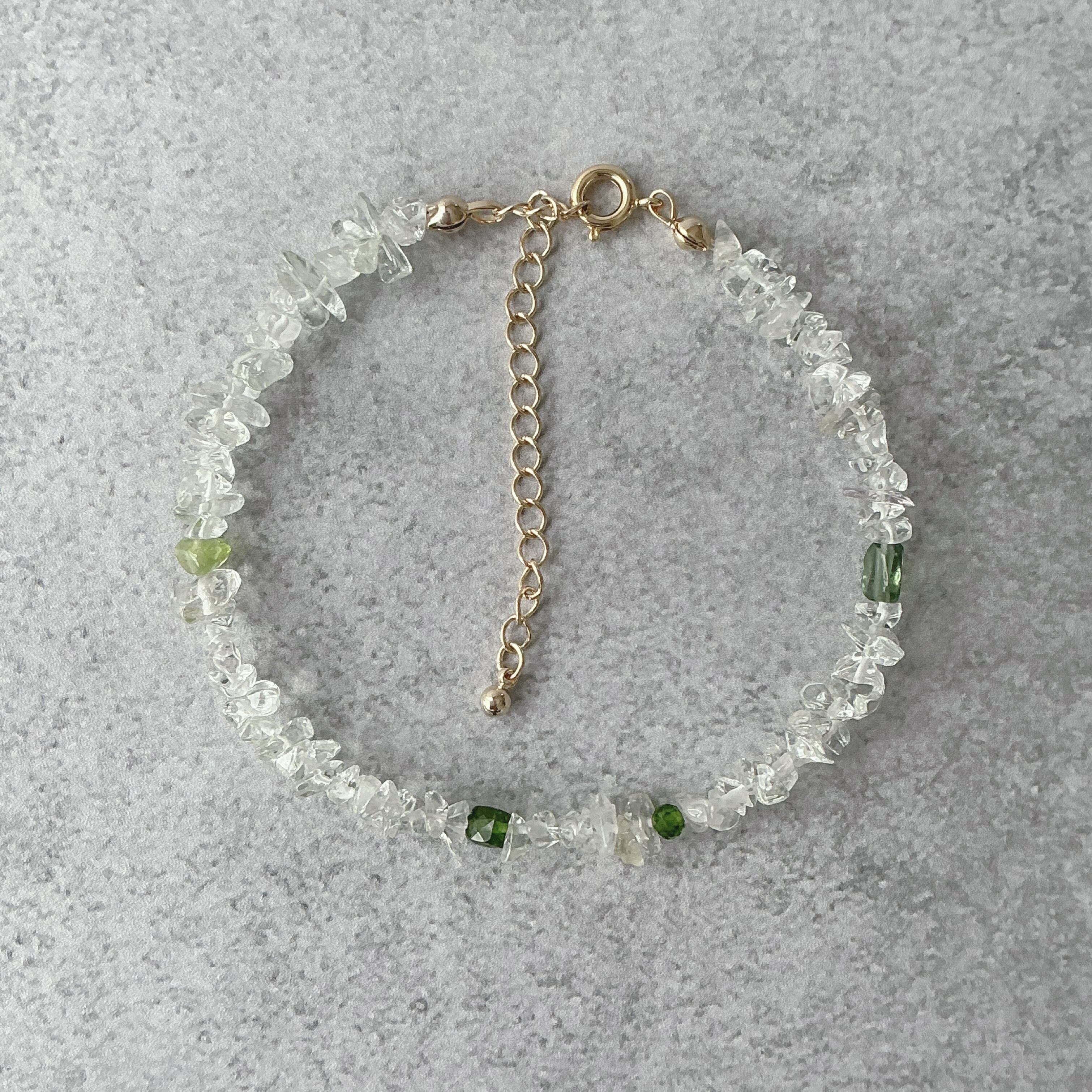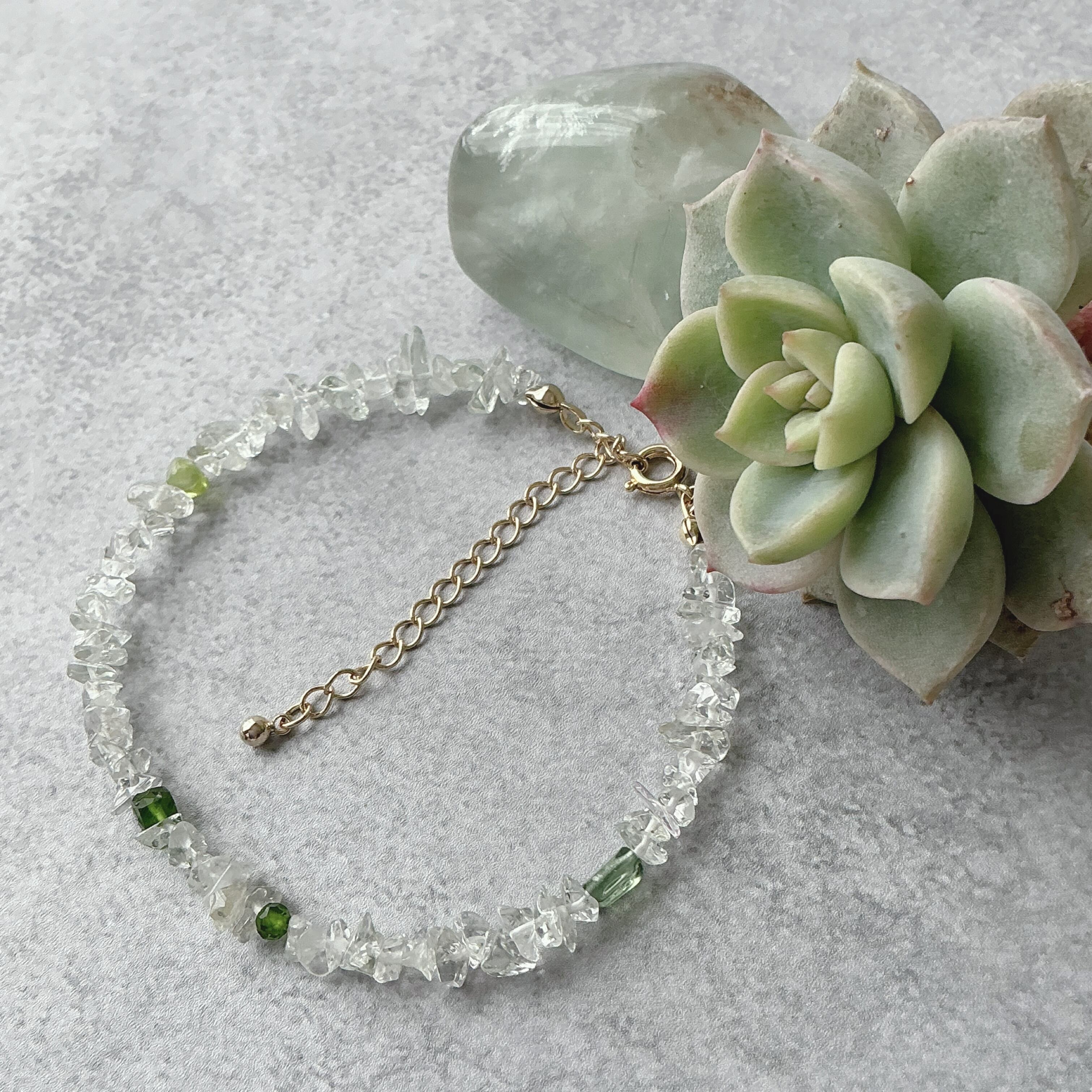 使われている天然石は淡いグリーンの透明感の美しいグリーンアメシスト、可愛らしい黄緑のペリドット、鮮やかなグリーンのクロムダイオプサイド、渋い緑色のグリーンアパタイトとたくさんの種類の天然石を使いました。