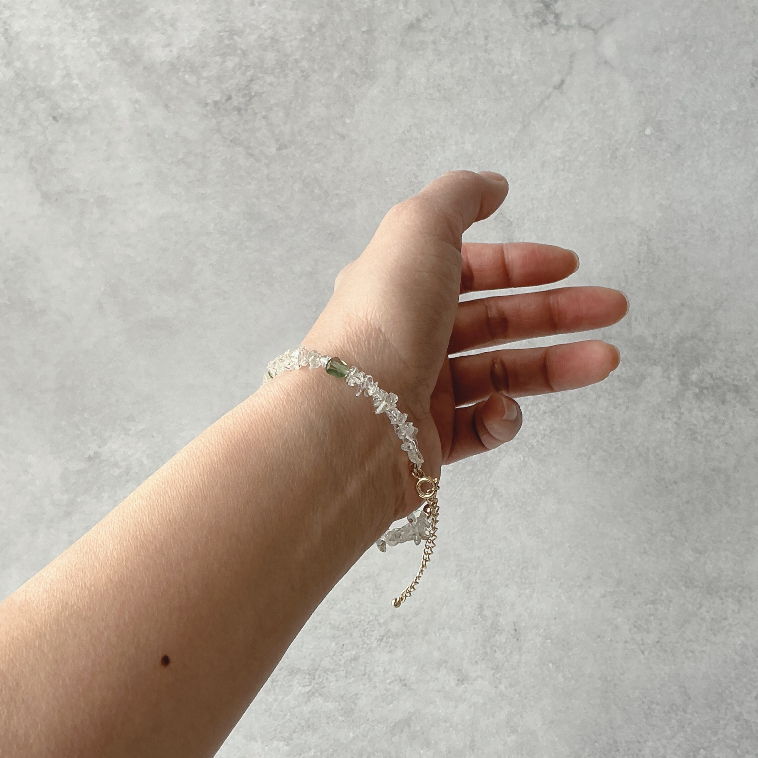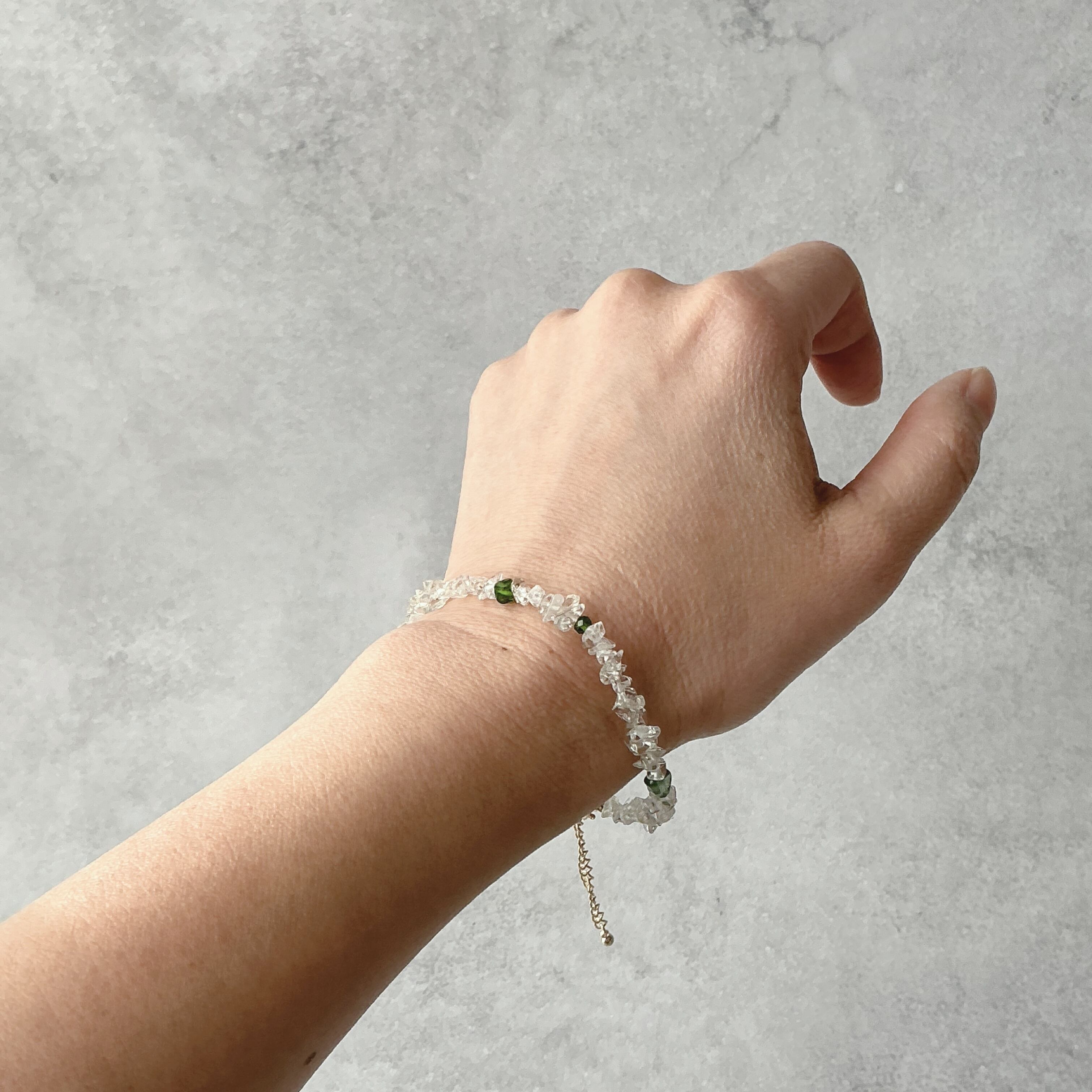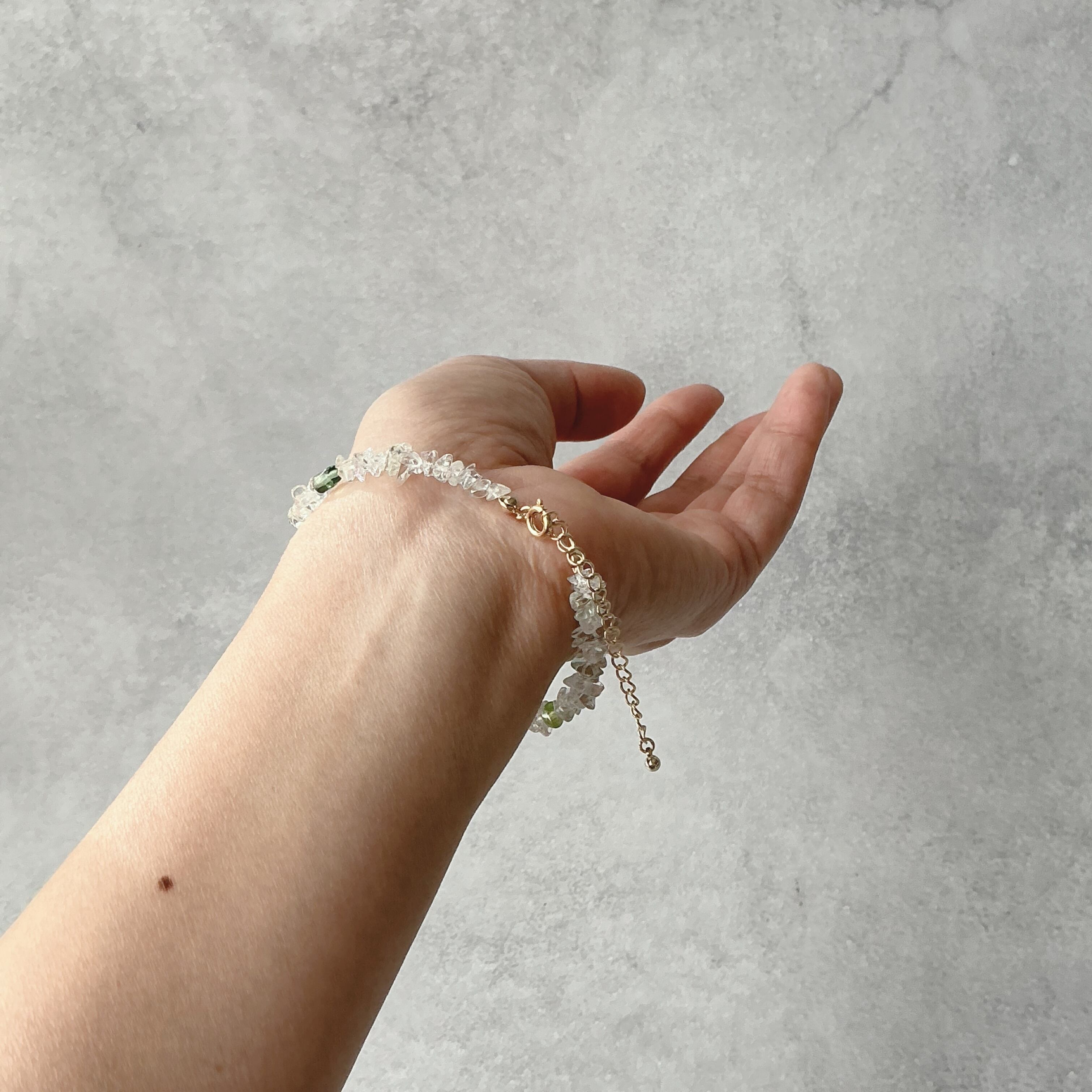 使われている天然石は淡いグリーンの透明感の美しいグリーンアメシスト、可愛らしい黄緑のペリドット、鮮やかなグリーンのクロムダイオプサイド、渋い緑色のグリーンアパタイトとたくさんの種類の天然石を使いました。