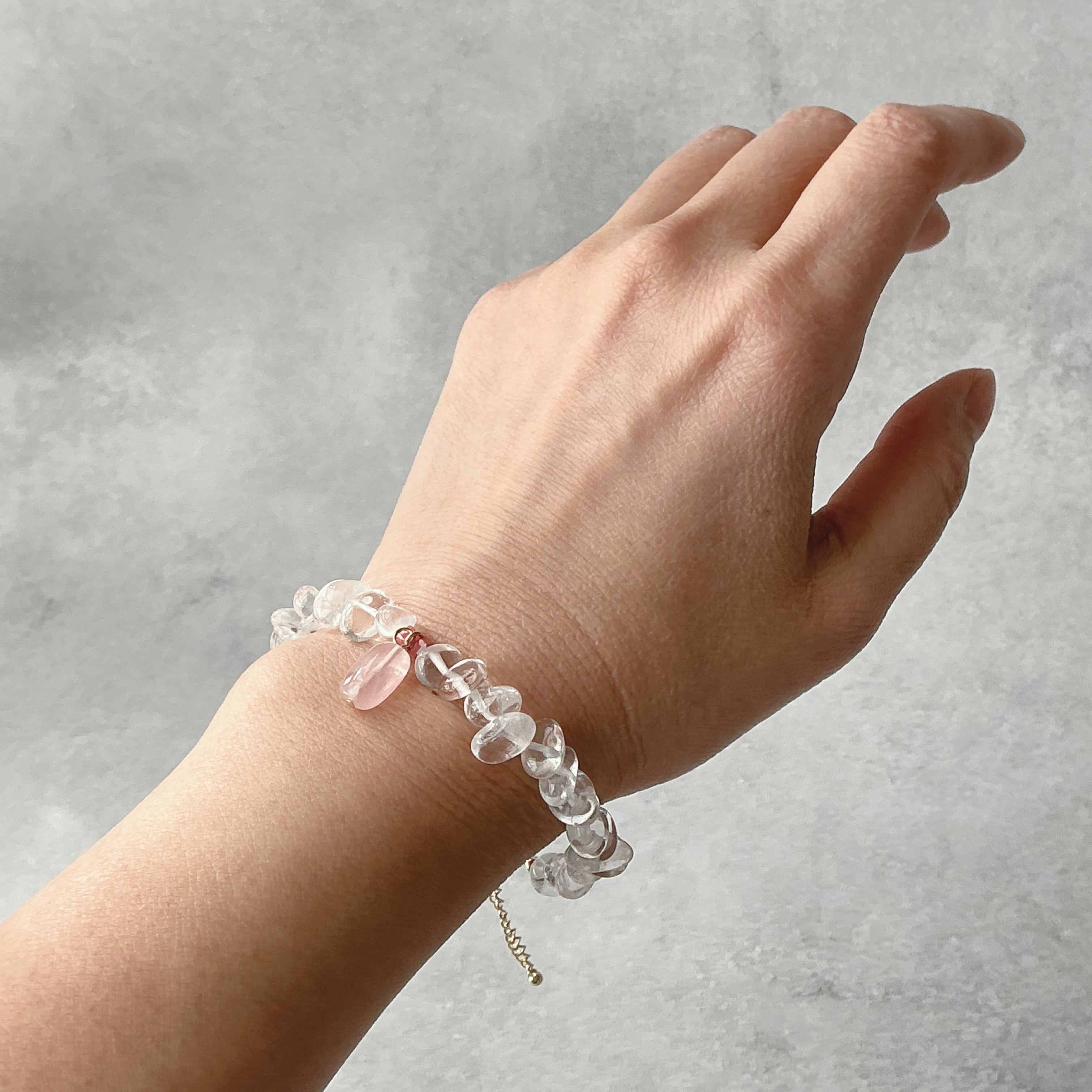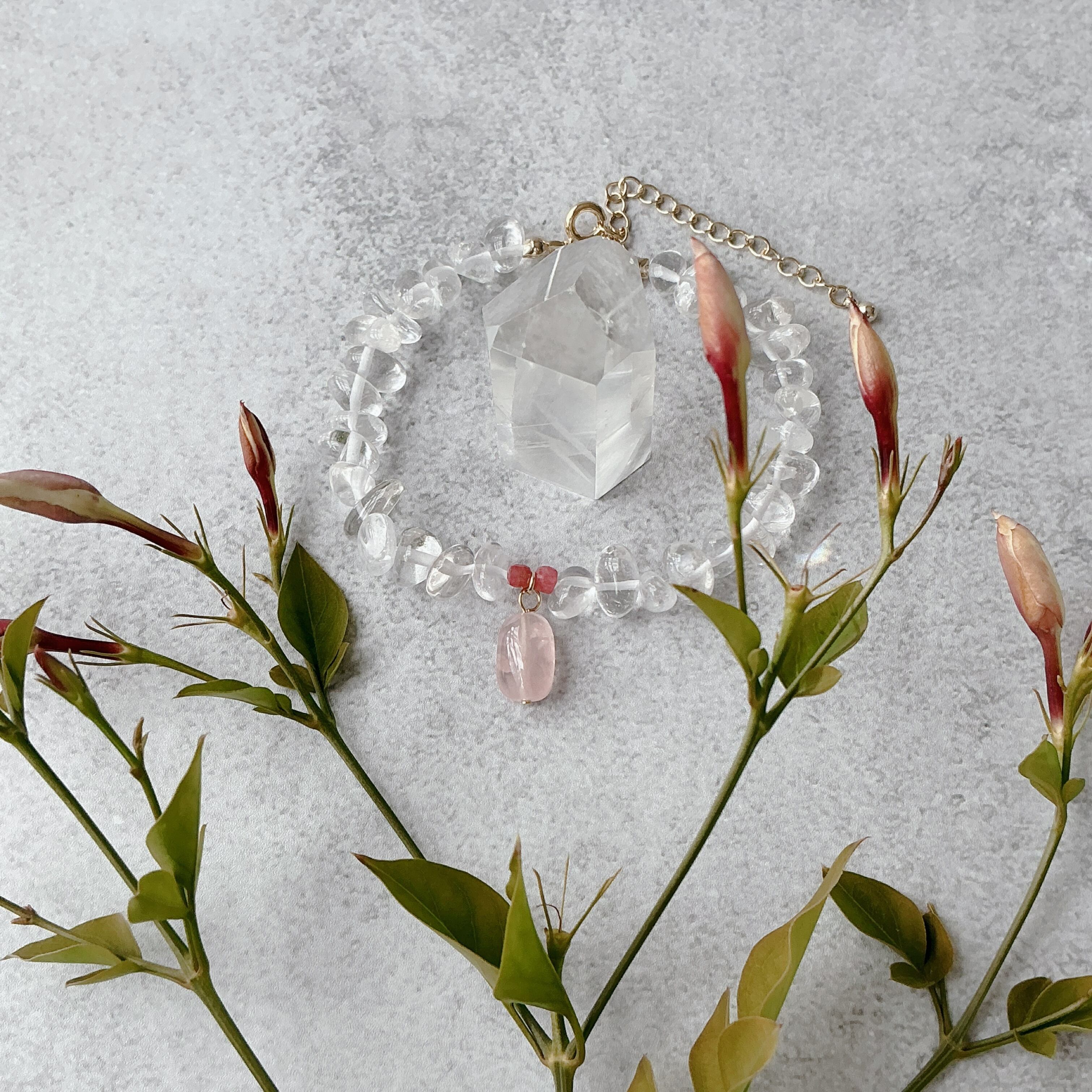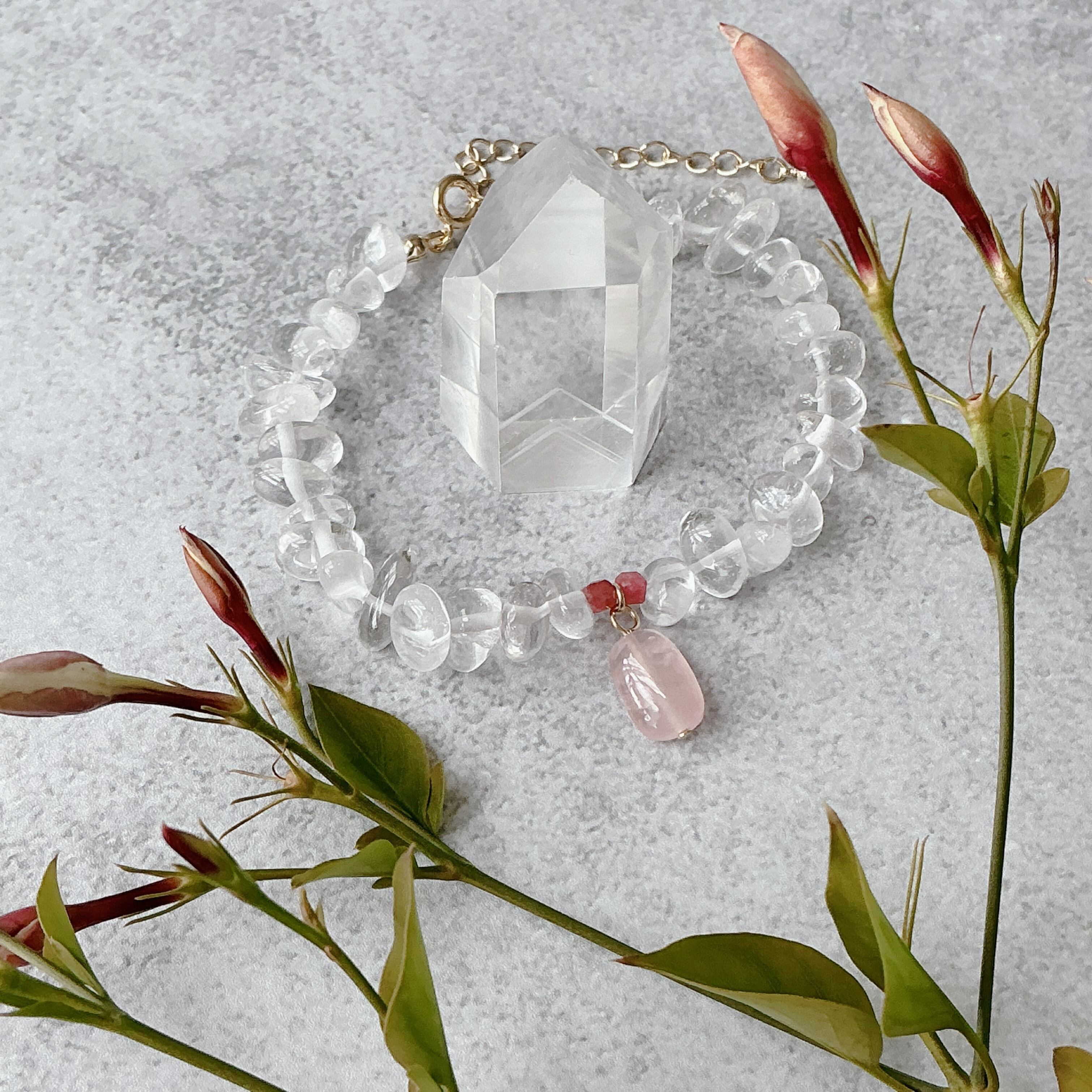 使われている天然石はころんとしたナチュラルな水晶と小粒ながらにもお色がしっかりと濃いピンクのインペリアルロードナイト、マダガスカル産のこちらもお色の濃いしっかりとしたピンクのディープローズクオーツです。
