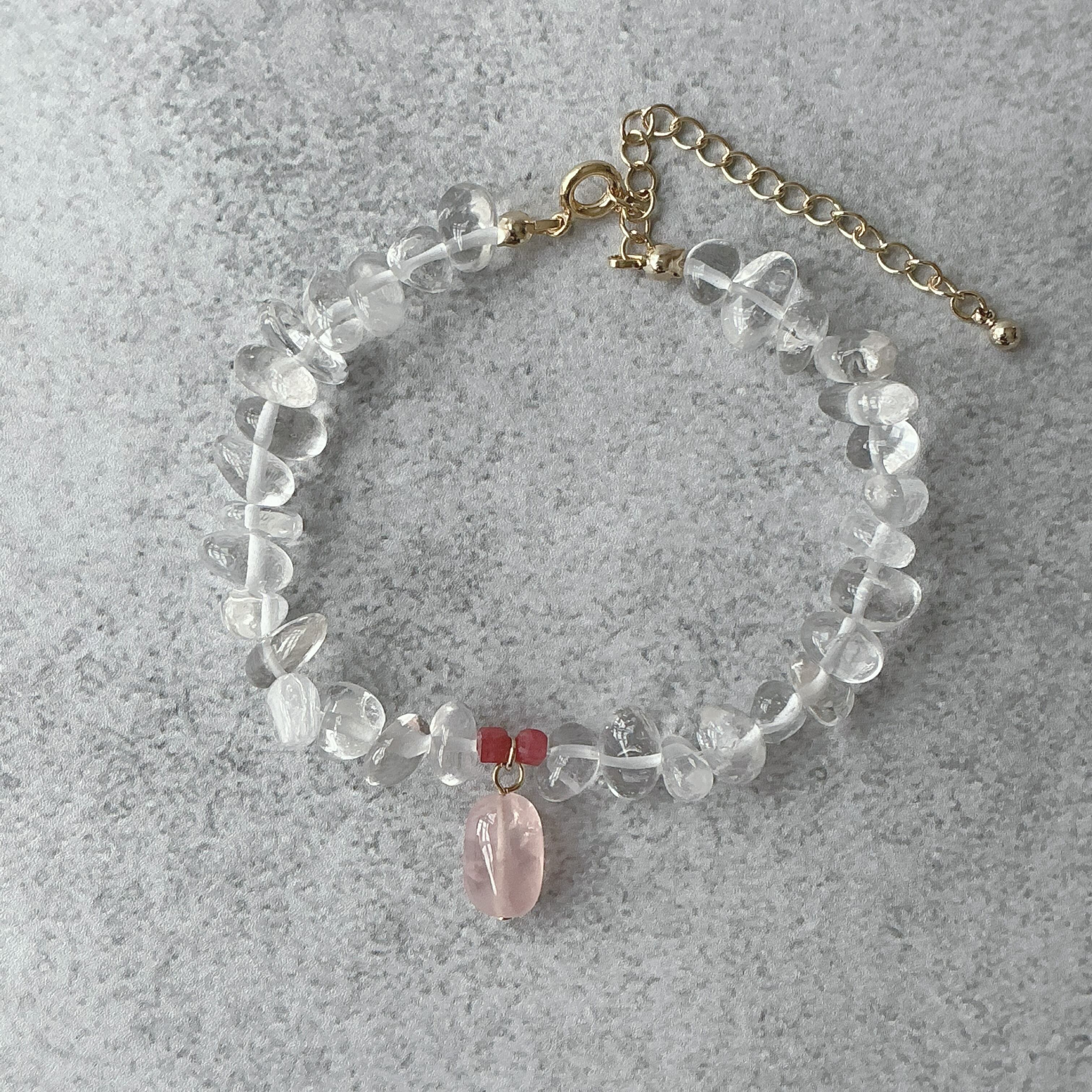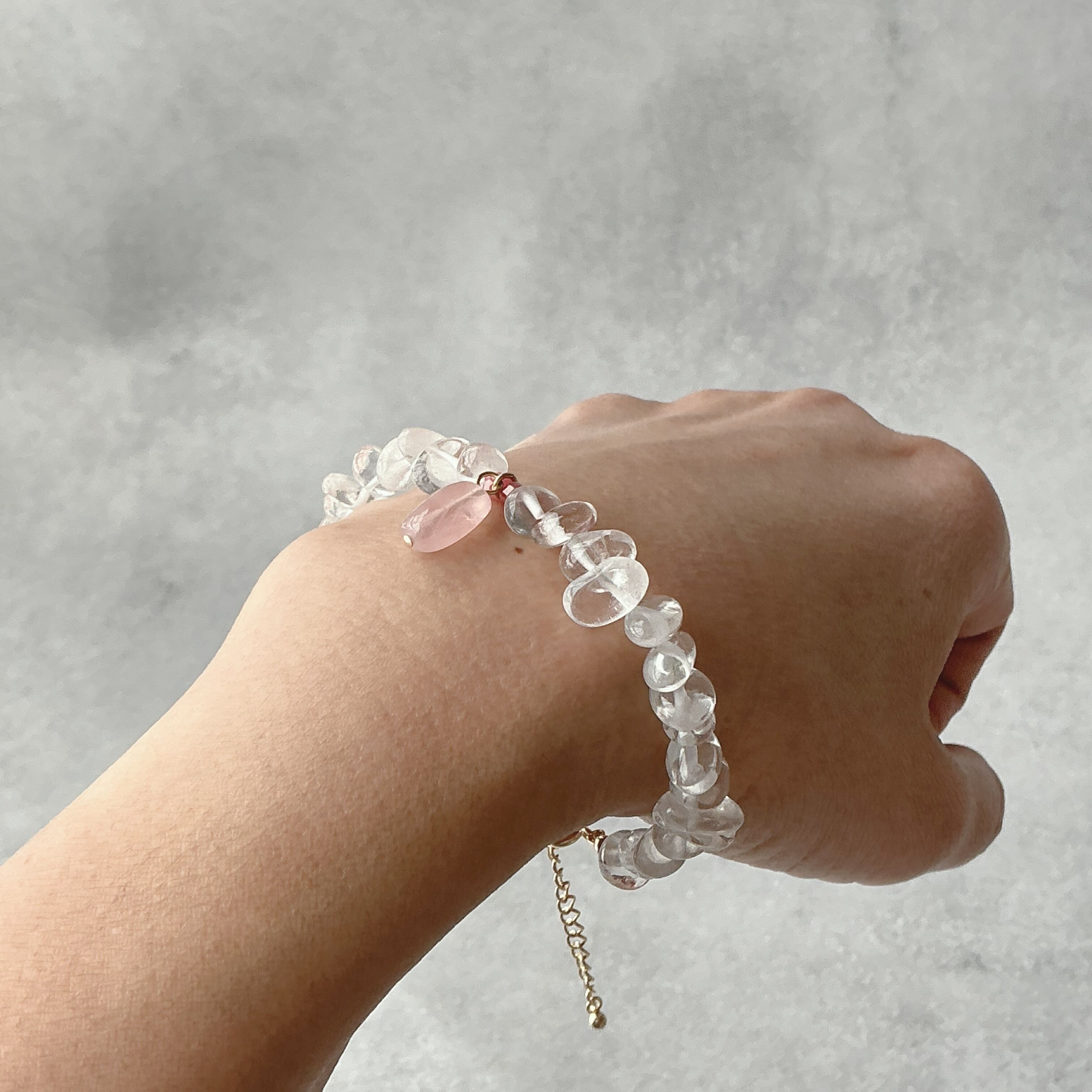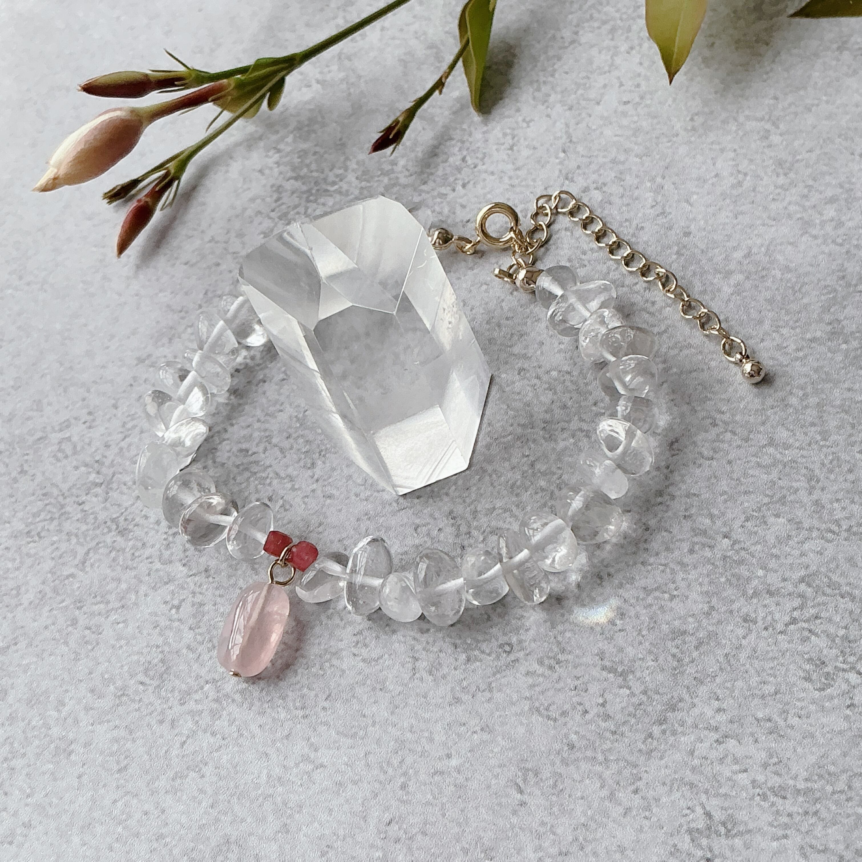 使われている天然石はころんとしたナチュラルな水晶と小粒ながらにもお色がしっかりと濃いピンクのインペリアルロードナイト、マダガスカル産のこちらもお色の濃いしっかりとしたピンクのディープローズクオーツです。