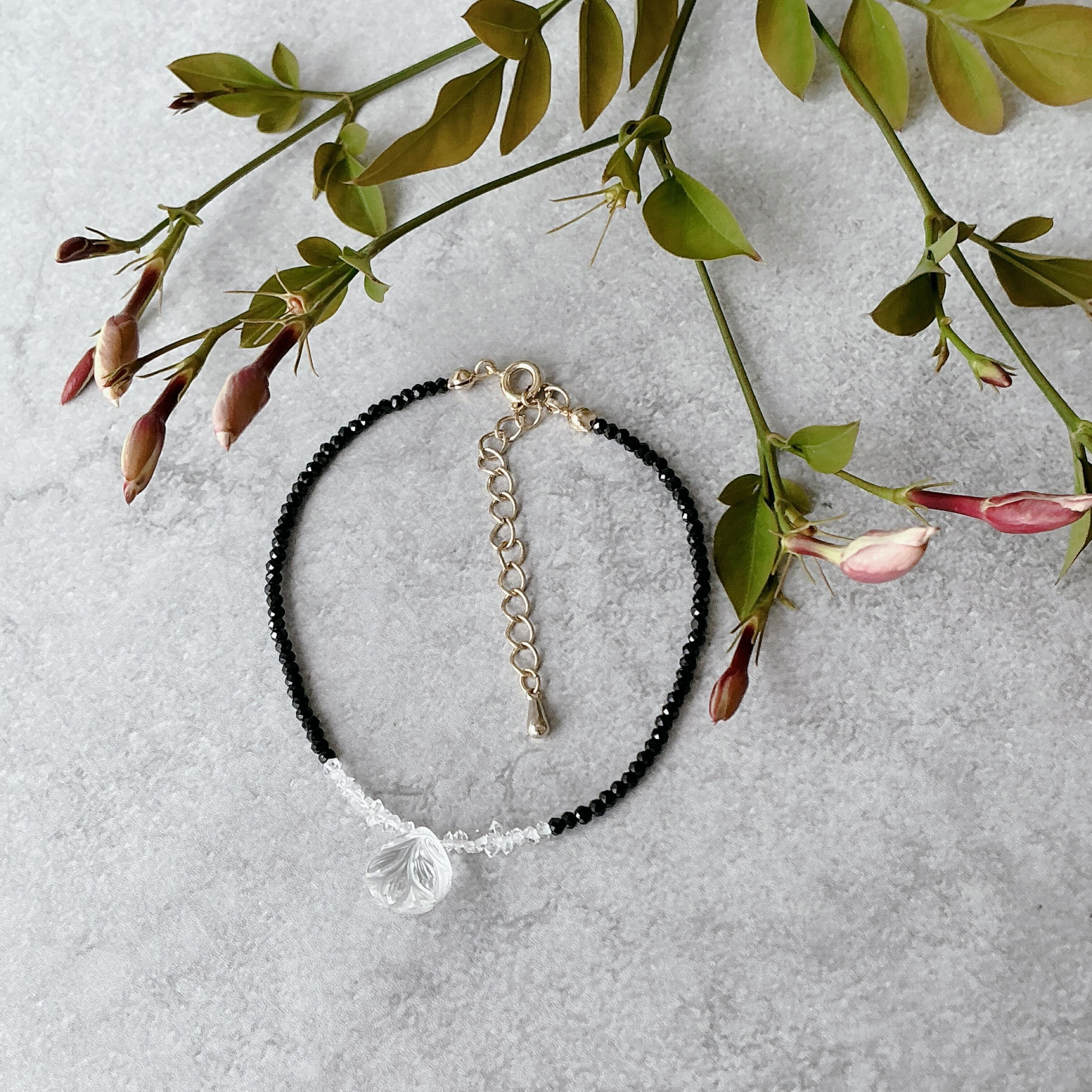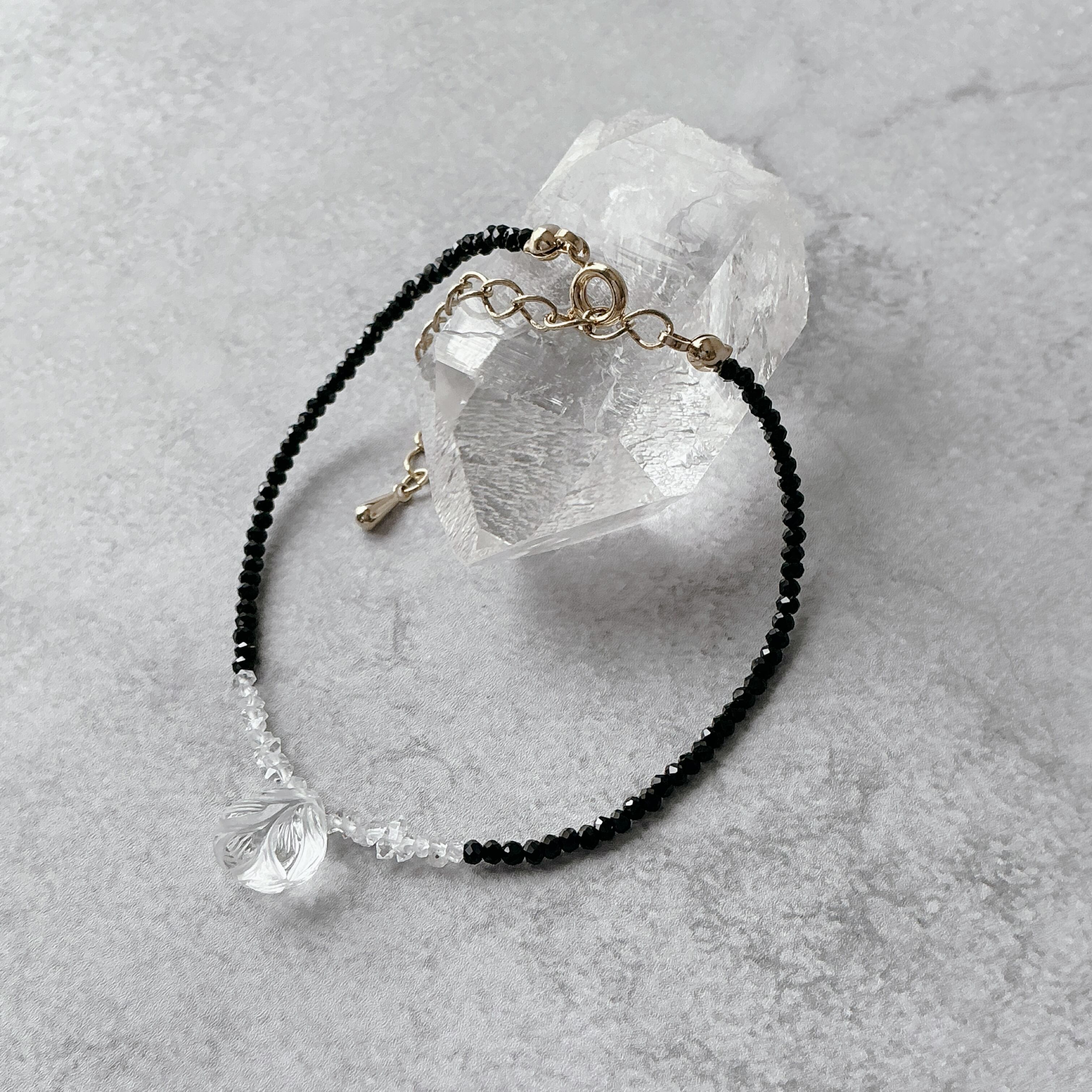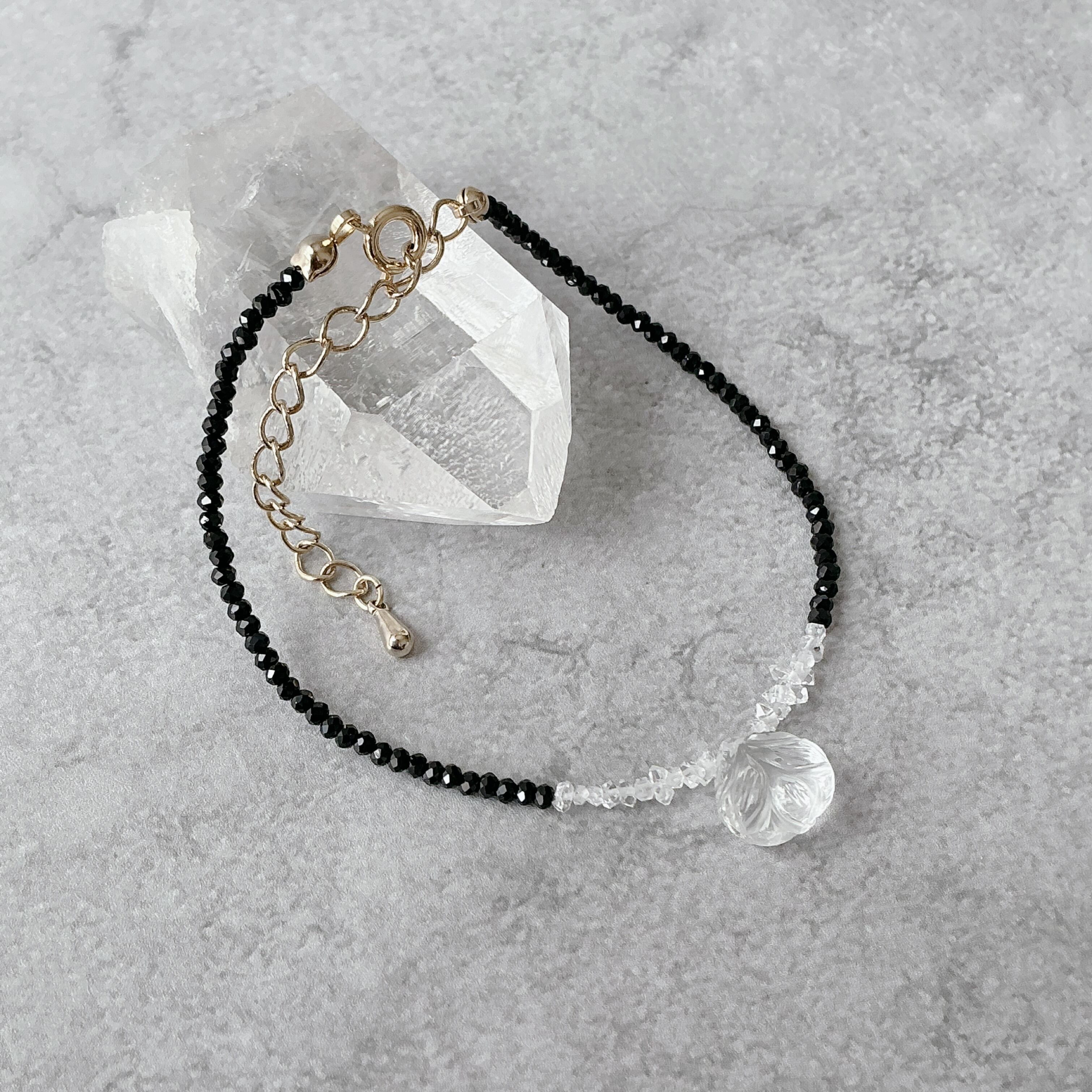光の7色を全て合わせると透明になる事、全ての光を吸収する黒、何だかそんな色の組み合わせも不思議だなと思いますし、ブレスレットとしての仕上がりが美しい作品となりました。中央部分の堀の美しい水晶が本当に可愛らしいので、ぜひご縁のありました方には楽しんでいただけたら嬉しいです。