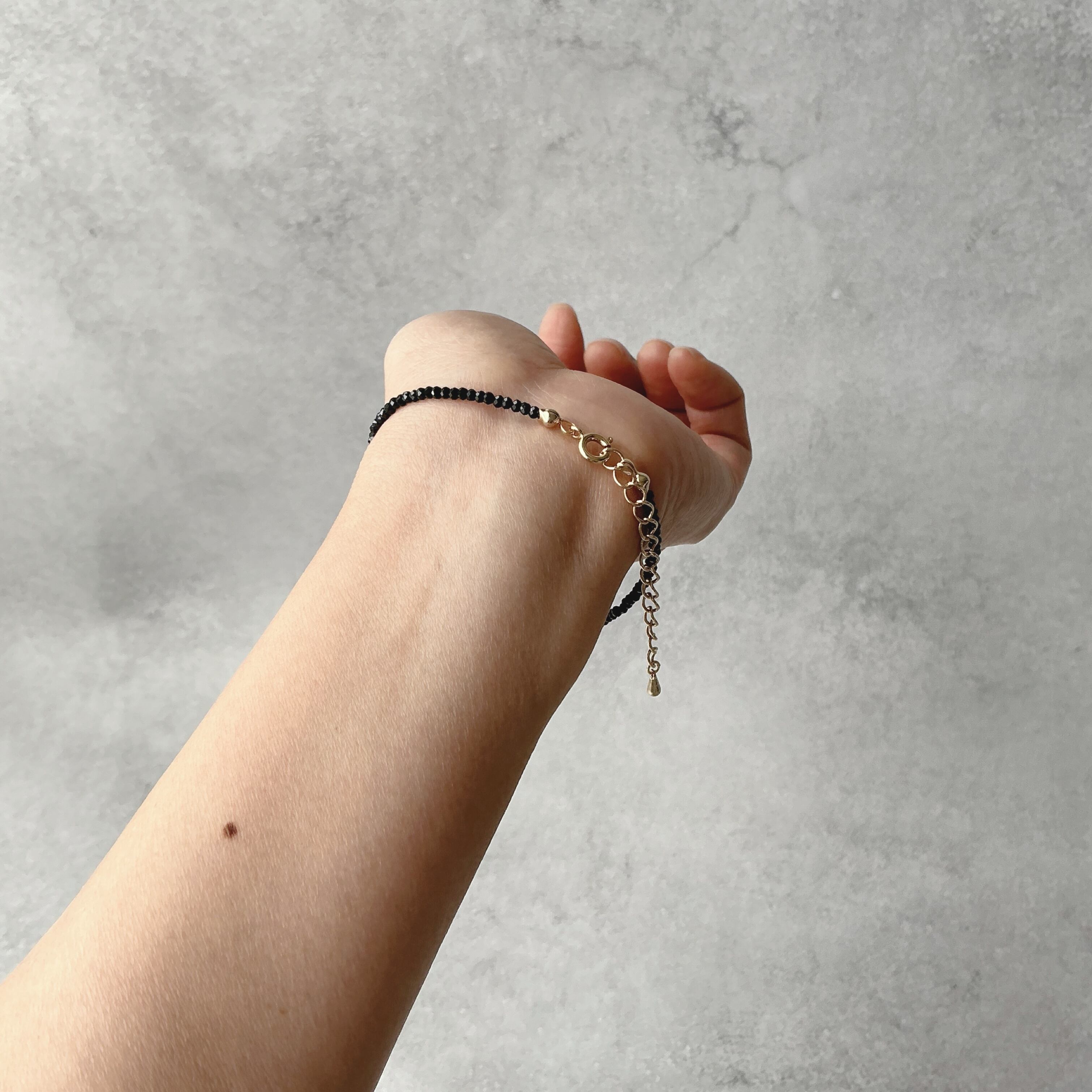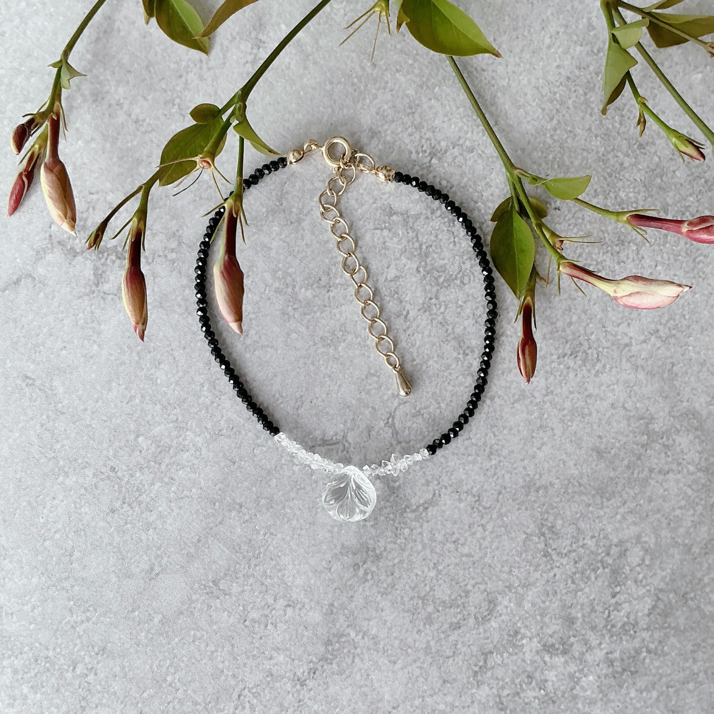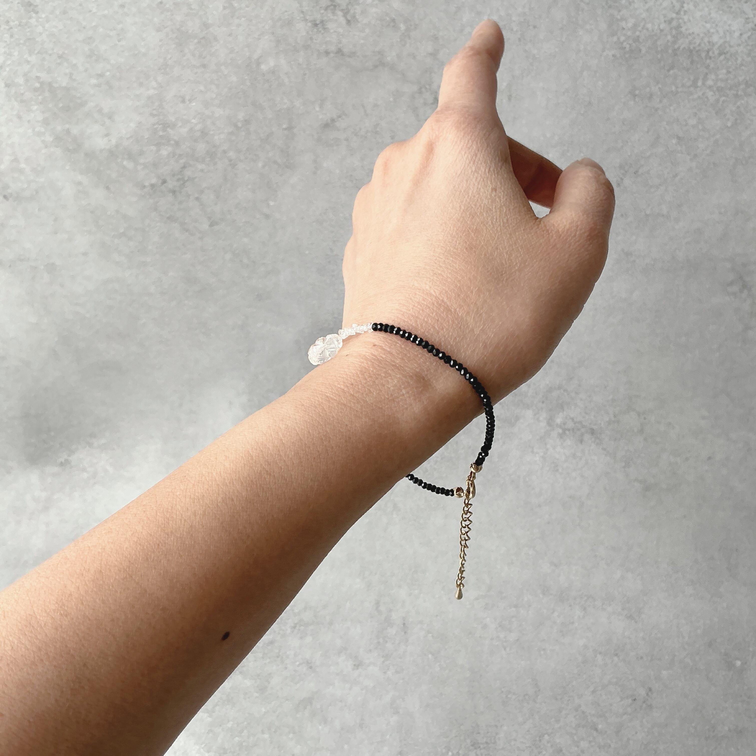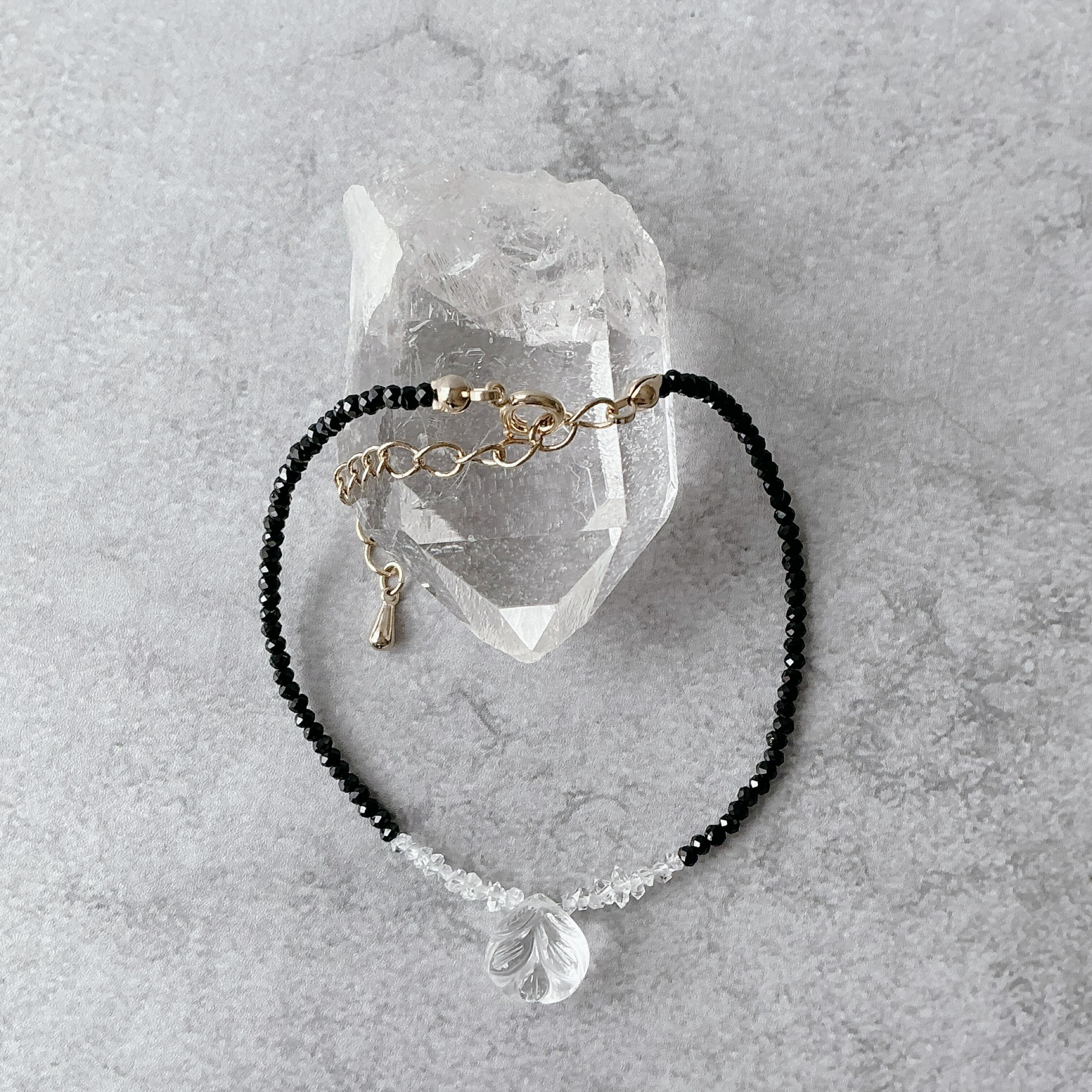 光の7色を全て合わせると透明になる事、全ての光を吸収する黒、何だかそんな色の組み合わせも不思議だなと思いますし、ブレスレットとしての仕上がりが美しい作品となりました。中央部分の堀の美しい水晶が本当に可愛らしいので、ぜひご縁のありました方には楽しんでいただけたら嬉しいです。