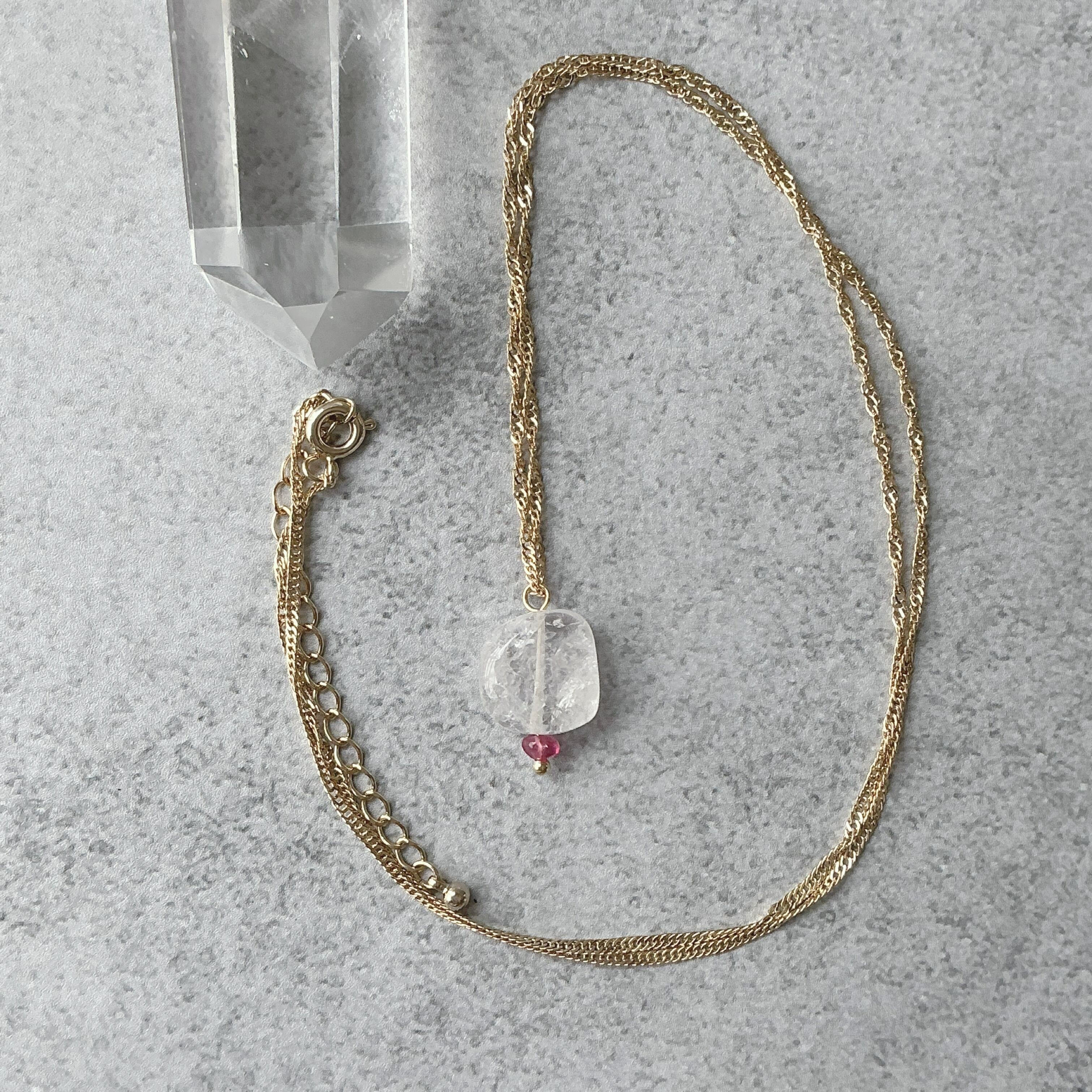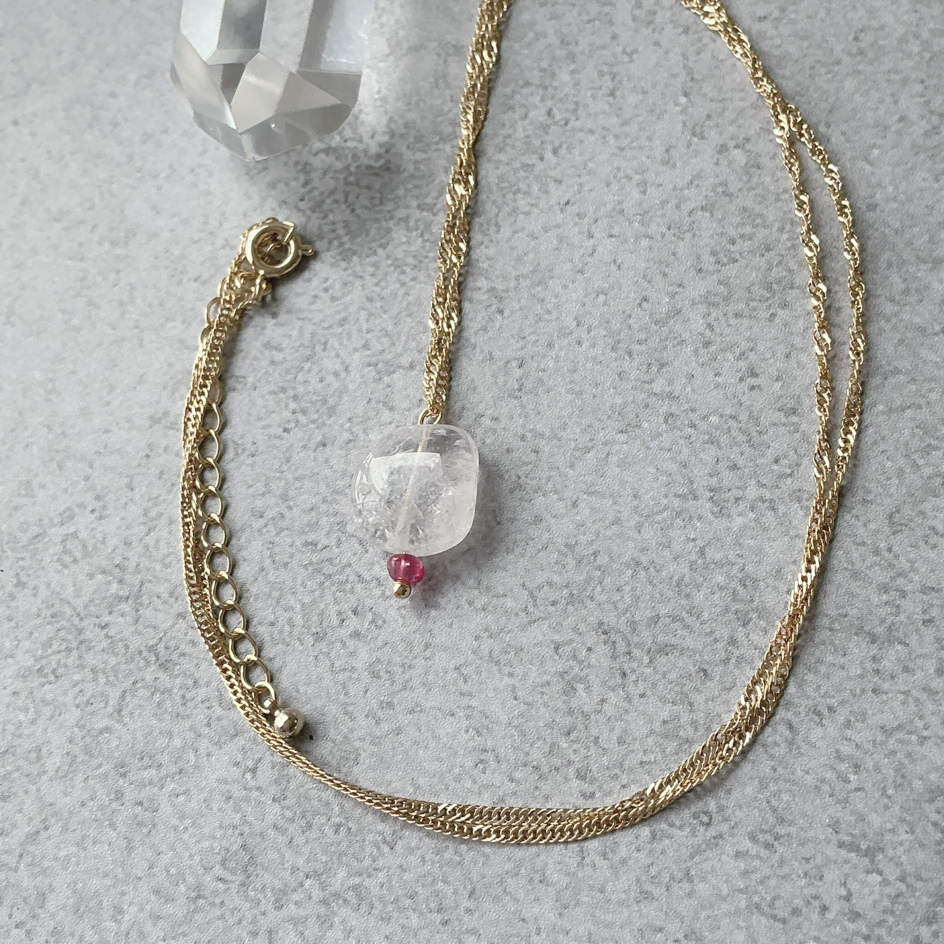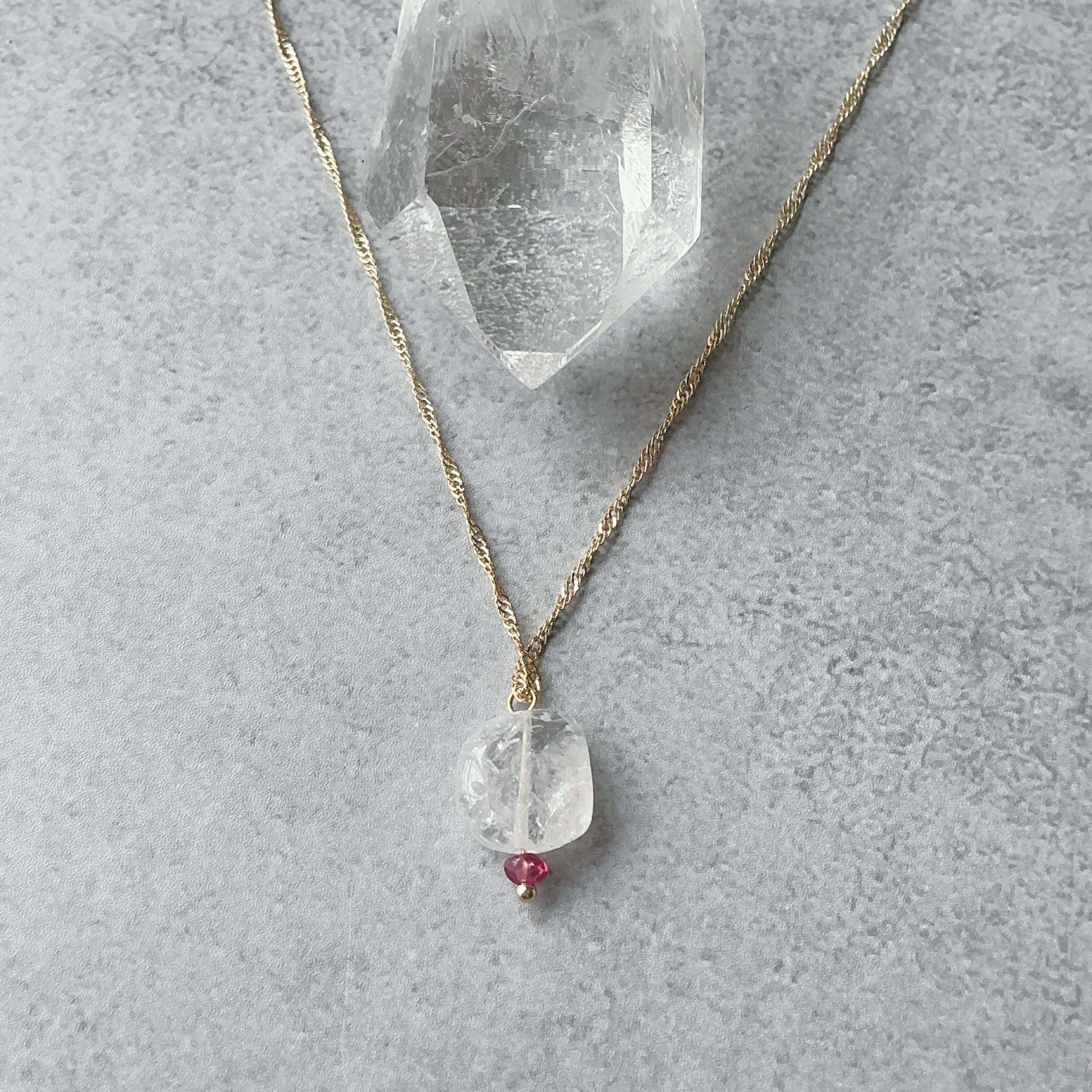 使われている天然石はヒーラーに人気のダンビュライトと小粒ながらにも魅力的なピンクサファイアです。ダンビュライトは過去には日本でも産出されていた時代がありジャパニーズダイヤモンドと言われていたようです。そんな不思議な存在感のあるダンビュライトですが、高波動と言われヒーラーさんに非常に人気の天然石でもあります。