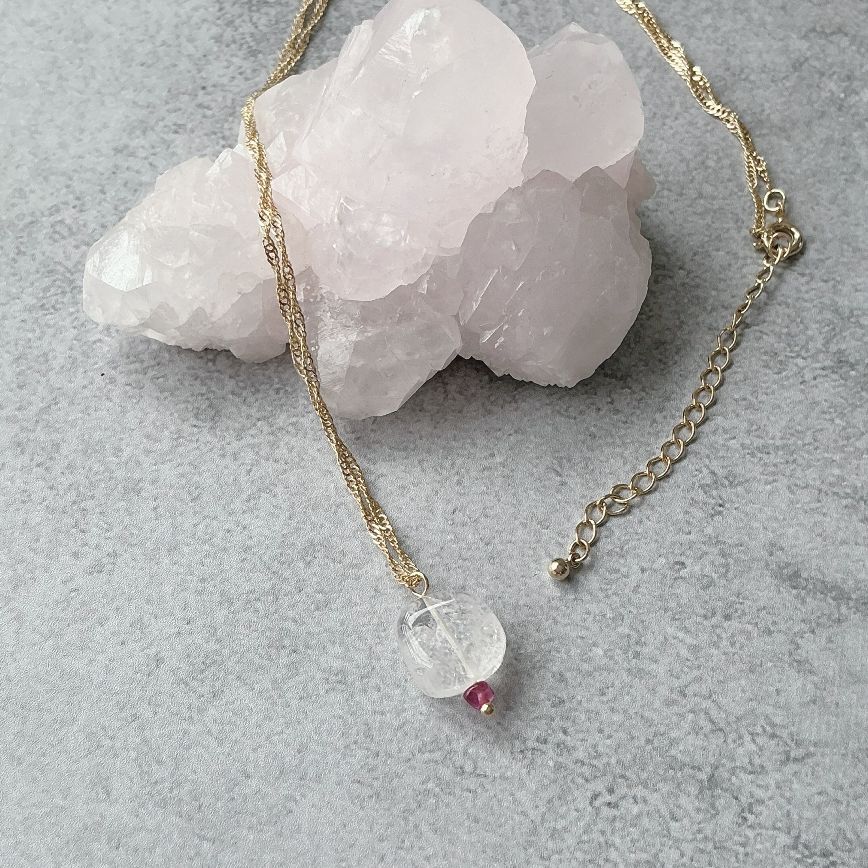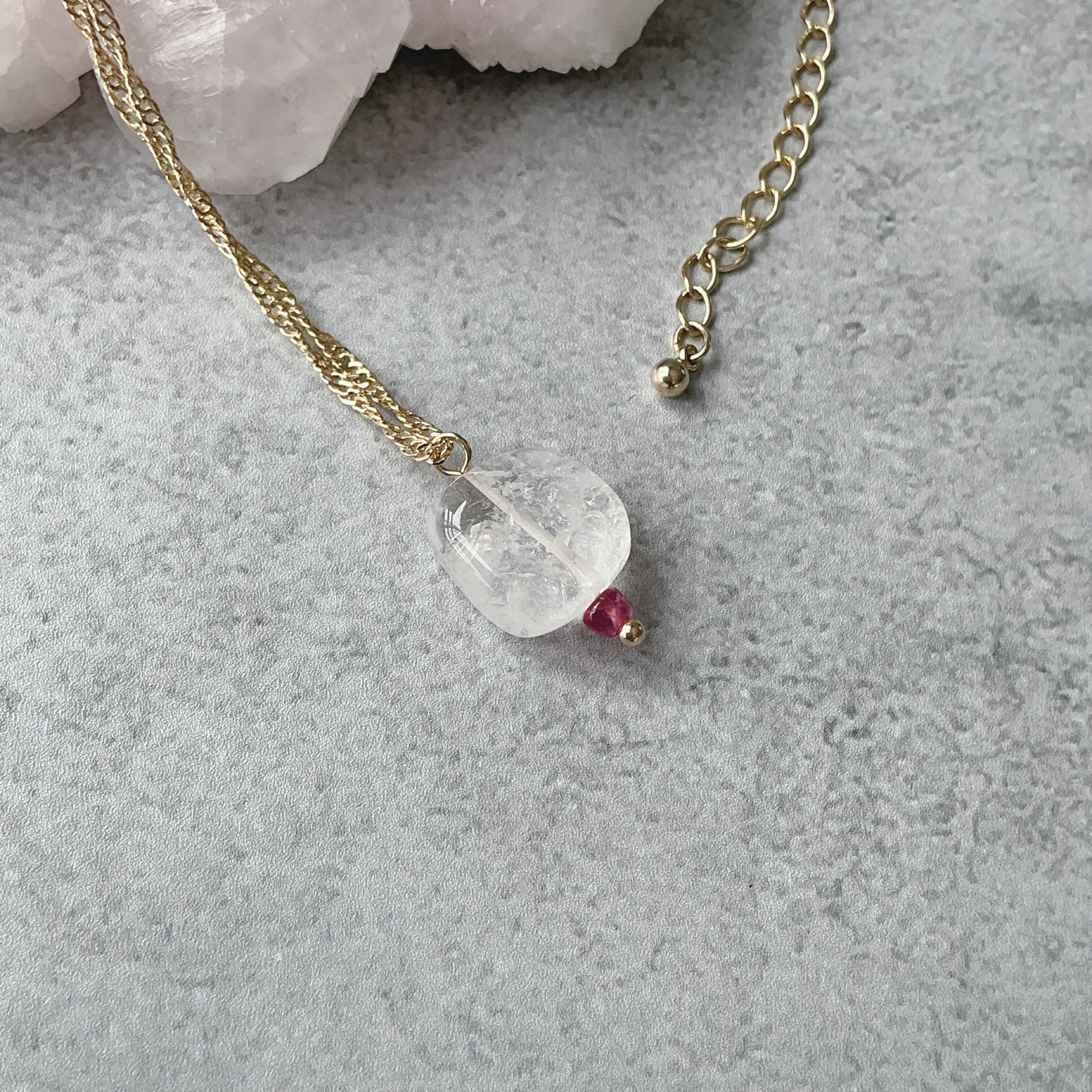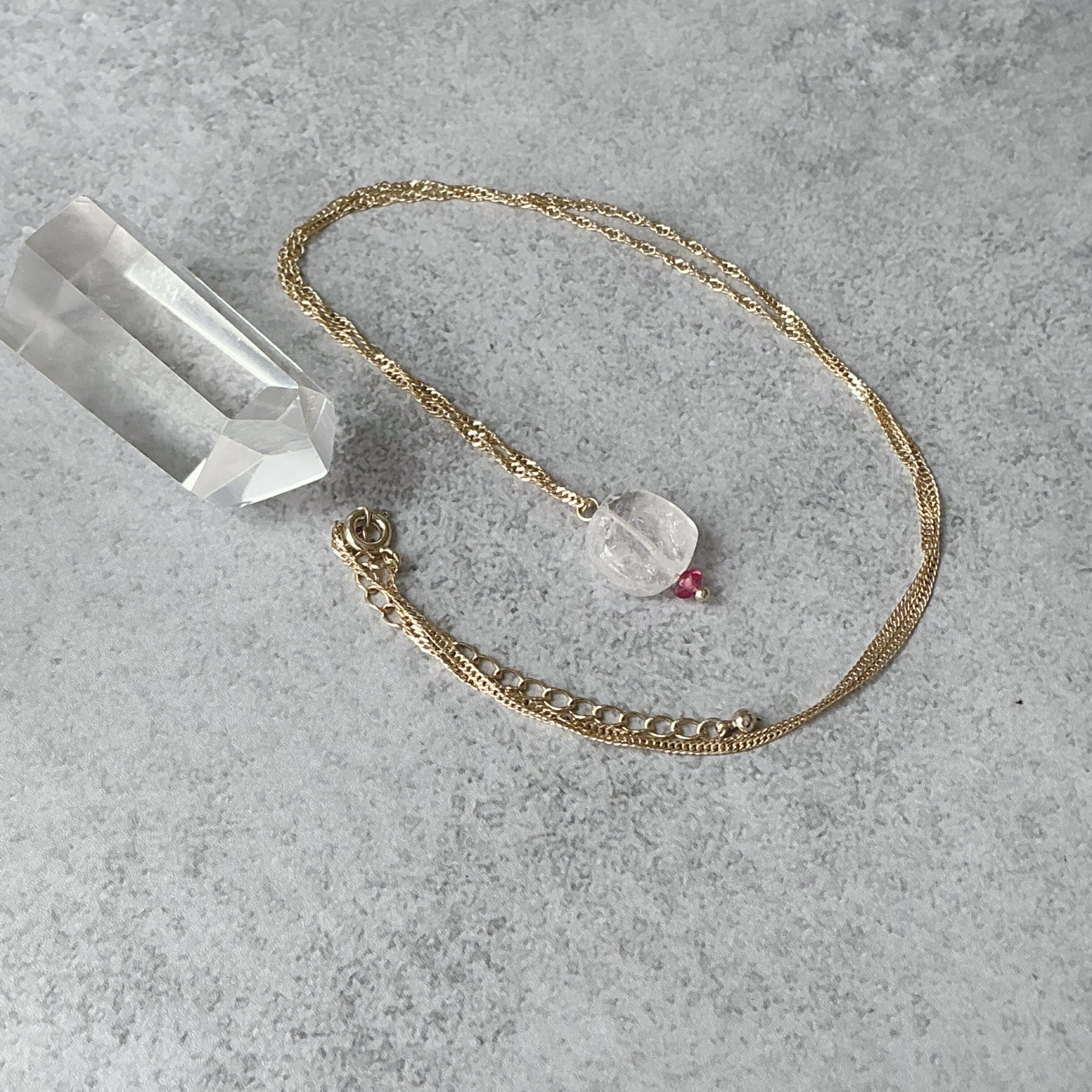 使われている天然石はヒーラーに人気のダンビュライトと小粒ながらにも魅力的なピンクサファイアです。ダンビュライトは過去には日本でも産出されていた時代がありジャパニーズダイヤモンドと言われていたようです。そんな不思議な存在感のあるダンビュライトですが、高波動と言われヒーラーさんに非常に人気の天然石でもあります。
