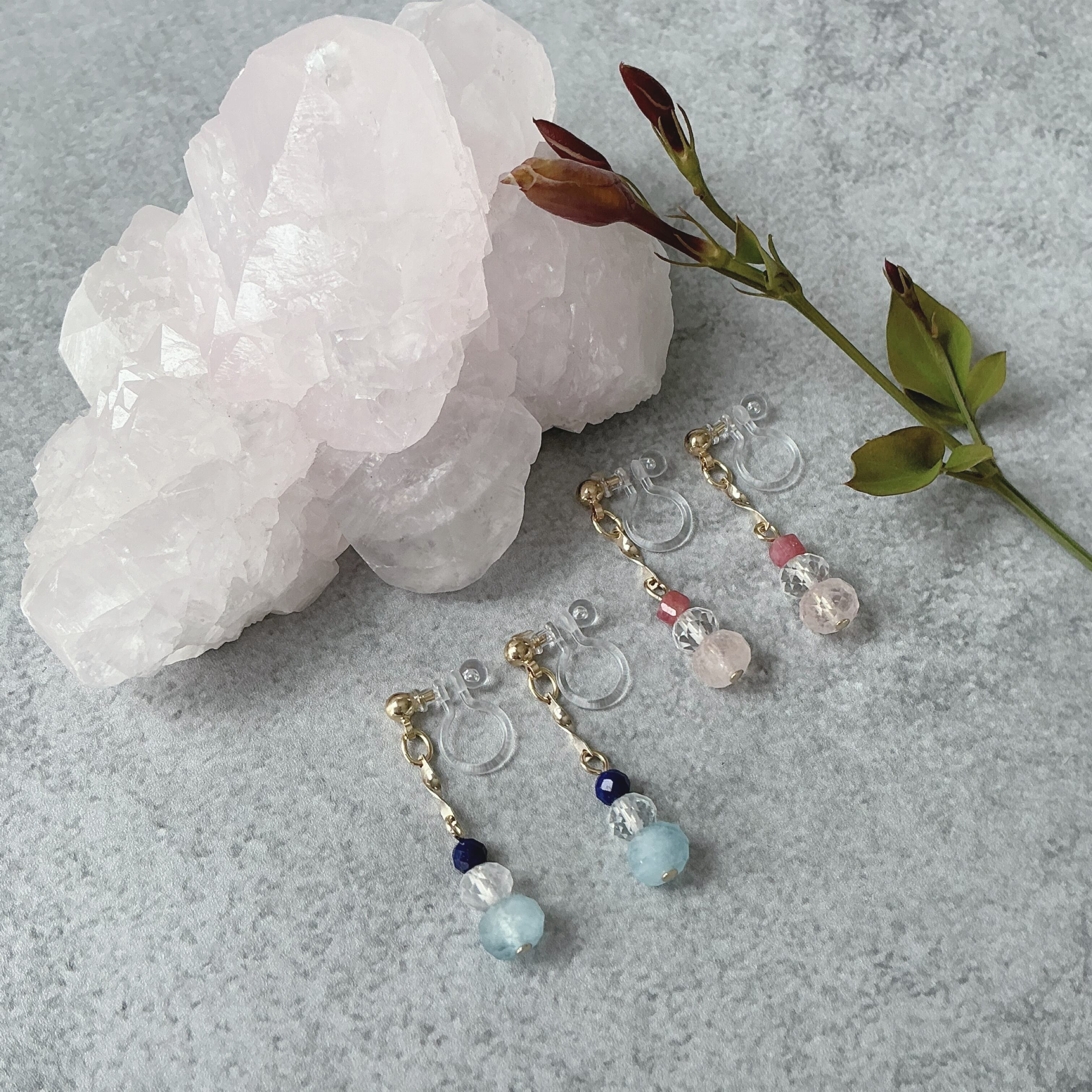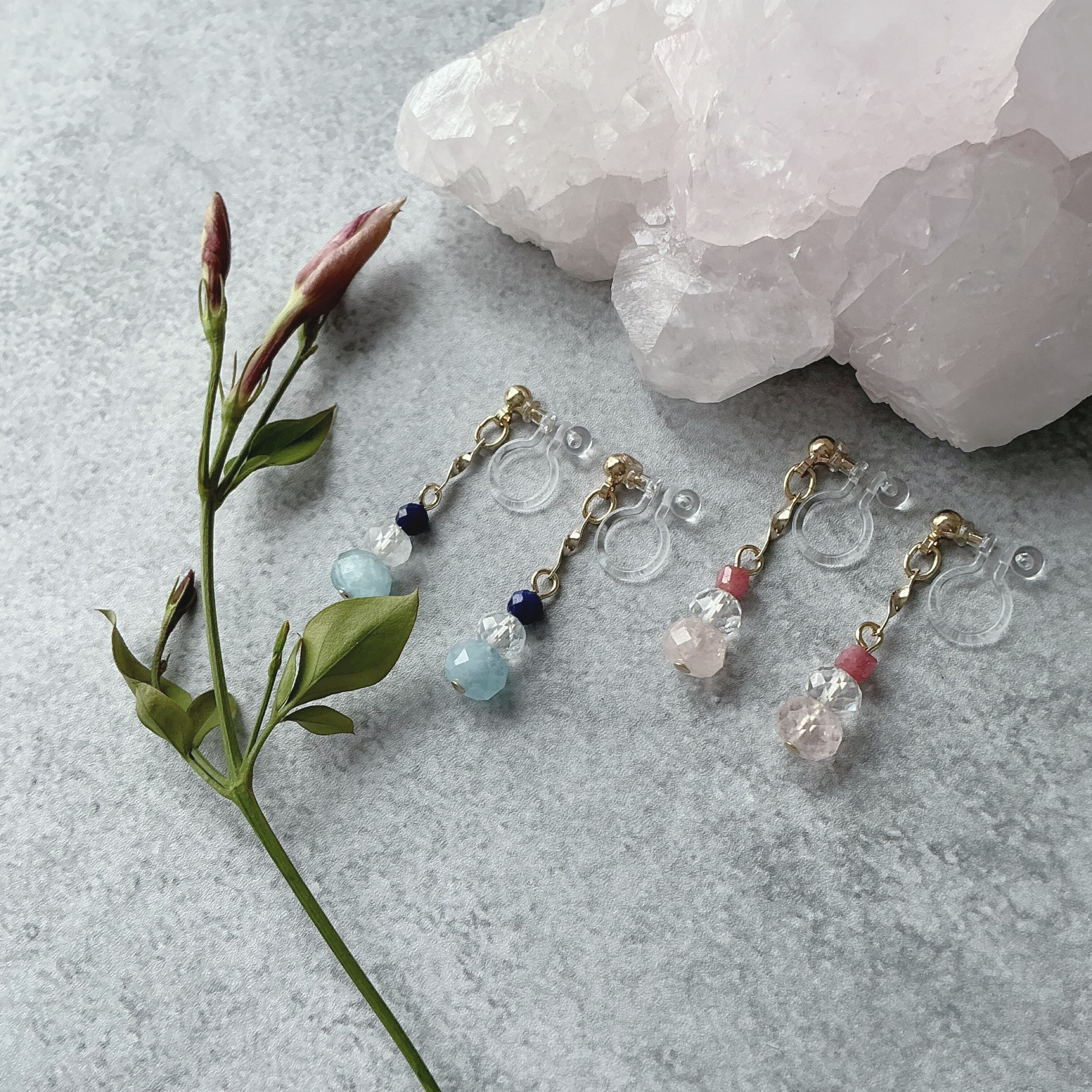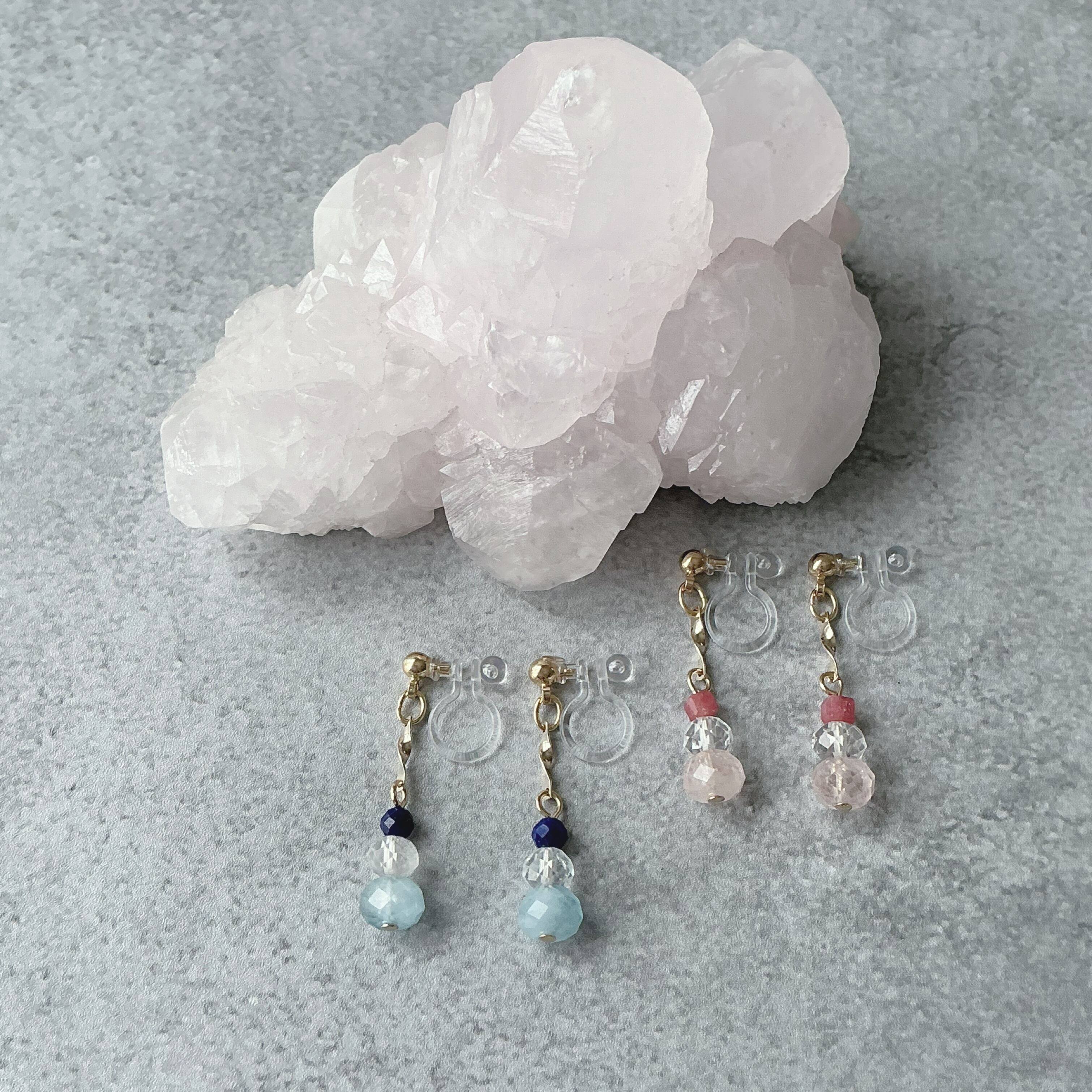 使われている天然石はベリルの仲間たちの優しいピンク色が美しいモルガナイトと爽やかなブルーカラーのアクアマリンに細やかまカットが美しいトパーズと、しっかりとしたピンク色のインペリアルロードナイトと深いブルーのラピスラズリです。
