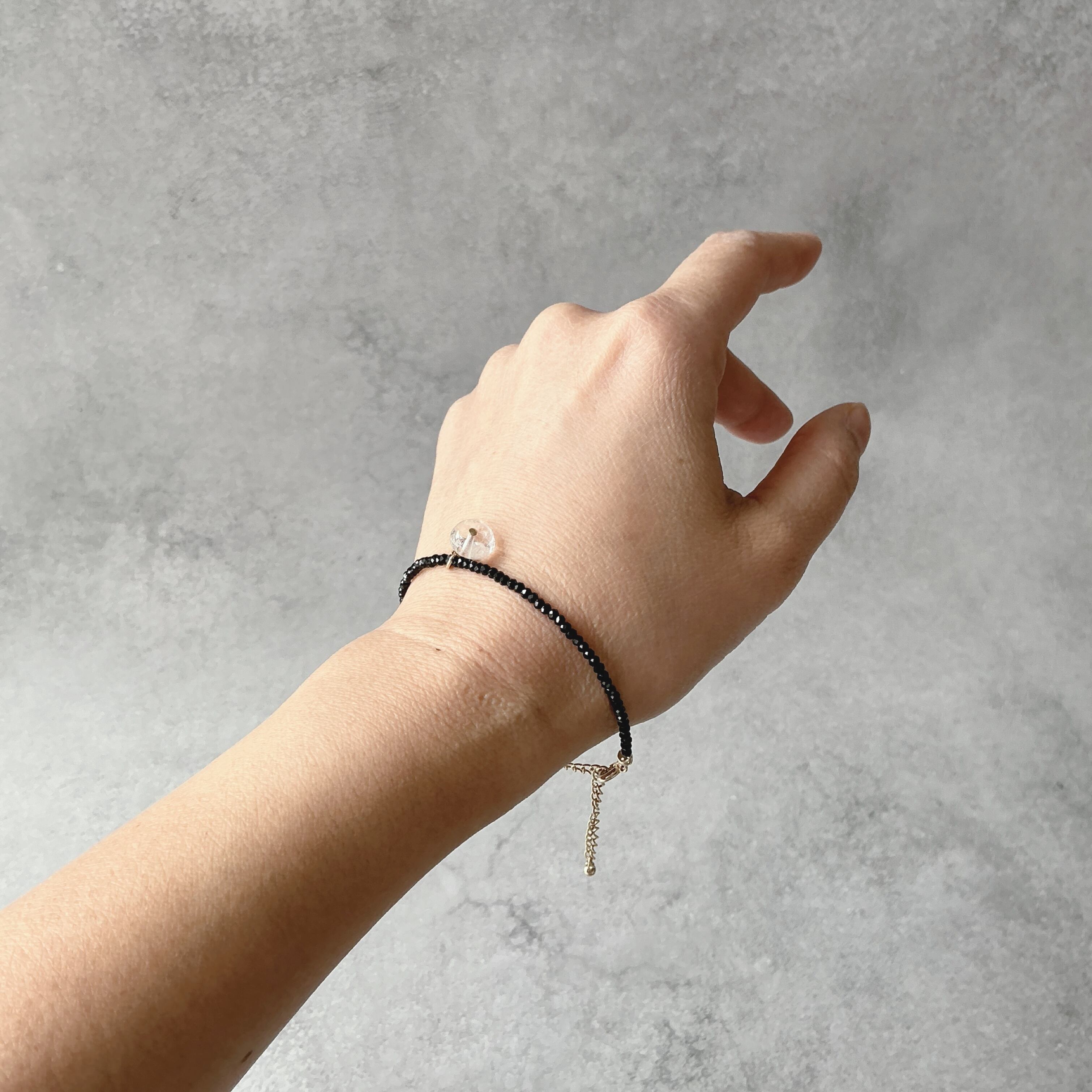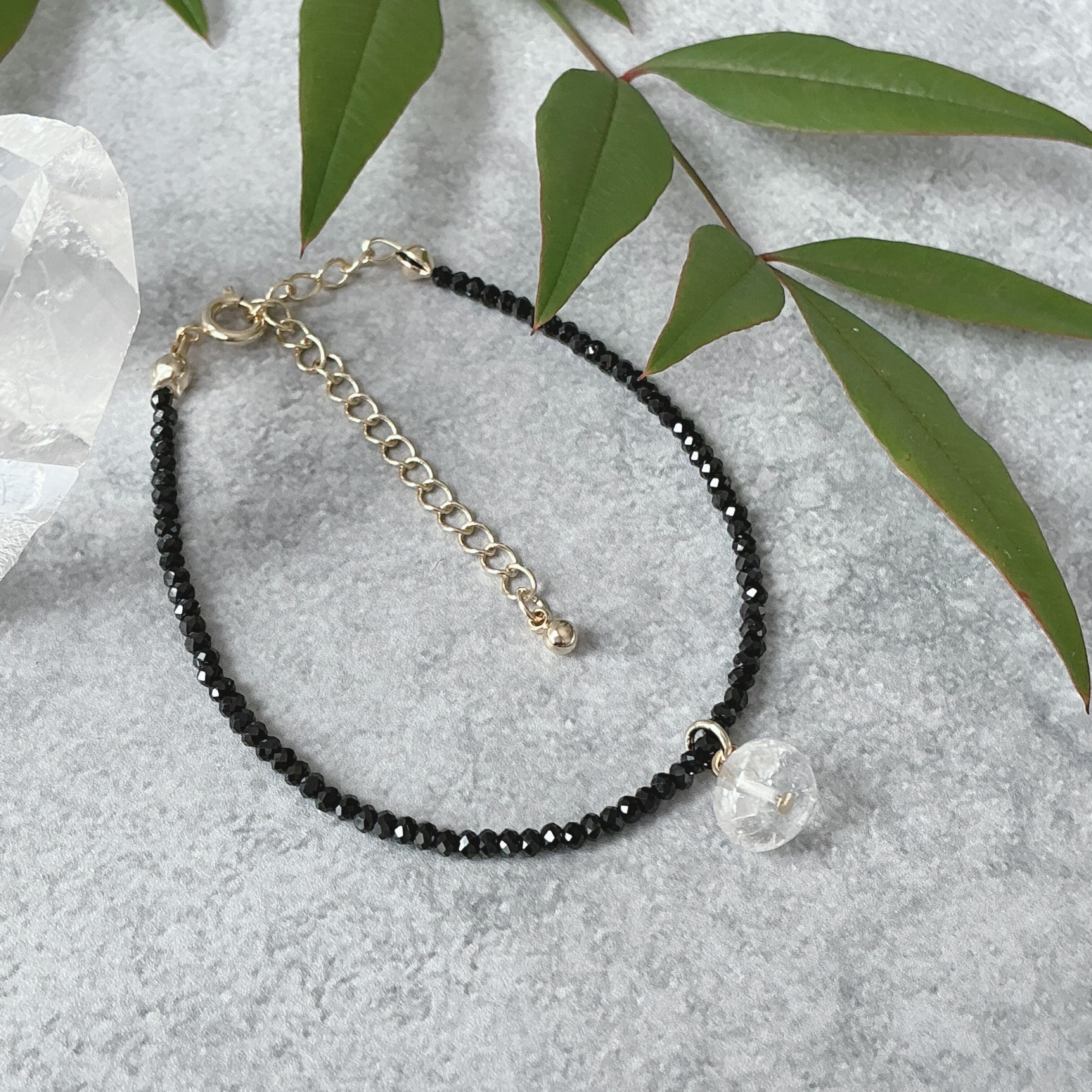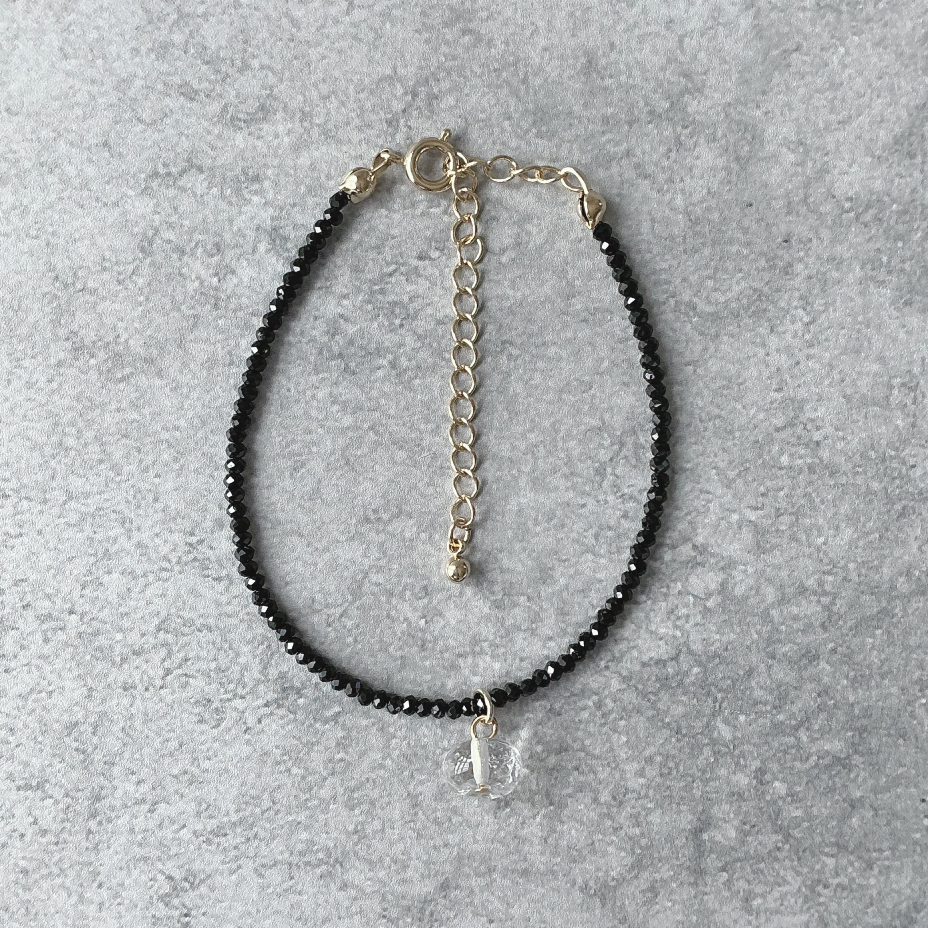使われている天然石は細やかなカットが美しいブラックスピネルとポイントにぷるんと透明感の美しい水晶を使用しました。