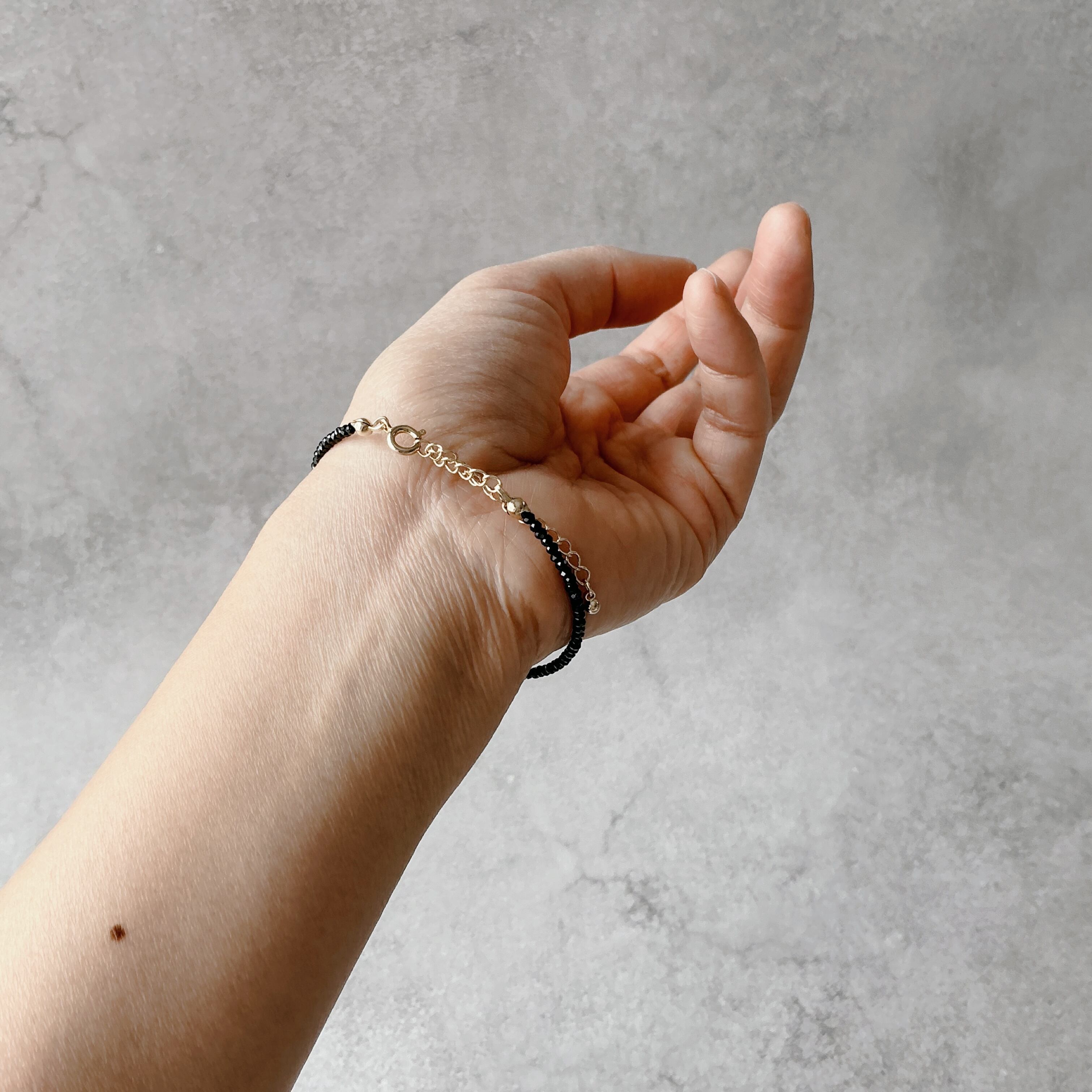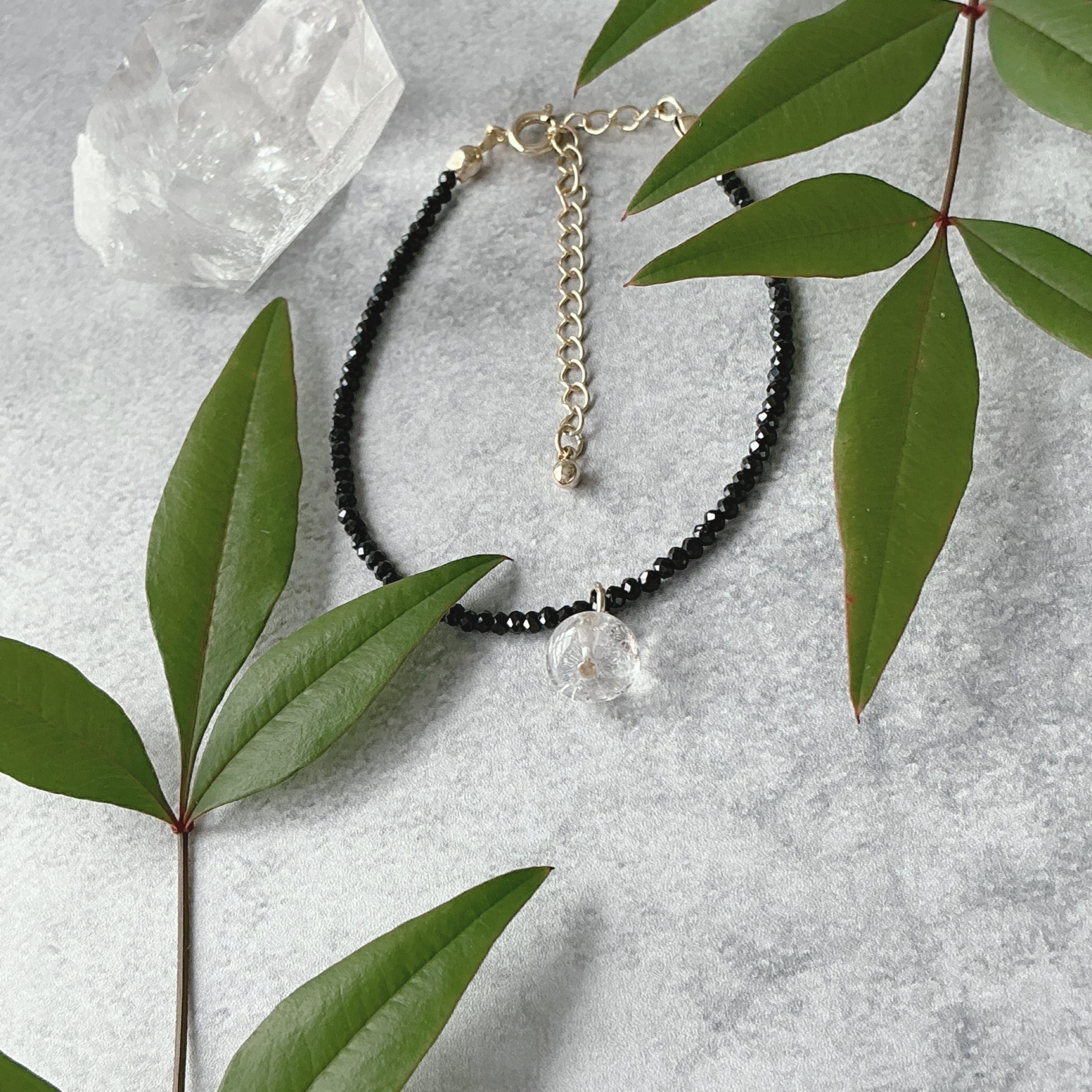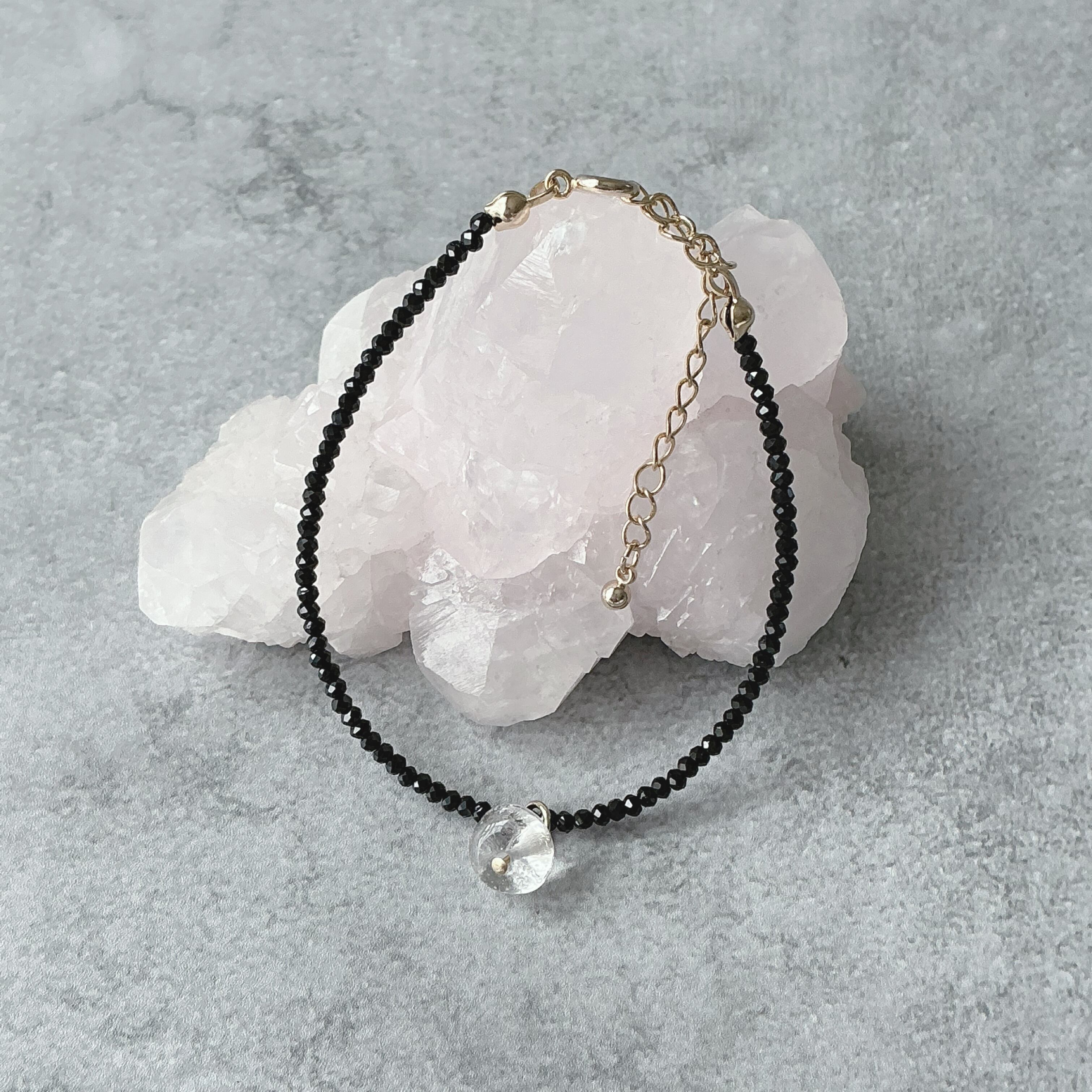 使われている天然石は細やかなカットが美しいブラックスピネルとポイントにぷるんと透明感の美しい水晶を使用しました。