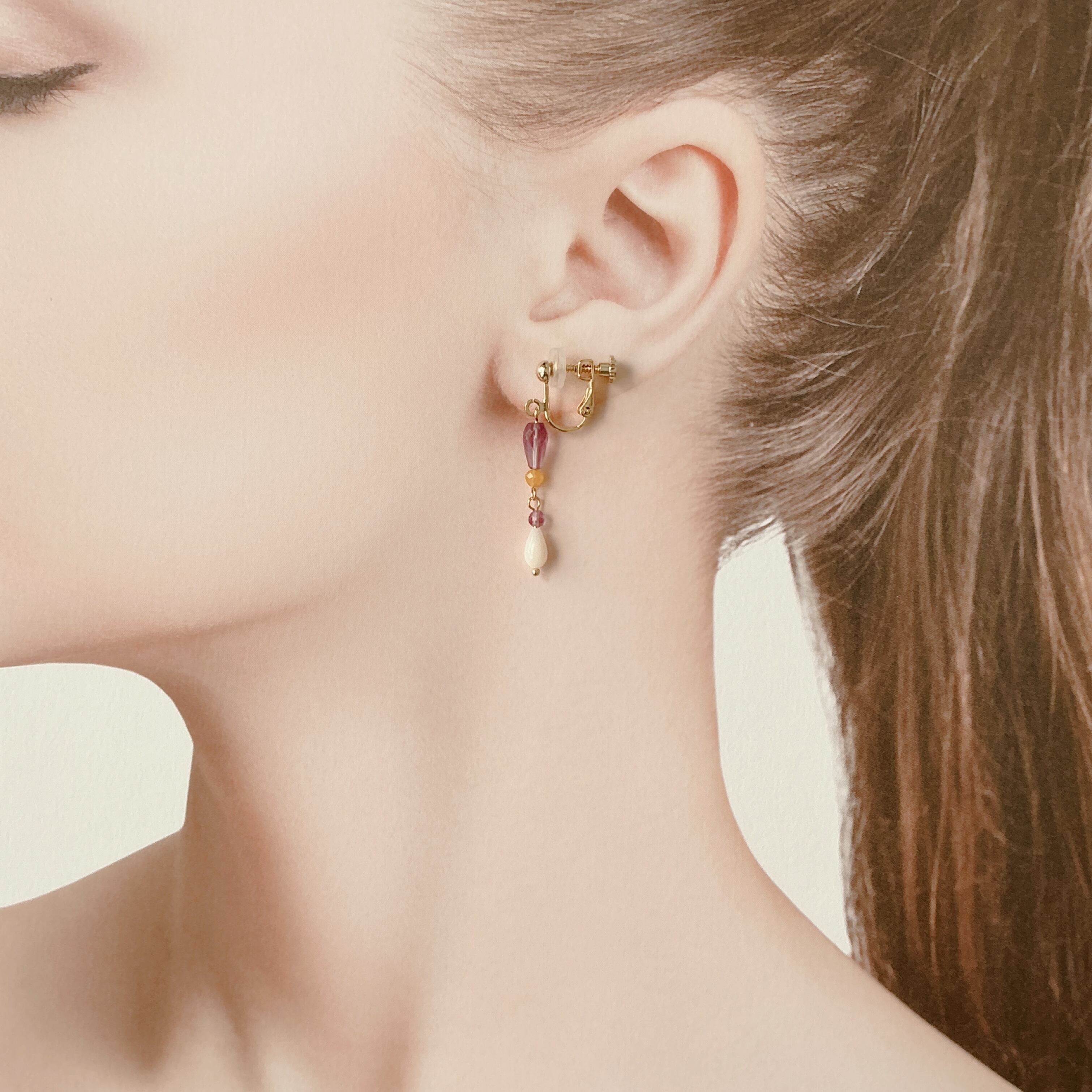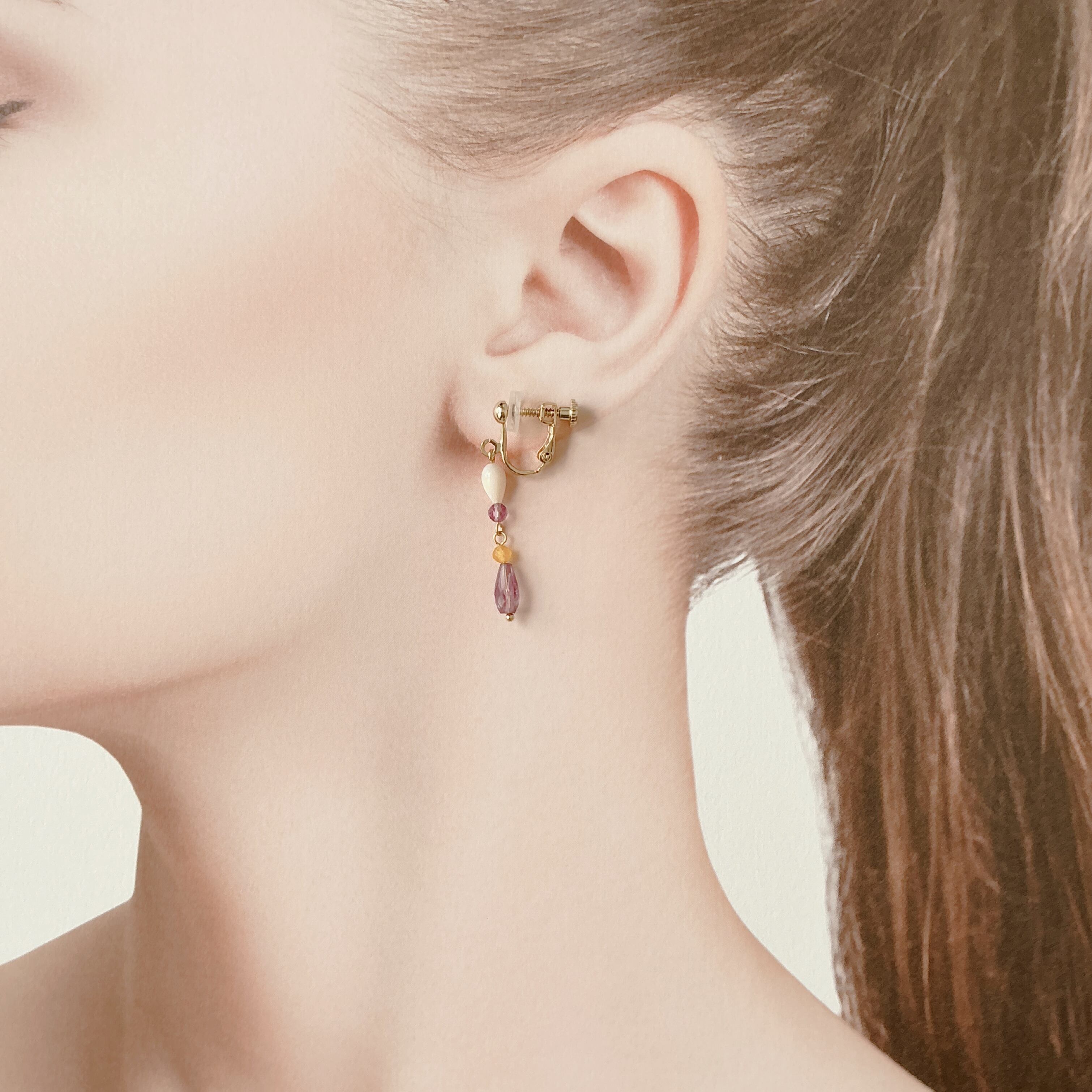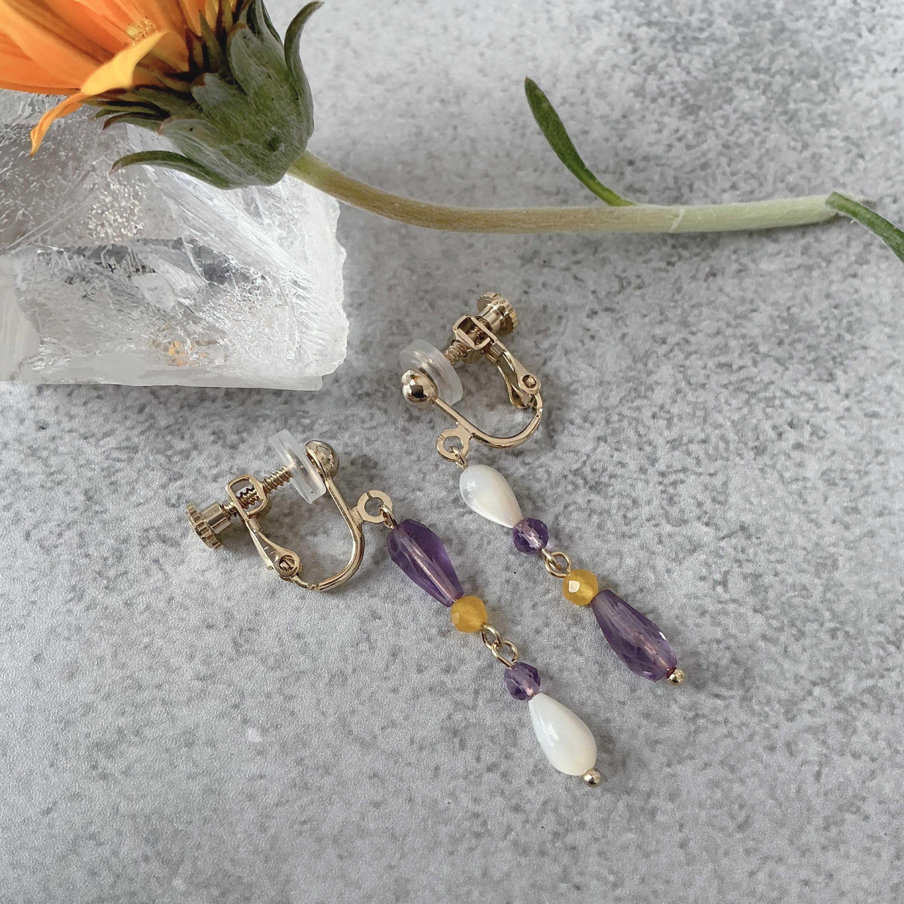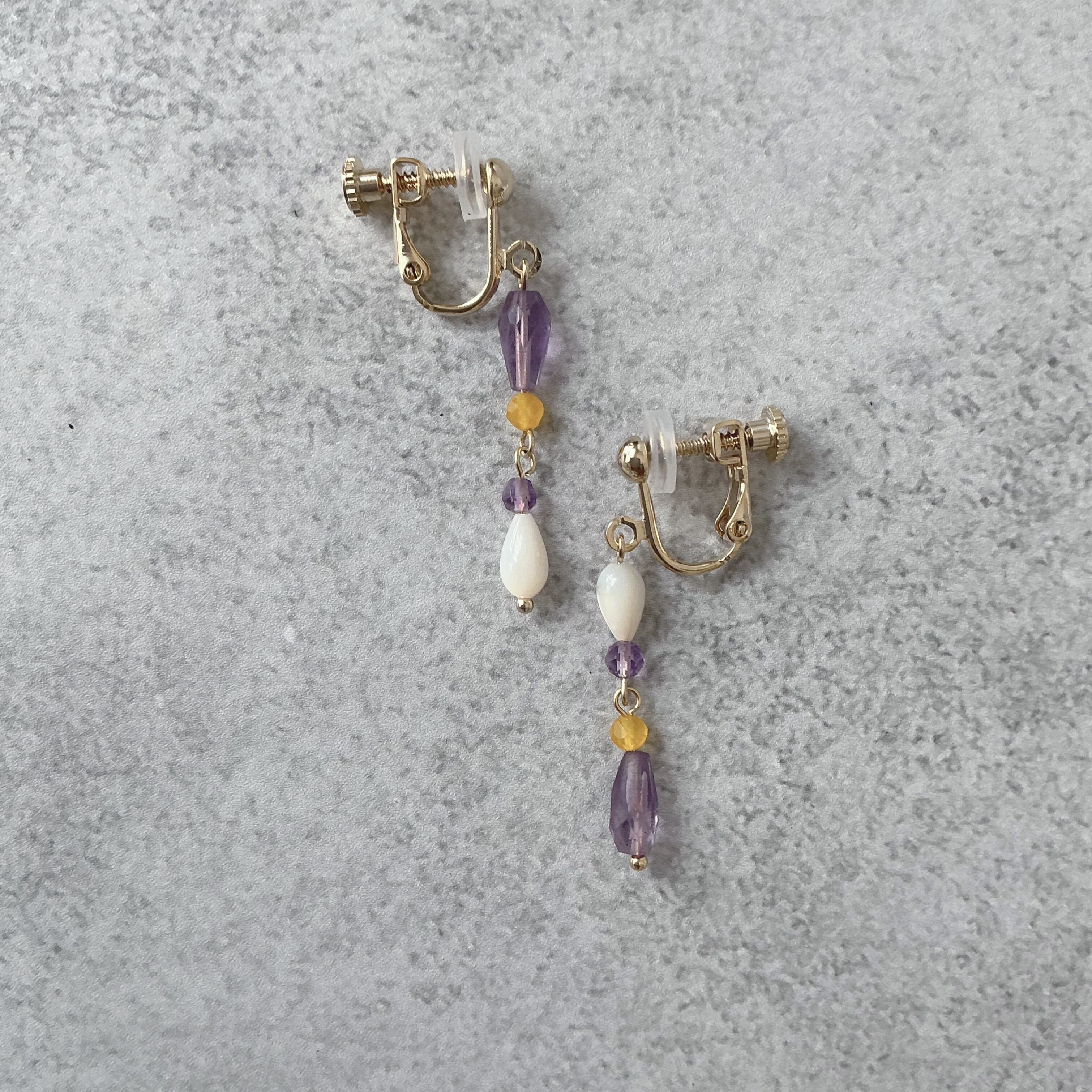使用している天然石は細やかなカットが美しく透明感の高いアメシスト、華やかなイエロージェード、品の良い照りが素敵なマザーオブパールです。