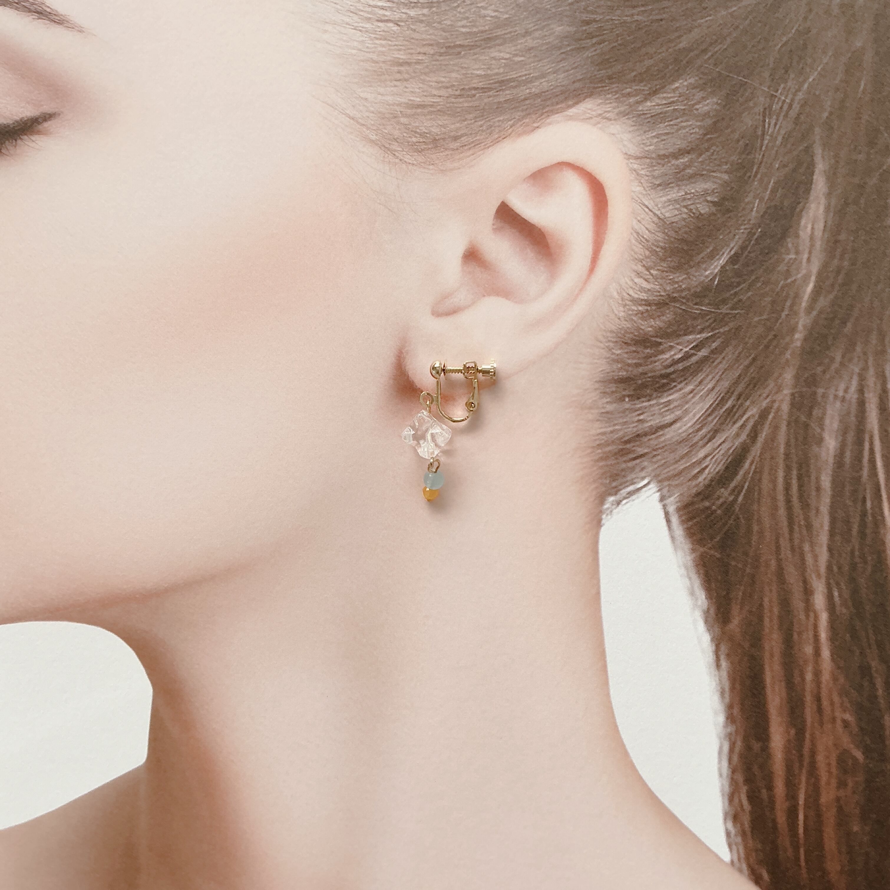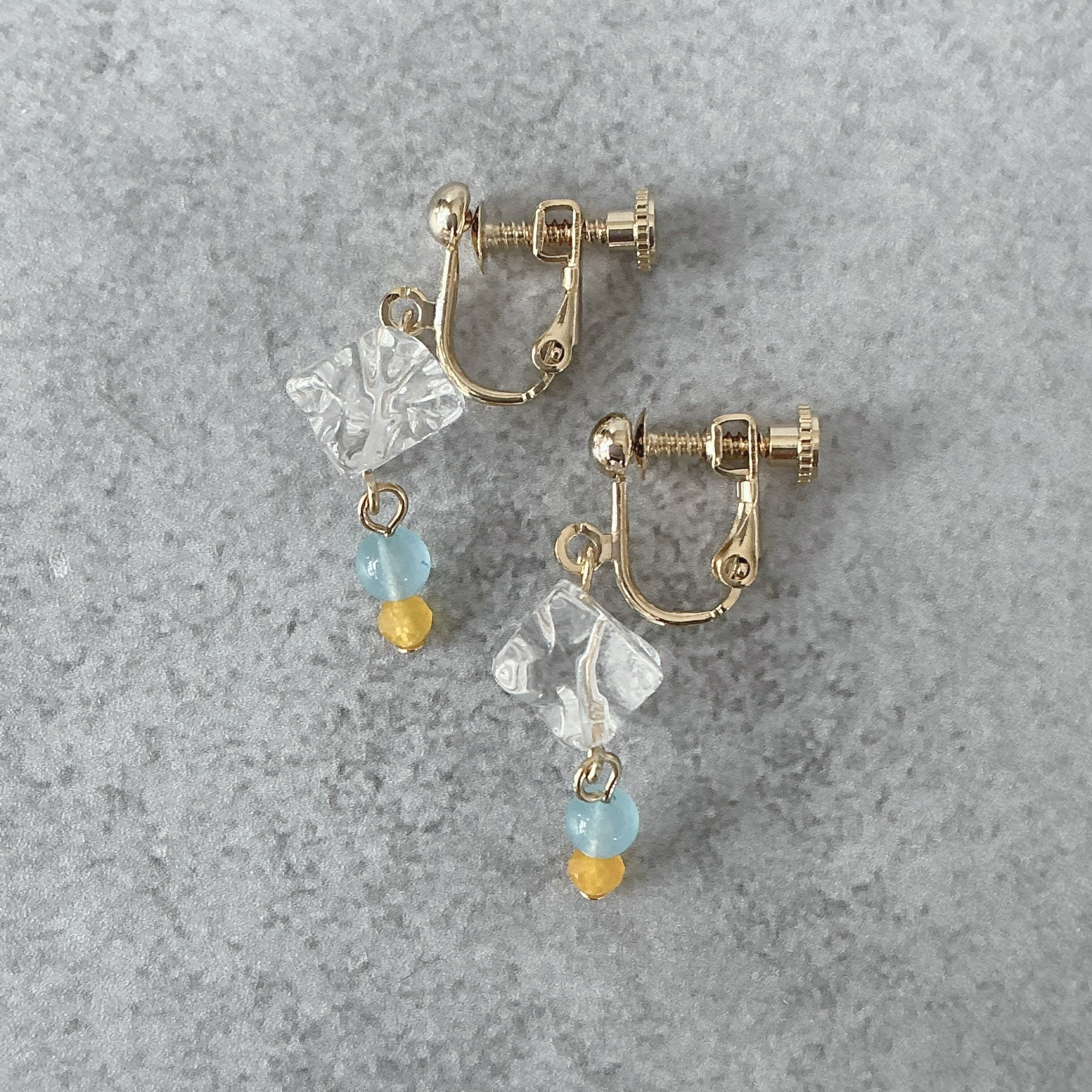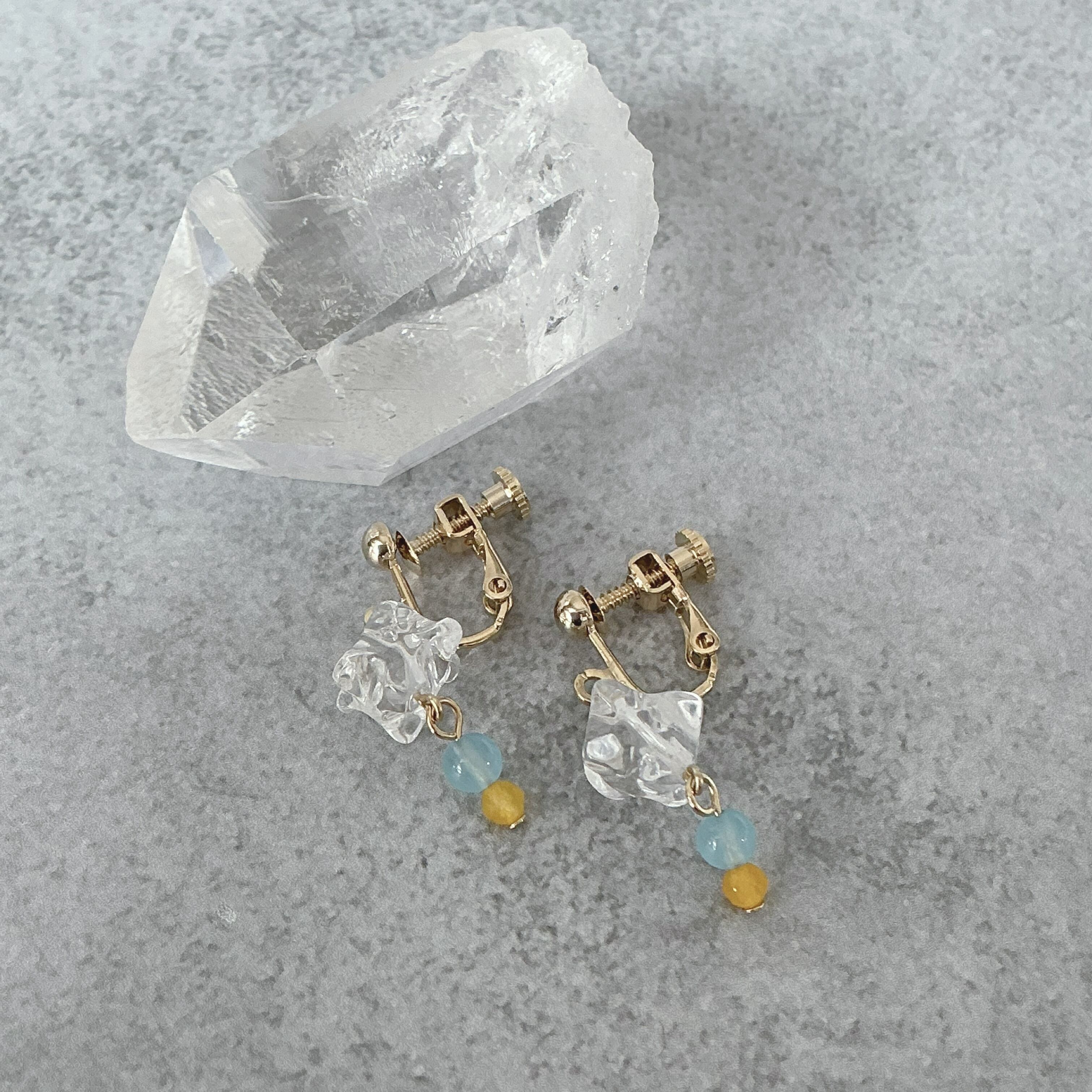 使用している天然石は透明度の非常に高く美しい水晶と、鮮やかなイエローとライトブルーのジェードです。