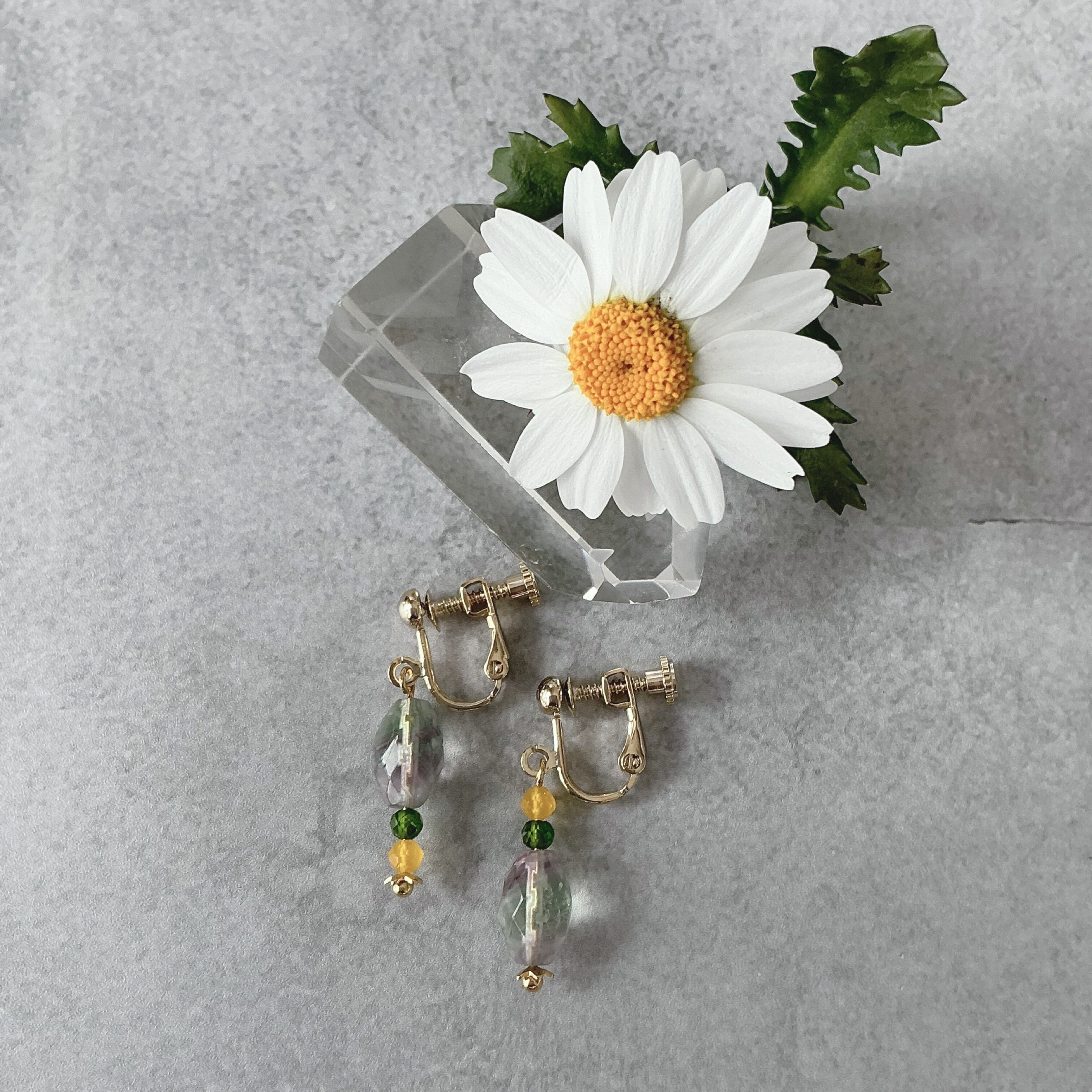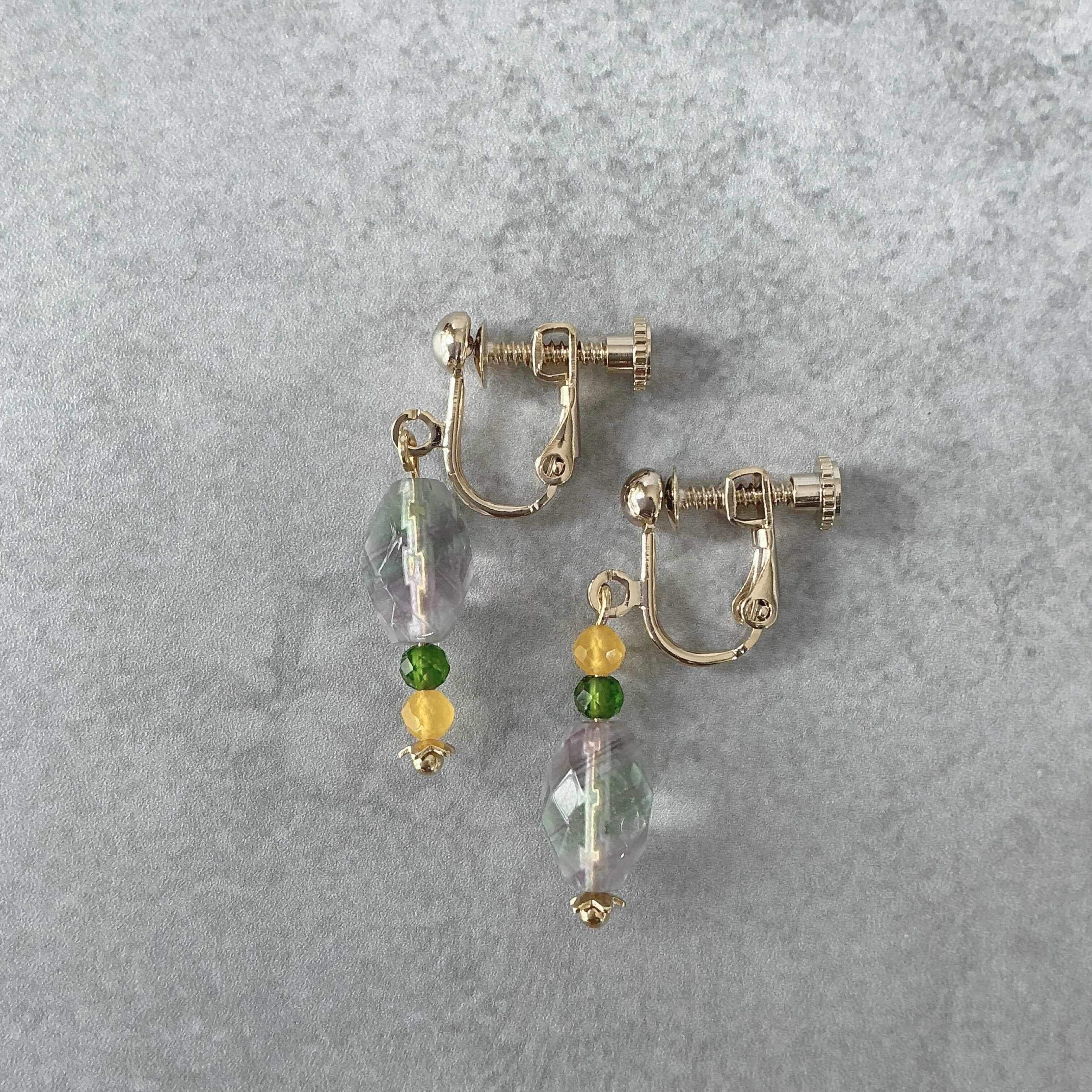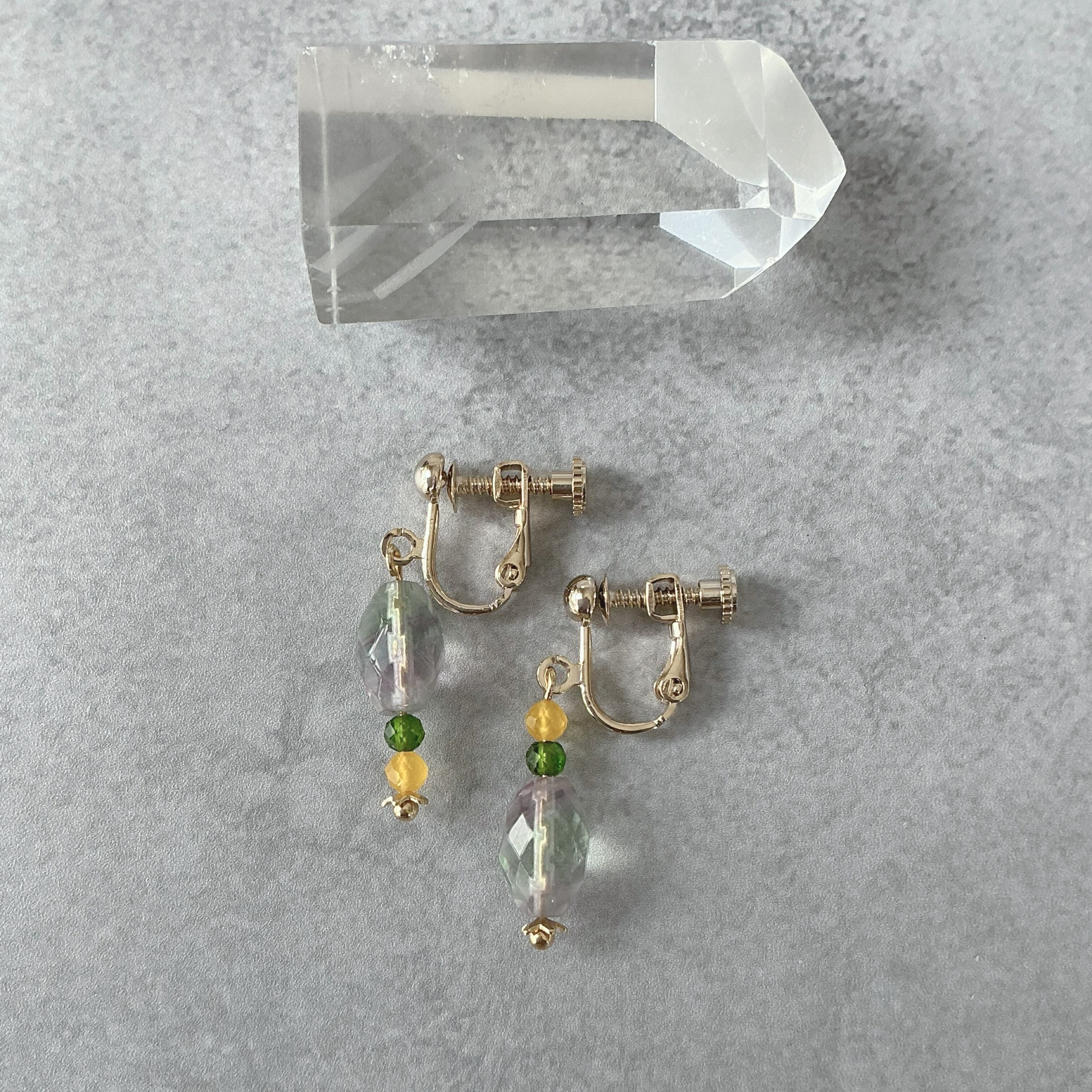 使用している天然石はカットの美しいフローライトと、小粒ながらも存在感のあるイエロージェード、同じく小粒ながらも鮮やかなグリーンのクロムダイオプサイドです。