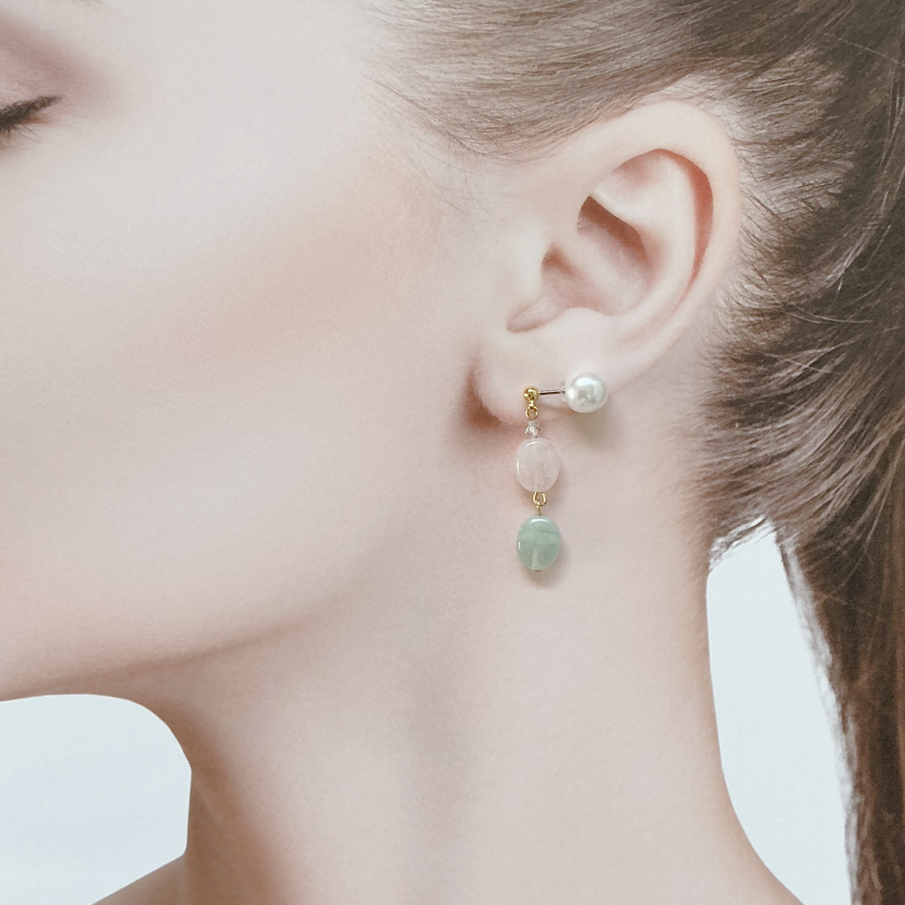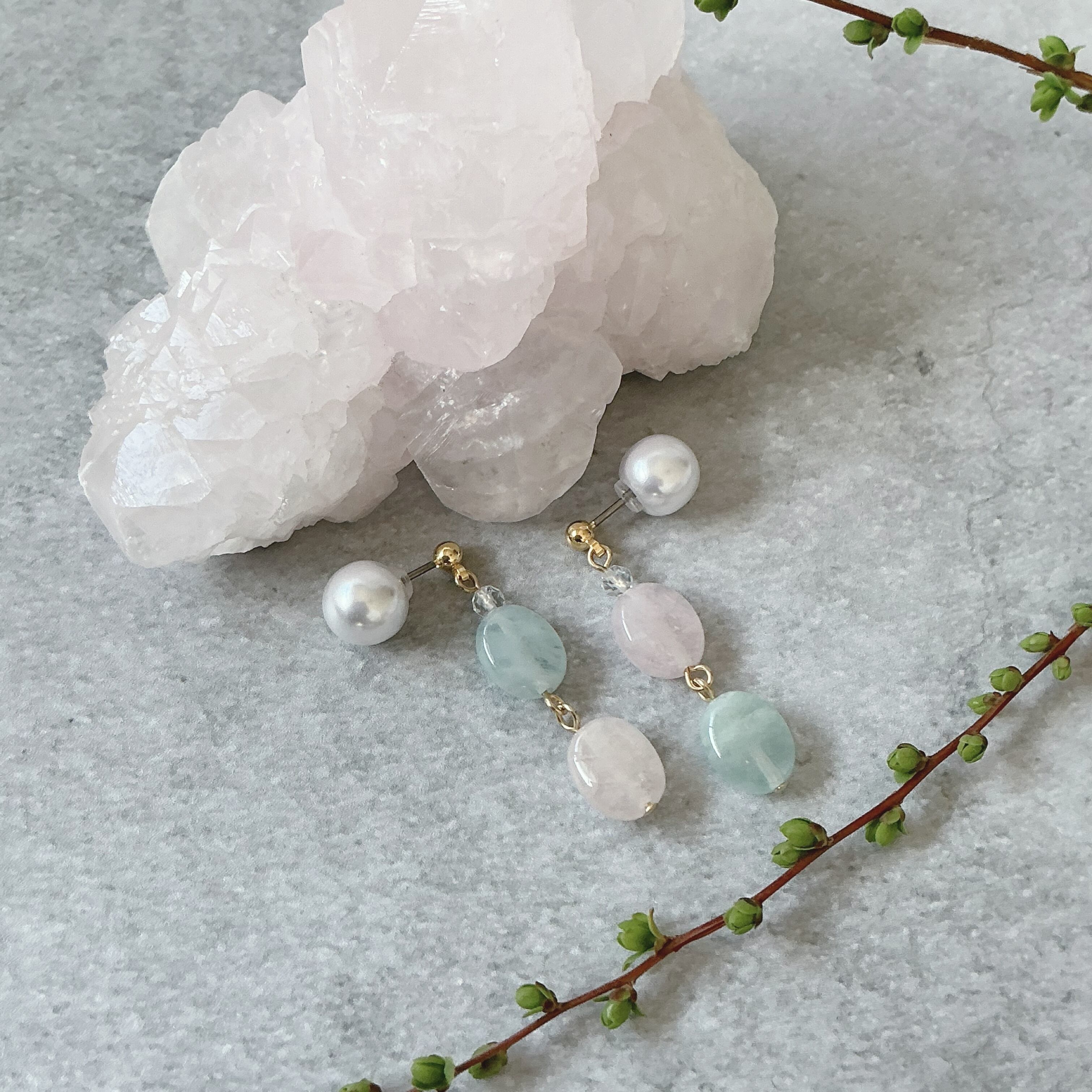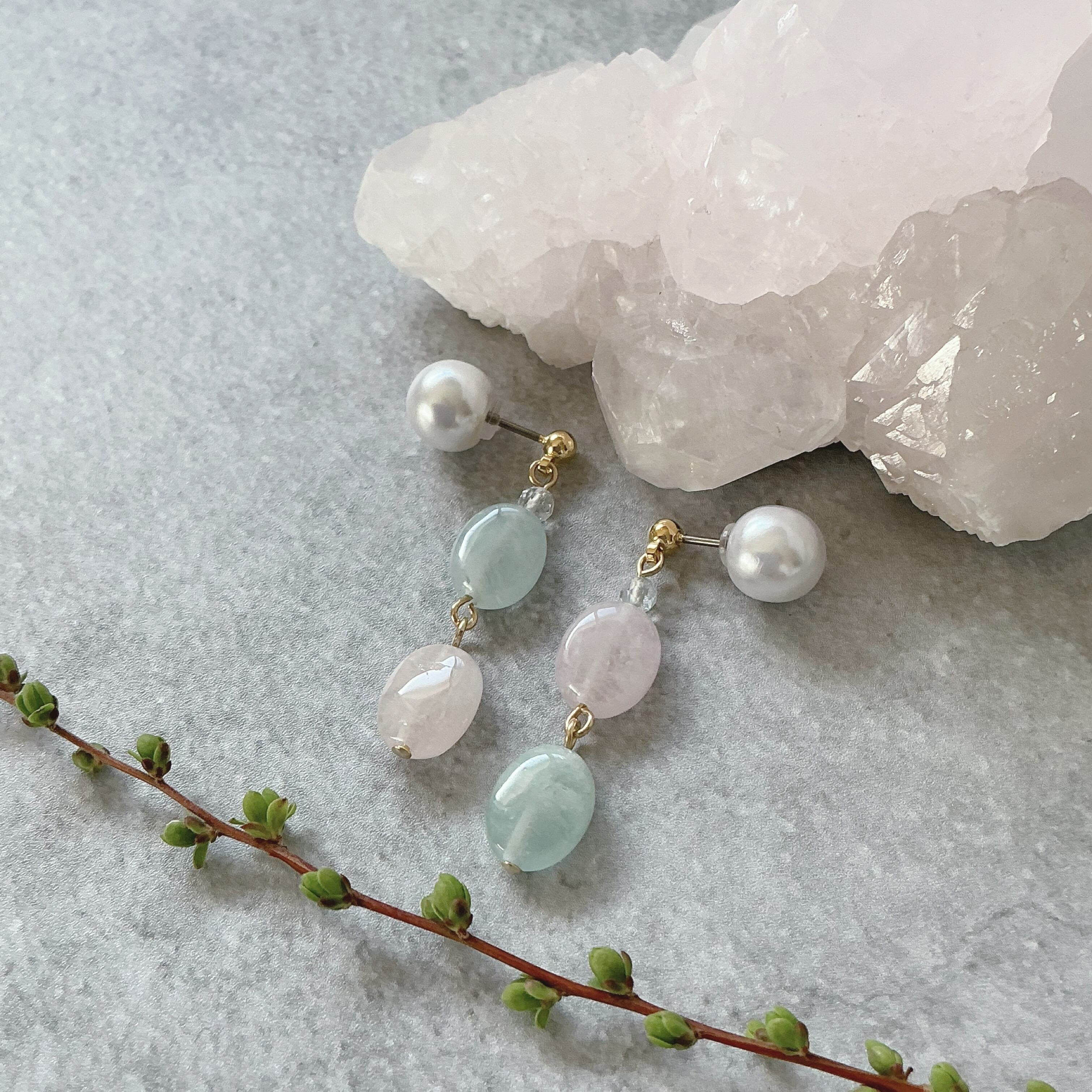 使われている天然石はベリルの仲間でつるんとした照りが可愛らしいアクアマリンとモルガナイトに細やかなカットが美しいトパーズを使用。